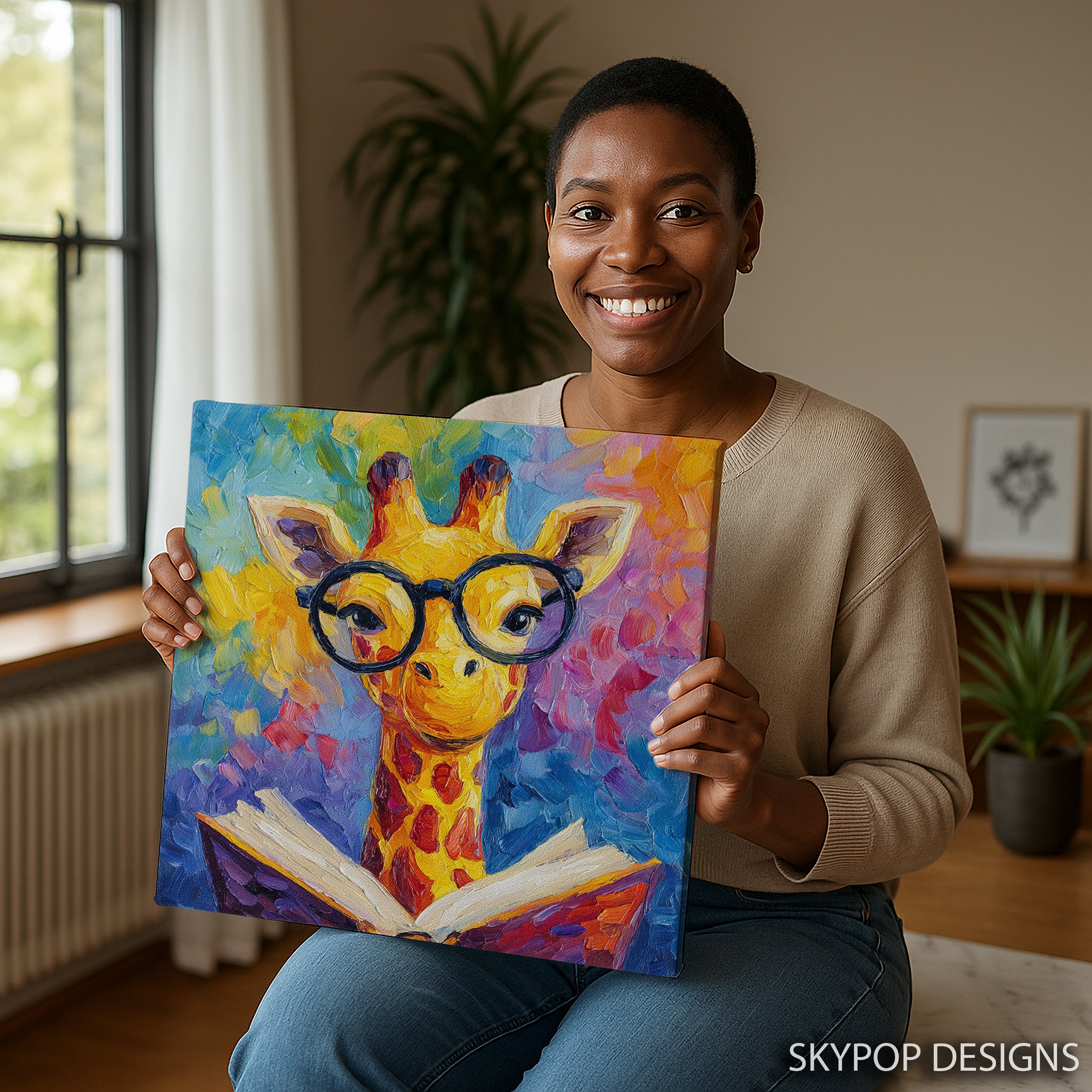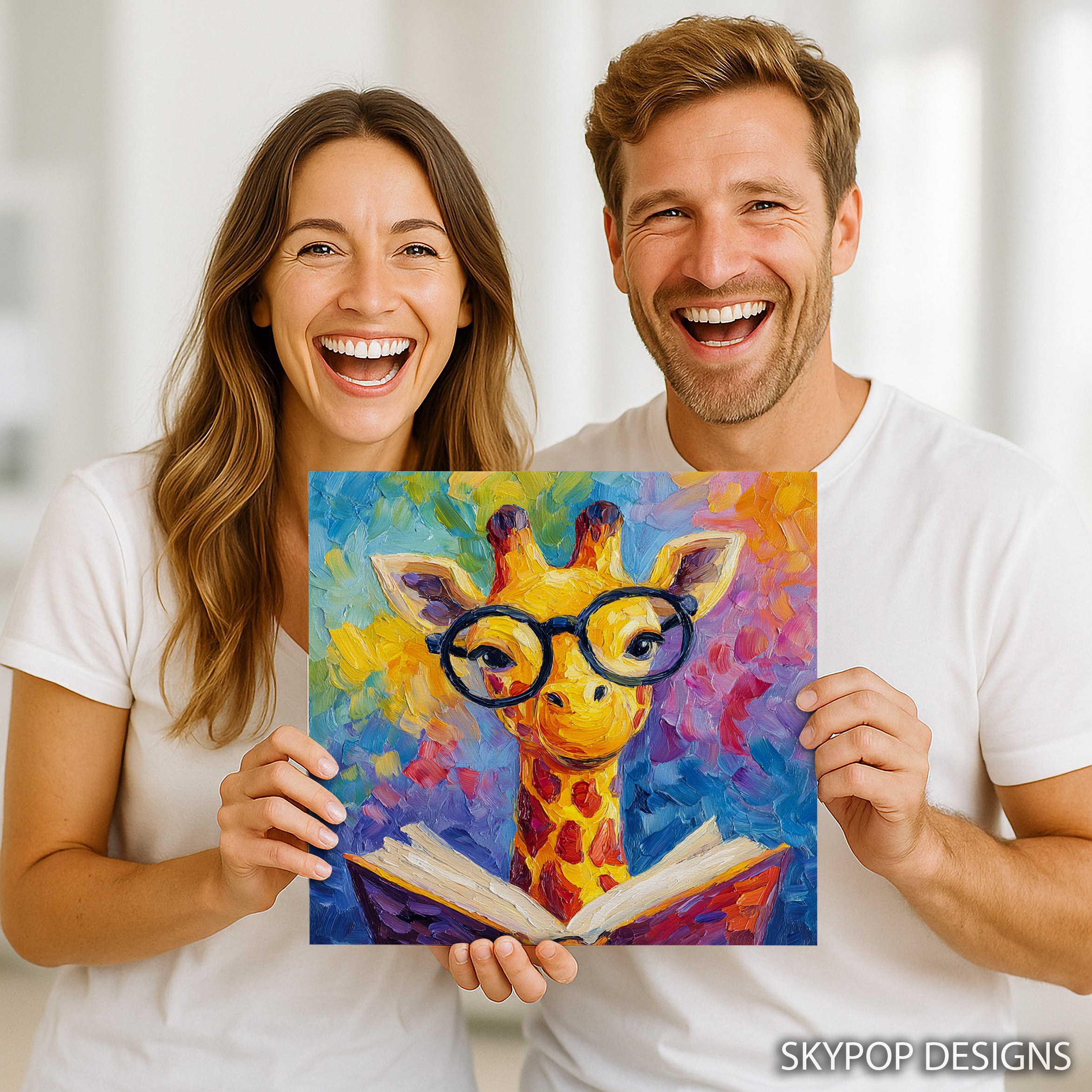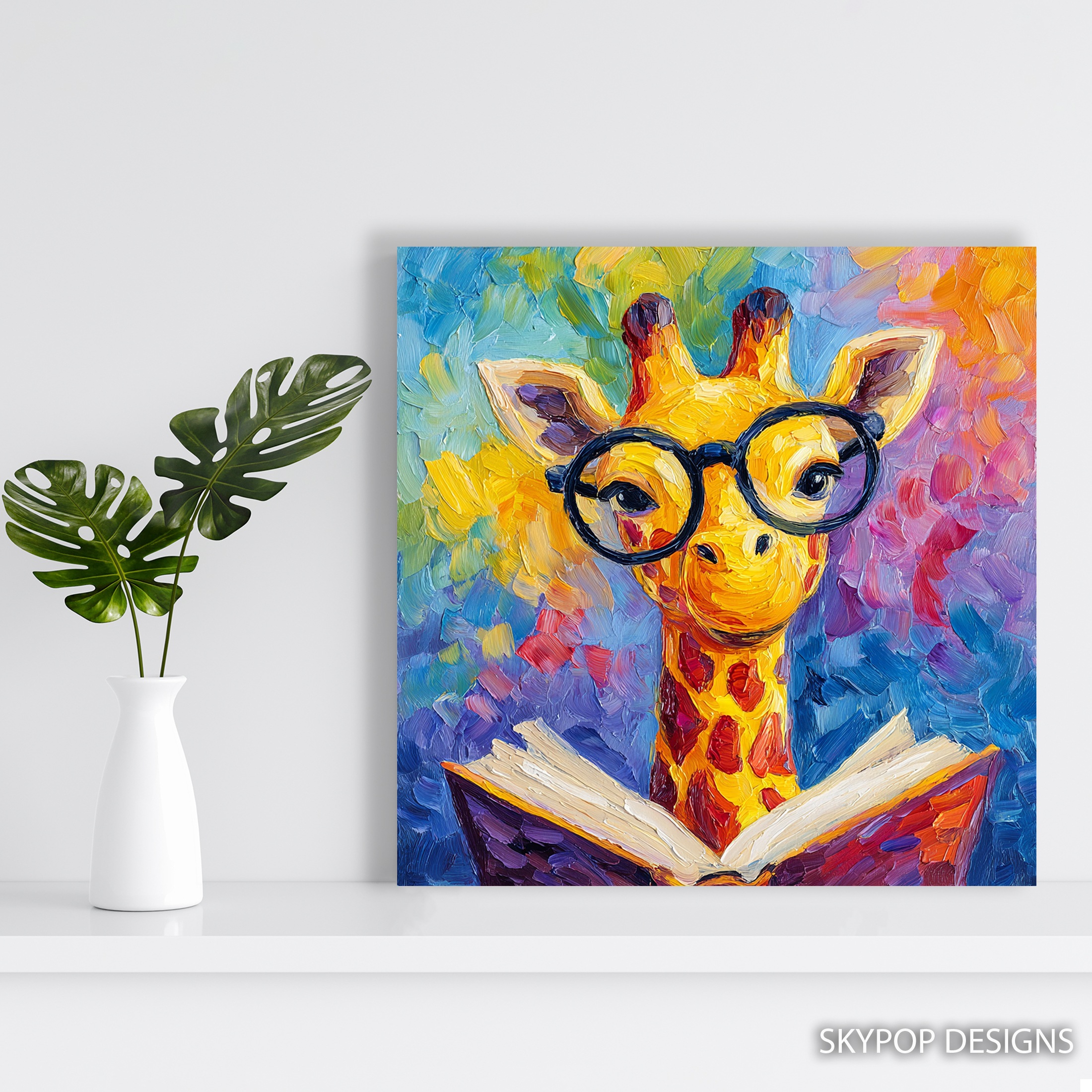 Elevate your space with this charming giraffe canvas wall art, featuring a lovable long-necked friend wearing oversized glasses and reading a book. This whimsical poster brings a burst of color and personality to any room, making it an ideal choice for modern home decor enthusiasts. The vibrant palette of yellows, blues, reds, and purples creates a striking visual impact, perfect for brightening up an office, library, or children’s room. The thick, textured brushstrokes give this canvas art a unique, handcrafted feel that adds depth and character to your walls. Ideal for book lovers and animal enthusiasts alike, this playful giraffe artwork celebrates the joy of reading and learning. The quirky combination of a studious giraffe with funky eyewear makes this piece a great conversation starter in living rooms or study areas. Transform your space with this eye-catching wall art that blends contemporary style with a touch of whimsy. The large, round glasses add a humorous element that’s sure to bring smiles to both kids and adults. Whether you’re looking for eclectic bedroom decor or a fun addition to your home office, this giraffe canvas art fits the bill. It’s also a perfect gift for book lovers, teachers, or anyone who appreciates unique animal art. Bring a splash of creativity and color to your walls with this delightful giraffe reading glasses artwork today!