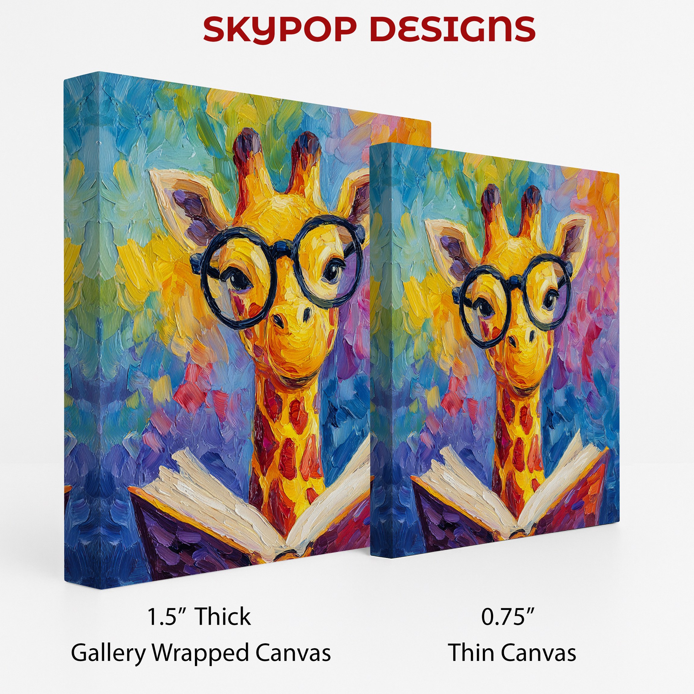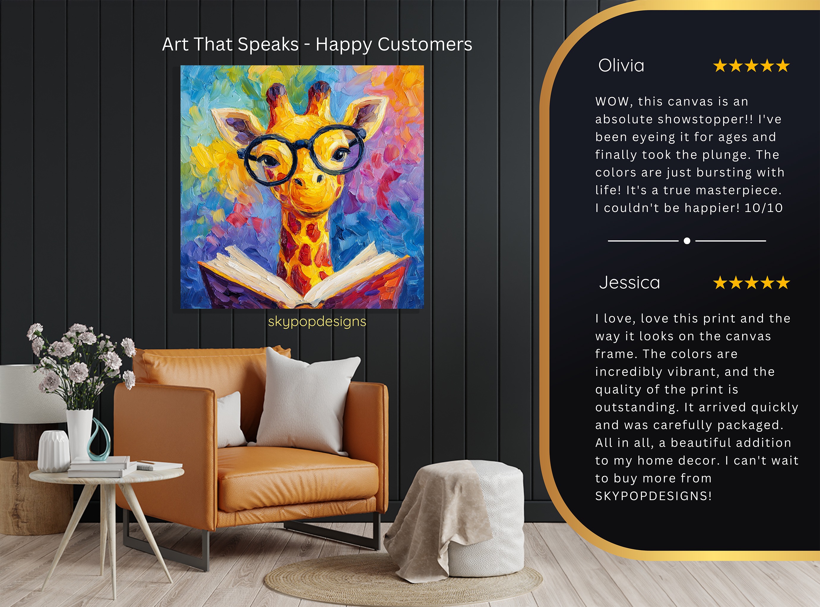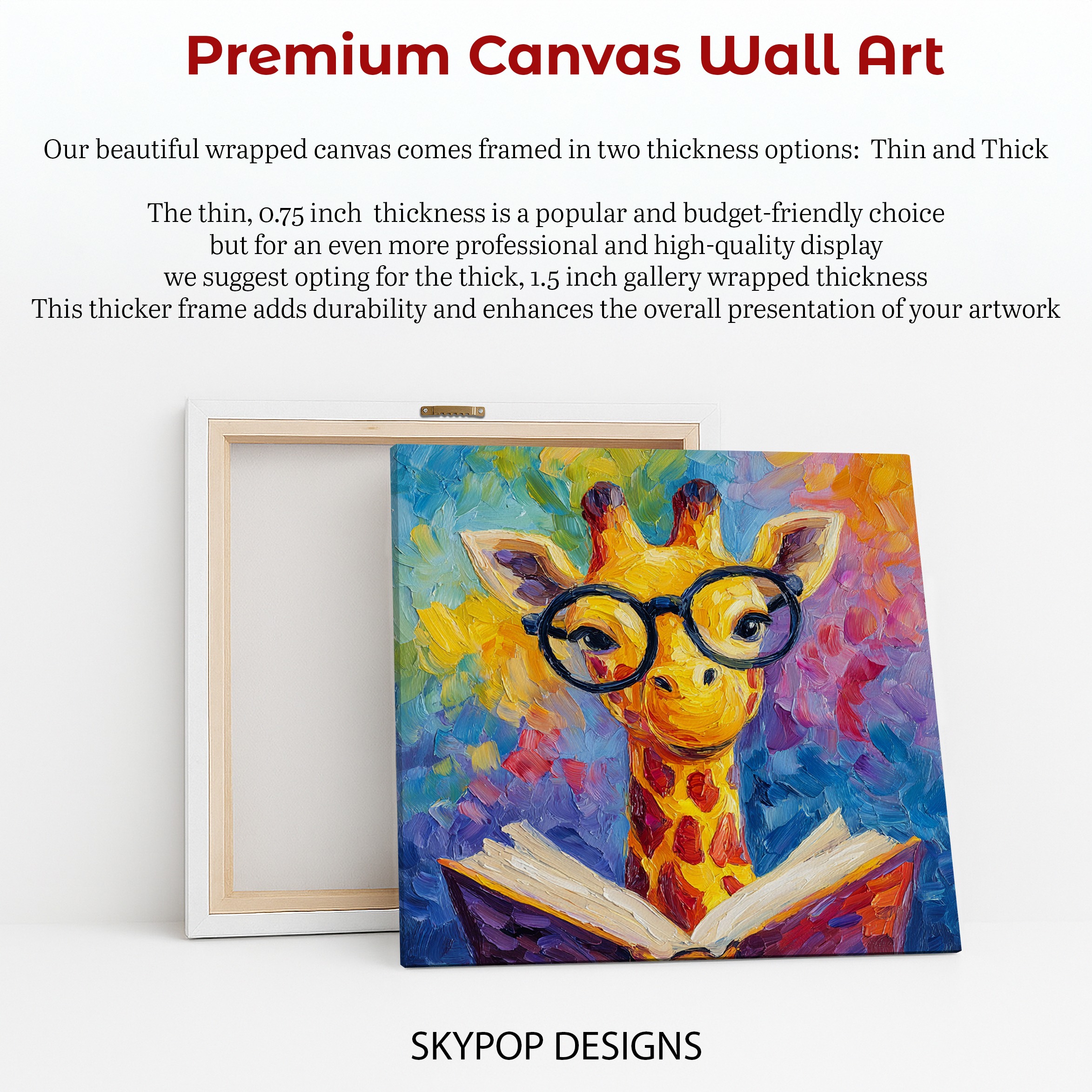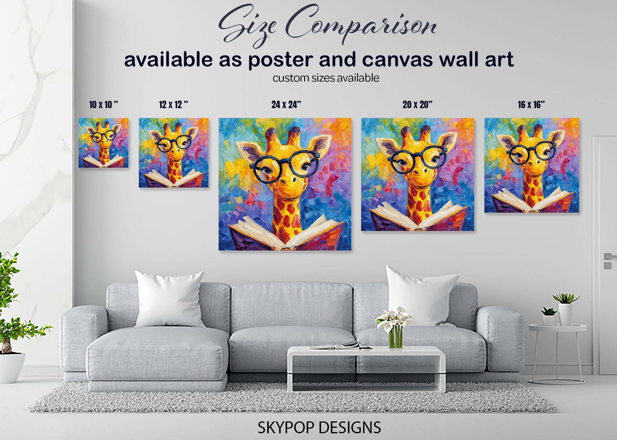 Elevate your space with this charming giraffe canvas wall art, featuring a lovable long-necked friend wearing oversized glasses and reading a book. This whimsical poster brings a burst of color and personality to any room, making it an ideal choice for modern home decor enthusiasts. The vibrant palette of yellows, blues, reds, and purples creates a striking visual impact, perfect for brightening up an office, library, or children’s room. The thick, textured brushstrokes give this canvas art a unique, handcrafted feel that adds depth and character to your walls. Ideal for book lovers and animal enthusiasts alike, this playful giraffe artwork celebrates the joy of reading and learning. The quirky combination of a studious giraffe with funky eyewear makes this piece a great conversation starter in living rooms or study areas. Transform your space with this eye-catching wall art that blends contemporary style with a touch of whimsy. The large, round glasses add a humorous element that’s sure to bring smiles to both kids and adults. Whether you’re looking for eclectic bedroom decor or a fun addition to your home office, this giraffe canvas art fits the bill. It’s also a perfect gift for book lovers, teachers, or anyone who appreciates unique animal art. Bring a splash of creativity and color to your walls with this delightful giraffe reading glasses artwork today!