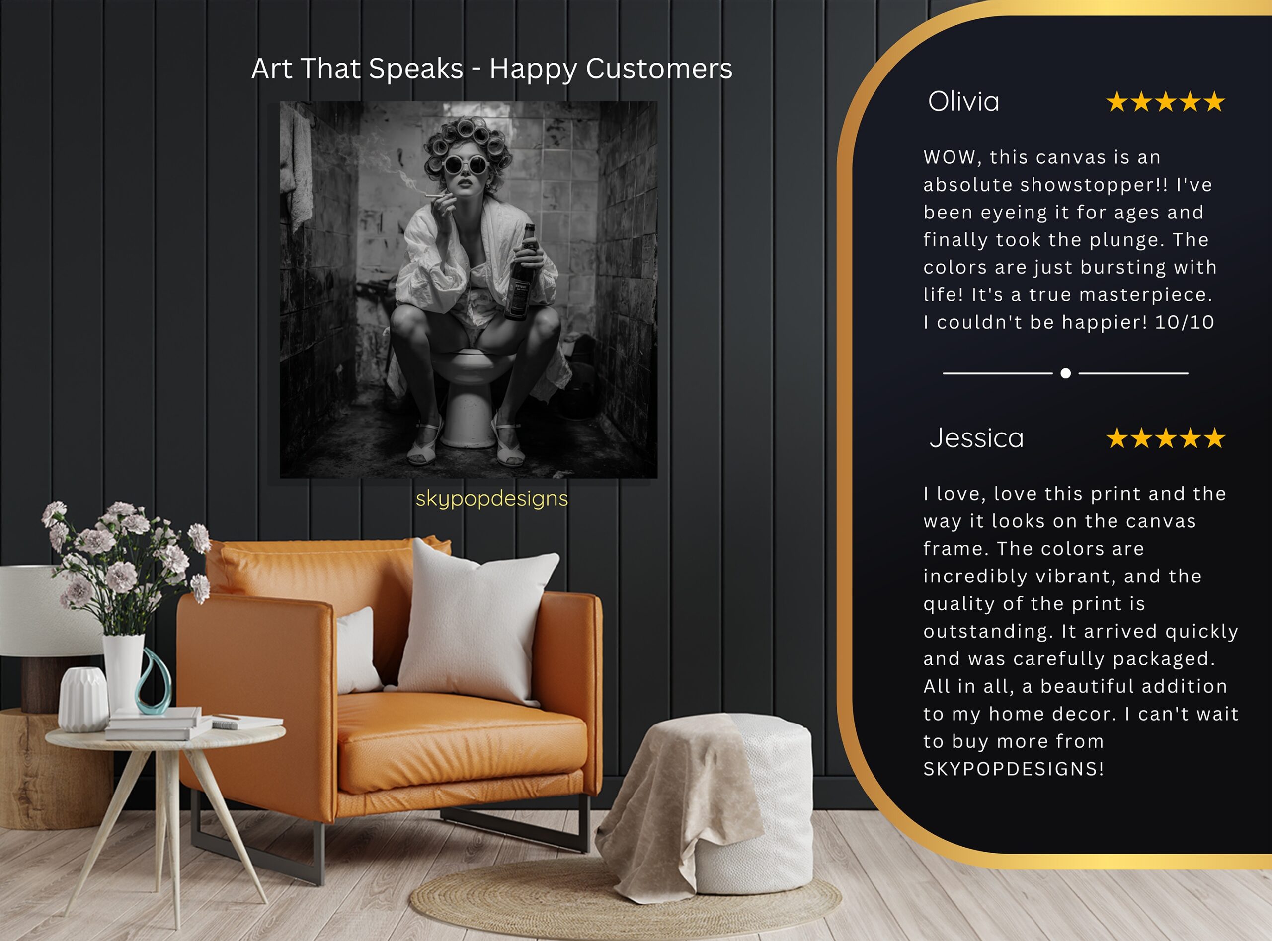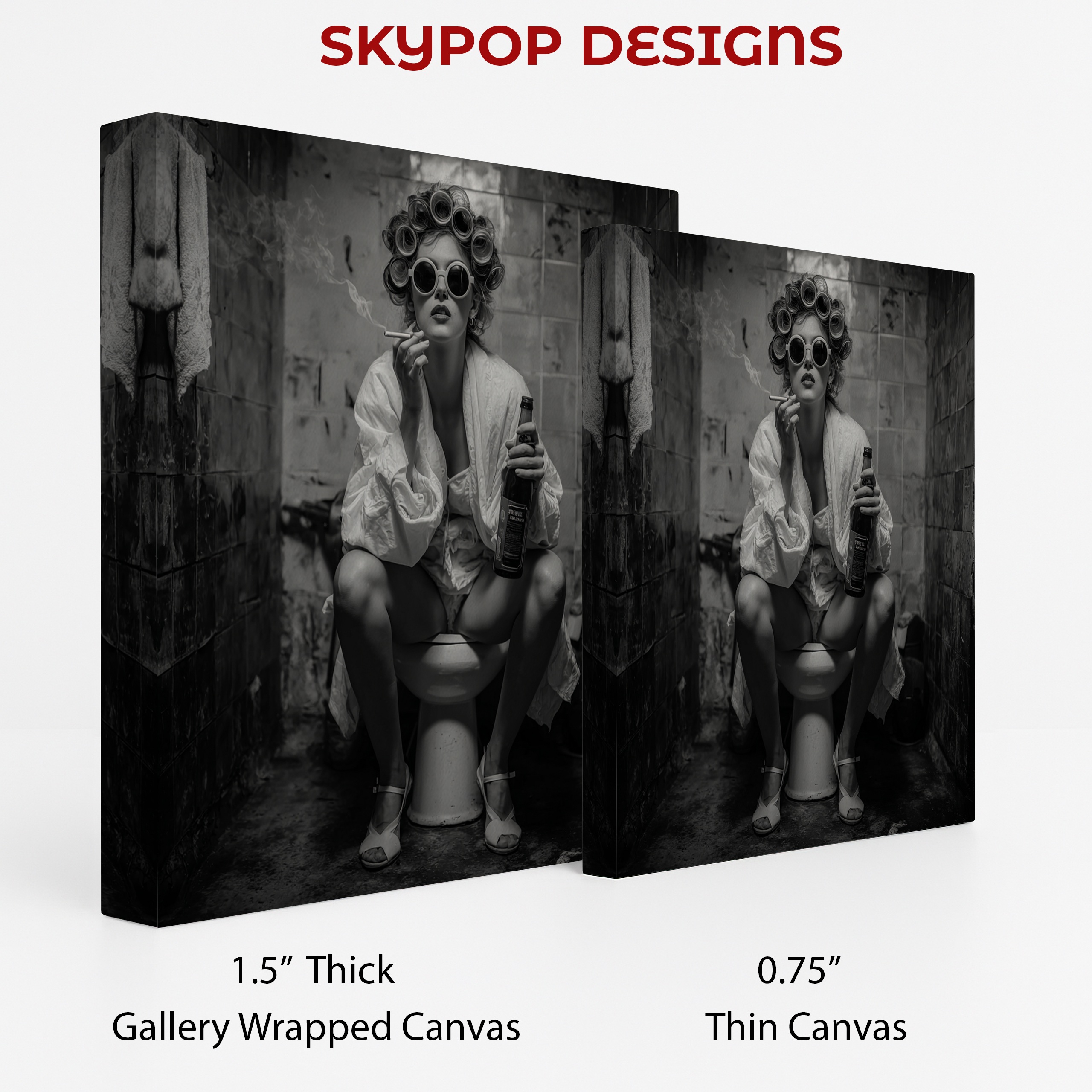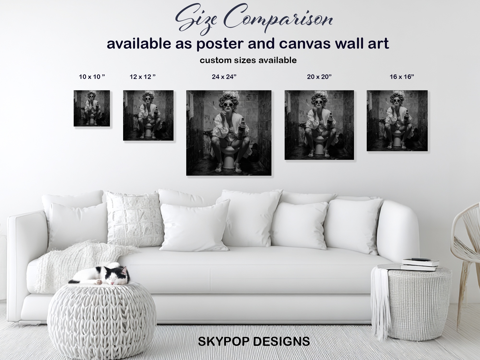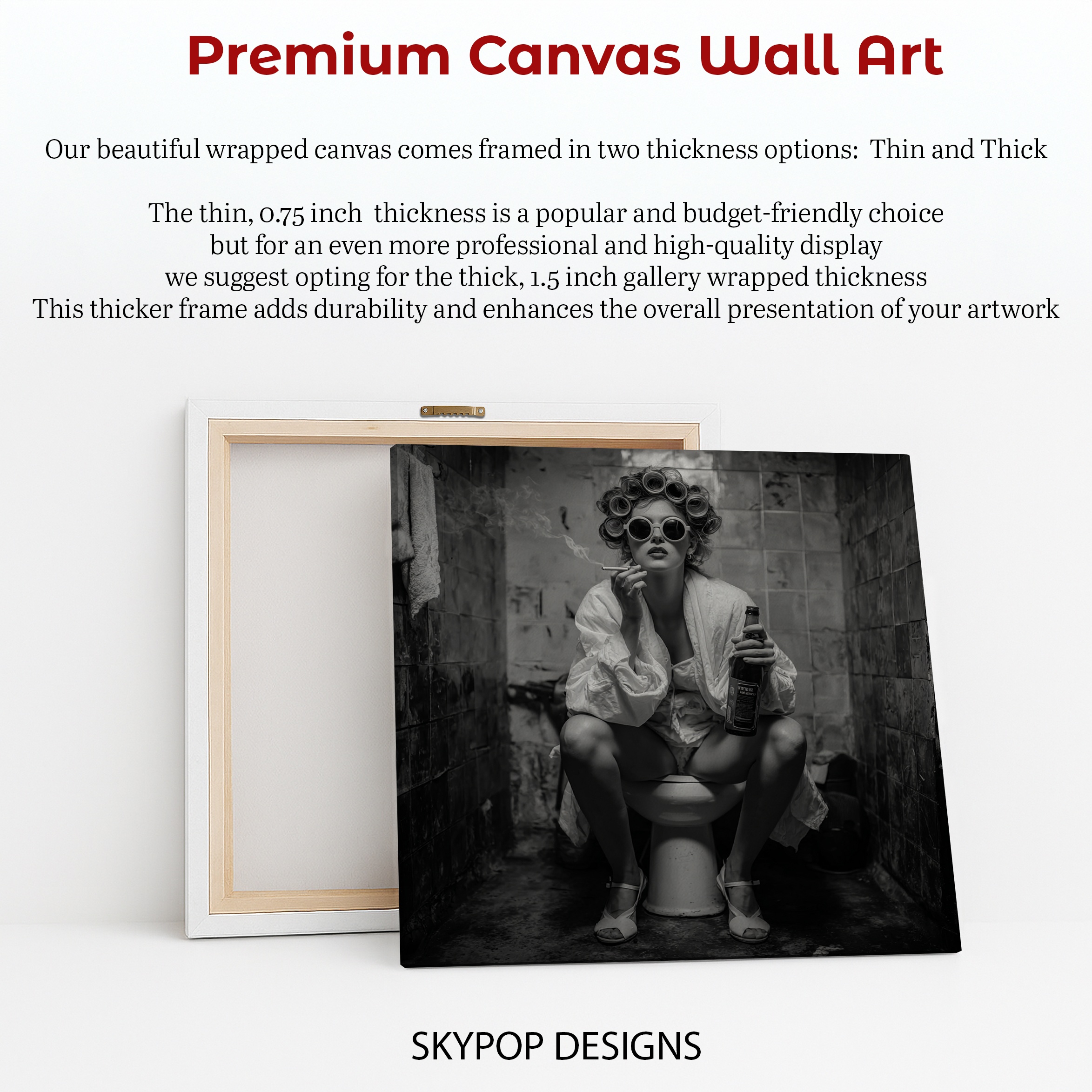 Transform your space with this striking black and white canvas wall art that captures a moment of glamorous chaos. This eye-catching poster features a figure in hair rollers and oversized sunglasses, exuding retro charm and rebellious attitude. Perfect for adding a touch of edgy sophistication to your bathroom, bedroom, or living room decor. The high-contrast image pops against any wall, making it an ideal focal point for contemporary or bohemian interiors. The subject’s pose, holding a cigarette and bottle, speaks to themes of indulgence and defiance, creating a conversation starter for your home bar or entertainment area. This canvas art brilliantly combines elements of retro glamour with modern pop art sensibilities, appealing to those who appreciate bold, unconventional decor. The monochromatic palette with a hint of red from the bottle label adds depth and intrigue to the composition. Ideal for fashion enthusiasts, this piece celebrates individuality and style in everyday moments. Whether you’re looking to make a statement in a small powder room or create a dramatic accent in a larger space, this versatile artwork adapts to various room sizes. High-quality printing ensures every detail, from the curlers to the tiled background, is captured with clarity. Elevate your home’s atmosphere with this unique blend of humor, style, and attitude. Make a bold decor statement and transform your space with this captivating bathroom scene art today.