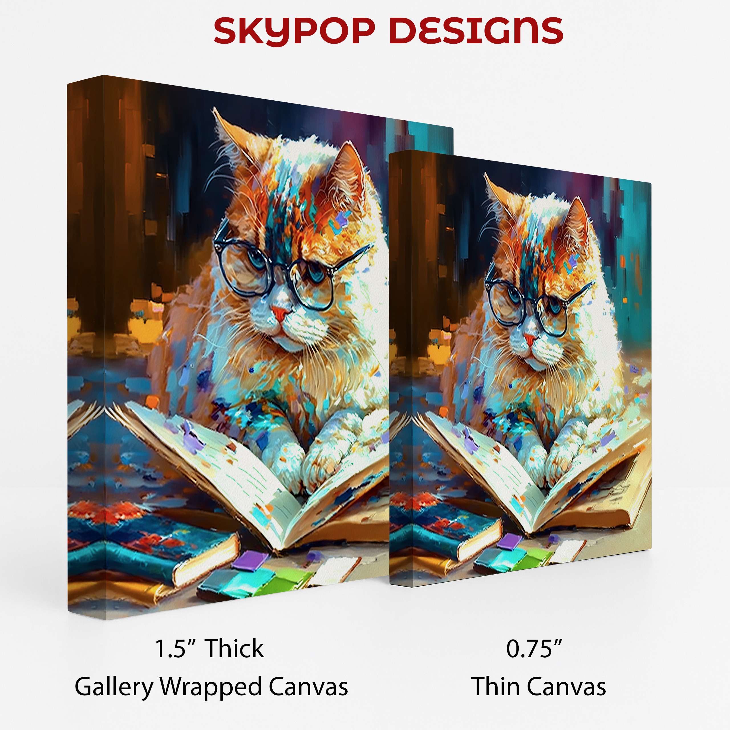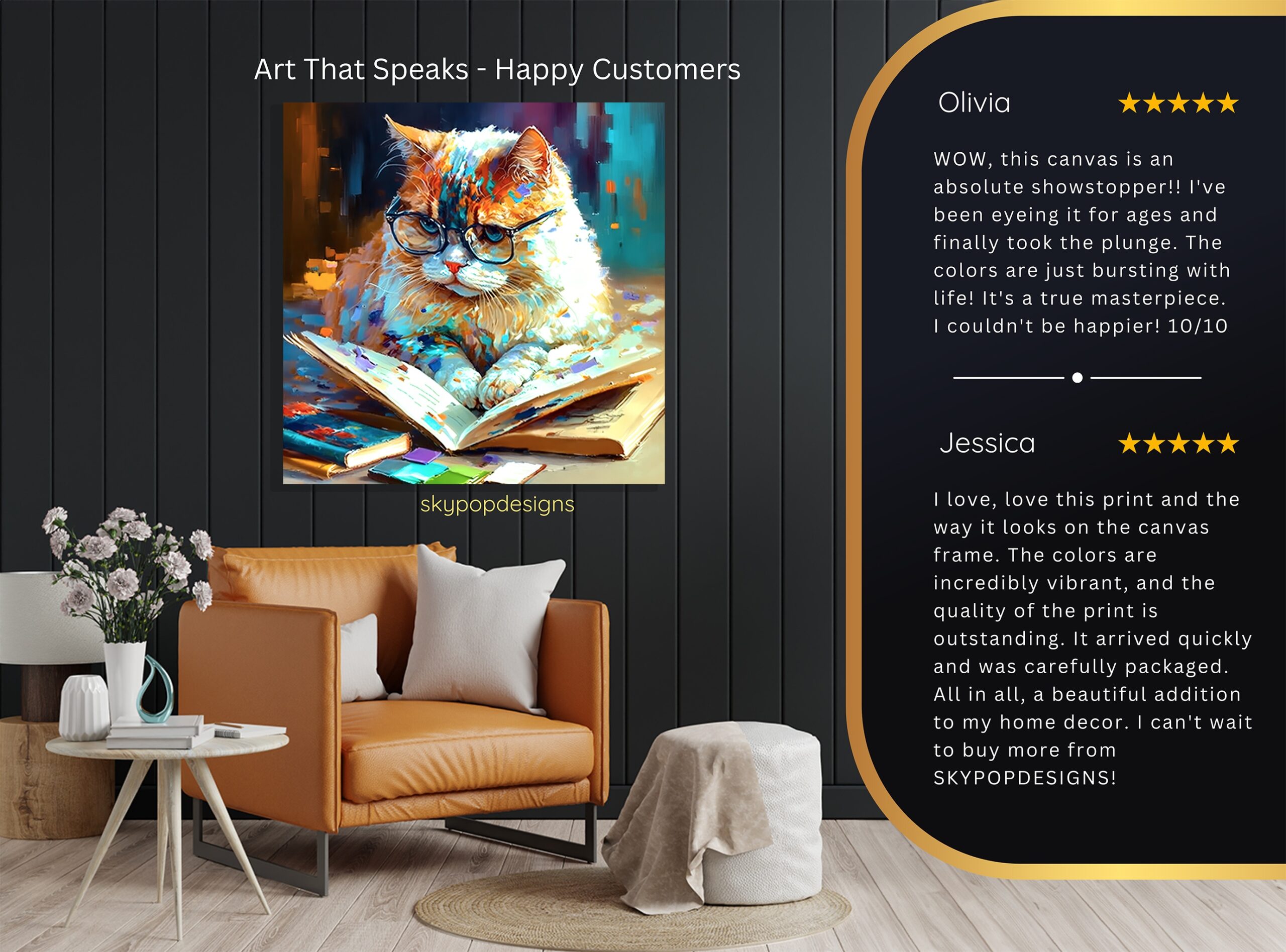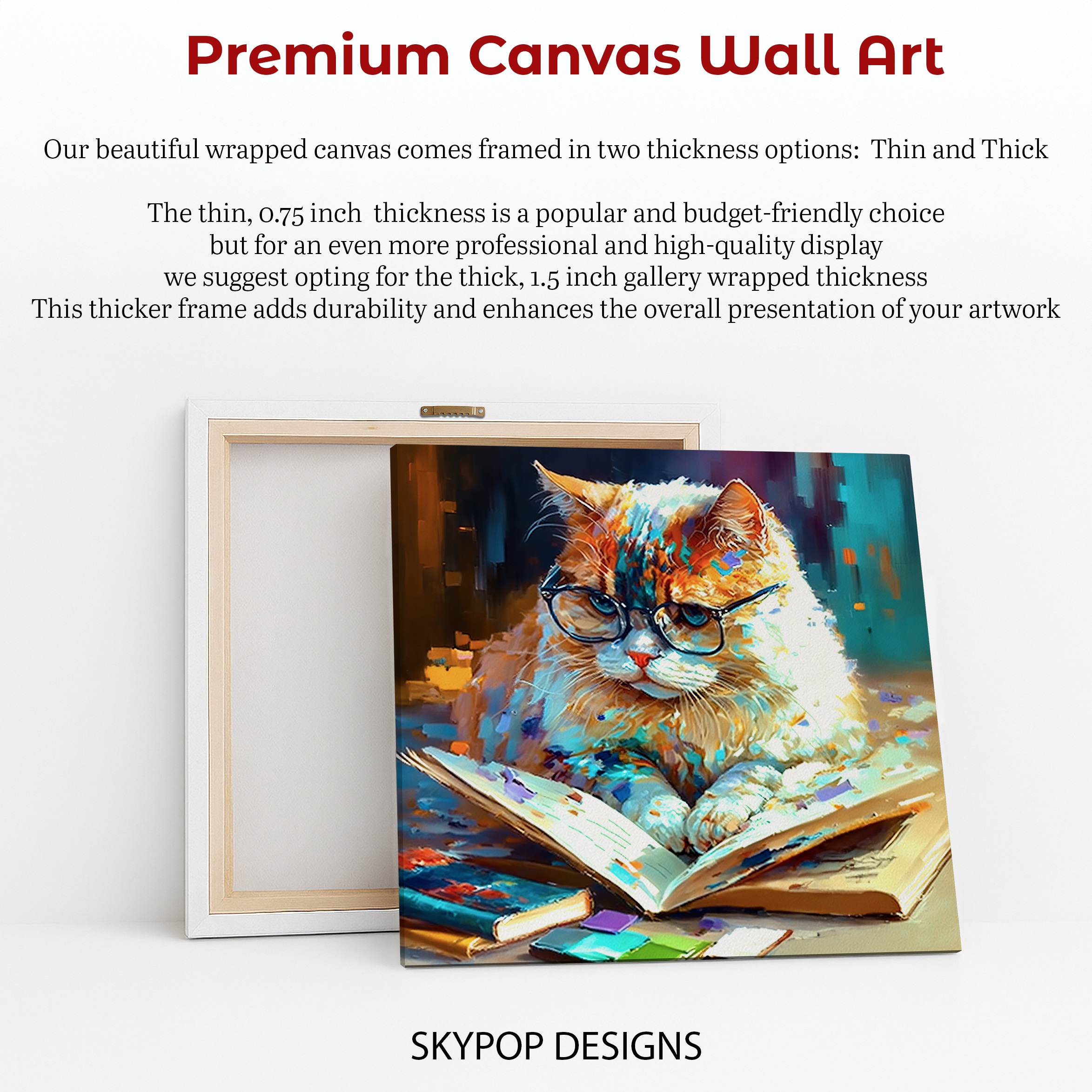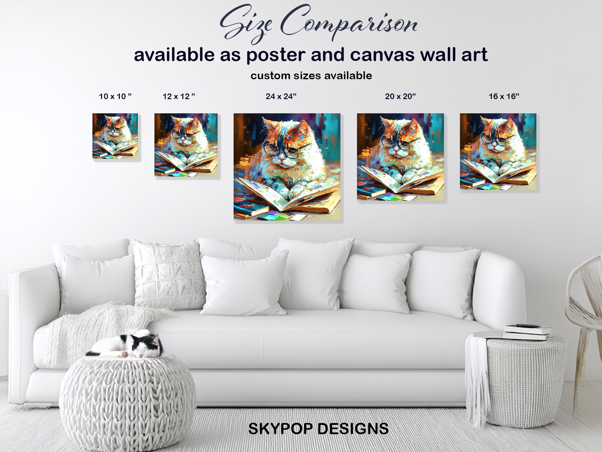 Bring a touch of whimsical charm to your home with this captivating cat canvas wall art featuring a scholarly cat engrossed in a book, wearing stylish glasses. This vibrant pop art poster showcases a unique blend of animal art and abstract expression, transforming any space into a cozy reading nook. The multicolor palette, with striking pops of blue, yellow, and orange, creates a lively yet sophisticated atmosphere, perfect for a modern living room or a creative office. This eye-catching artwork, whether as a canvas wall art or a poster, is an ideal addition to bohemian or contemporary decors, adding personality and warmth. The detailed brushstrokes and dynamic composition will inspire intellectual curiosity and create a focal point that sparks conversation. Its versatile appeal makes it a fantastic choice for a library, a den, or even a children’s room, celebrating the joy of reading and learning. This high-quality print captures the essence of the artwork, making it a stunning piece for any wall. Make this unique cat poster a cherished addition to your art collection or an unforgettable housewarming, birthday, or holiday gift for any book lover or cat enthusiast. Elevate your decor and celebrate the love for literature with this delightful and inspiring canvas wall art today.