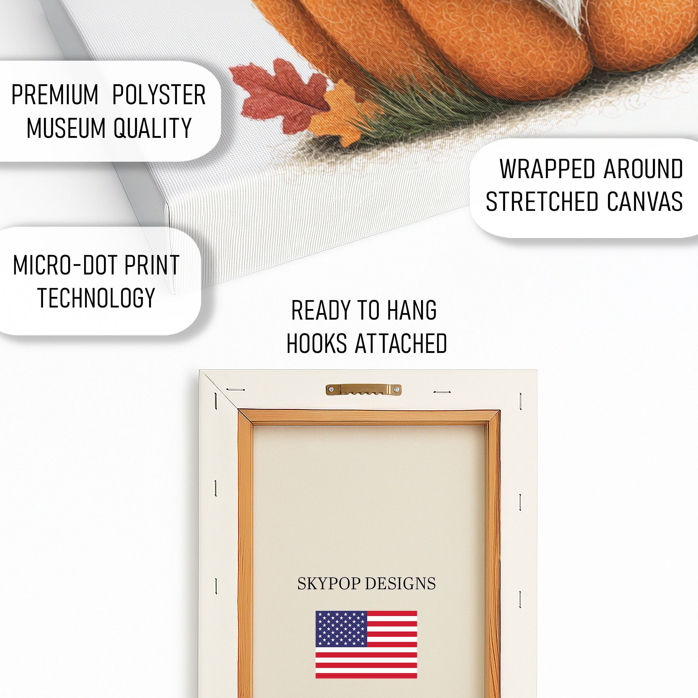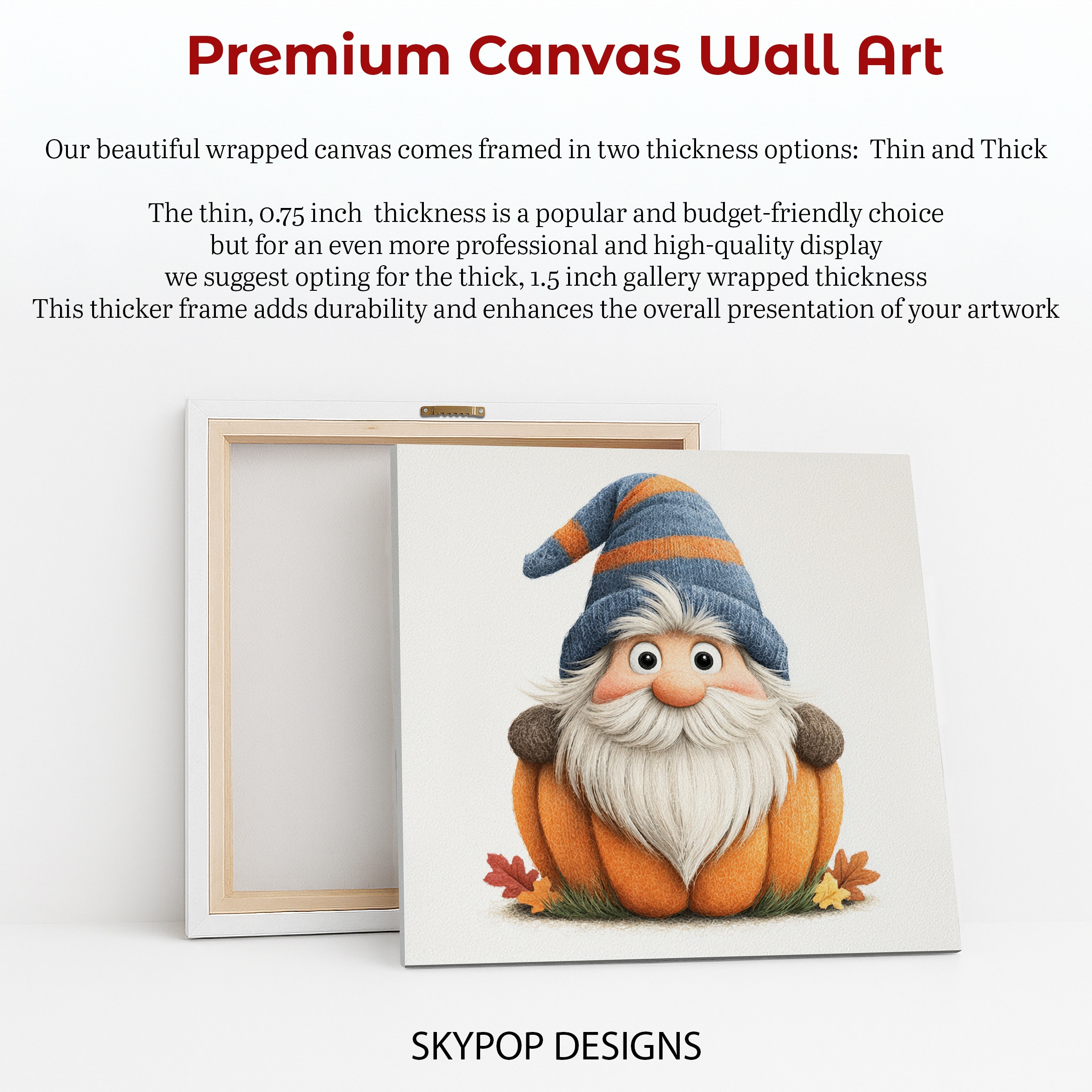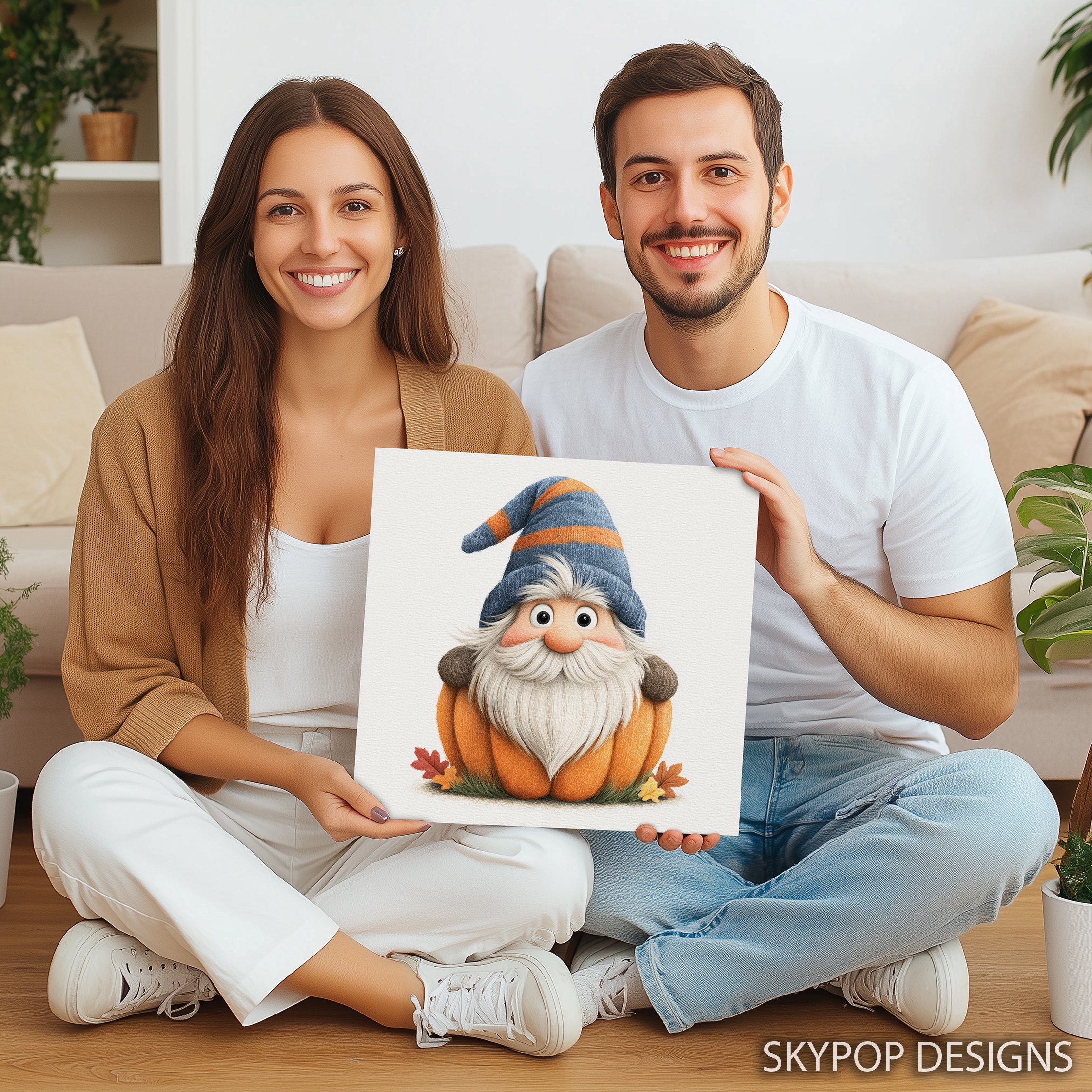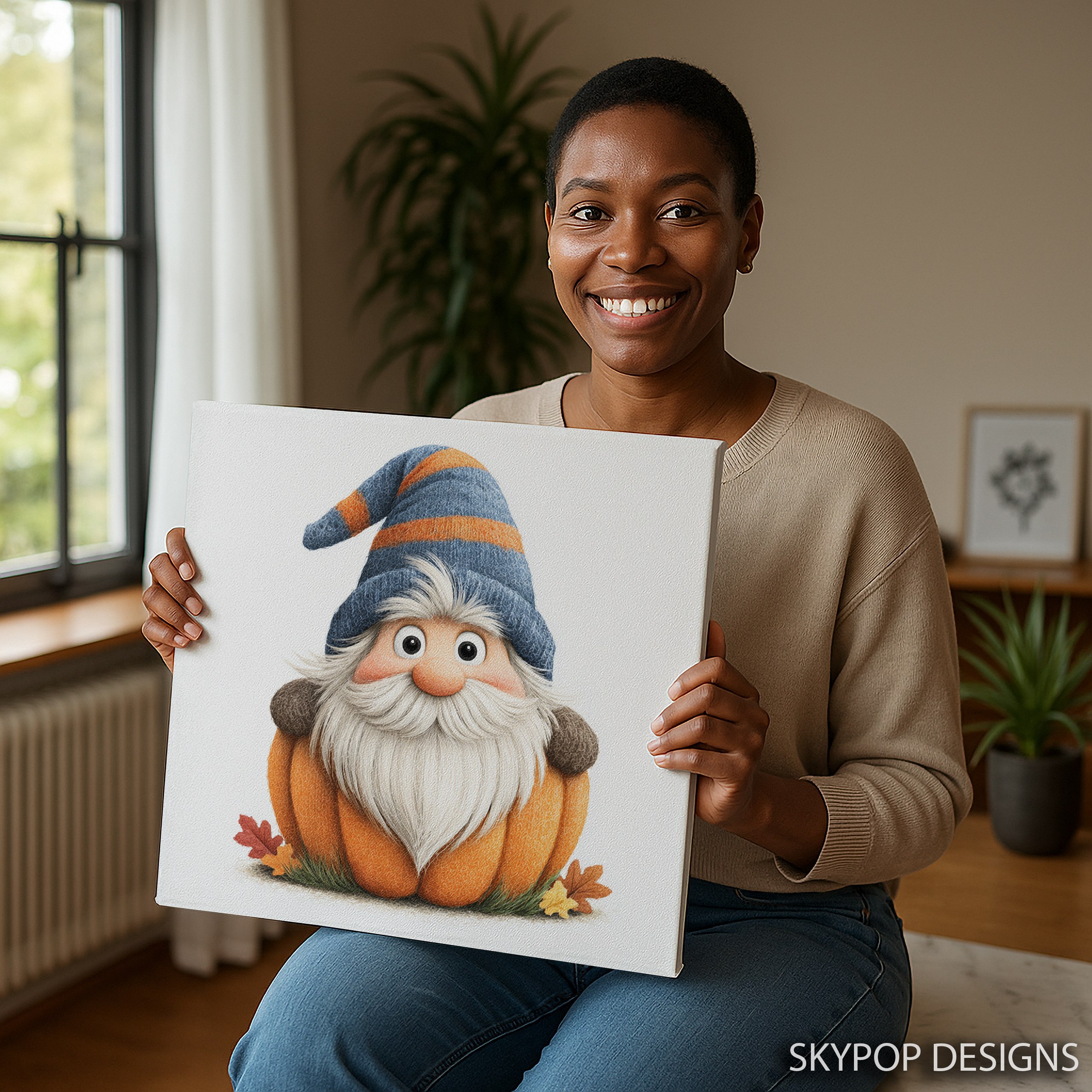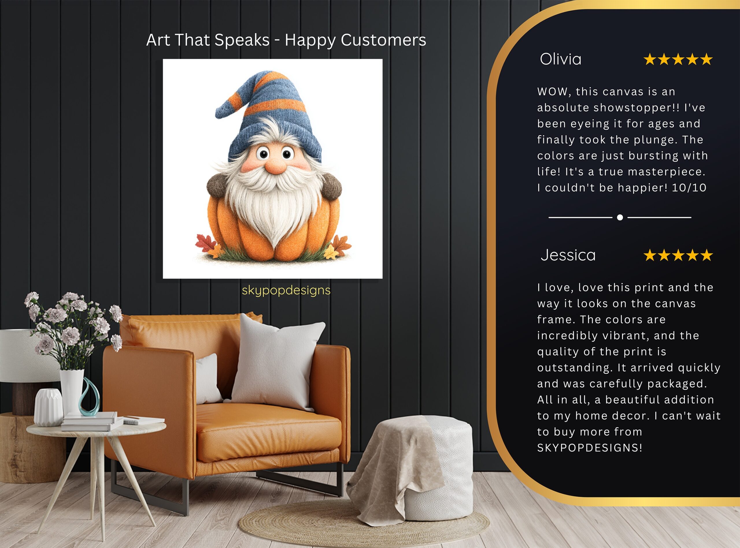 Bring a touch of whimsical charm to your home with this delightful autumn-themed canvas wall art featuring an adorable gnome nestled in a pumpkin. This captivating piece combines rustic charm with playful design, making it perfect for farmhouse-style living rooms or cozy bedrooms. The vibrant orange pumpkin contrasts beautifully with the gnome’s blue striped hat, creating a visually striking focal point that instantly draws the eye. Ideal for those who love seasonal decor, this poster or canvas art celebrates the magic of fall with its warm color palette and cute character. The gnome’s fluffy white beard and big expressive eyes add personality and warmth to any space, while the subtle autumn leaves at the base enhance the seasonal theme. This versatile artwork is perfect for creating a welcoming atmosphere in your home office or adding a touch of whimsy to a child’s room. The high-quality printing captures every intricate detail, from the texture of the knitted hat to the softness of the beard, ensuring this piece looks stunning from any angle. Whether you’re looking to refresh your fall decor or searching for a unique housewarming gift, this gnome pumpkin art offers a perfect blend of charm and style. Transform your space with this delightful piece that brings a smile to everyone who sees it. Elevate your wall art collection with this cozy, autumn-inspired canvas that celebrates the joy of the season.