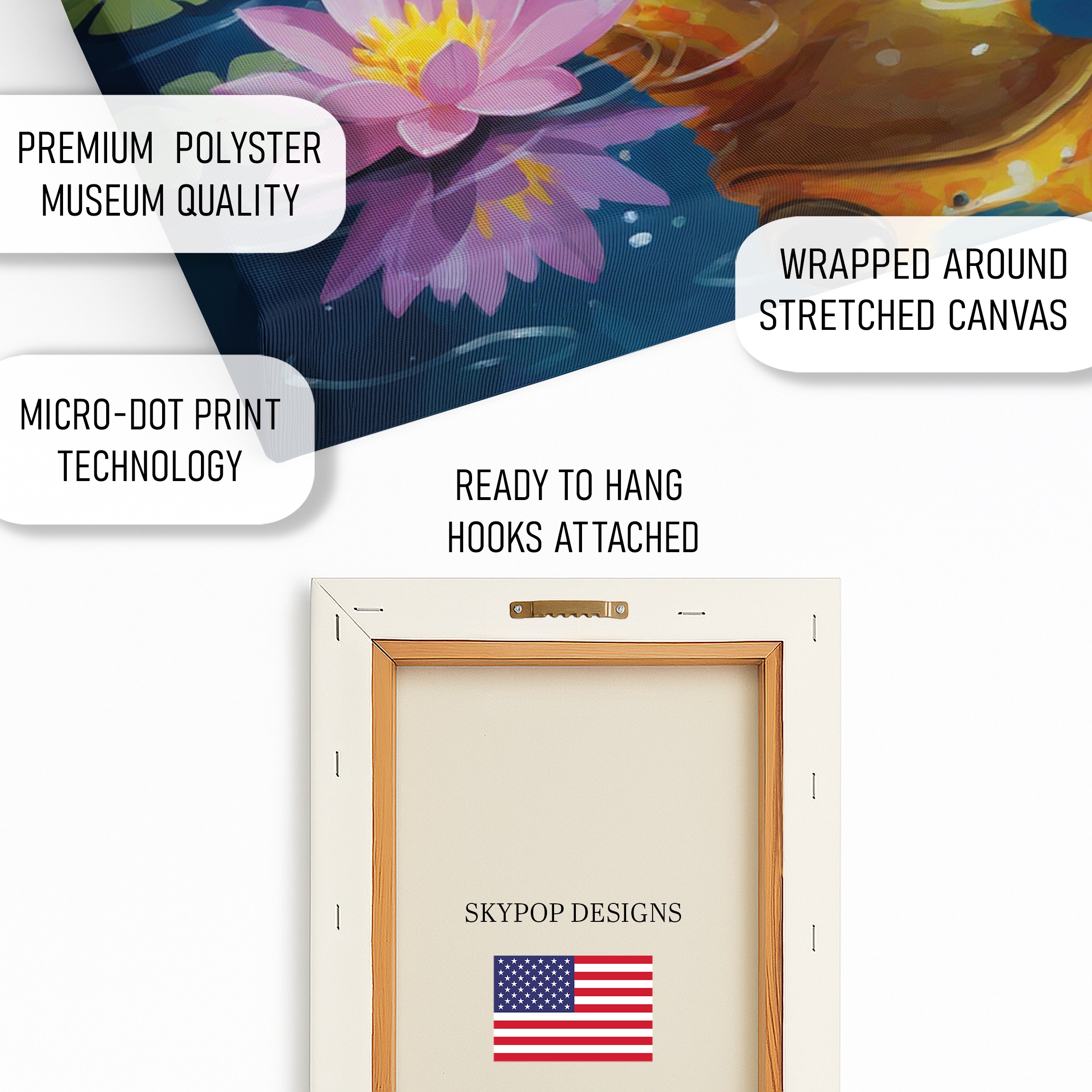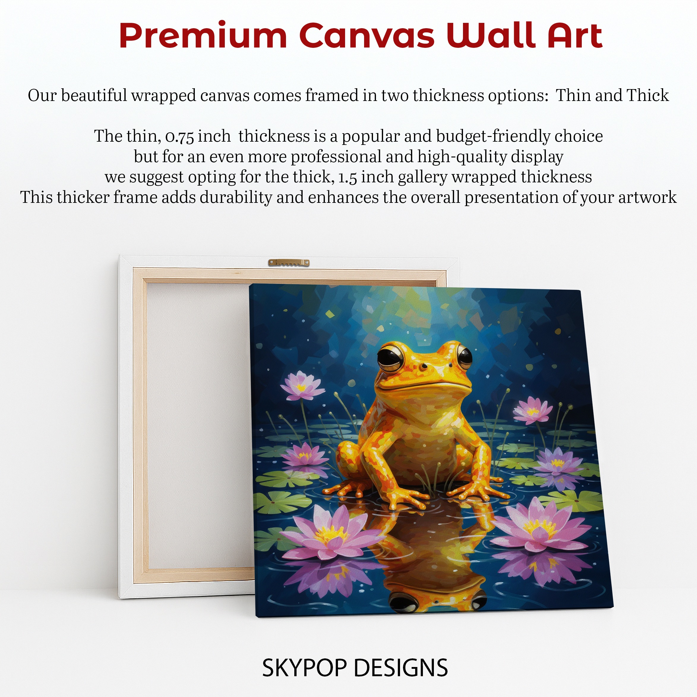 Keywords: Frog Art, Golden Frog, Pond Art, Canvas Wall Art, Nature Art, Whimsical Art, Pop Art, Bohemian Decor, Modern Decor, Contemporary Decor, Living Room Art, Bedroom Art, Bathroom Art, Sunroom Art, Orange Art, Blue Art, Multicolor Art, Yellow Art, Animal Art, Frog Poster, Home Decor, Wall Decor, Statement Art, Tranquil Art, Joyful Art, Gift Ideas, Housewarming Gift, Birthday Gift, Charming Decor, Vibrant Wall Art