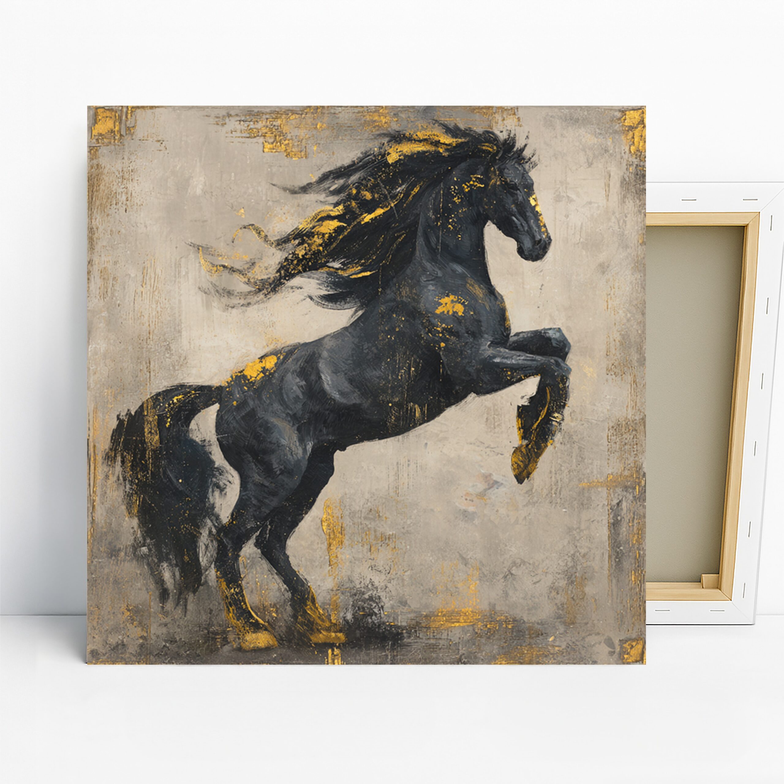 Elevate your space with this striking black and gold horse canvas wall art, perfect for adding a touch of elegance and drama to any room. This stunning poster showcases a powerful horse in mid-leap, its sleek black silhouette adorned with splashes of vibrant gold that catch the light and draw the eye. Ideal for modern living room wall decor or as a statement piece in a minimalist bedroom, this captivating artwork brings movement and energy to your walls. The contrast between the dark horse and the metallic accents creates a sense of luxury and sophistication, making it a perfect fit for contemporary or rustic interiors. The dynamic pose of the horse symbolizes strength and freedom, inspiring viewers and enhancing the mood of your space. This versatile canvas art works beautifully as a focal point in a home office or as an conversation starter in a dining room. The high-quality printing ensures every detail of the horse’s flowing mane and muscular form is captured with precision. Whether you’re a horse lover or simply appreciate striking wall art, this piece offers a perfect blend of nature and modern aesthetics. Transform your room today with this breathtaking horse wall art that celebrates the beauty and power of these majestic animals. Available in various sizes to suit any space, this canvas is sure to become a treasured addition to your home decor collection.