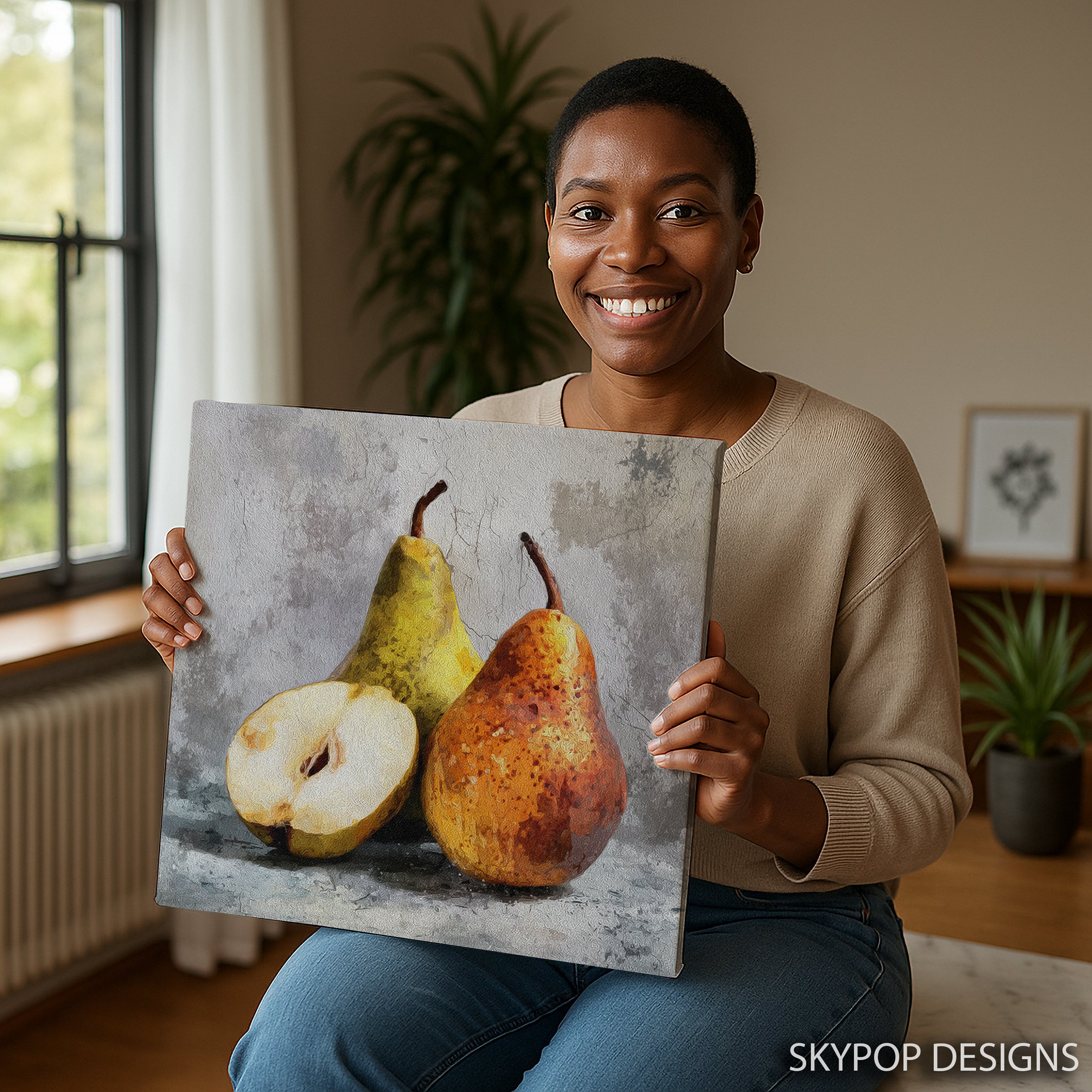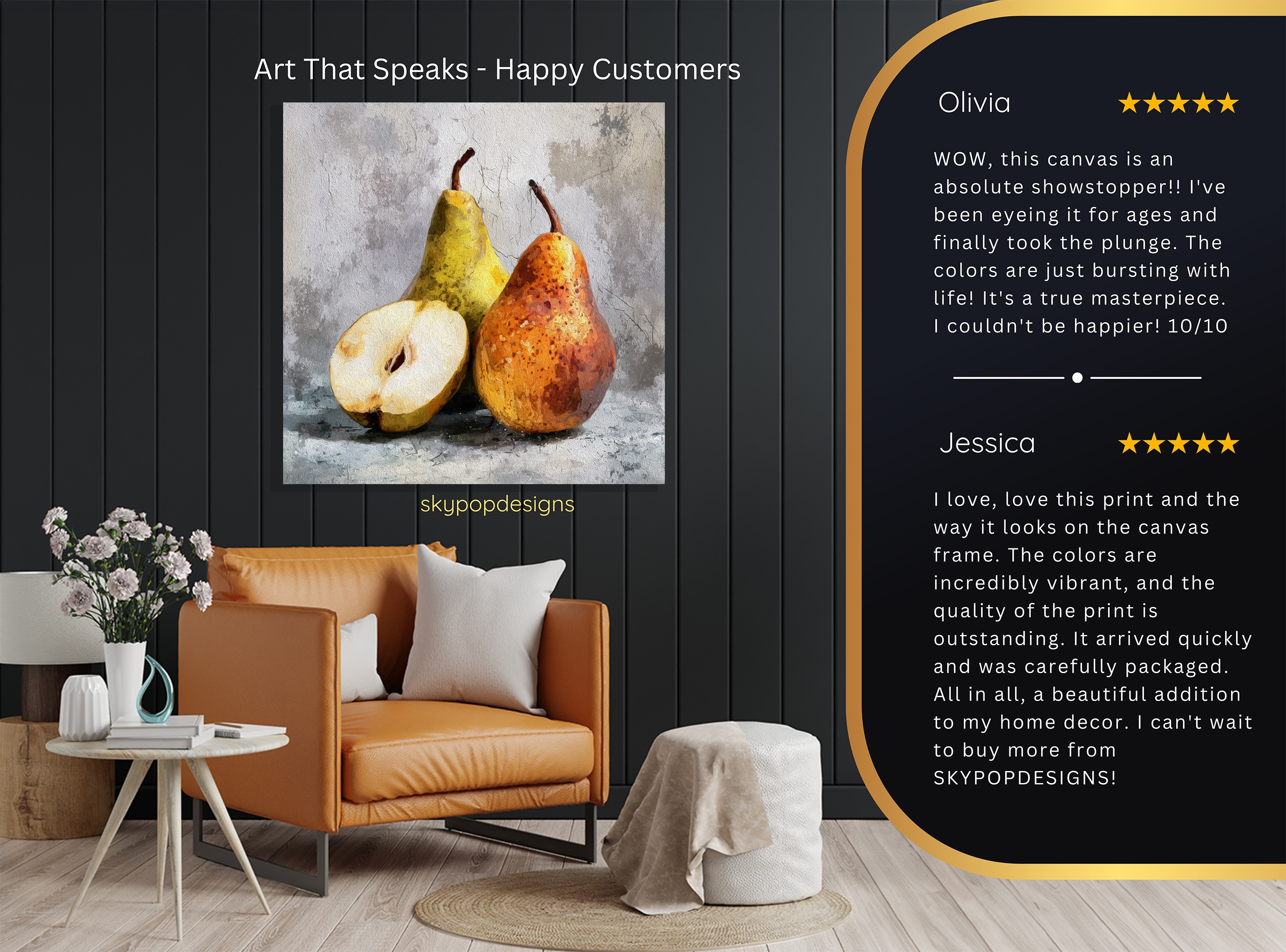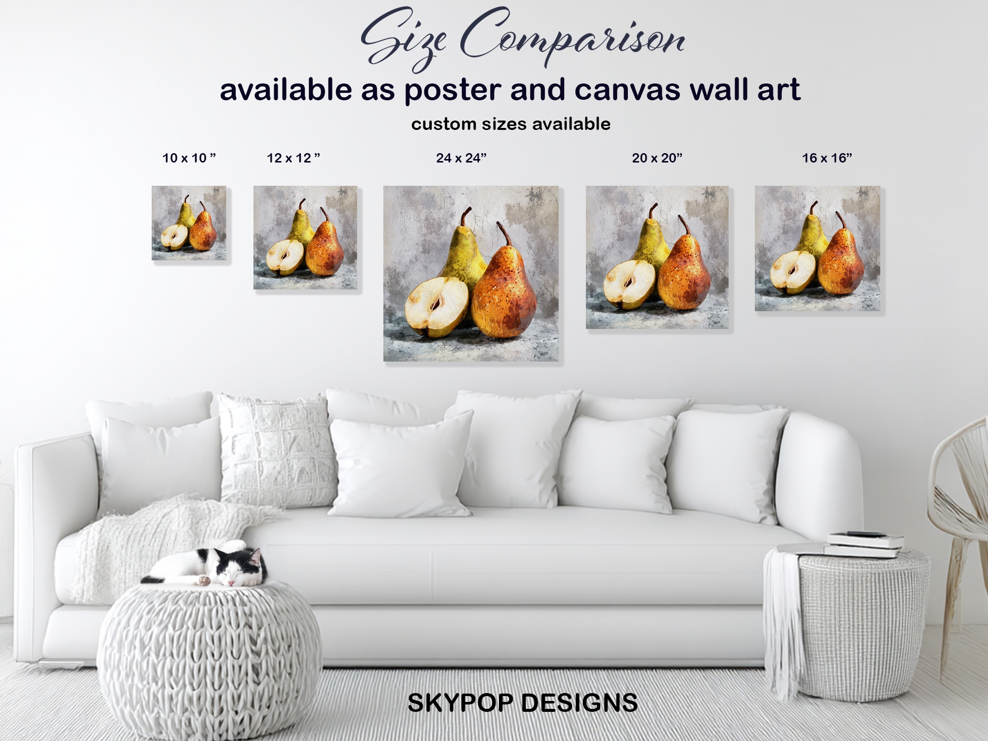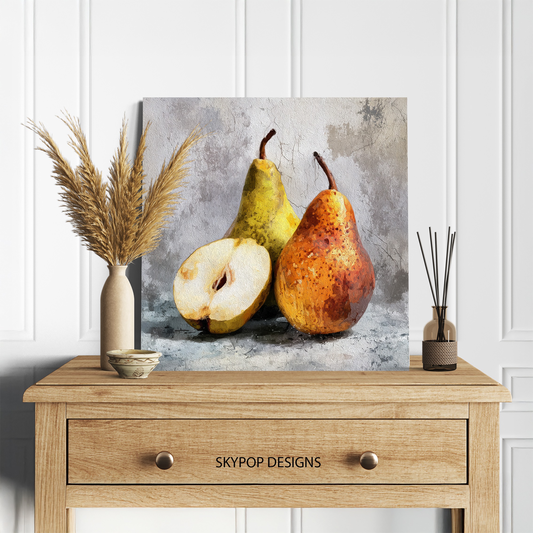 Elevate your space with this stunning pear canvas wall art, showcasing the beauty of nature’s simple pleasures. This vibrant still life poster captures two ripe pears in rich, golden hues, perfect for adding a touch of warmth to any room. The contemporary style and minimalist composition make it an ideal choice for modern kitchen decor or as a statement piece in a dining area. The textured brushstrokes bring depth and character to the canvas, creating a lifelike representation that almost beckons you to reach out and touch. This versatile wall art seamlessly blends with various decor styles, from rustic farmhouse to sleek contemporary spaces. The golden yellows and deep oranges evoke feelings of abundance and comfort, making it a perfect addition to living rooms or offices seeking a touch of natural elegance. High-quality printing ensures every detail is captured, from the pears’ subtle blemishes to the soft shadows they cast. Whether you’re a fruit lover or simply appreciate fine art, this pear-themed canvas will brighten your walls and lift your mood. Suitable for various sizes, this artwork adapts to different spaces, making it an excellent housewarming gift or a treat for yourself. Transform your home with this appetizing and aesthetically pleasing pear wall art today.
