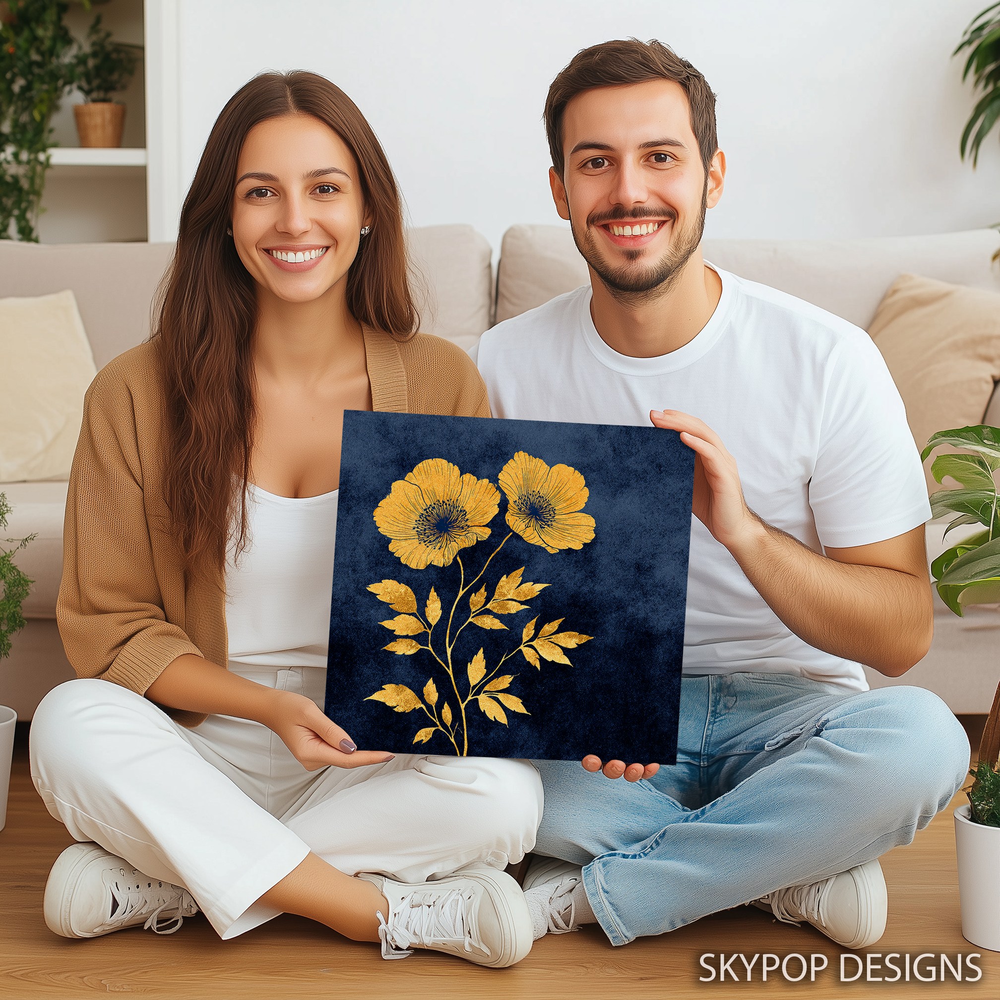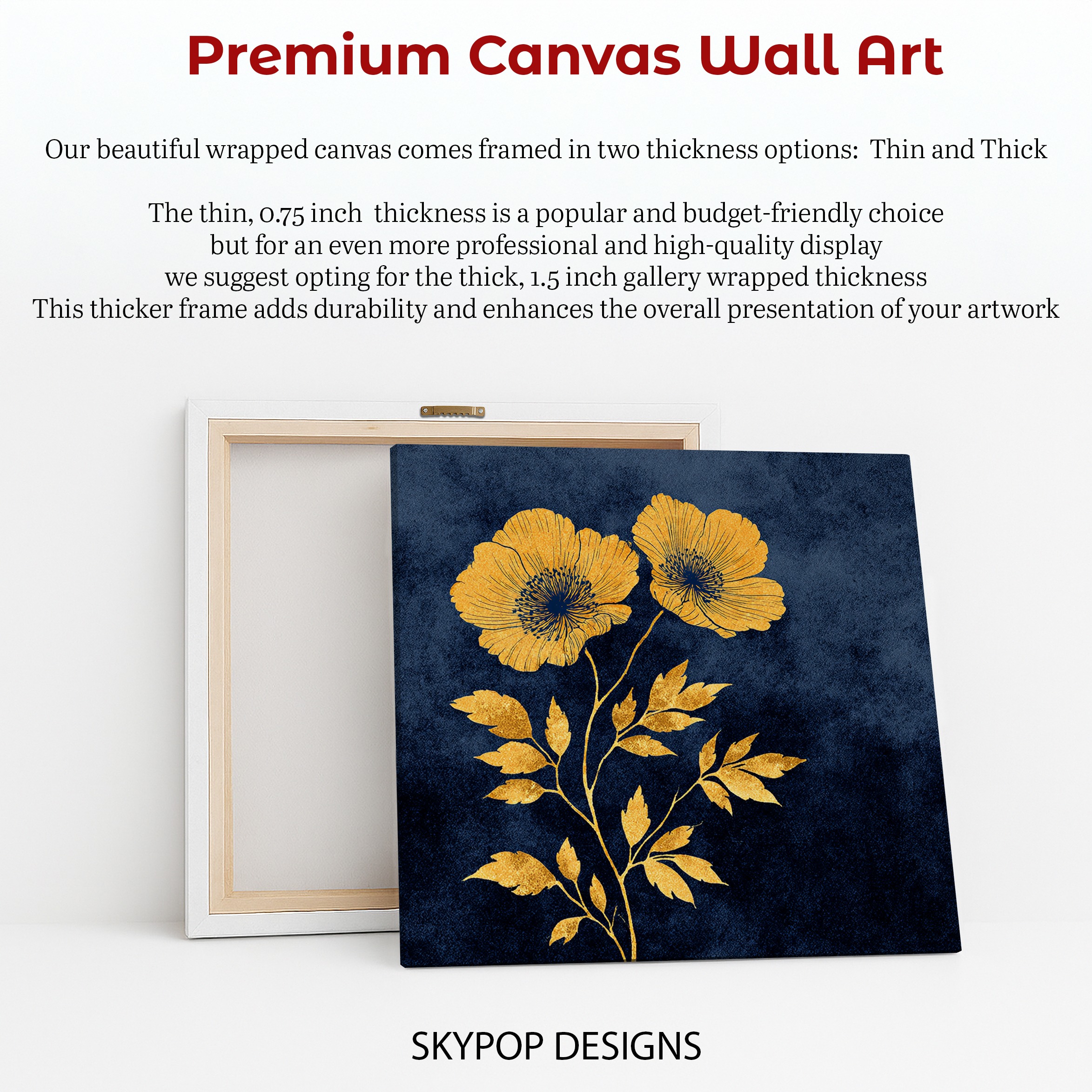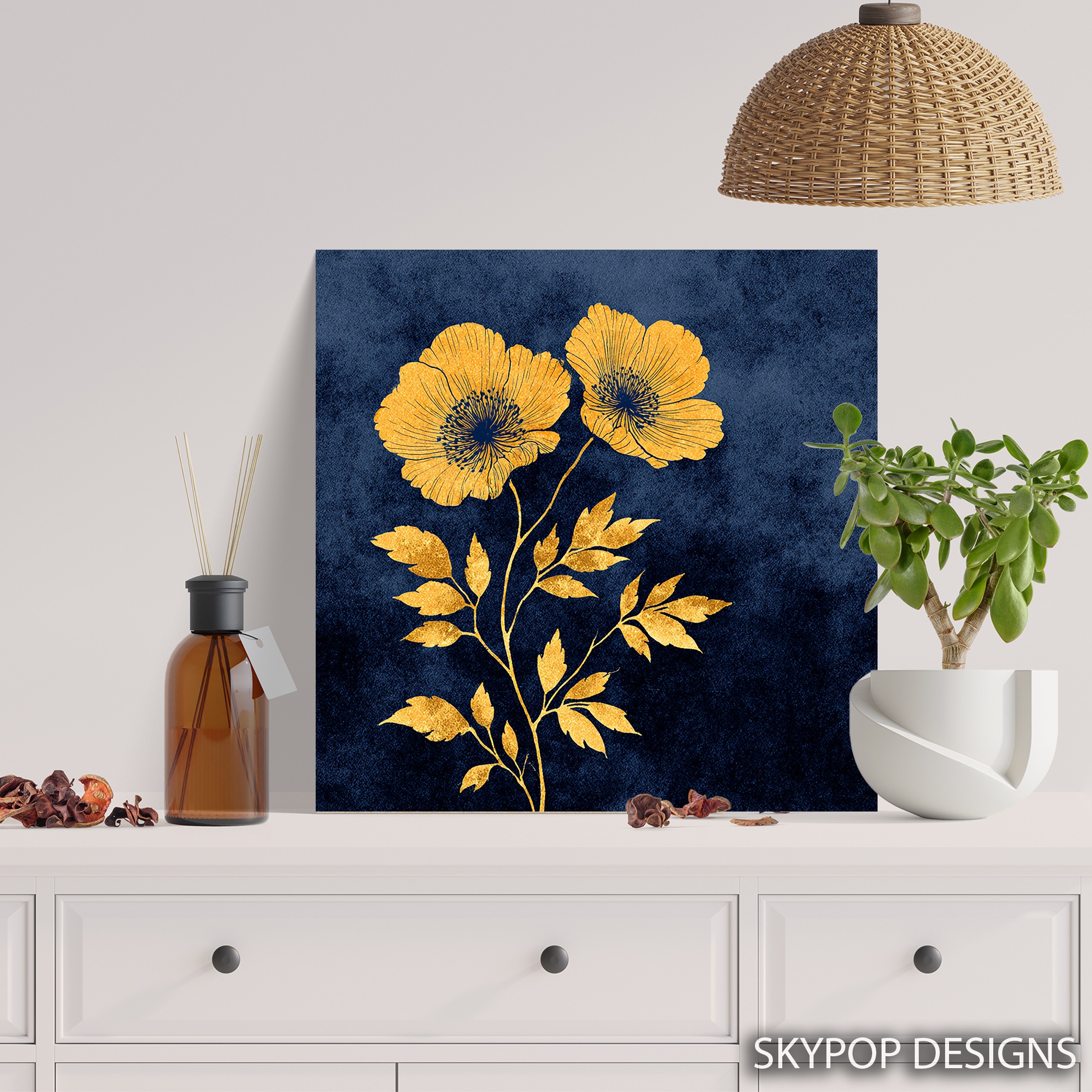 Transform your space with this striking golden poppy canvas wall art, a perfect blend of elegance and modern simplicity. The vibrant gold flowers pop against the deep navy background, creating a captivating contrast that instantly draws the eye. This stunning poster or canvas print showcases two beautifully detailed poppies, their delicate petals and intricate centers rendered in rich, warm golden hues. Ideal for contemporary living rooms or minimalist bedrooms, this piece adds a touch of sophistication and natural beauty to any wall. The sleek, stylized design of the flowers and leaves perfectly complements Scandinavian-inspired interiors, while the bold color palette injects warmth and energy into modern spaces. Whether displayed as a standalone statement piece or as part of a gallery wall, this artwork elevates your decor with its timeless appeal. The high-quality printing captures every nuance of the golden poppies, from the fine lines of the petals to the textured center, ensuring a luxurious look that rivals original paintings. Perfect as a housewarming gift or to refresh your own space, this versatile wall art adapts beautifully to various room styles and color schemes. Bring the outdoors in and create a serene, nature-inspired atmosphere in your home or office with this elegant golden poppy canvas. Elevate your wall decor today and enjoy the timeless beauty of these golden blooms year-round.