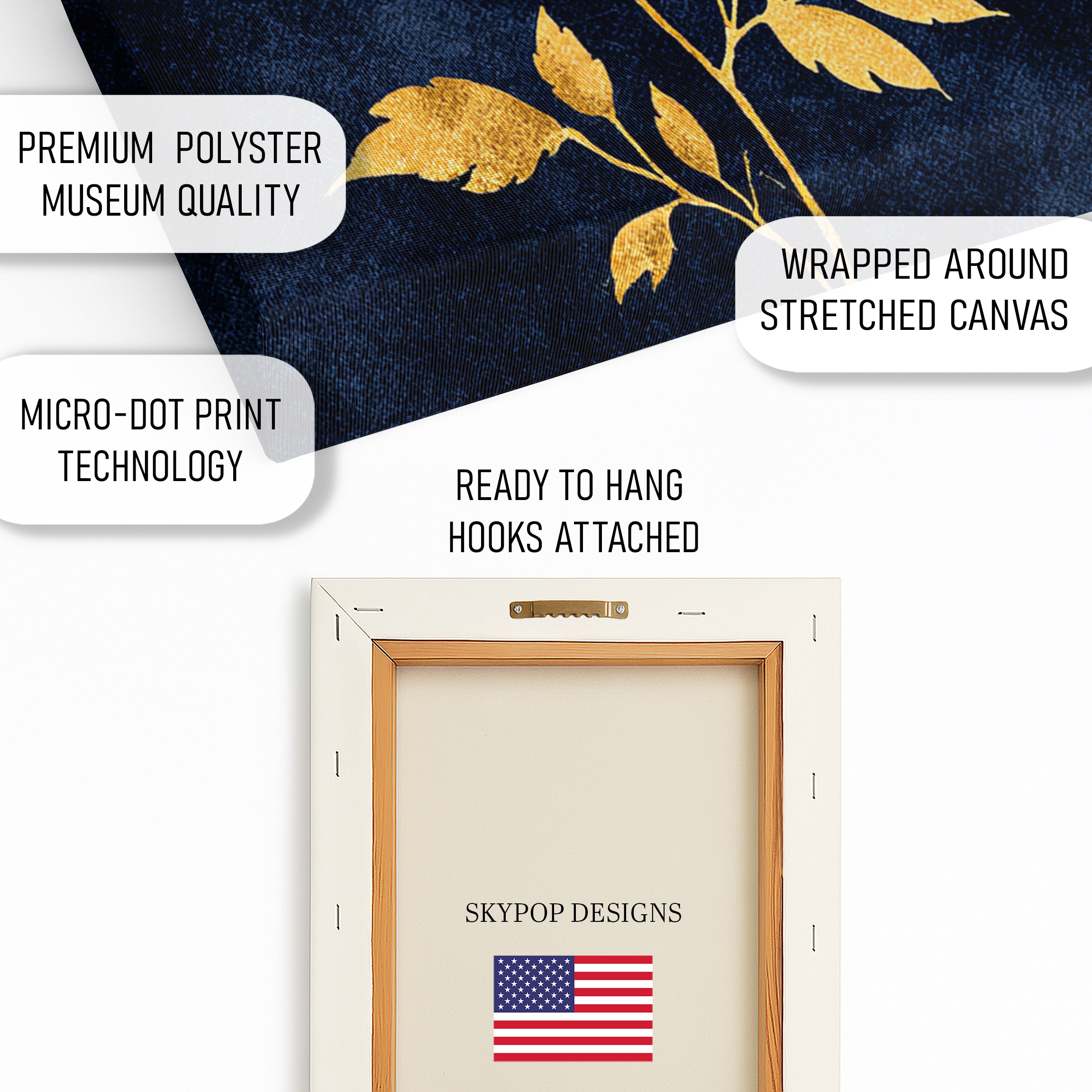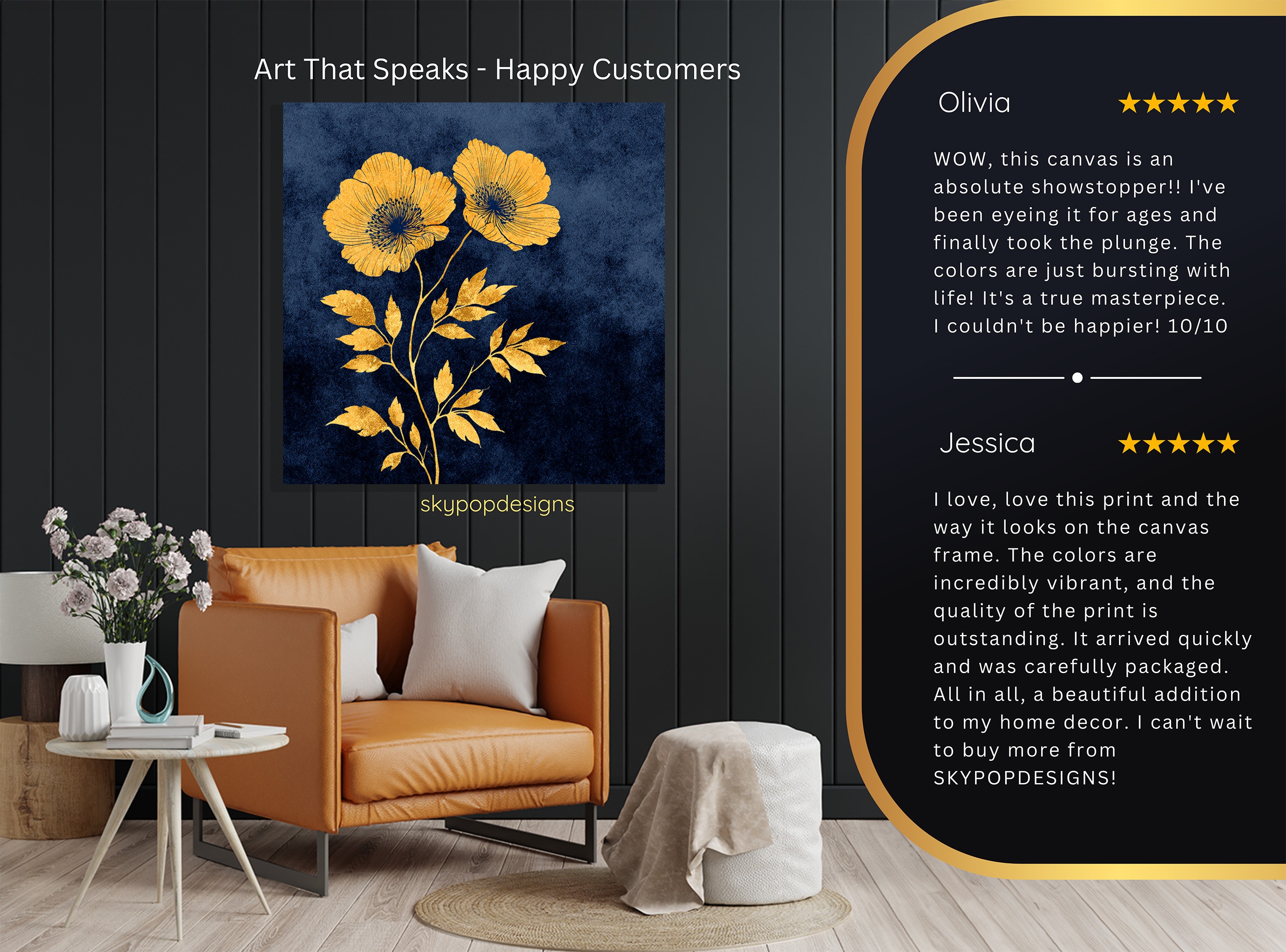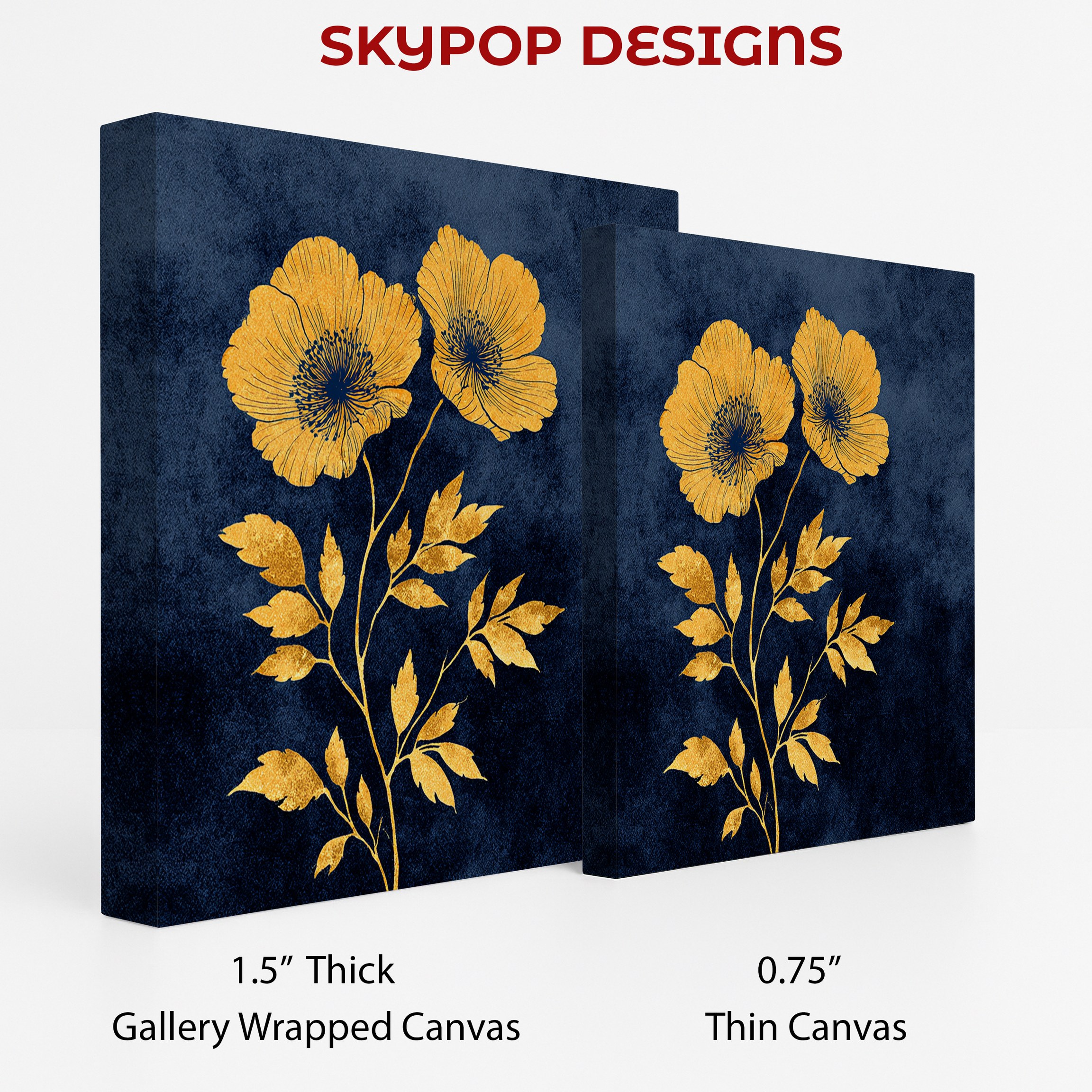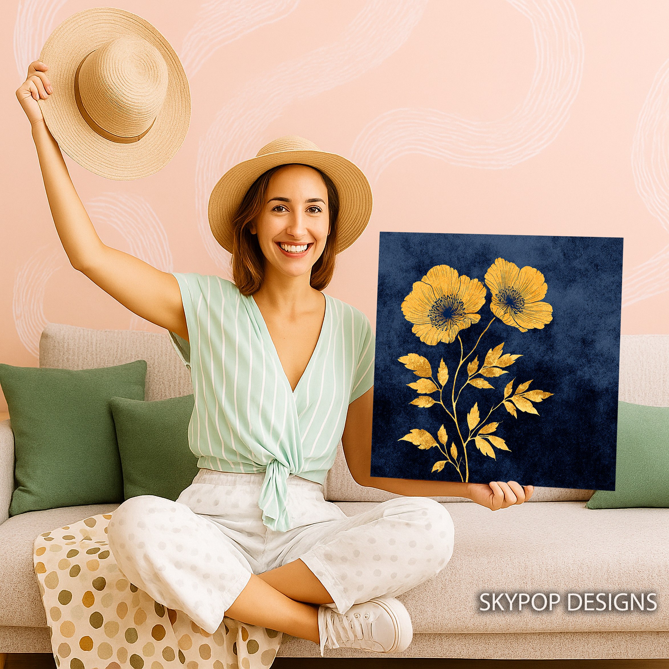Transform your space with this striking golden poppy canvas wall art, a perfect blend of elegance and modern simplicity. The vibrant gold flowers pop against the deep navy background, creating a captivating contrast that instantly draws the eye. This stunning poster or canvas print showcases two beautifully detailed poppies, their delicate petals and intricate centers rendered in rich, warm golden hues. Ideal for contemporary living rooms or minimalist bedrooms, this piece adds a touch of sophistication and natural beauty to any wall. The sleek, stylized design of the flowers and leaves perfectly complements Scandinavian-inspired interiors, while the bold color palette injects warmth and energy into modern spaces. Whether displayed as a standalone statement piece or as part of a gallery wall, this artwork elevates your decor with its timeless appeal. The high-quality printing captures every nuance of the golden poppies, from the fine lines of the petals to the textured center, ensuring a luxurious look that rivals original paintings. Perfect as a housewarming gift or to refresh your own space, this versatile wall art adapts beautifully to various room styles and color schemes. Bring the outdoors in and create a serene, nature-inspired atmosphere in your home or office with this elegant golden poppy canvas. Elevate your wall decor today and enjoy the timeless beauty of these golden blooms year-round.