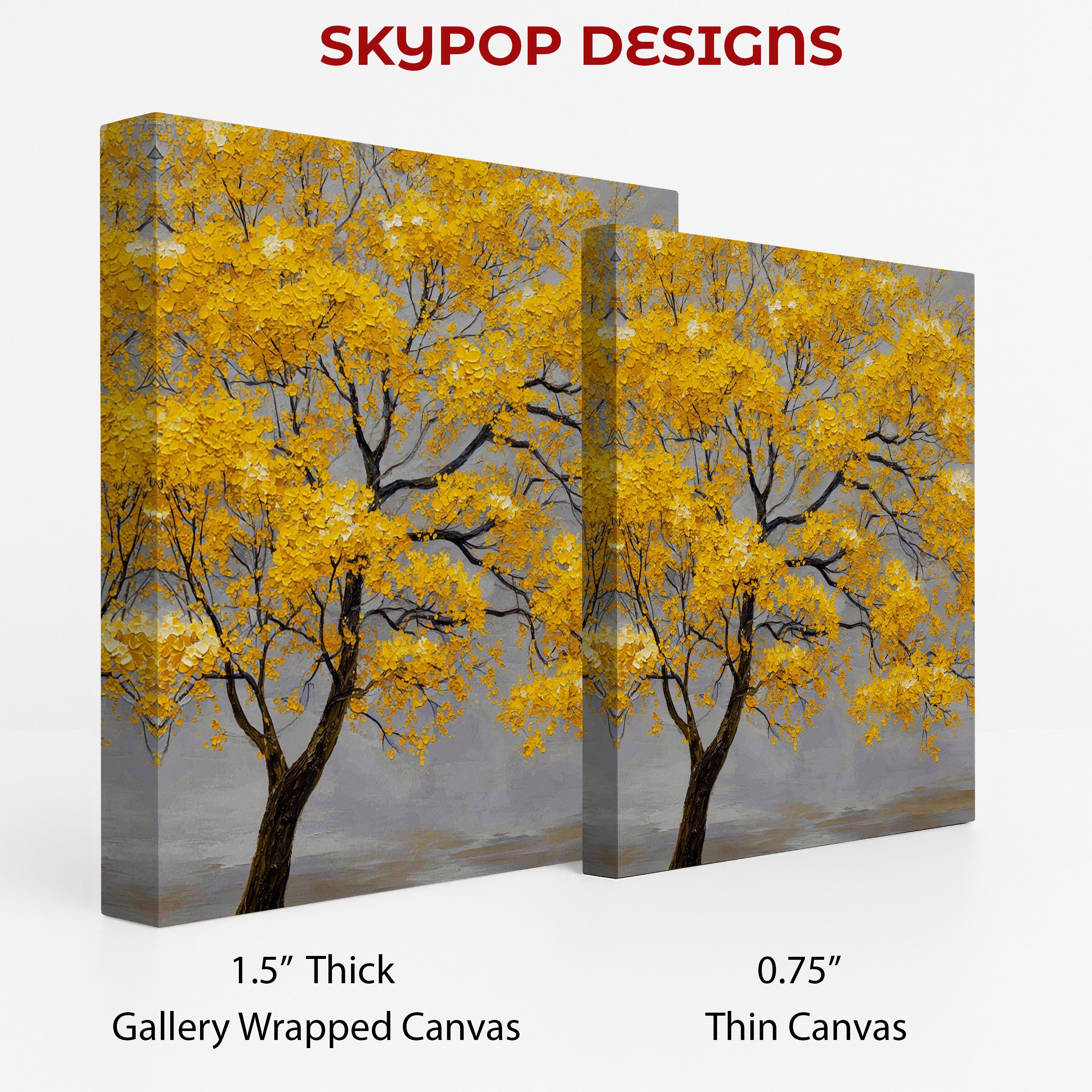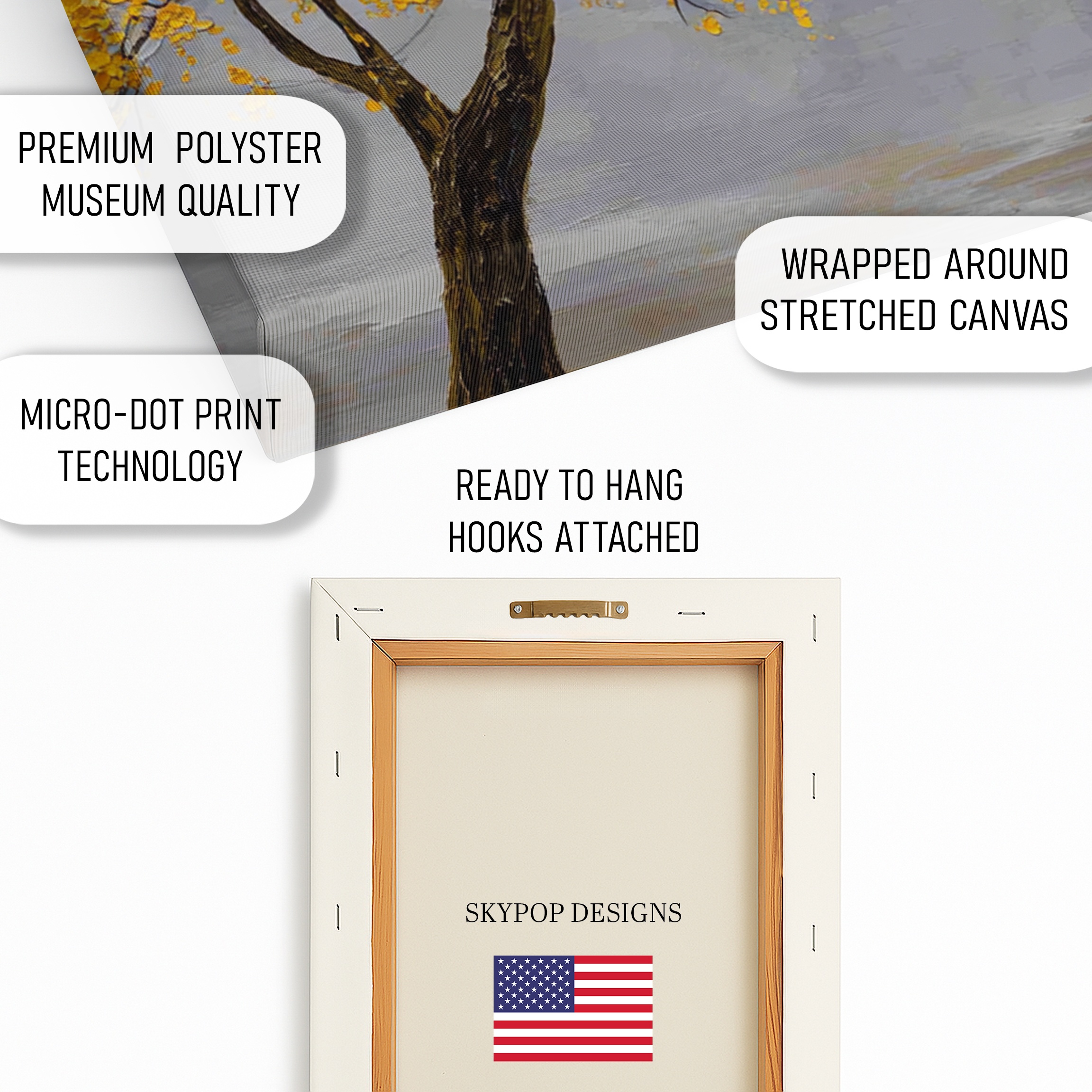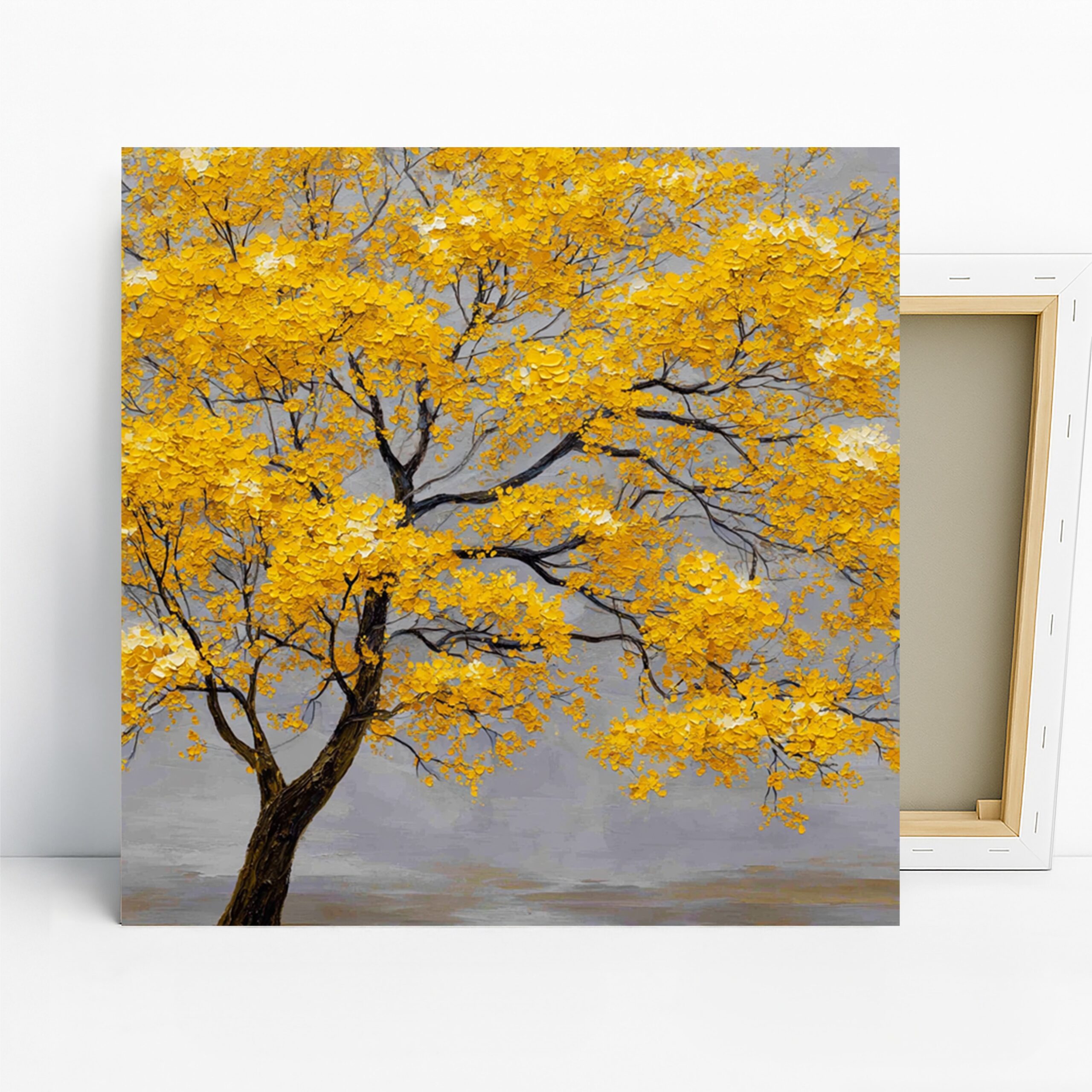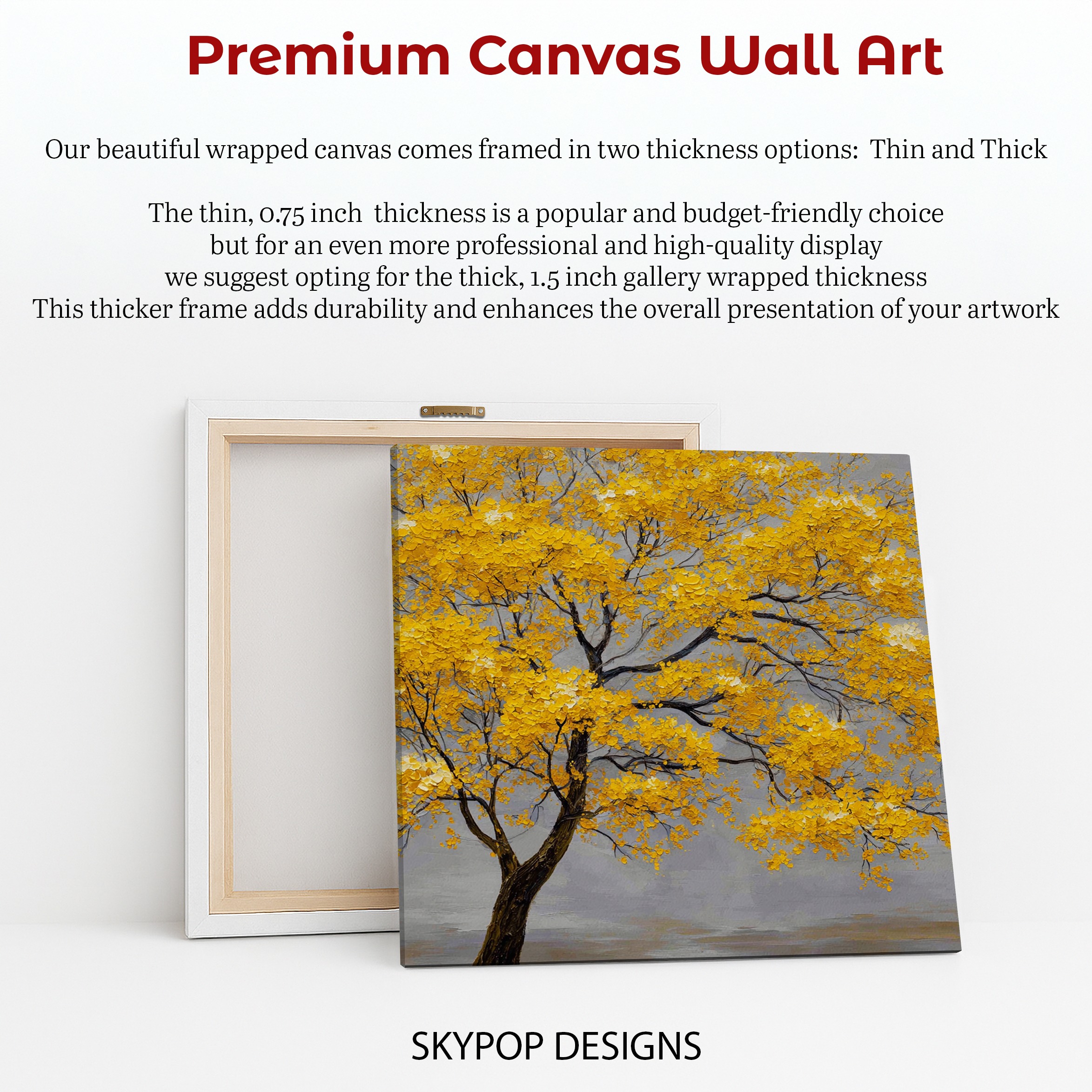 Transform your space with this striking golden tree canvas wall art, showcasing the vibrant beauty of autumn. This eye-catching piece features a majestic tree with branches adorned in brilliant yellow leaves, set against a soft grey background. Perfect for modern living rooms or minimalist bedrooms, this nature-inspired poster brings a touch of warmth and serenity to any interior. The impressionistic style captures the essence of fall, with textured brushstrokes that add depth and movement to the scene. Ideal for rustic decor enthusiasts, this canvas art creates a focal point that celebrates the changing seasons. The golden hues are known to evoke feelings of optimism and energy, making this piece a mood-enhancing addition to your home or office. Whether displayed as a standalone statement or part of a gallery wall, this versatile artwork adapts beautifully to various design schemes. High-quality printing ensures every detail of the delicate leaves and intricate branches is captured, providing a lifelike representation of nature’s artistry. Elevate your dining room ambiance or create a calming atmosphere in your bedroom with this timeless tree wall art. Available in multiple sizes, this canvas print offers the perfect solution for blank walls, large or small. Bring the outdoors in and transform your living space with this captivating golden tree artwork today.