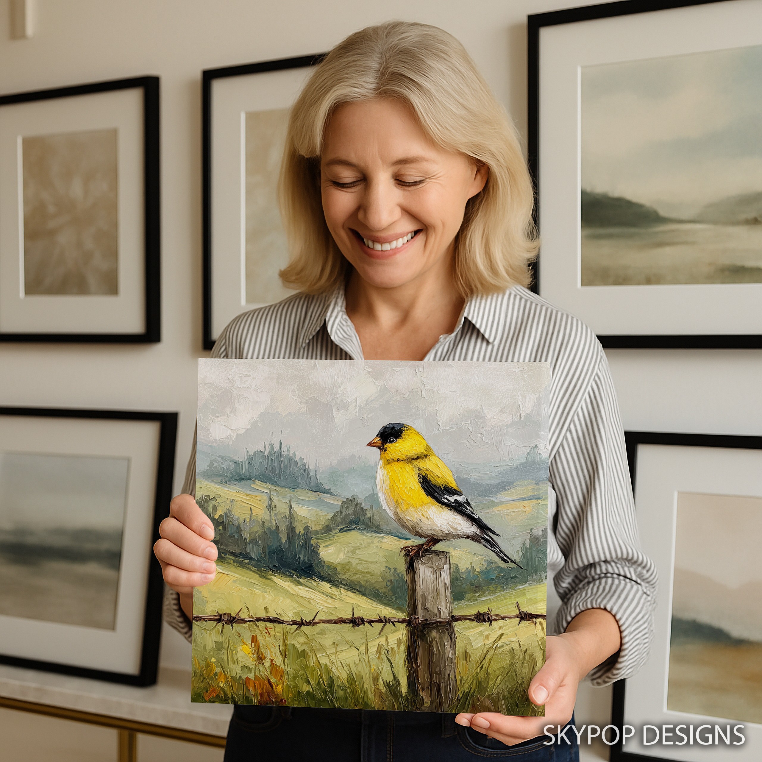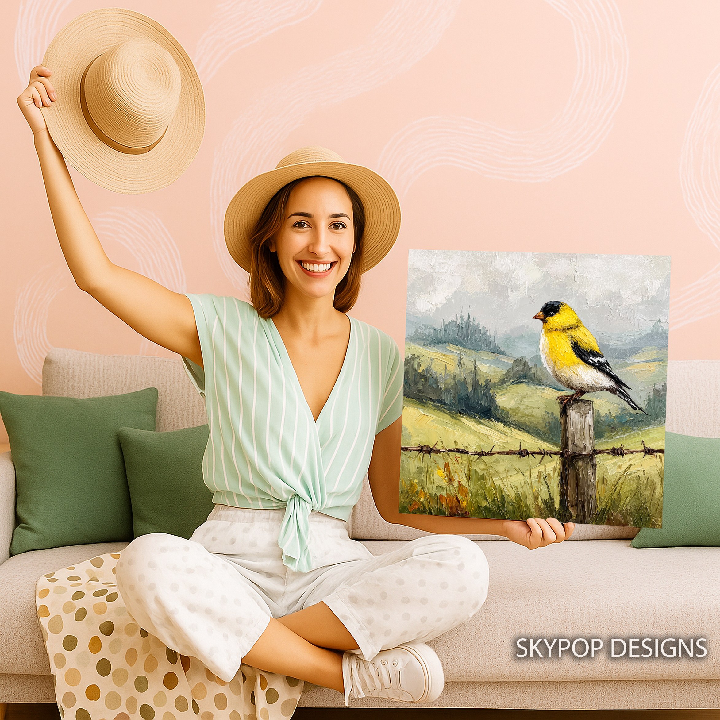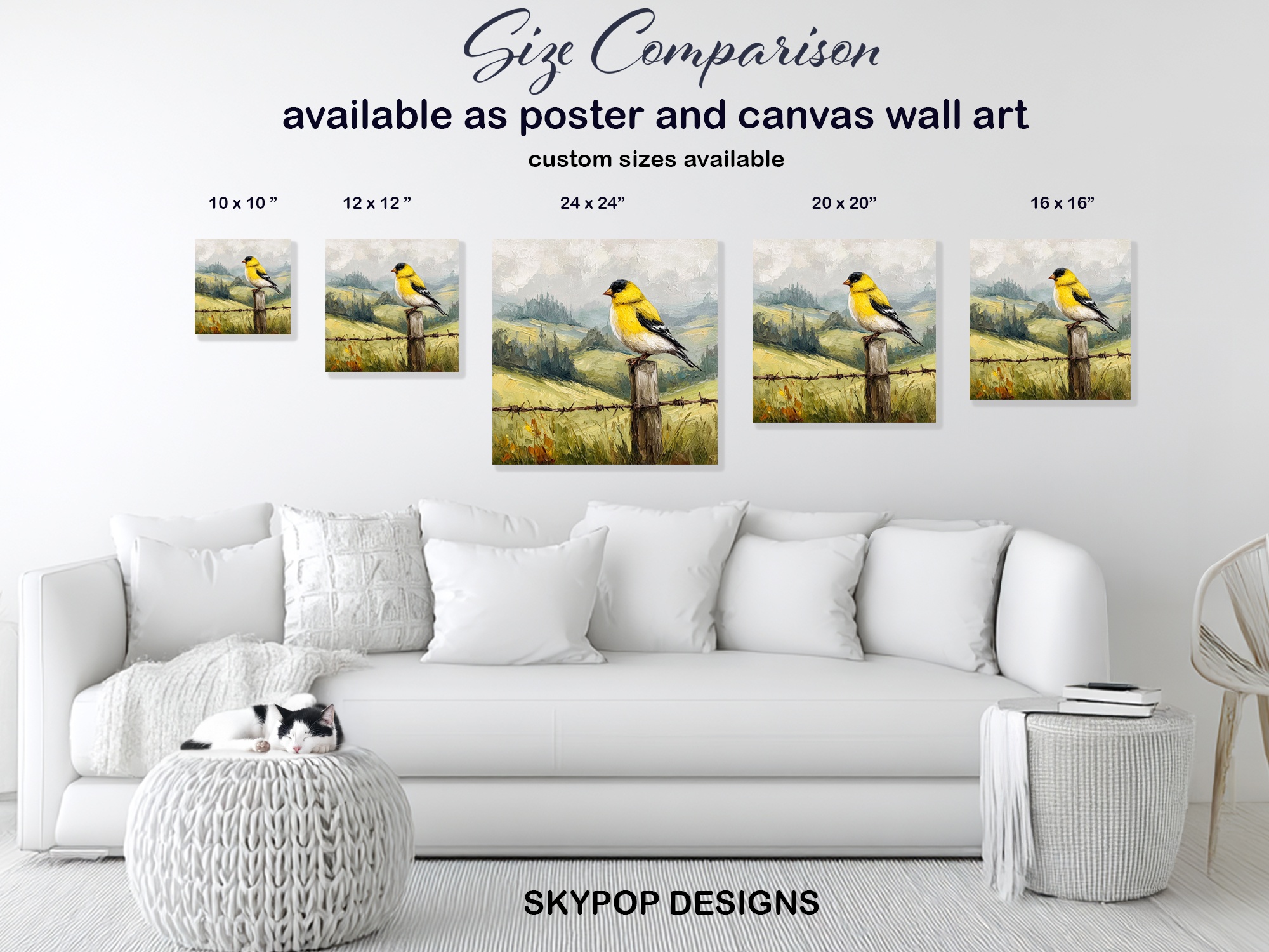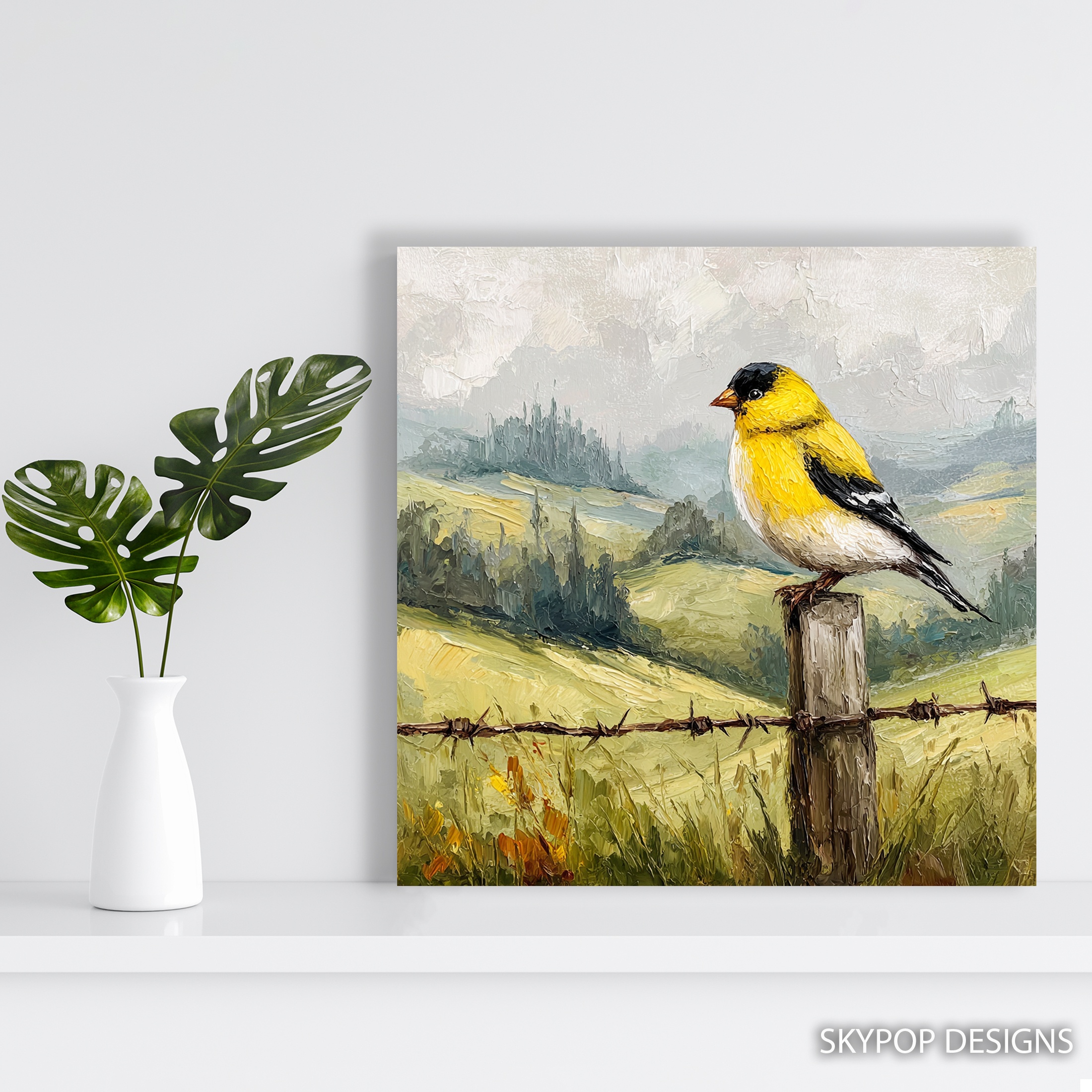 Bring the beauty of nature indoors with this stunning goldfinch canvas wall art. This captivating piece showcases a vibrant American goldfinch perched on a rustic fence post, overlooking a serene countryside meadow. Perfect for nature lovers and bird enthusiasts alike, this poster transforms any room into a tranquil retreat. The impressionistic style brings the scene to life, with textured brushstrokes that add depth and movement to the rolling hills and distant forests. Ideal for rustic or farmhouse decor, this artwork adds a touch of country charm to living rooms, dining areas, or home offices. The goldfinch’s bright yellow plumage pops against the soft greens and blues of the landscape, creating a focal point that draws the eye and lifts the spirit. This versatile canvas wall art adapts beautifully to various color schemes and room sizes, making it a great choice for home decorators. Whether you’re looking to bring a bit of the outdoors in or searching for the perfect housewarming gift, this goldfinch meadow art delivers timeless appeal. The high-quality printing ensures every detail is captured, from the bird’s delicate features to the texture of the wooden fence post. Elevate your space with this charming blend of nature and artistry, and let the peaceful countryside scene inspire tranquility in your daily life. Add this goldfinch wall art to your collection and transform your home into a haven of natural beauty.
