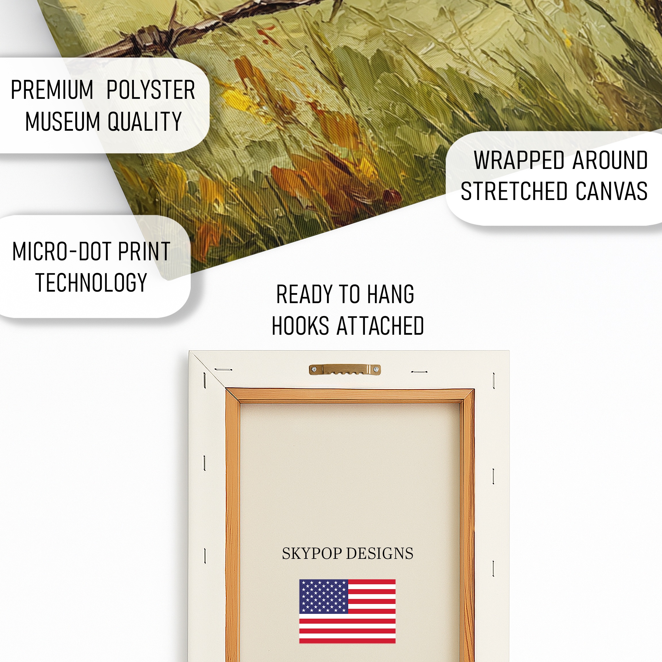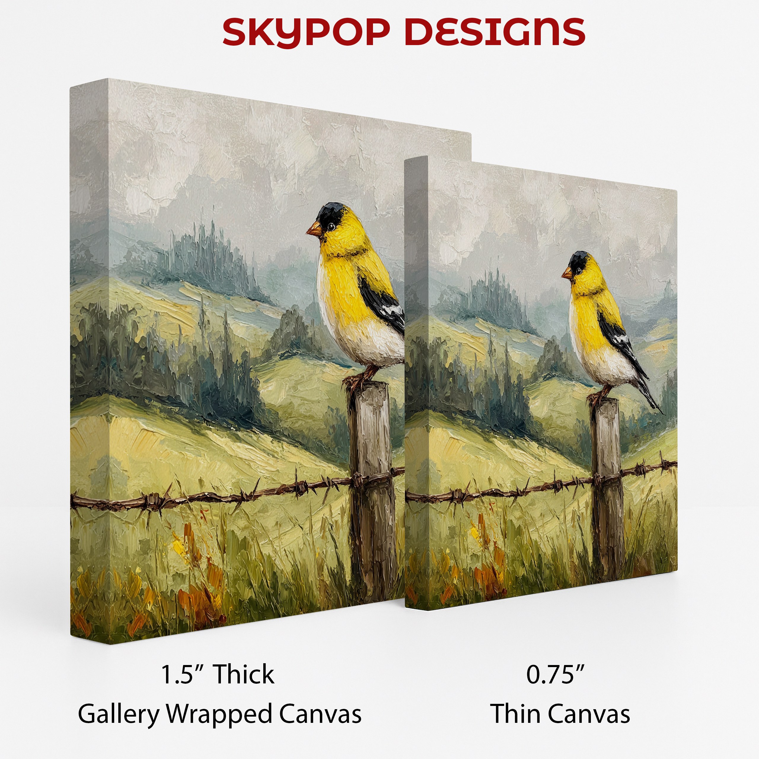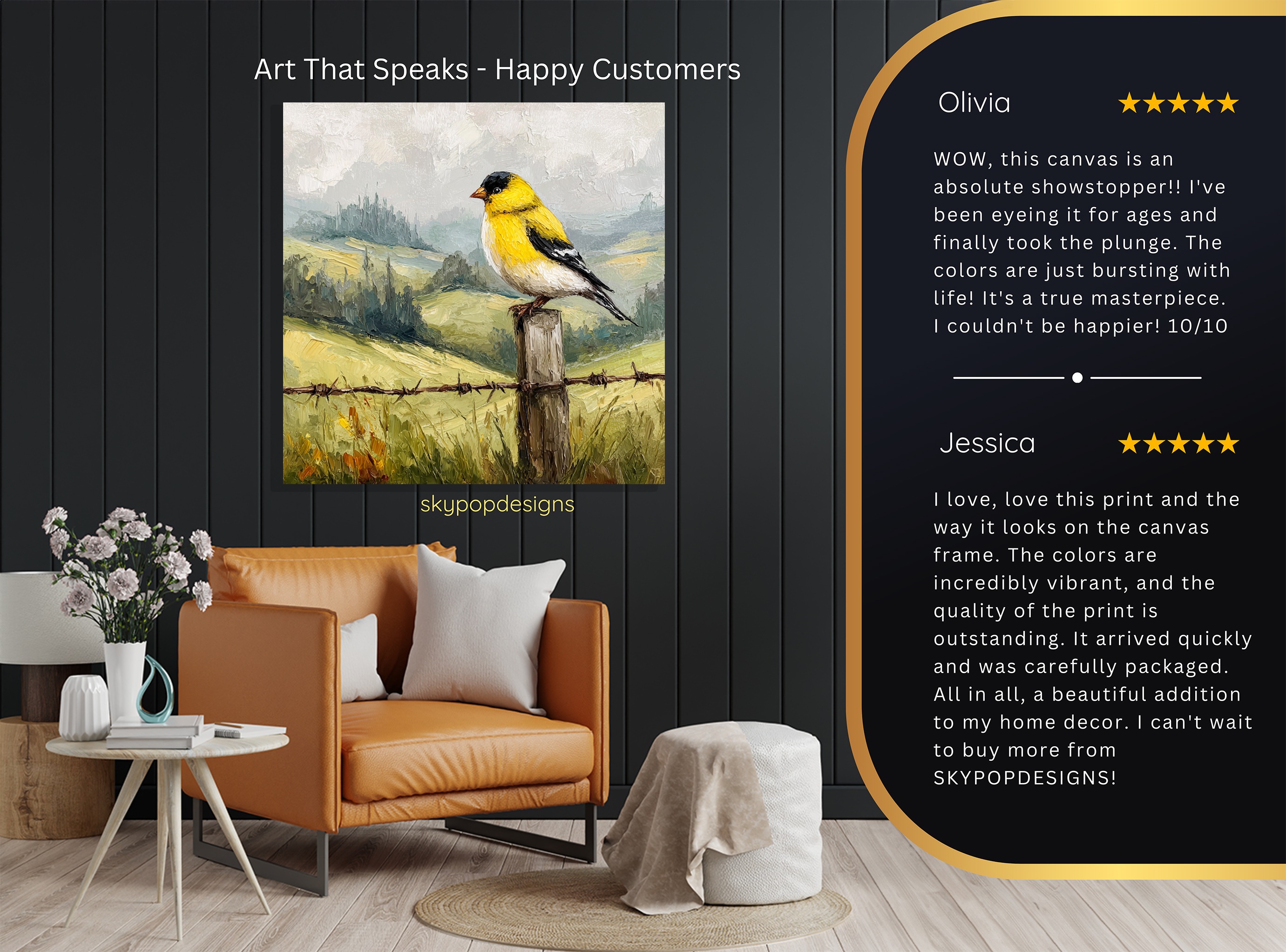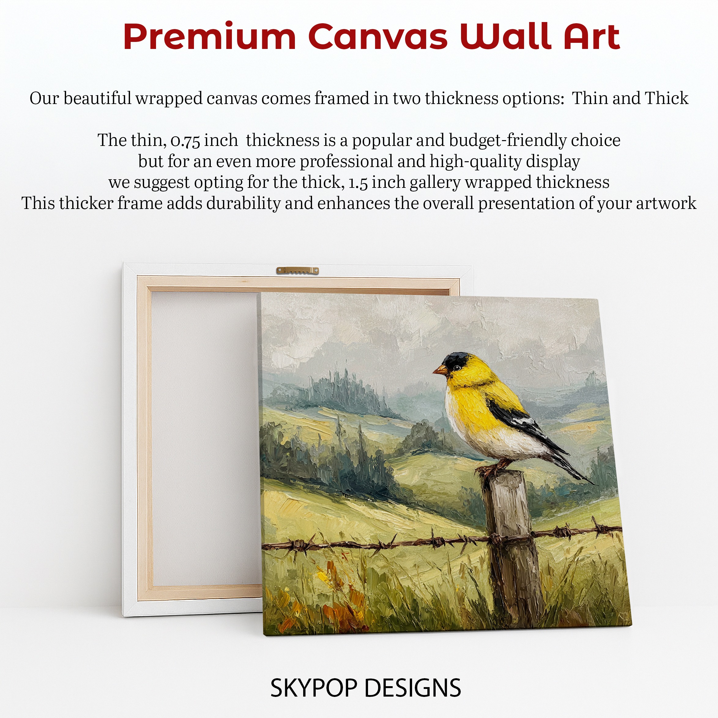 Bring the beauty of nature indoors with this stunning goldfinch canvas wall art. This captivating piece showcases a vibrant American goldfinch perched on a rustic fence post, overlooking a serene countryside meadow. Perfect for nature lovers and bird enthusiasts alike, this poster transforms any room into a tranquil retreat. The impressionistic style brings the scene to life, with textured brushstrokes that add depth and movement to the rolling hills and distant forests. Ideal for rustic or farmhouse decor, this artwork adds a touch of country charm to living rooms, dining areas, or home offices. The goldfinch’s bright yellow plumage pops against the soft greens and blues of the landscape, creating a focal point that draws the eye and lifts the spirit. This versatile canvas wall art adapts beautifully to various color schemes and room sizes, making it a great choice for home decorators. Whether you’re looking to bring a bit of the outdoors in or searching for the perfect housewarming gift, this goldfinch meadow art delivers timeless appeal. The high-quality printing ensures every detail is captured, from the bird’s delicate features to the texture of the wooden fence post. Elevate your space with this charming blend of nature and artistry, and let the peaceful countryside scene inspire tranquility in your daily life. Add this goldfinch wall art to your collection and transform your home into a haven of natural beauty.