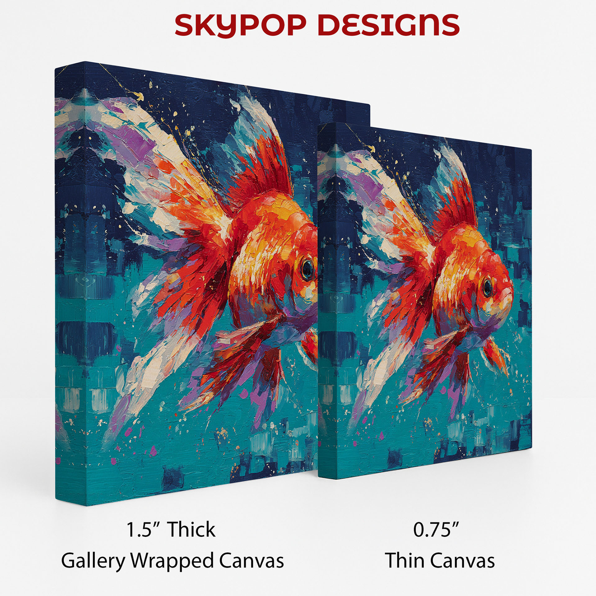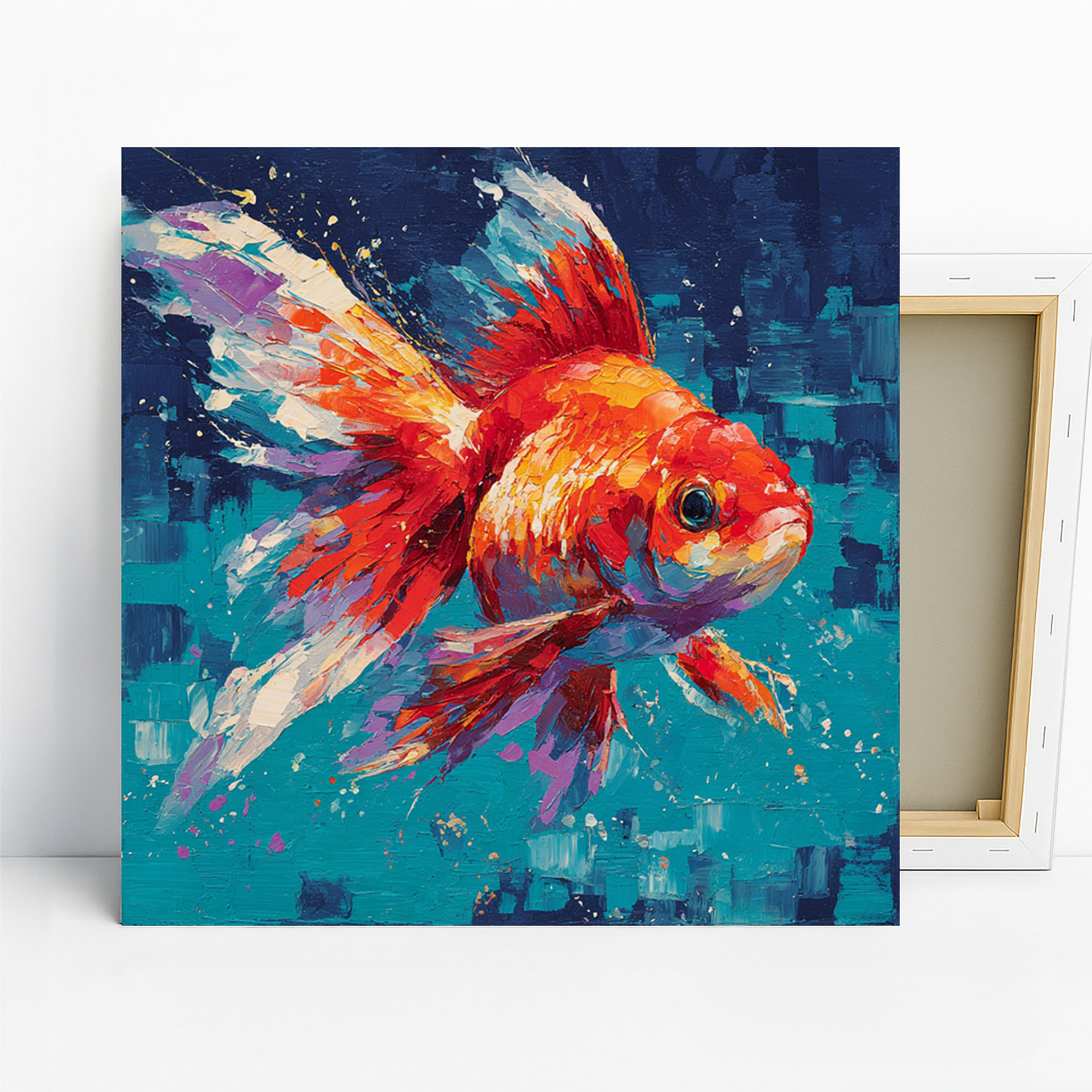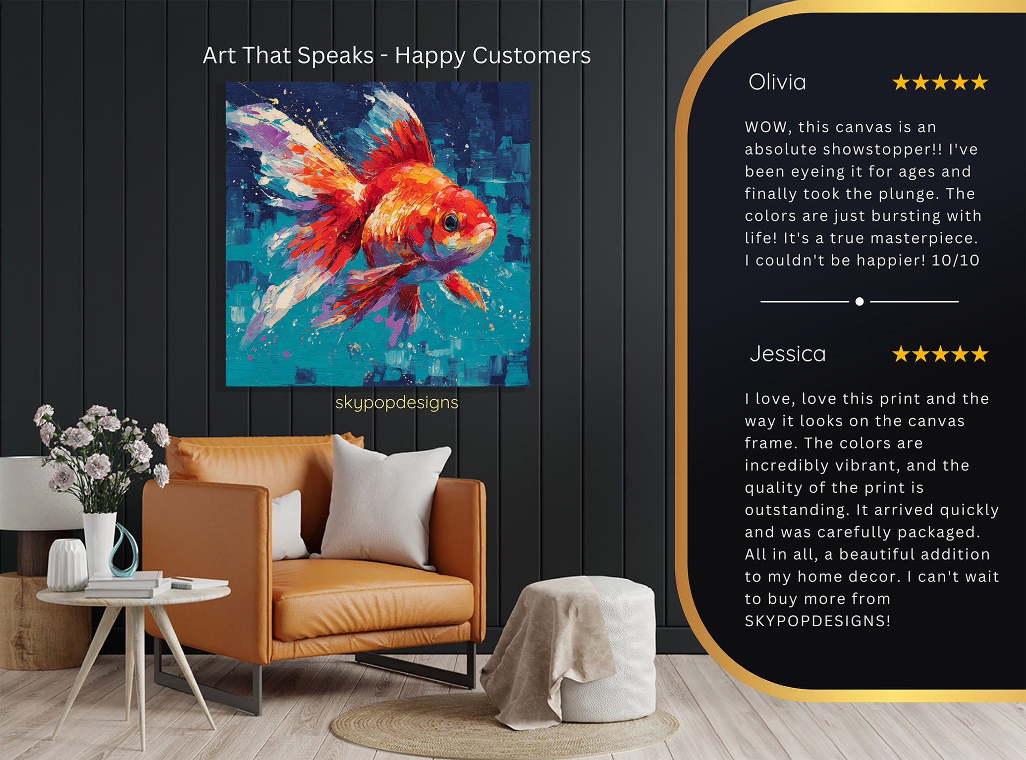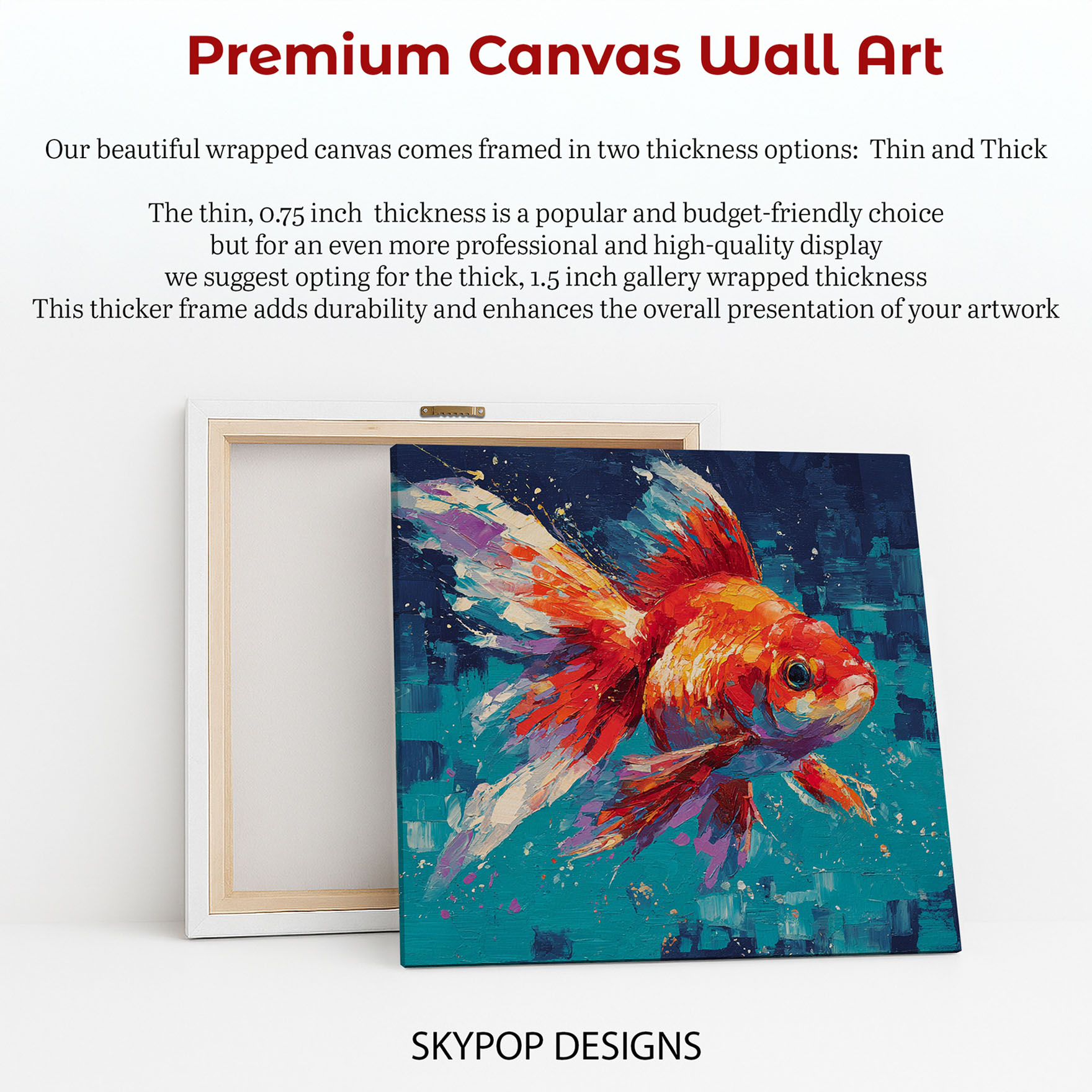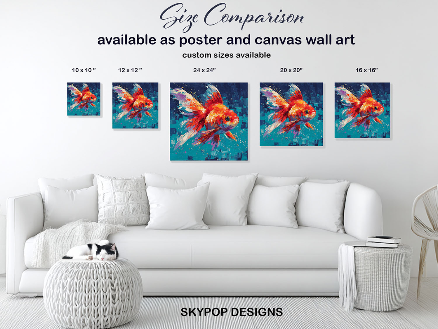 Transform your living space with this breathtaking Goldfish canvas wall art, a vibrant and dynamic piece that captures the beauty of aquatic life. This stunning poster or canvas wall art is ideal for creating a captivating focal point in any room, from a modern living room to a serene bathroom. The striking combination of teal, blue, and fiery orange hues evokes a sense of calm and energy, making it perfect for coastal-themed decor. This animal art piece celebrates the graceful movement of a goldfish, rendered in a contemporary style with bold, textured brushstrokes that add depth and dimension. It’s a perfect addition to enhance your bedroom or entryway decor, bringing a touch of the ocean’s tranquility indoors. Our high-quality art prints ensure the rich colors and intricate details of this goldfish painting are beautifully preserved, offering a lasting visual impact. This canvas wall art is not only a beautiful decorative piece but also an inspiring gift for nature lovers, housewarmings, or birthdays. Elevate your home with this artistic representation of aquatic beauty, a piece that seamlessly blends natural elements with modern design trends. Make a splash in your home decor with this captivating goldfish artwork, a statement piece that promises to bring joy and a sense of wonder.