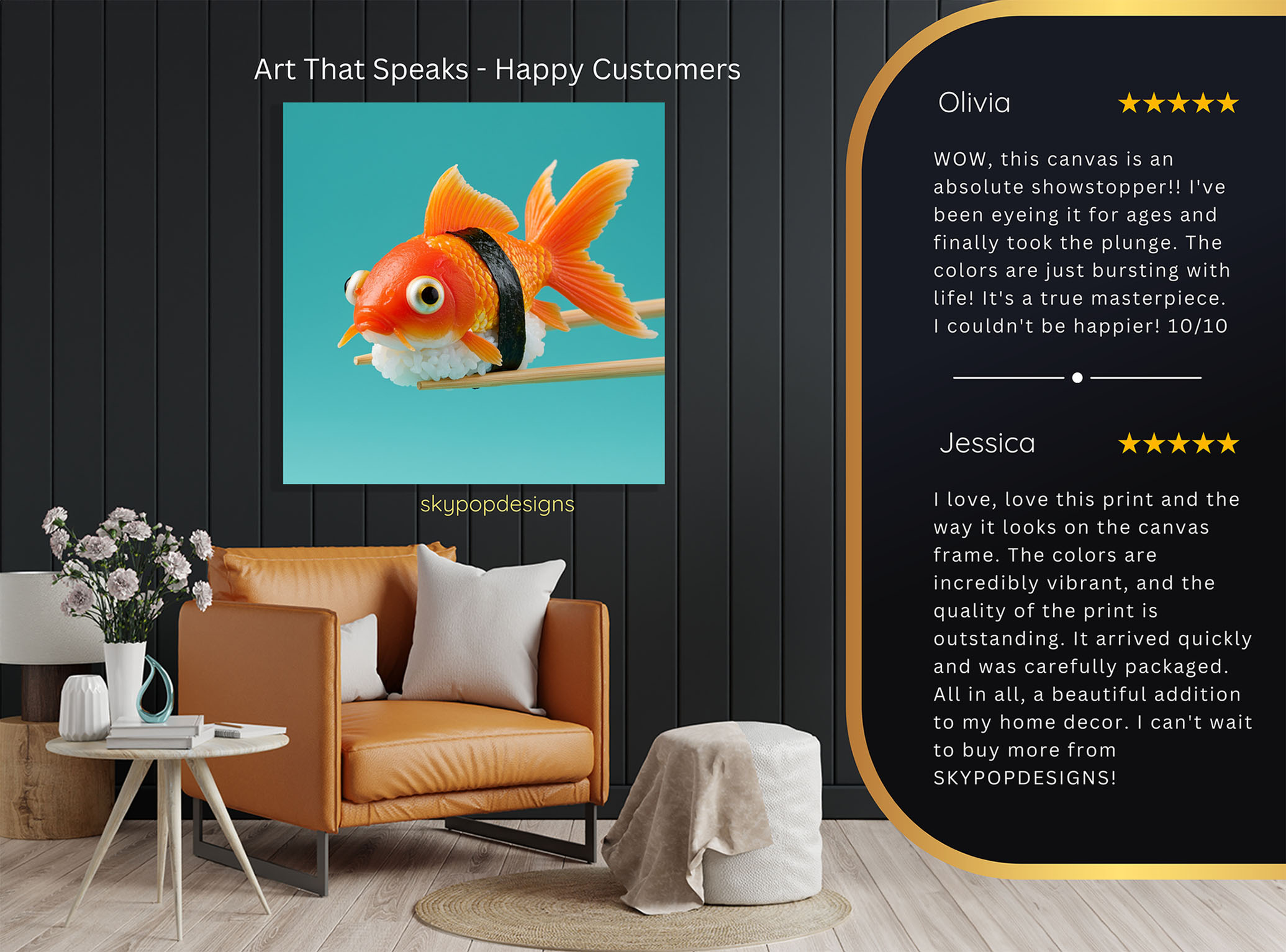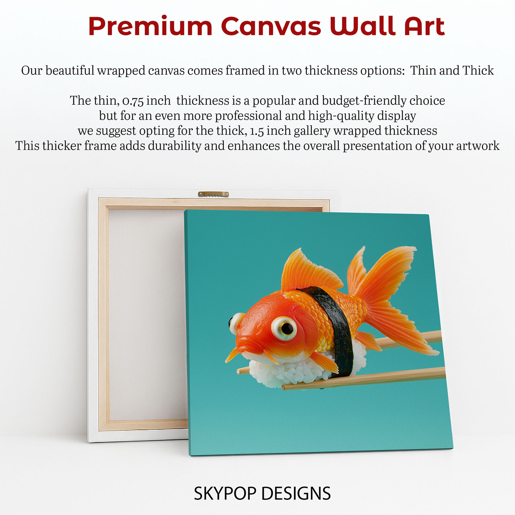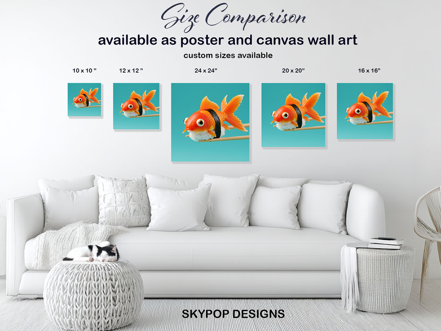 Transform your kitchen or dining area with this playful and unique goldfish sushi canvas wall art. This vibrant poster or canvas wall art features a whimsical goldfish transformed into a delicious-looking sushi roll, held by chopsticks. The striking orange of the goldfish pops against the teal background, creating a captivating visual that’s sure to spark conversation. This pop art piece is perfect for modern homes, adding a splash of fun to minimalist decor, or bringing an eccentric touch to bohemian spaces. Its bold colors and quirky subject matter make it an ideal focal point for kitchens, dining rooms, or even a game room. High-quality printing ensures the scales of the fish and the texture of the rice are rendered in stunning detail, making this canvas wall art a true conversation starter. This artwork also makes a fantastic gift for foodies, sushi lovers, or anyone who appreciates unique wall decor for housewarmings, birthdays, or holidays. Elevate your home with this eye-catching piece that celebrates the fun intersection of food and art. Add a dose of personality and fun to your space today with this delightful goldfish sushi artwork. This versatile piece is available in various sizes to perfectly complement your wall space.