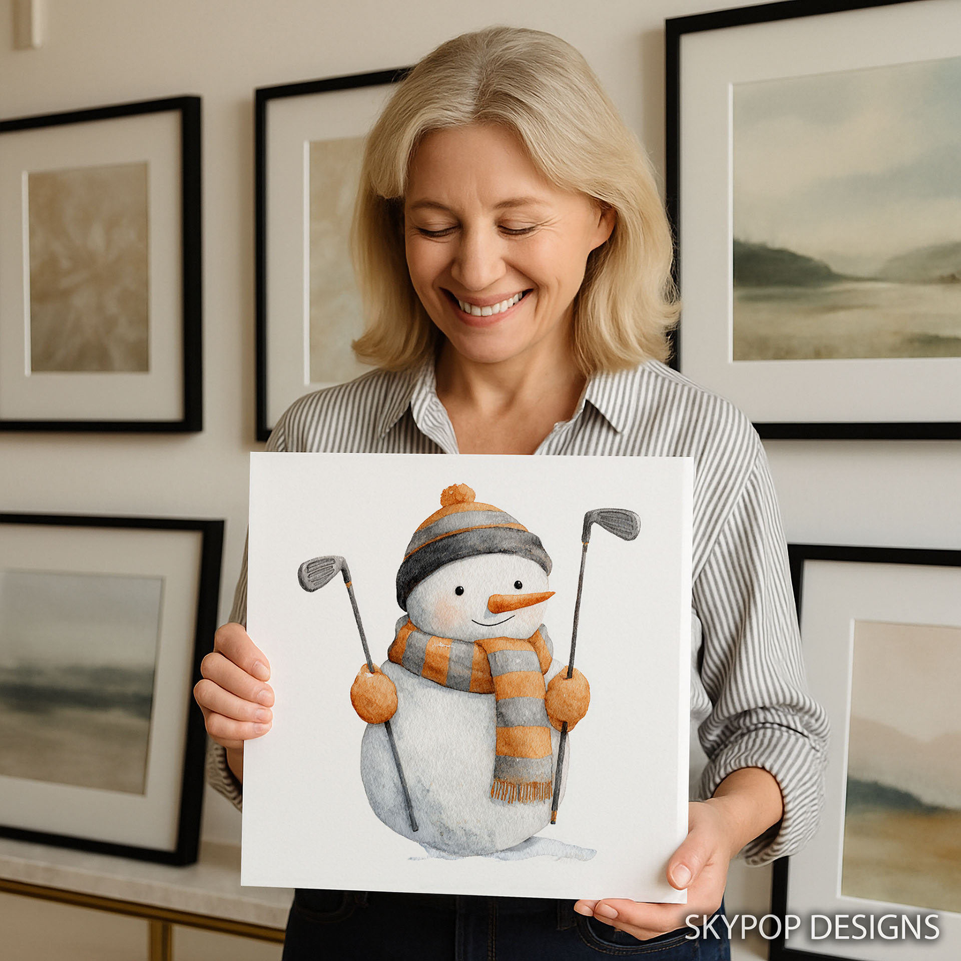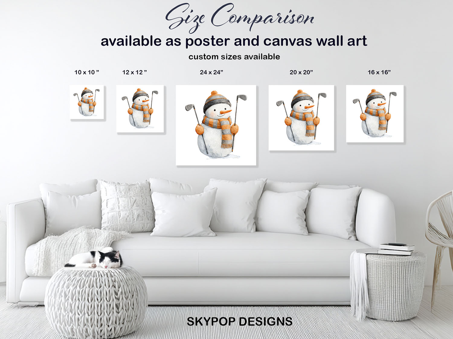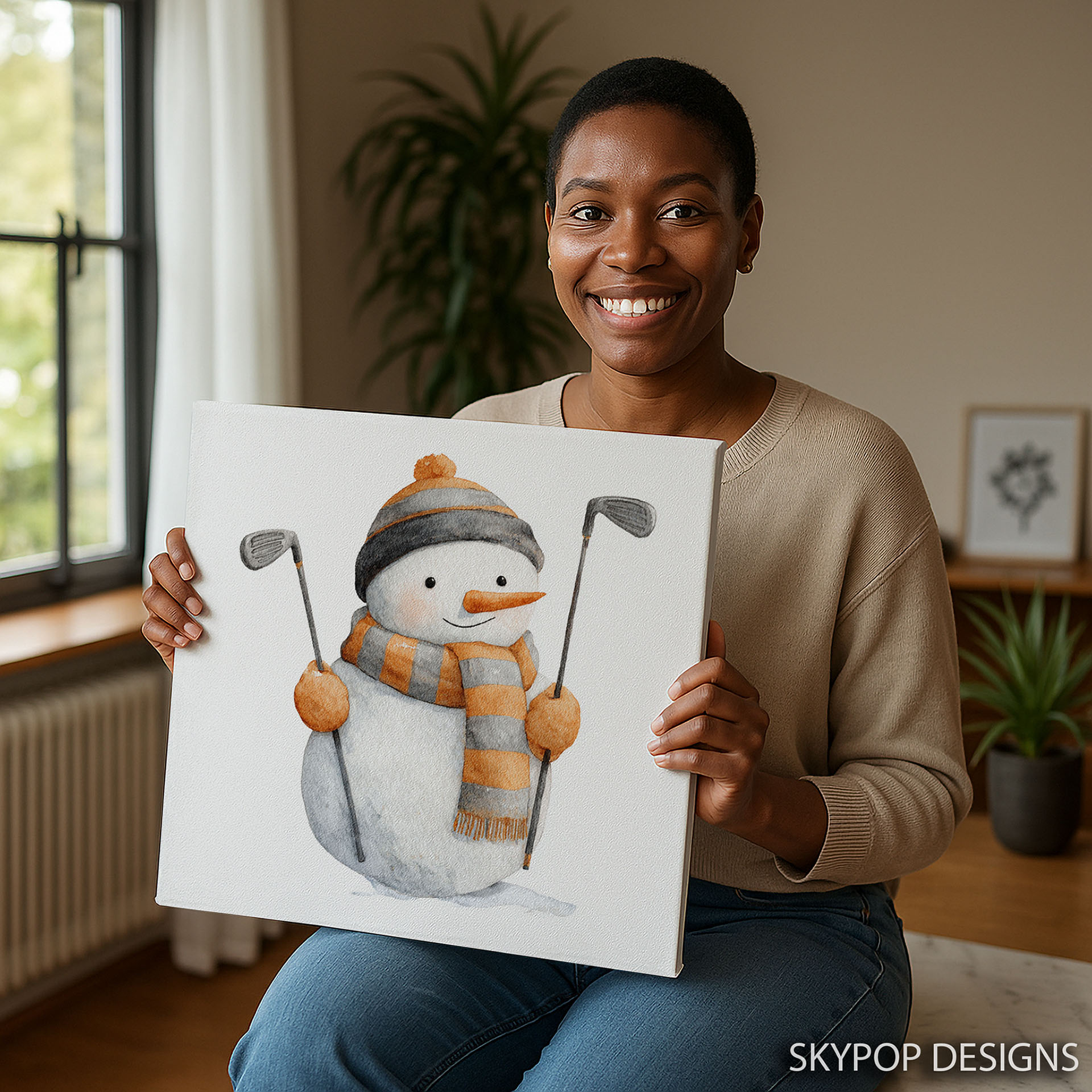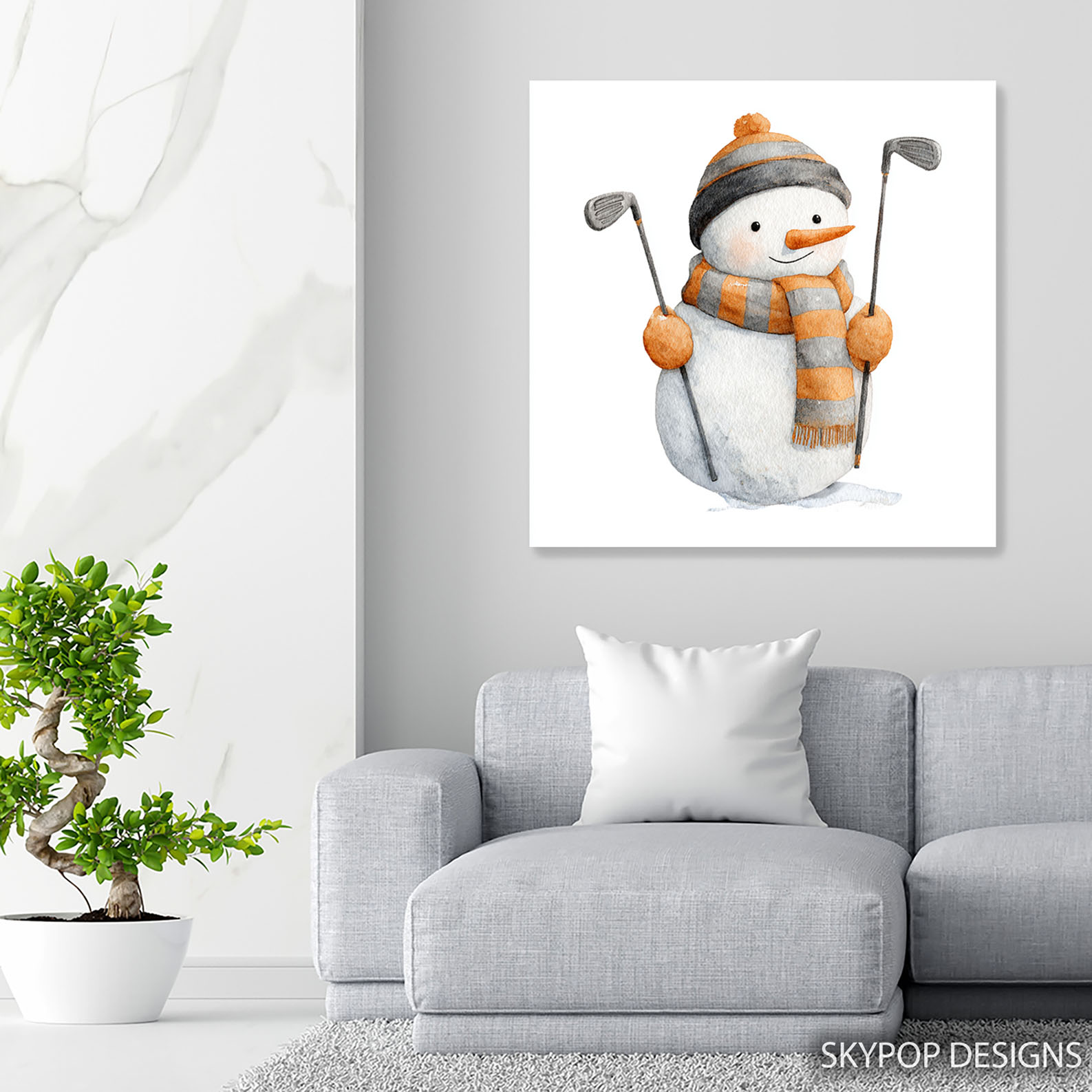 Transform your space with this charming golfing snowman canvas wall art, a delightful piece of whimsical art that brings a smile to any face. This unique poster or canvas wall art features a jovial snowman dressed in a striped hat and scarf, ready for a round of golf, making it perfect for modern living room wall decor or a fun addition to a children’s room. The playful combination of winter and sport elements, rendered in a contemporary watercolor style, adds a vibrant touch to your home. The striking orange and grey color palette creates a cheerful and inviting atmosphere, ideal for Scandinavian or Bohemian decor styles that embrace personality and warmth. This canvas wall art is not just a decoration but a conversation starter, capturing the fun and joy of the season. High-quality printing ensures the watercolor textures and vibrant colors are beautifully preserved on each poster and canvas wall art. It’s an ideal choice for game rooms, hallways, or as a unique holiday gift for golfers, birthdays, or housewarmings. Elevate your home’s aesthetic with this refreshing piece that celebrates winter sports and whimsical themes. This versatile artwork adds character and a pop of color to any wall, enhancing your space with its captivating charm. Bring a touch of playful elegance to your decor with this one-of-a-kind golfing snowman artwork today.