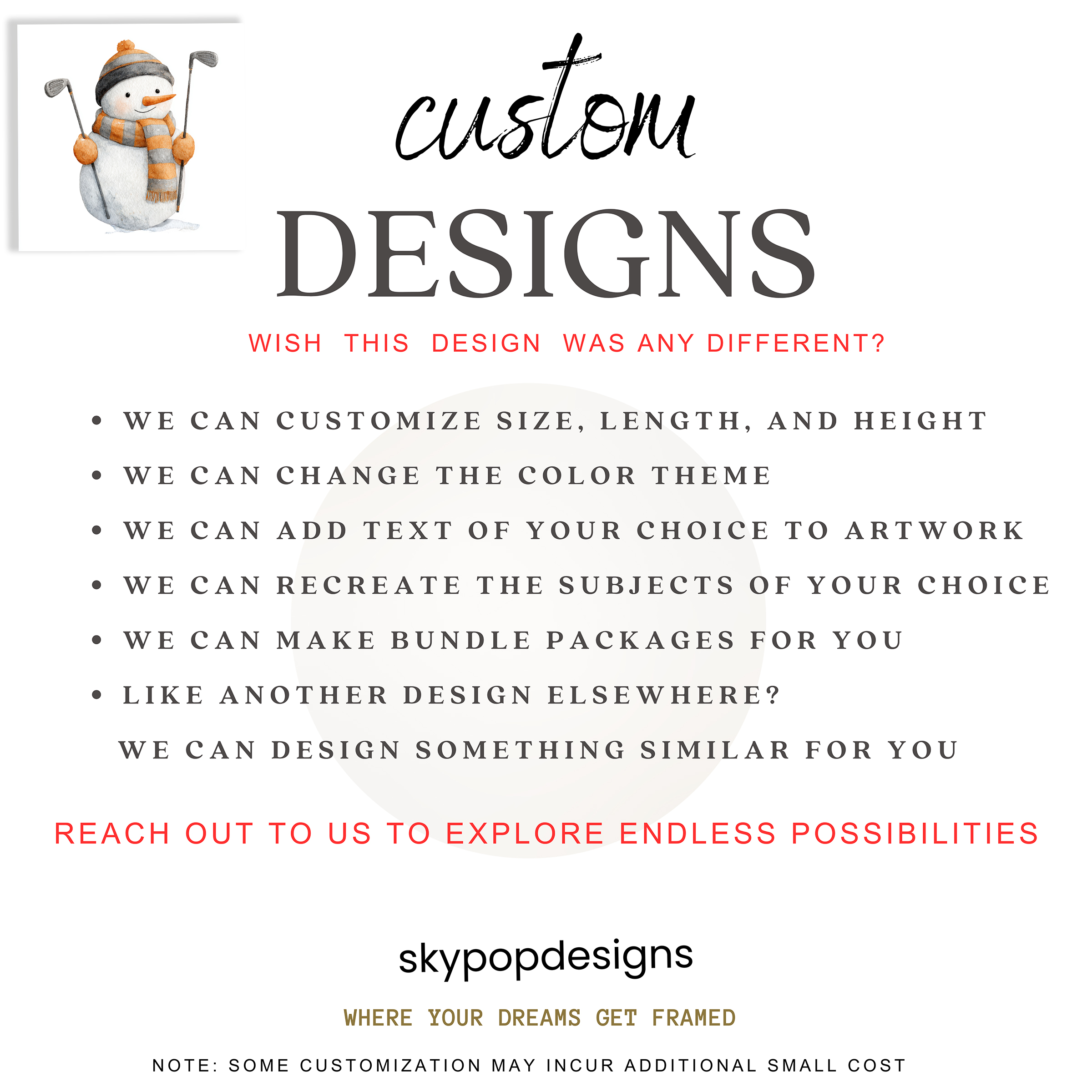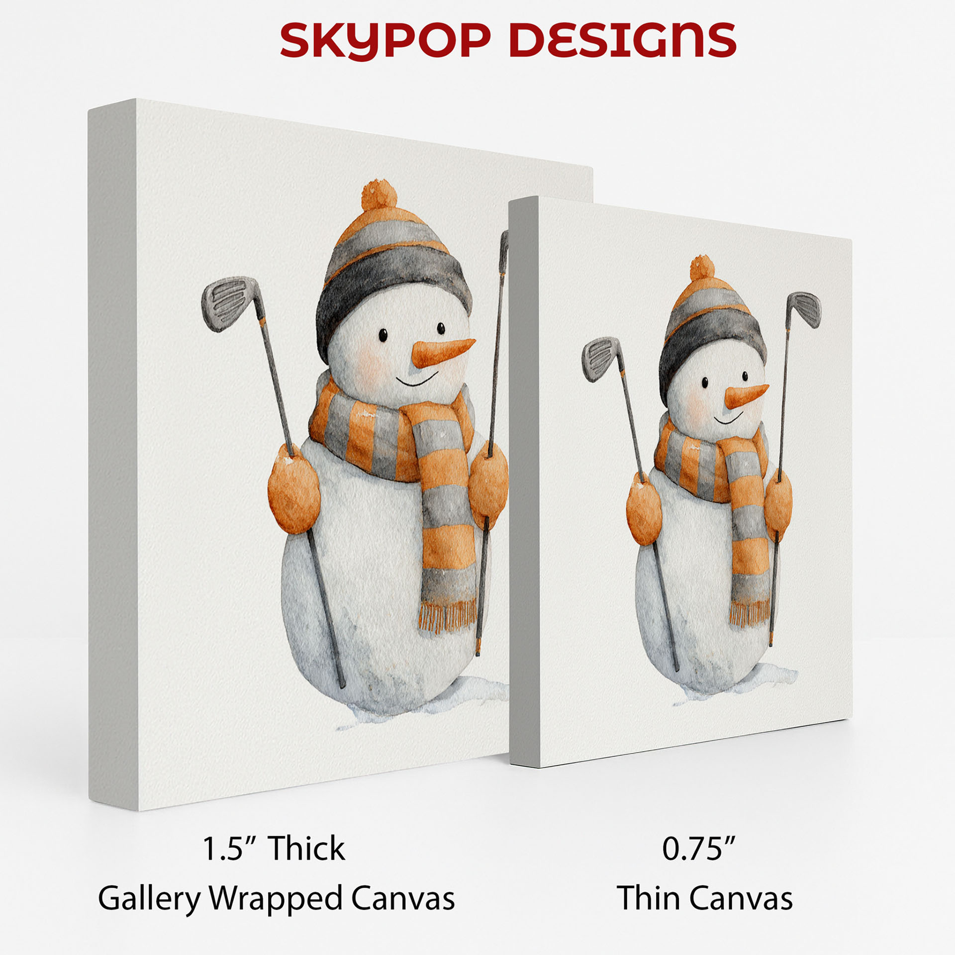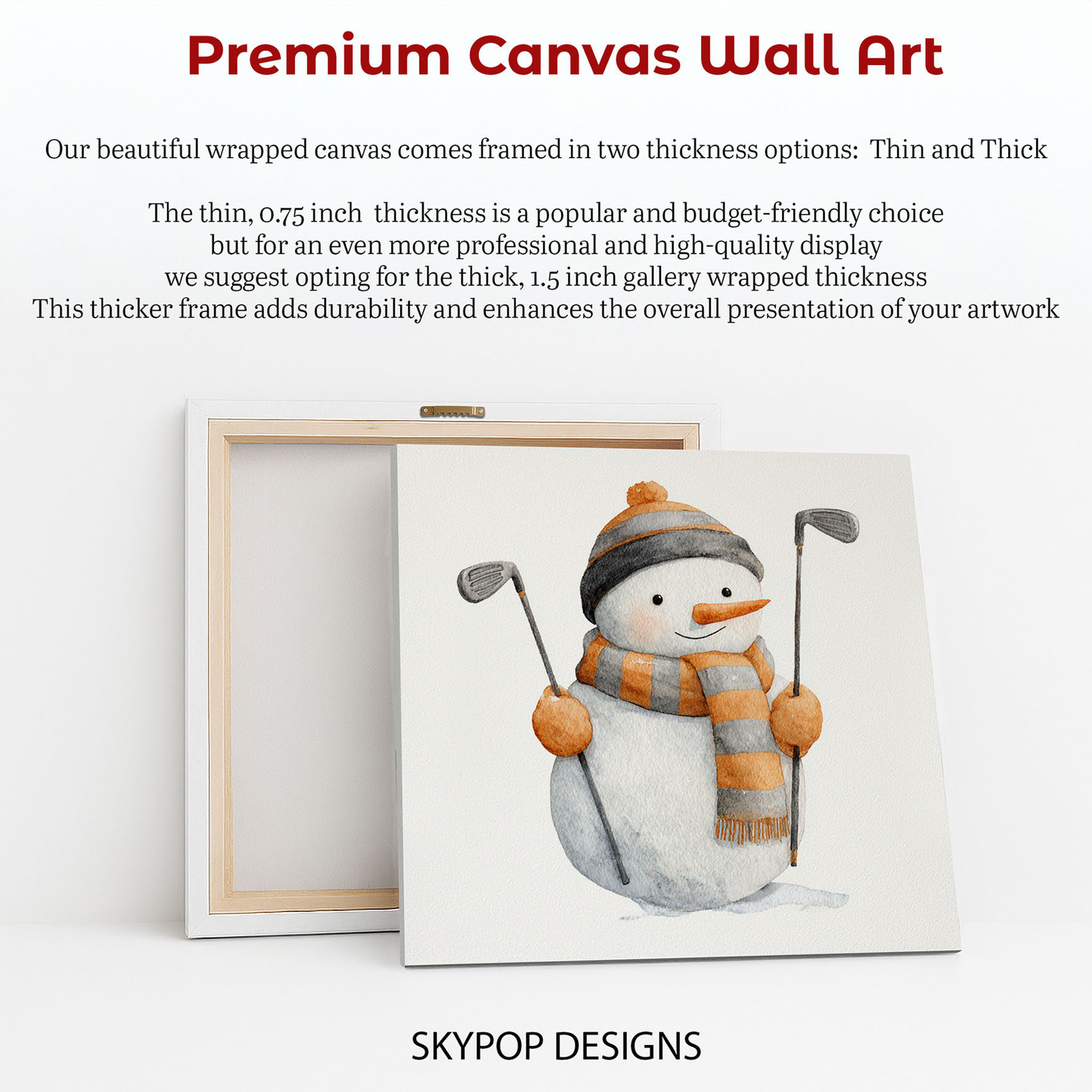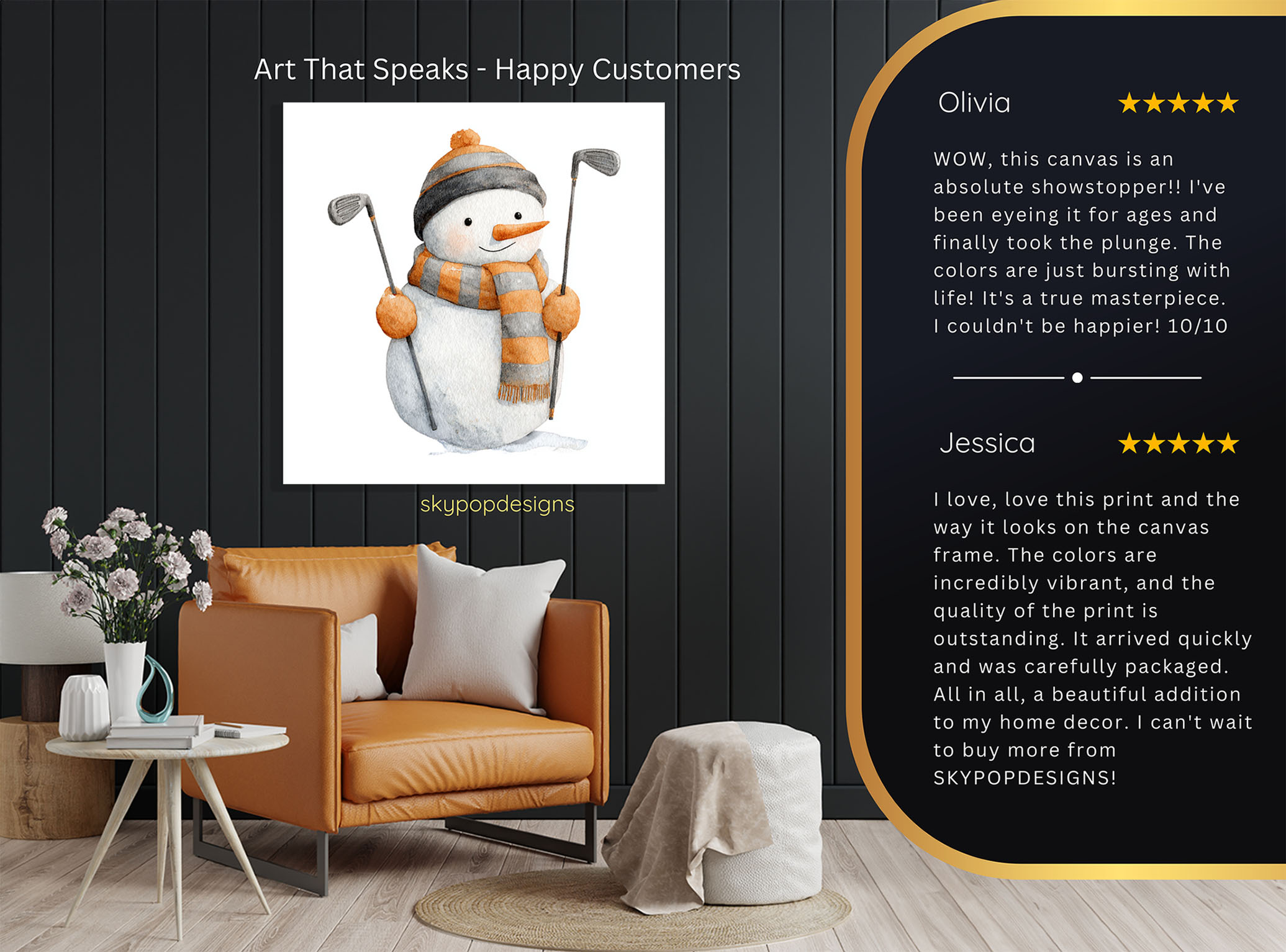 Transform your space with this charming golfing snowman canvas wall art, a delightful piece of whimsical art that brings a smile to any face. This unique poster or canvas wall art features a jovial snowman dressed in a striped hat and scarf, ready for a round of golf, making it perfect for modern living room wall decor or a fun addition to a children’s room. The playful combination of winter and sport elements, rendered in a contemporary watercolor style, adds a vibrant touch to your home. The striking orange and grey color palette creates a cheerful and inviting atmosphere, ideal for Scandinavian or Bohemian decor styles that embrace personality and warmth. This canvas wall art is not just a decoration but a conversation starter, capturing the fun and joy of the season. High-quality printing ensures the watercolor textures and vibrant colors are beautifully preserved on each poster and canvas wall art. It’s an ideal choice for game rooms, hallways, or as a unique holiday gift for golfers, birthdays, or housewarmings. Elevate your home’s aesthetic with this refreshing piece that celebrates winter sports and whimsical themes. This versatile artwork adds character and a pop of color to any wall, enhancing your space with its captivating charm. Bring a touch of playful elegance to your decor with this one-of-a-kind golfing snowman artwork today.