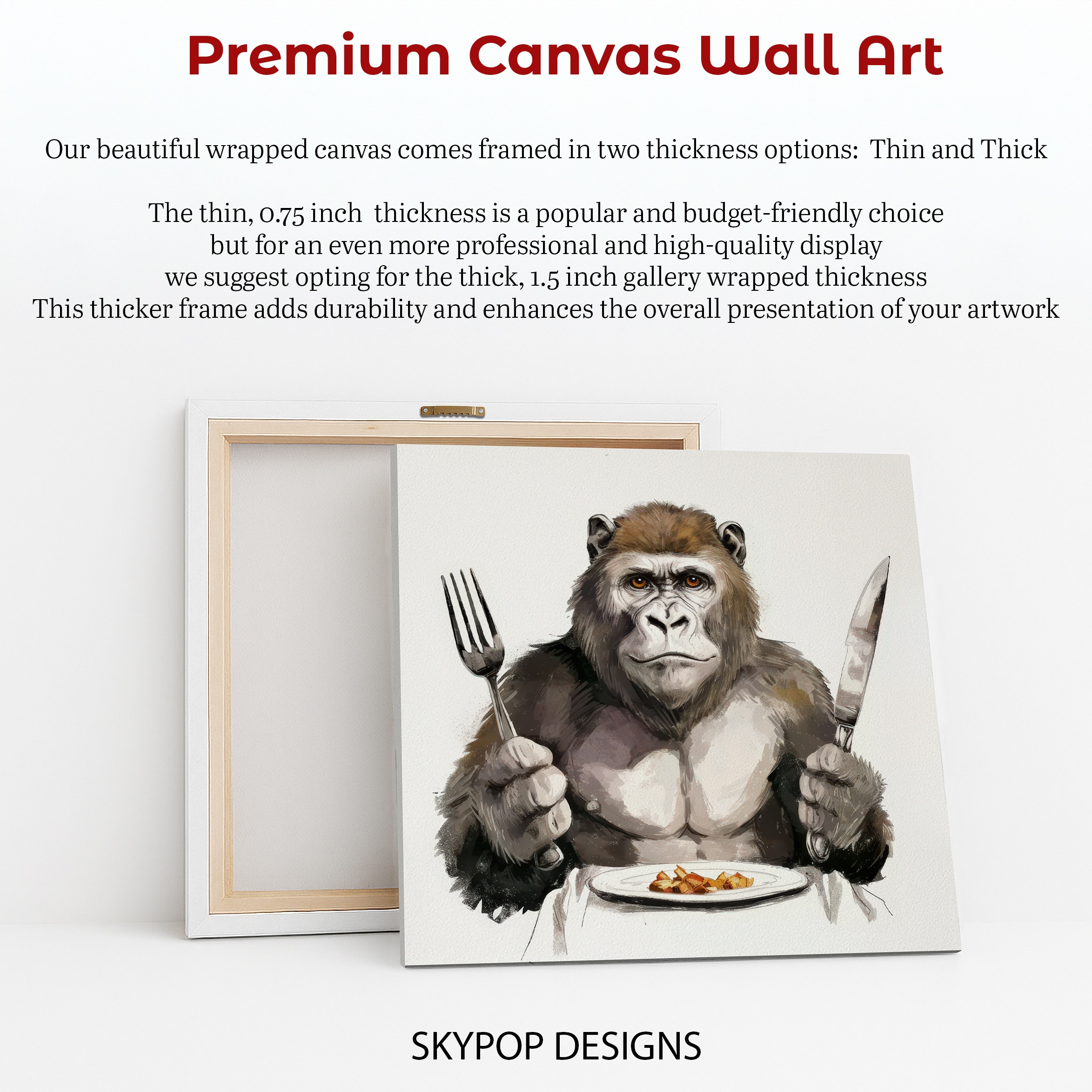 Keywords: Gorilla art, canvas wall art, animal art, contemporary art, figurative art, modern decor, minimalist decor, living room art, dining room art, office art, kitchen art, multicolor art, brown art, white art, black art, fine dining art, unique wall art, statement art, home decor, wall decor, animal lovers gift, art for home, wall adornment, contemporary wall decor, modern wall art, animal print, gorilla canvas, sophisticated humor, nature inspired art, conversation starter art