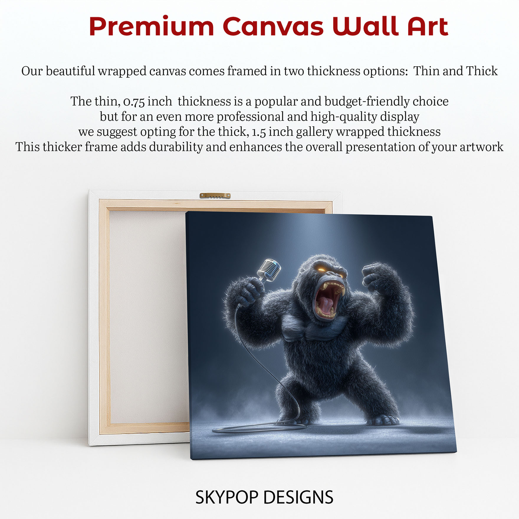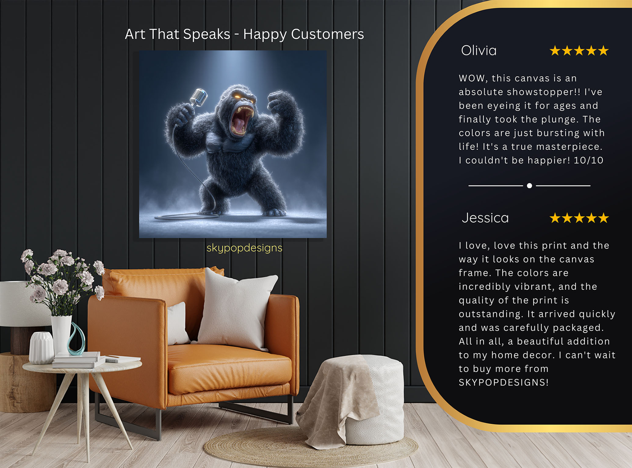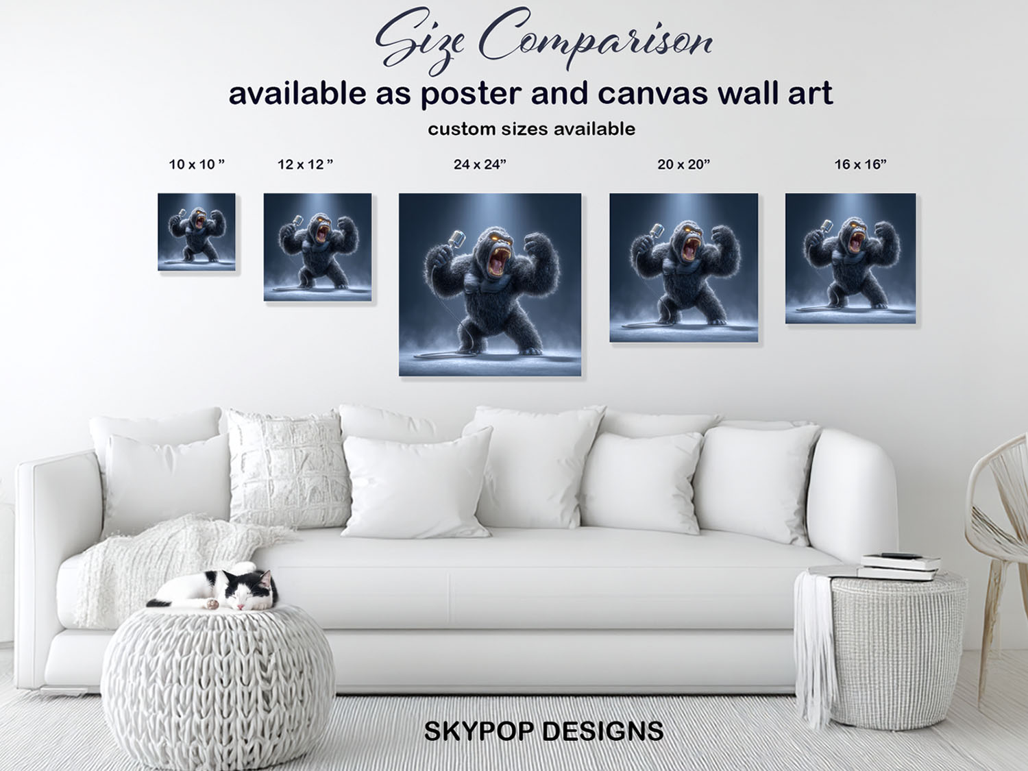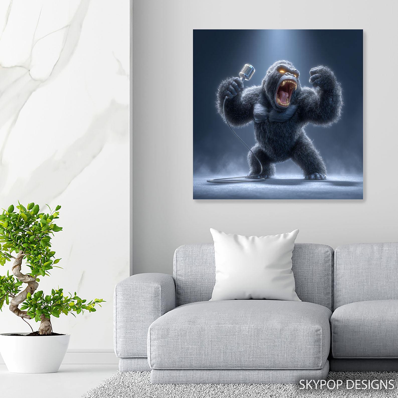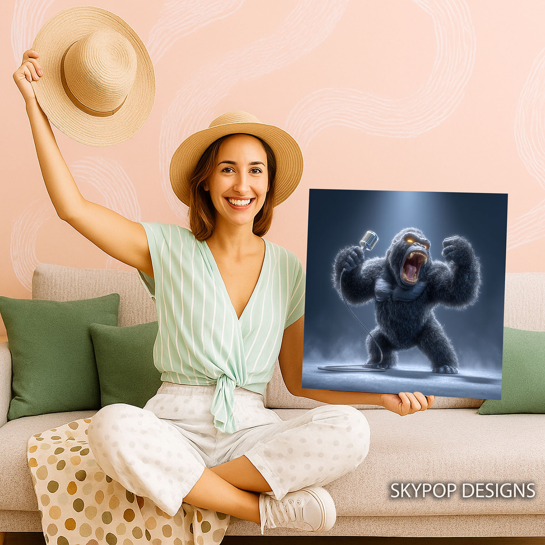 Unleash your inner wild with this powerful Gorilla canvas wall art, a vibrant poster that captures the raw energy of a rock and roll anthem. This striking artwork transforms any modern living room, game room, or office with its captivating depiction of a singing gorilla. High-quality printing ensures every detail of this contemporary street art, from the gorilla’s glowing yellow eyes to the vintage microphone, is vividly displayed. The bold use of black and grey creates a dramatic, eye-catching contrast, making this gorilla poster an ideal statement piece for glam or pop art inspired decor. This animal art celebrates the unconventional and adds a unique personality to your entryway or entertainment space. Perfect for music lovers and those who appreciate avant-garde wall decor, this canvas art piece inspires boldness and creativity. The dynamic pose and intense expression of the gorilla exude confidence and passion, bringing an electrifying atmosphere to your surroundings. This versatile poster or canvas wall art is a fantastic gift for birthdays, holidays, or housewarmings for anyone who loves unique art. Elevate your space with this stunning Gorilla canvas wall art, a true testament to the art of musical expression. Make this eye-catching piece the centerpiece of your personalized wall art collection today and feel the rhythm.