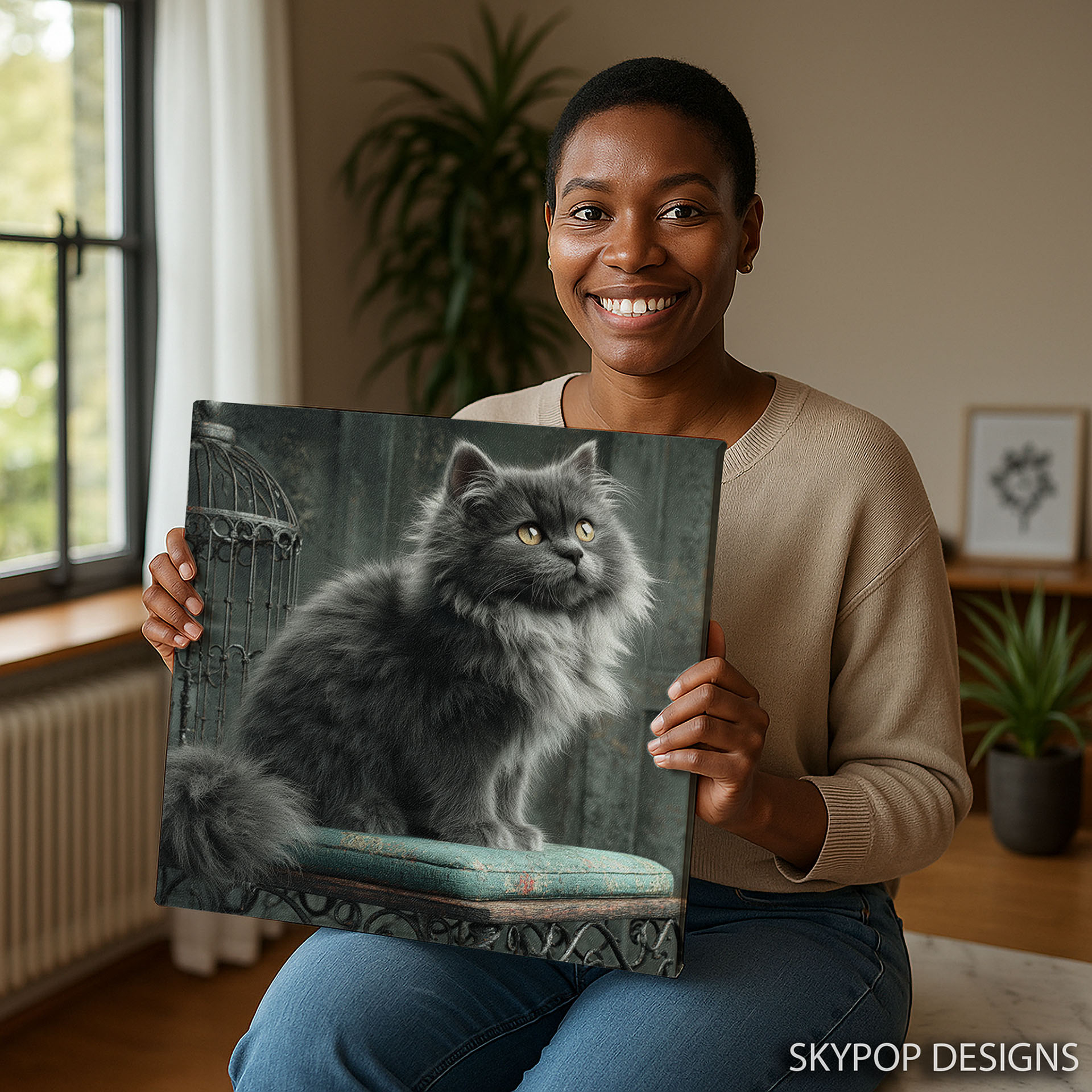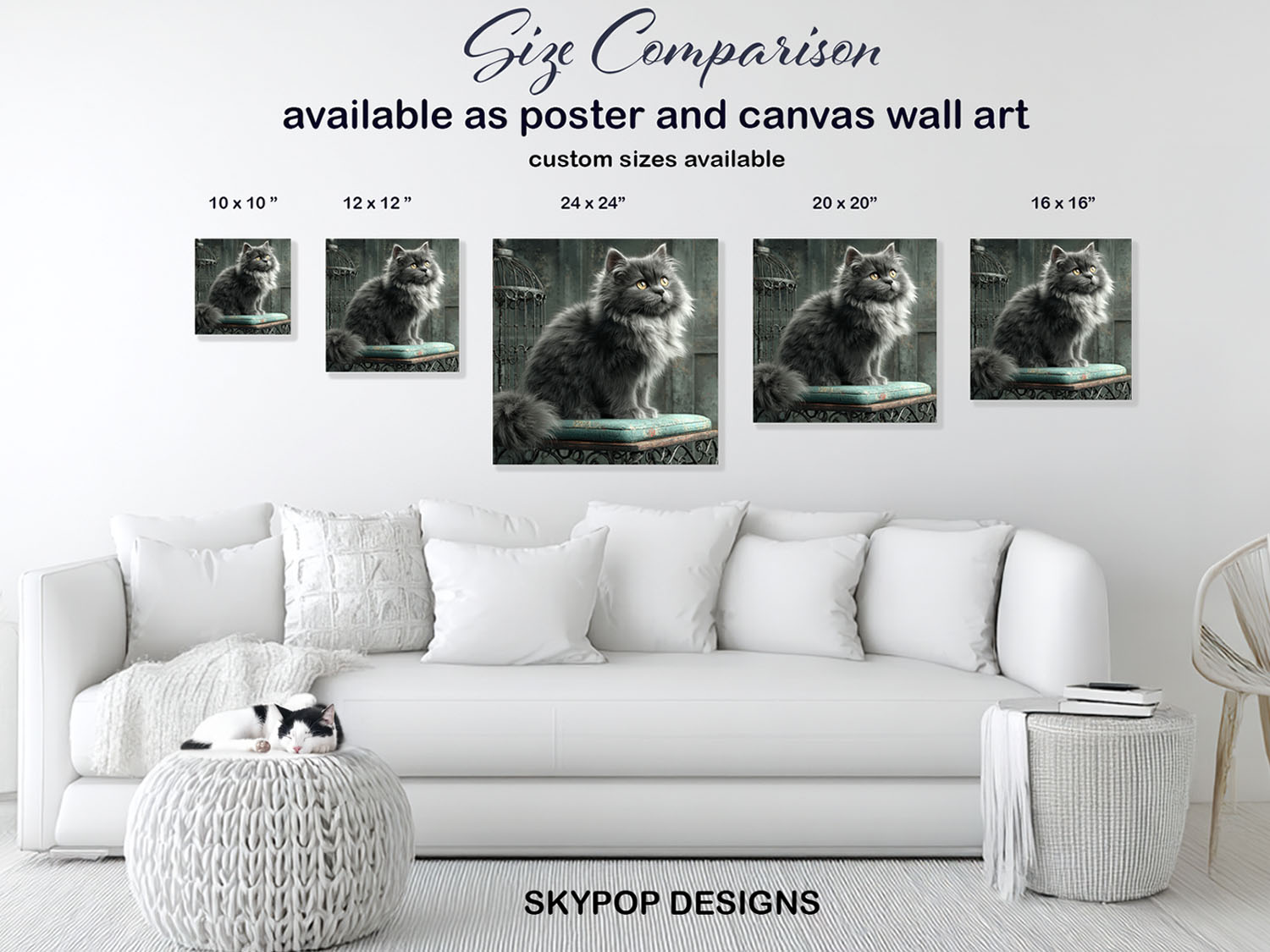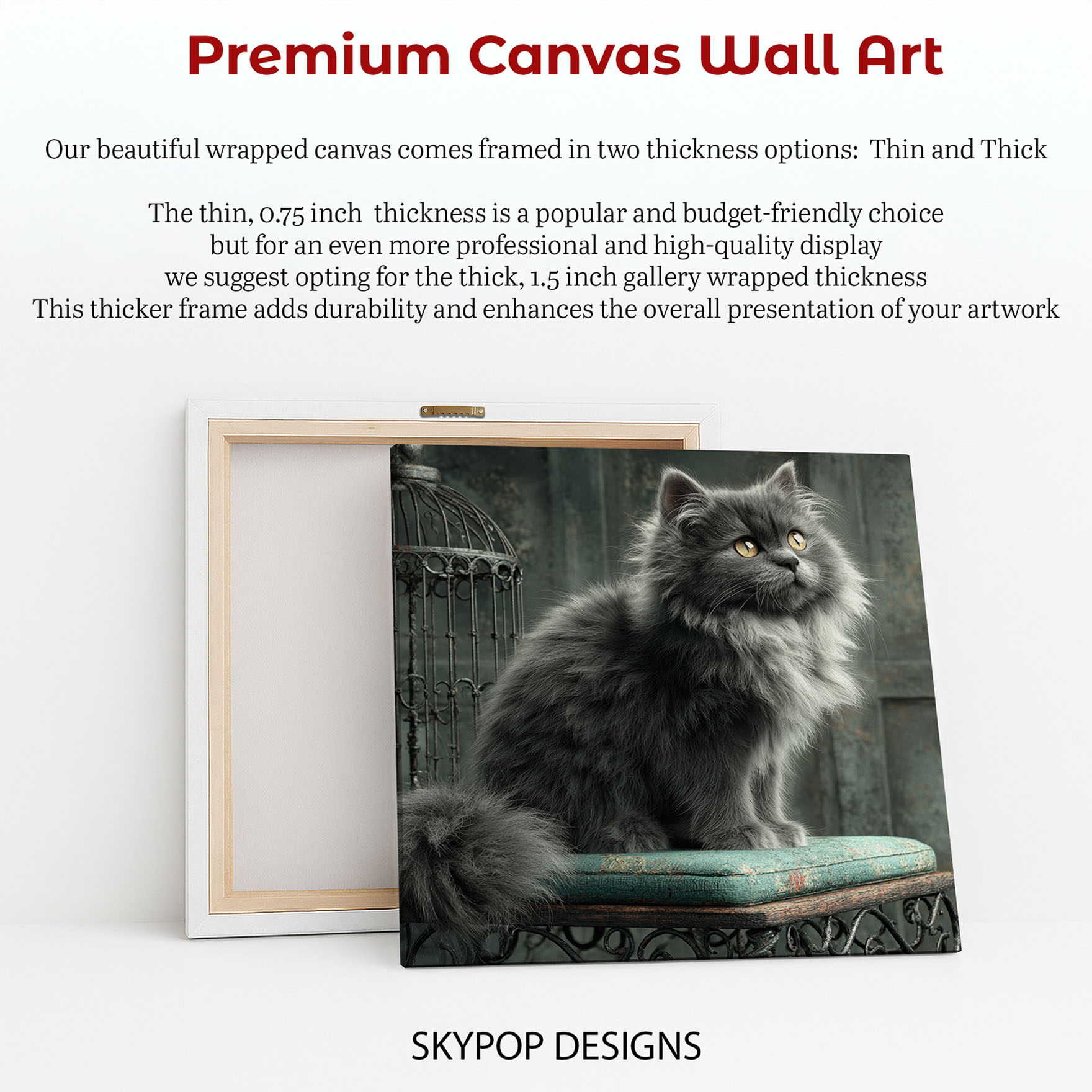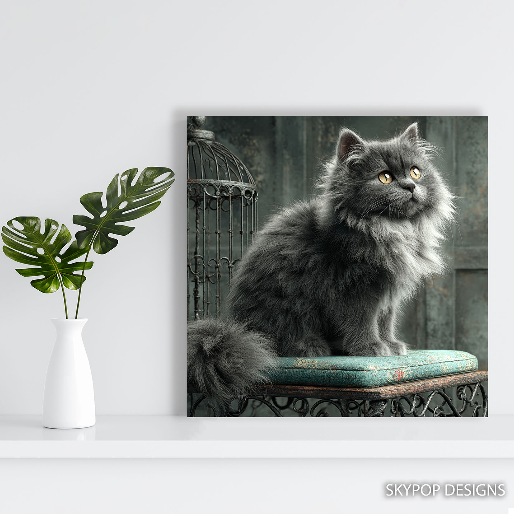 Elevate your home with this stunning Cat canvas wall art featuring a majestic grey cat with captivating yellow eyes. This poster or canvas wall art brings a touch of classic elegance and contemporary charm to any space, perfect for transforming your living room or bedroom. The rich grey tones of the cat blend beautifully with the teal accent of the cushion, creating a sophisticated palette ideal for traditional or glam decor styles. This animal art piece is also a wonderful addition to a vintage-inspired entryway or a refined library, adding personality and intrigue. The intricate details of the cat’s fur and the antique birdcage in the background evoke a sense of timeless style and quiet contemplation. High-quality canvas printing ensures every whisker and shadow is rendered with breathtaking clarity, making this poster a true work of art. Ideal for cat lovers and admirers of classic portraiture, this artwork also makes a memorable housewarming or birthday gift. The striking contrast and the cat’s alert gaze will inspire conversation and admiration from all who see it. Whether you are looking for modern wall decor with an animal theme or a standout piece for a more traditional setting, this canvas wall art delivers. Enhance your home’s aesthetic with this captivating cat poster that celebrates the beauty and elegance of our feline companions. Bring this timeless piece of animal wall art into your home today and let its charm captivate your senses.