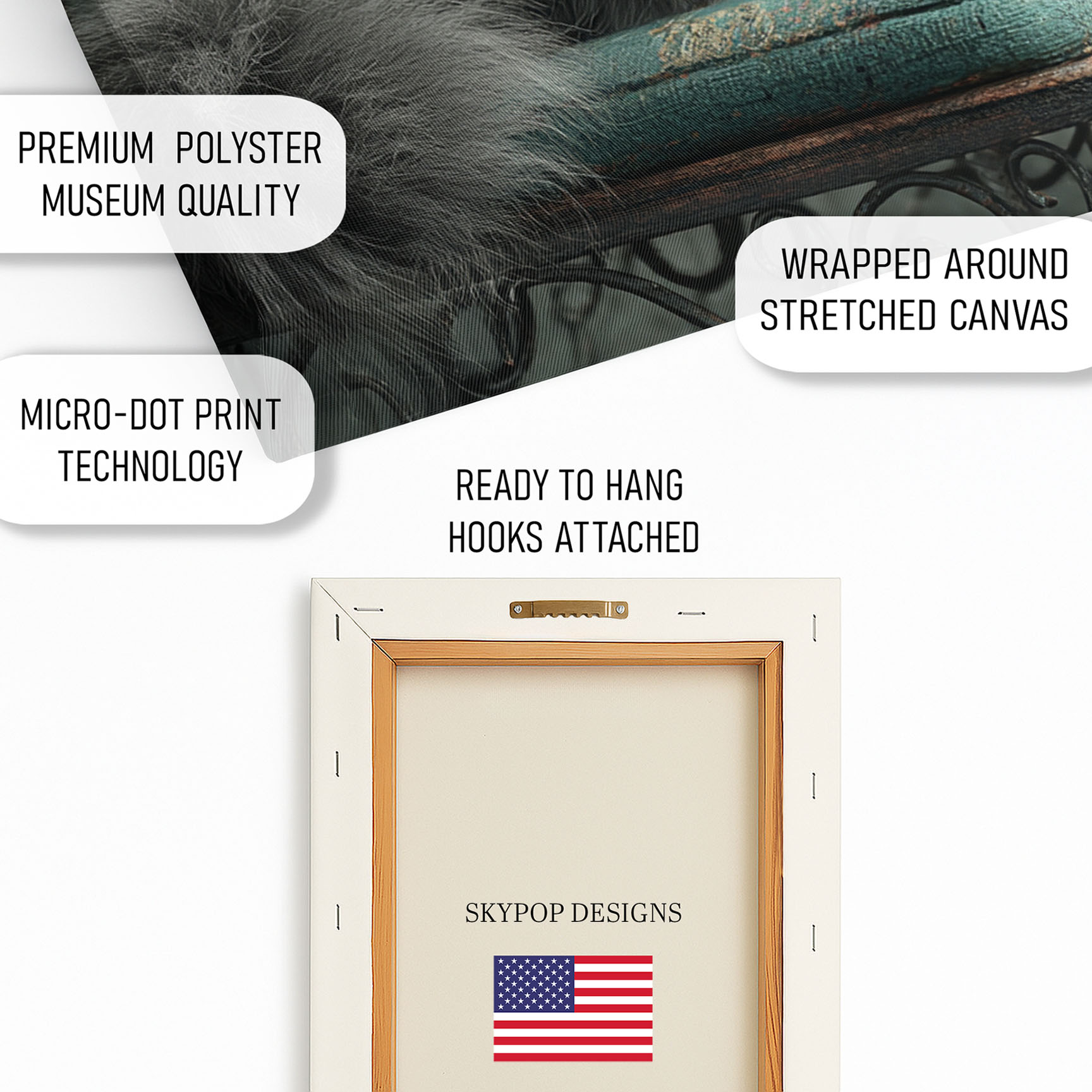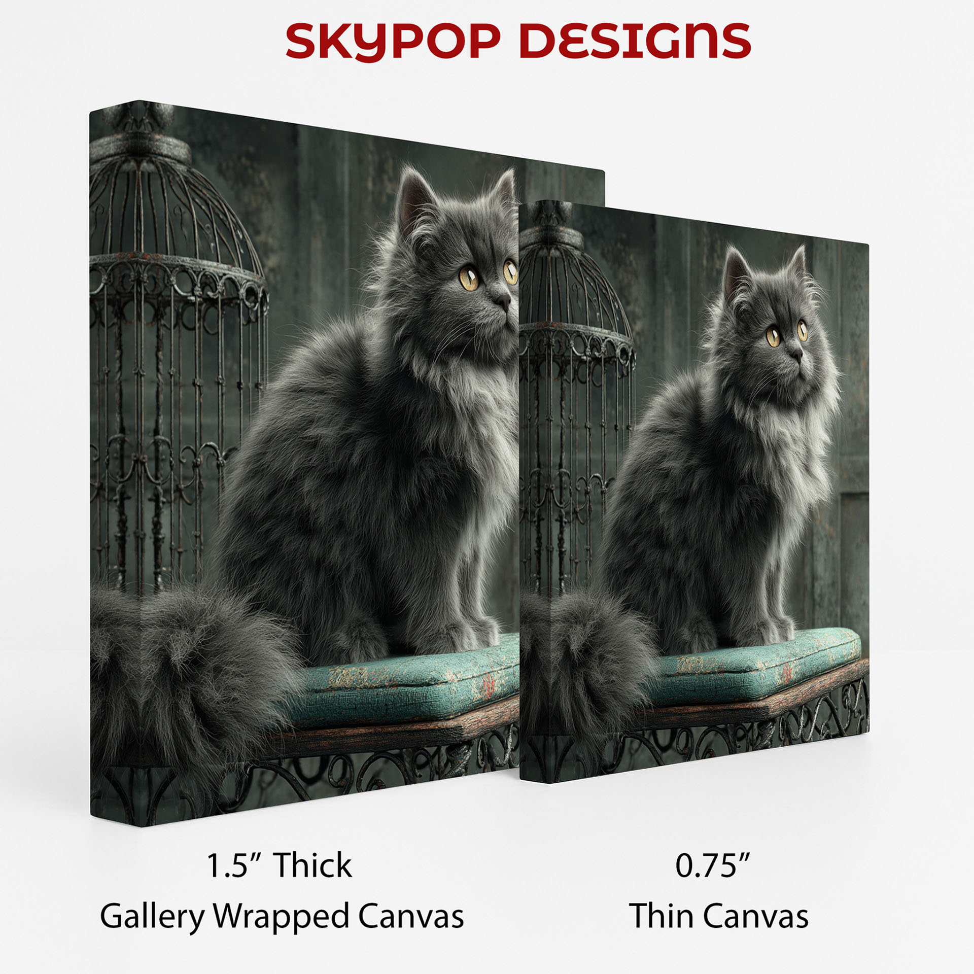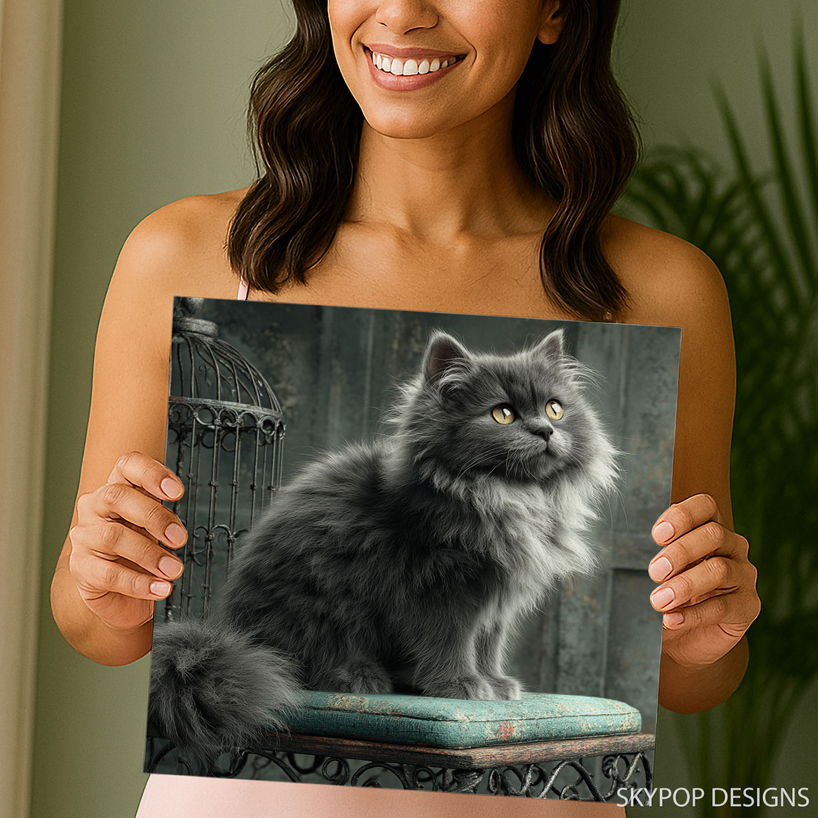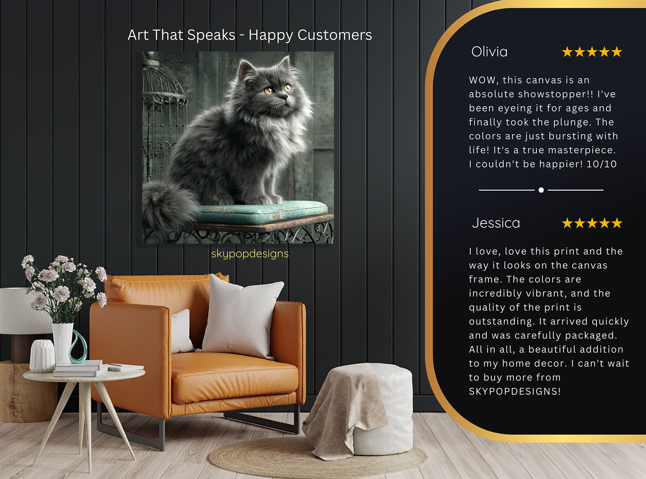 Elevate your home with this stunning Cat canvas wall art featuring a majestic grey cat with captivating yellow eyes. This poster or canvas wall art brings a touch of classic elegance and contemporary charm to any space, perfect for transforming your living room or bedroom. The rich grey tones of the cat blend beautifully with the teal accent of the cushion, creating a sophisticated palette ideal for traditional or glam decor styles. This animal art piece is also a wonderful addition to a vintage-inspired entryway or a refined library, adding personality and intrigue. The intricate details of the cat’s fur and the antique birdcage in the background evoke a sense of timeless style and quiet contemplation. High-quality canvas printing ensures every whisker and shadow is rendered with breathtaking clarity, making this poster a true work of art. Ideal for cat lovers and admirers of classic portraiture, this artwork also makes a memorable housewarming or birthday gift. The striking contrast and the cat’s alert gaze will inspire conversation and admiration from all who see it. Whether you are looking for modern wall decor with an animal theme or a standout piece for a more traditional setting, this canvas wall art delivers. Enhance your home’s aesthetic with this captivating cat poster that celebrates the beauty and elegance of our feline companions. Bring this timeless piece of animal wall art into your home today and let its charm captivate your senses.