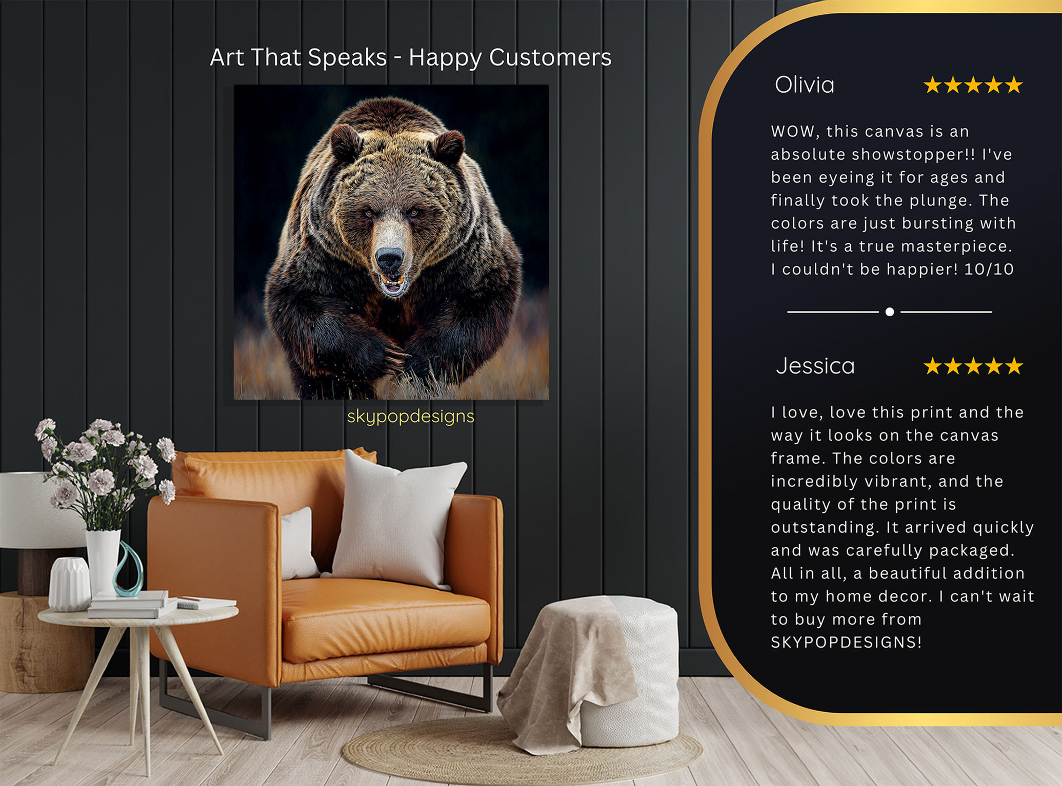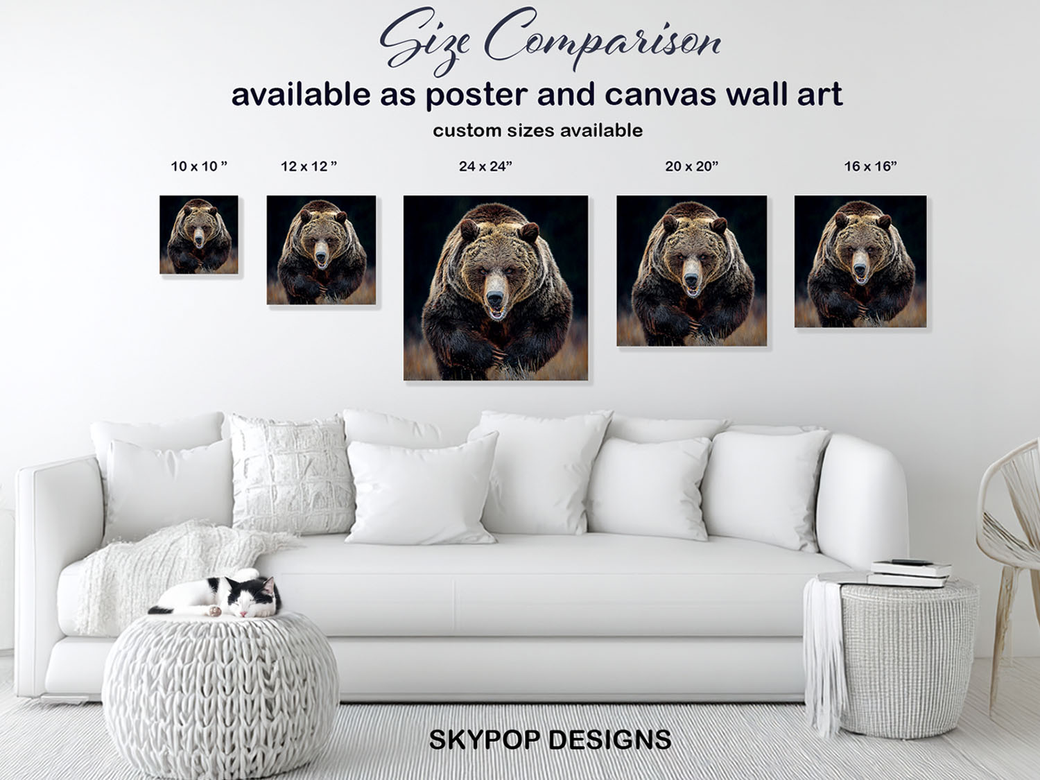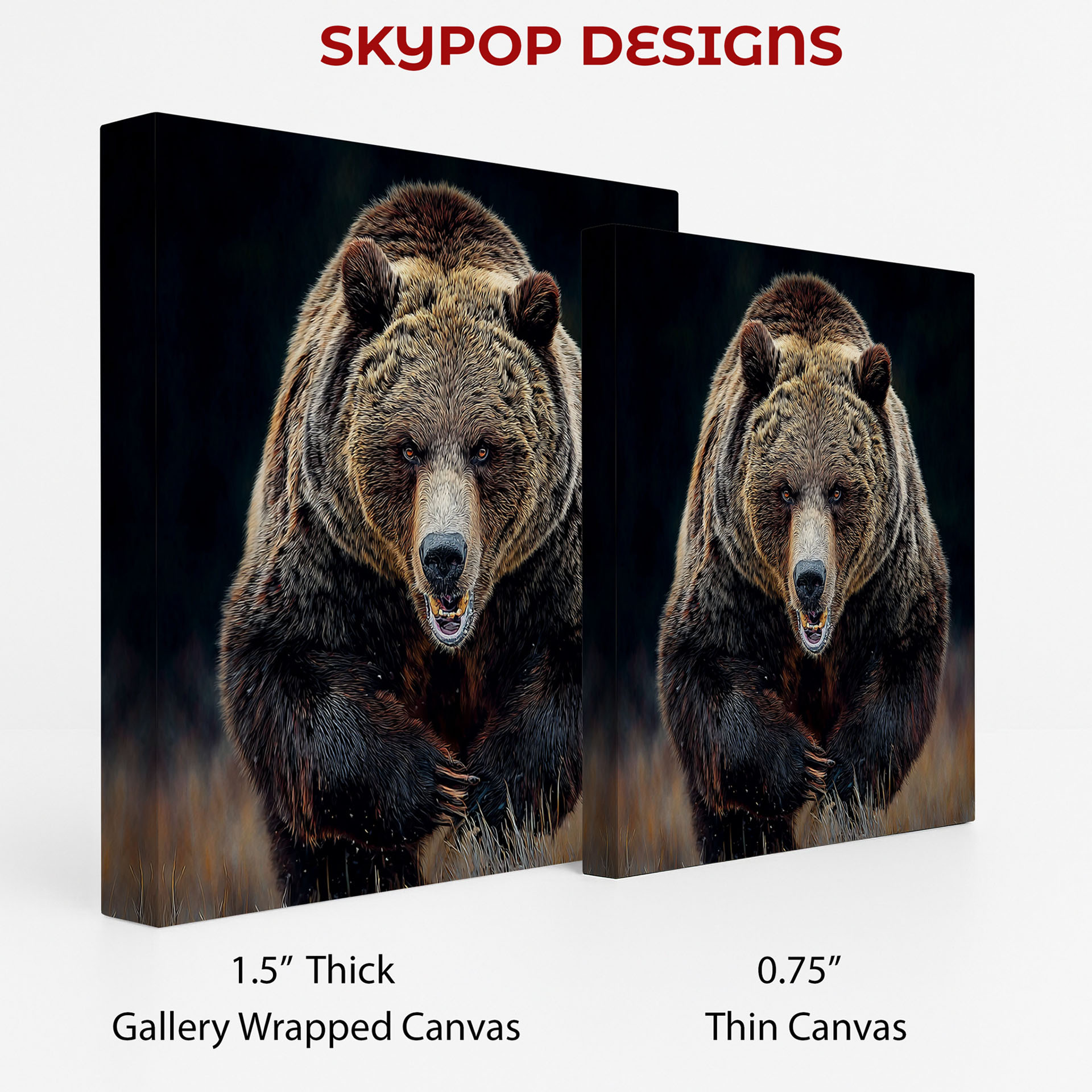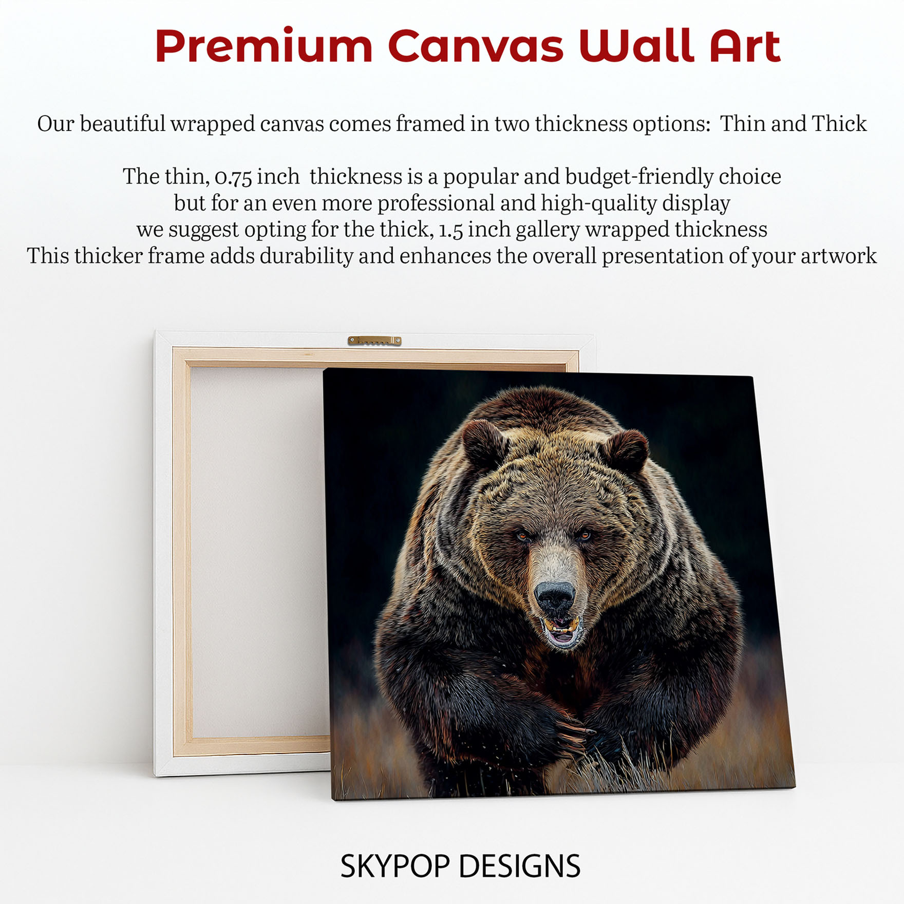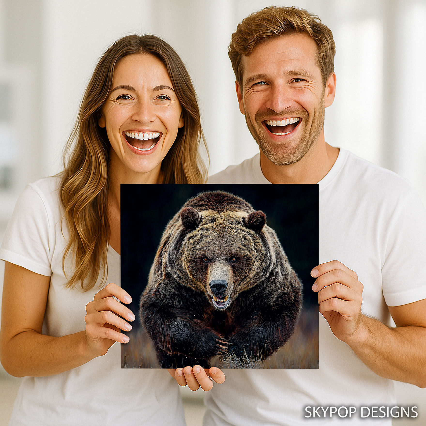 Bring the raw power of nature into your home with this striking grizzly bear canvas wall art. This dramatic poster or canvas wall art captures the intense gaze and open mouth of a majestic bear, creating a captivating focal point for any room. The rich browns and earthy tones of the bear against the dark background make this animal art piece incredibly impactful, perfect for rustic living room decor or a masculine office space. This contemporary art style brings a modern edge to wildlife imagery, making it a standout piece in any collection. Ideal for country-style decor enthusiasts, this bear artwork adds a touch of untamed wilderness and strength. High-quality printing ensures every detail of the bear’s fur and fierce expression is vividly rendered. Whether displayed in an entryway to make a bold statement or in a game room for a touch of the wild, this canvas wall art is sure to be a conversation starter. It’s a perfect gift for nature lovers, adventurers, or anyone who appreciates the power and beauty of wildlife. Elevate your space with this stunning piece of animal wall art that celebrates the untamed spirit of the grizzly bear. Transform your home with this powerful bear poster, a true masterpiece of nature decor that will inspire awe and admiration daily. Get your Grizzly Bear Roar Canvas Art today and unleash the wild within your walls.