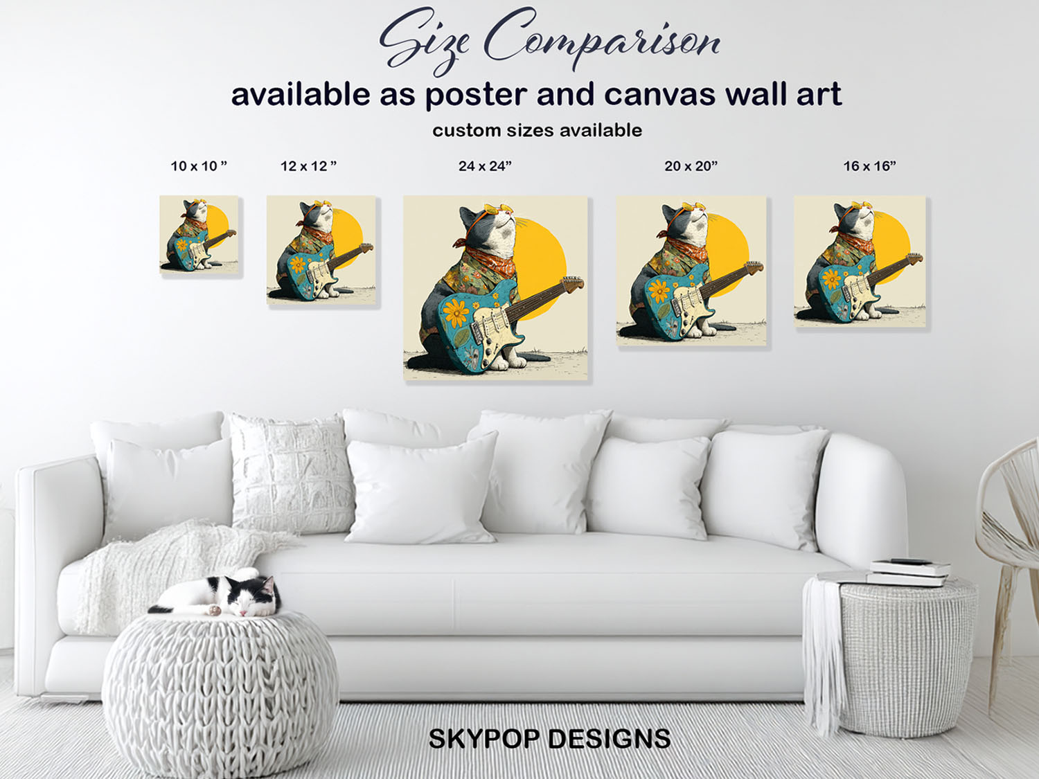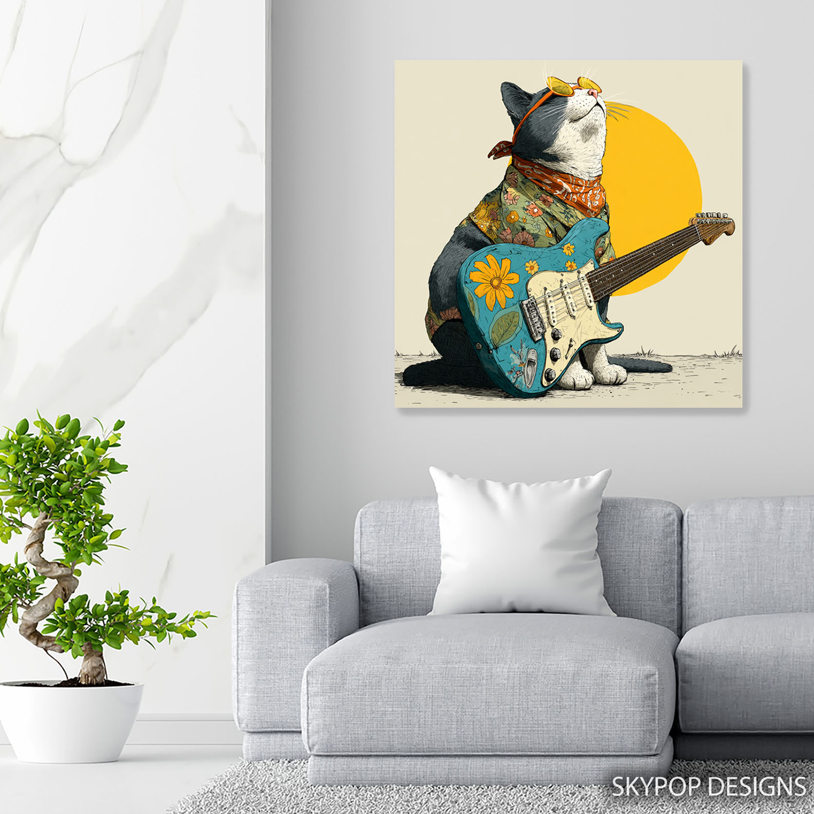 Groovy Guitar Cat Art, Canvas or Poster, Pop Art Bohemian Coastal Decor, Living Room Bedroom Game Room Wall Art, Multicolor Yellow Orange Teal