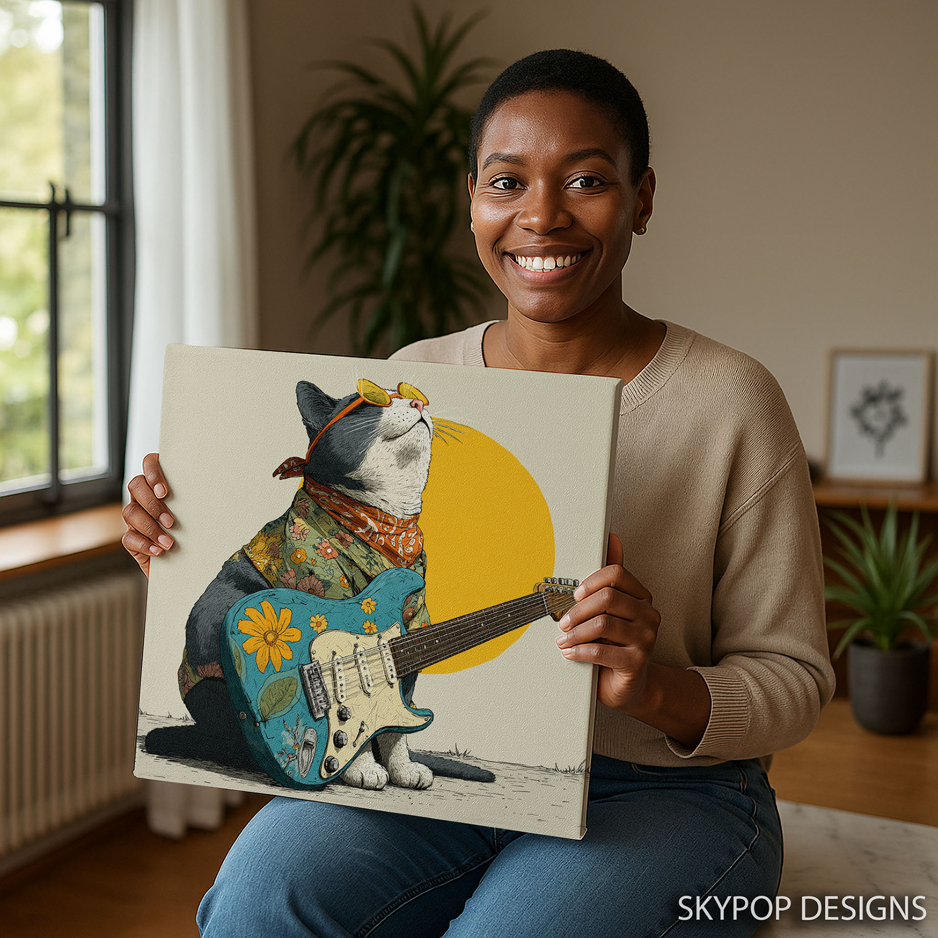 Channel your inner rockstar with this vibrant cat canvas wall art, a perfect poster to inject fun and personality into your space. This captivating piece showcases a cool cat adorned in a floral shirt and bandana, strumming a uniquely decorated guitar, embodying a free-spirited musical vibe. The artwork’s pop art and retro art influences, combined with its bohemian and coastal decor style, make it an ideal addition for living rooms, bedrooms, or game rooms. The bold multicolor palette, featuring sunny yellow and warm orange tones, alongside pops of teal, creates a striking visual that is sure to spark joy and conversation. This canvas wall art is perfect for anyone looking to elevate their modern living room wall decor with a touch of playful charm. It’s not just art; it’s a statement piece that transforms any room into a lively and inspiring environment. High-quality printing ensures the rich colors and intricate details of this unique cat artwork are beautifully rendered, making it a standout piece of wall art. This poster is also a fantastic gift idea for music lovers, cat enthusiasts, and anyone celebrating a birthday or housewarming. Embrace the groovy energy and whimsical spirit of this guitar cat canvas art to bring a smile to your face every day. Elevate your home’s aesthetic with this fun and expressive piece of wall decor that celebrates individuality and a love for music. Make a statement with this eye-catching cat poster and let the good times roll in your home.