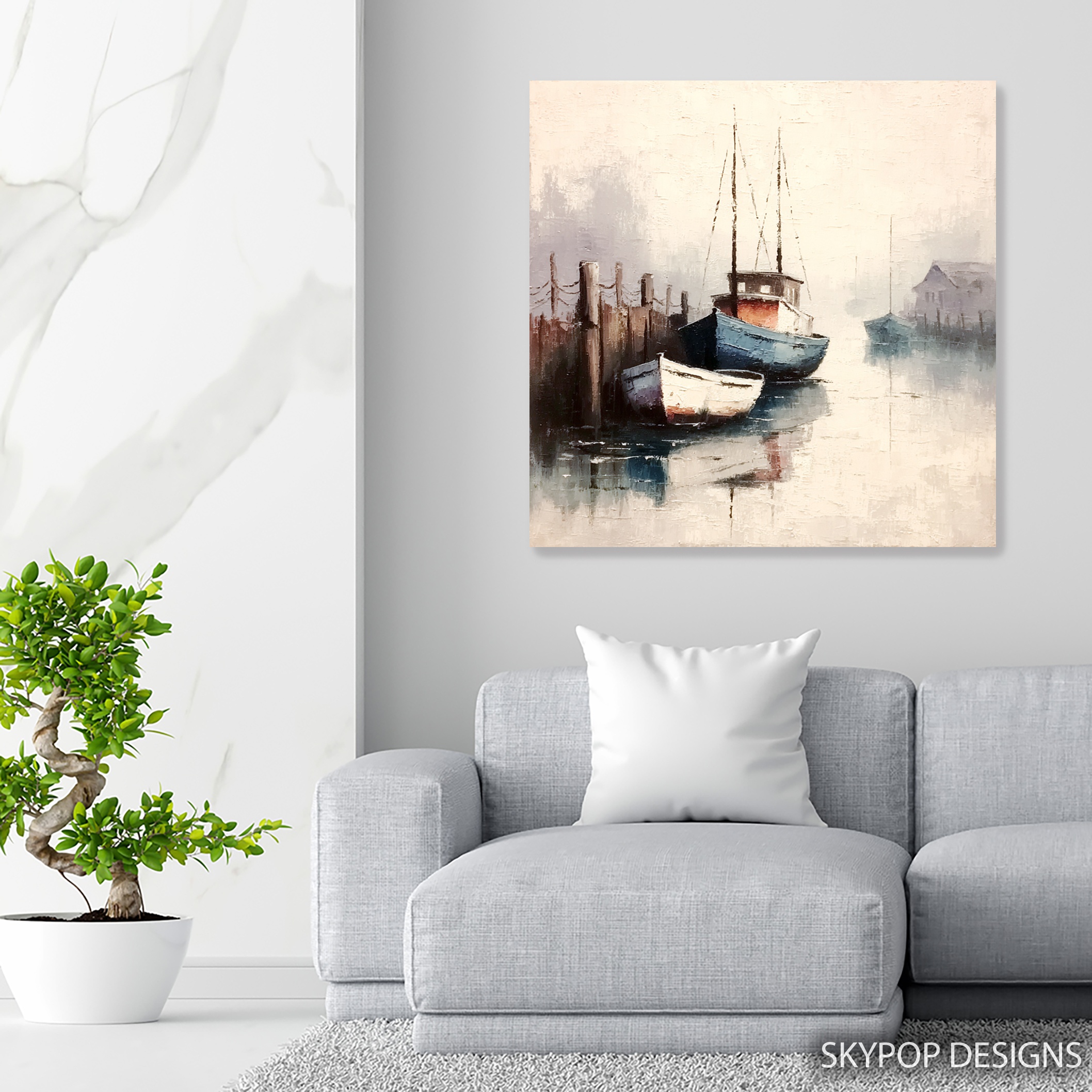 Transform your space with this captivating harbor boats canvas wall art, bringing a serene coastal atmosphere into your home. This stunning poster showcases two boats nestled in a misty harbor, perfectly capturing the essence of a peaceful seaside morning. The impressionistic style adds depth and texture, making it an ideal centerpiece for coastal-inspired living rooms or bedrooms. Rich blues and soft greys create a calming color palette, instantly soothing the senses and enhancing relaxation in any space. This versatile canvas art complements both rustic and traditional decor styles, adding a touch of nautical charm to dining rooms or offices. The subtle reflection of the boats on the still water adds a mesmerizing element, drawing the eye and inviting contemplation. Perfect as a housewarming gift or to refresh your own space, this artwork brings the tranquility of the coast indoors. High-quality printing ensures every brushstroke and misty detail is faithfully reproduced, creating a premium wall art piece that looks hand-painted. Whether you’re a sailing enthusiast or simply love coastal vibes, this harbor scene will transport you to a peaceful waterfront retreat. The soft, muted tones make it easy to incorporate into various color schemes, while the timeless subject matter ensures lasting appeal. Elevate your home decor with this evocative canvas art that celebrates the quiet beauty of harbor life. Transform your walls and create a serene atmosphere with this captivating boat artwork today.