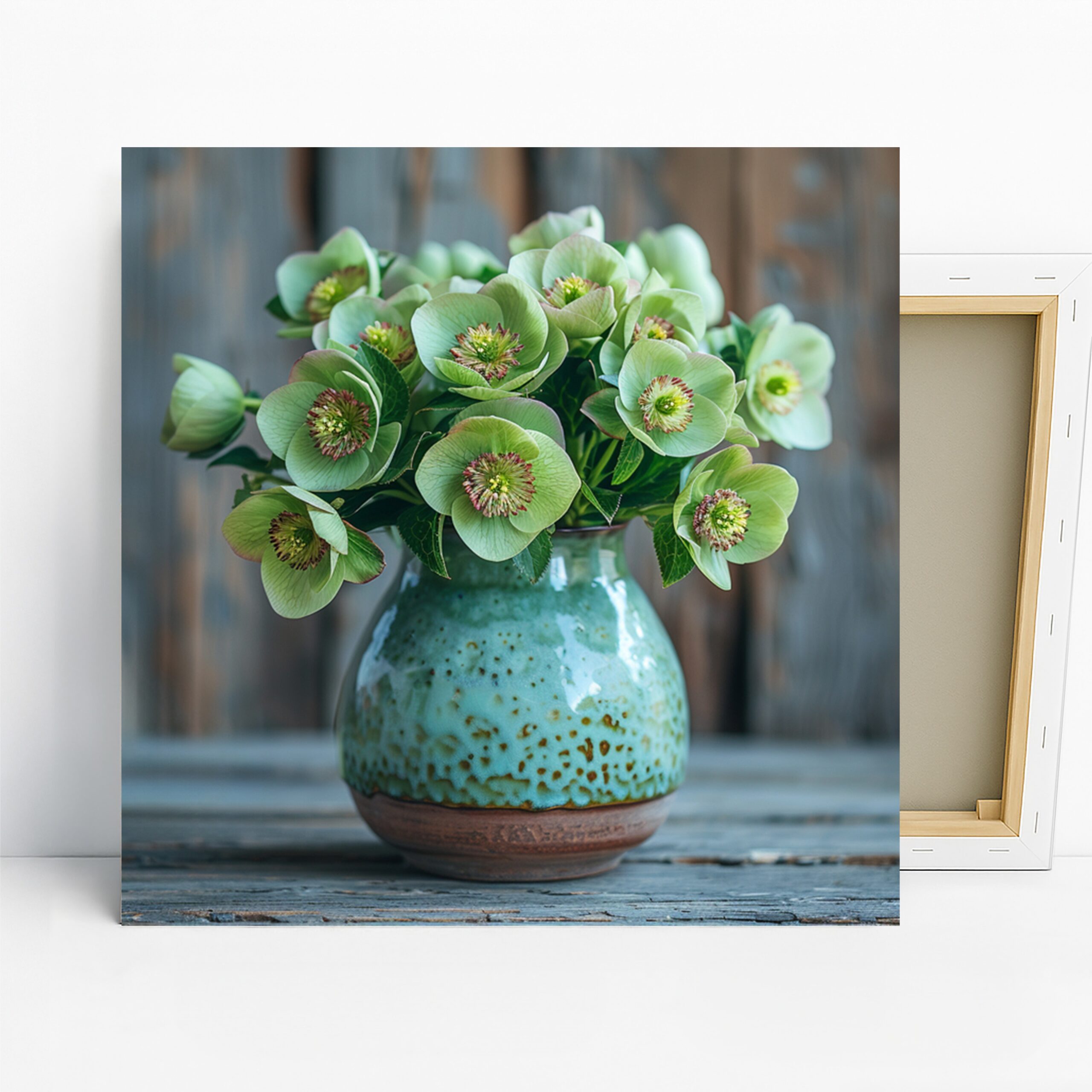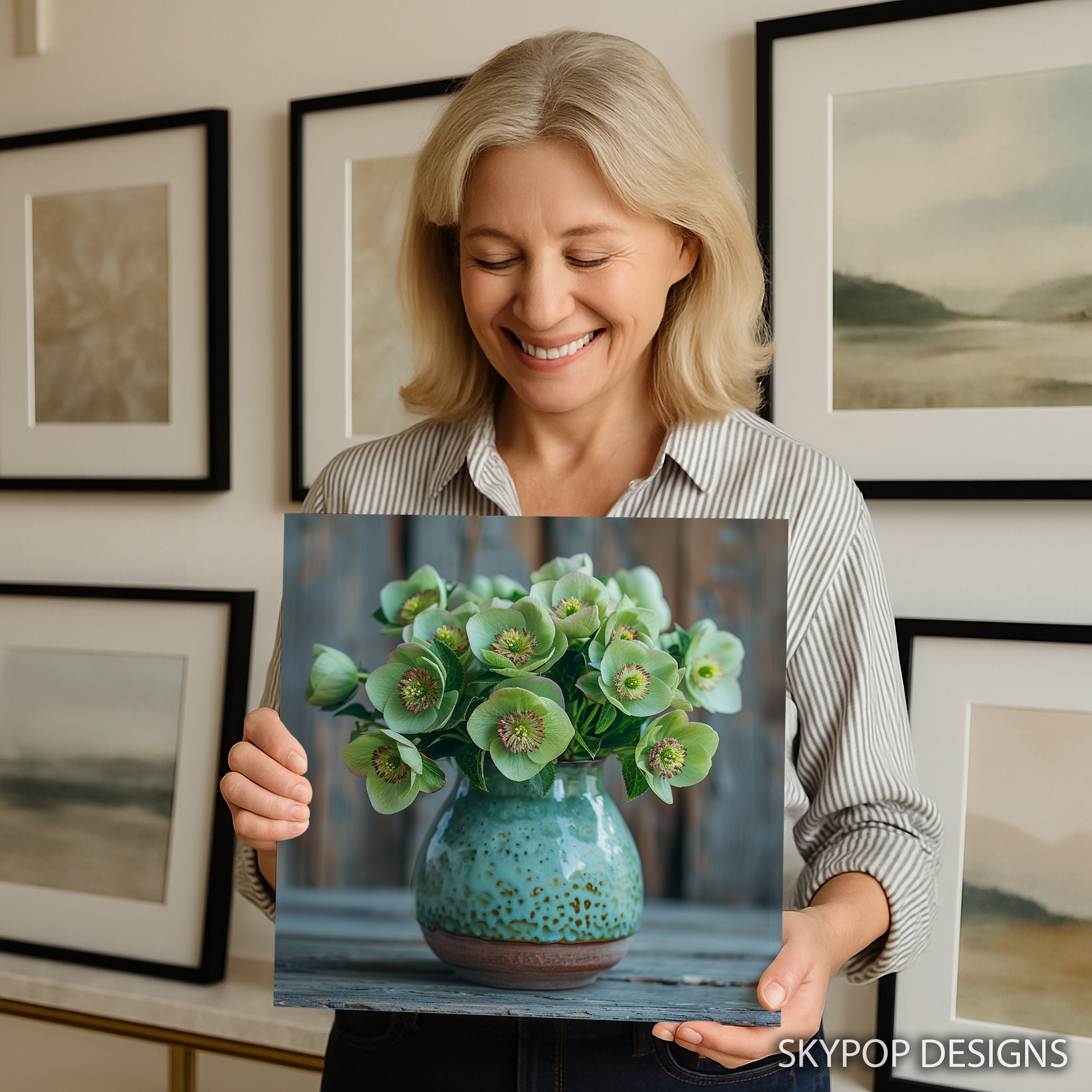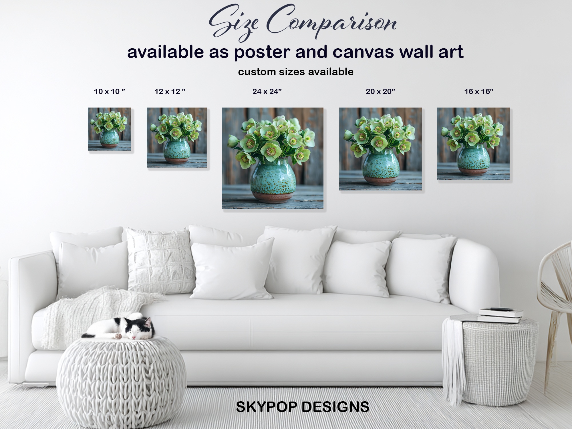 Elevate your home with this stunning hellebore canvas wall art, showcasing delicate blooms in a rustic vase. This poster or canvas wall art is perfect for bringing a touch of natural beauty into any space, from a cozy farmhouse living room to a serene bedroom. The soft green hues of the hellebore flowers and the teal tones of the ceramic vase create a calming and elegant atmosphere. Ideal for rustic and country decor styles, this floral artwork also complements traditional interiors beautifully. The hellebore, known for its exquisite detail and unique charm, makes a captivating centerpiece for your wall decor. High-quality printing ensures every petal and textural nuance of the vase is captured with clarity. This versatile floral art piece is also a wonderful addition to dining rooms or entryways, instantly enhancing your home’s welcoming ambiance. Whether you’re looking for a thoughtful housewarming gift, a birthday surprise, or a way to freshen up your seasonal decor, this hellebore canvas wall art offers enduring appeal. The earthy color palette blends harmoniously with a variety of interior color schemes, making it easy to integrate into your existing design. Transform your space with this exceptional hellebore flower art, combining natural elegance with timeless design trends. This canvas wall art is a must-have for anyone who appreciates fine floral decor and sophisticated wall art. Bring the tranquility of nature indoors and enhance your home’s aesthetic today.