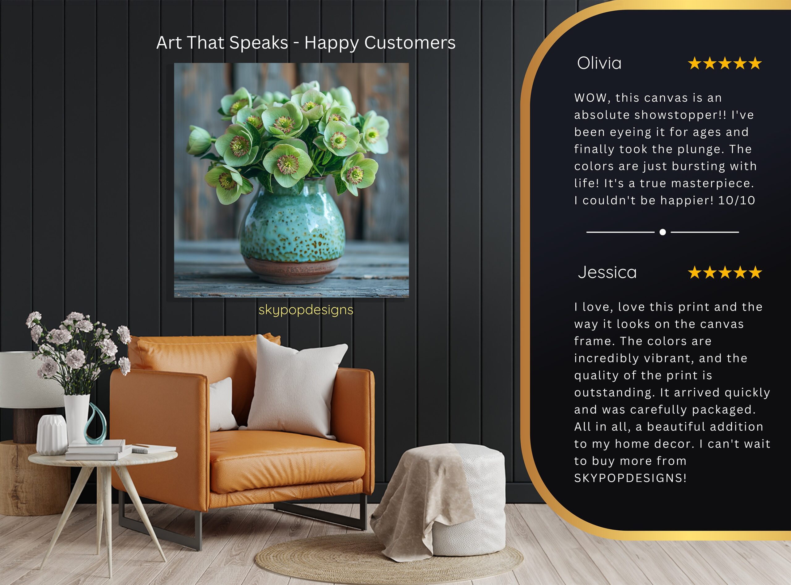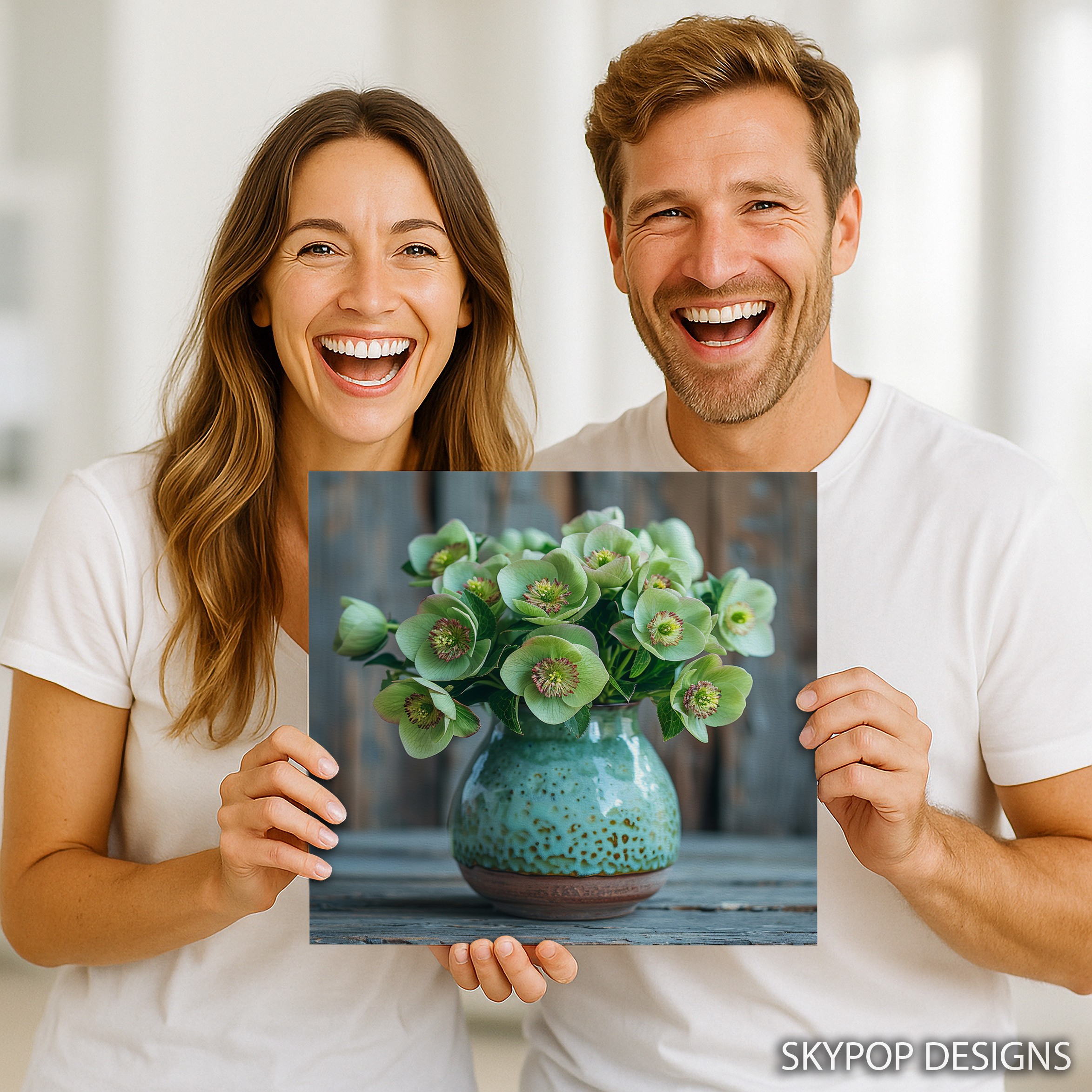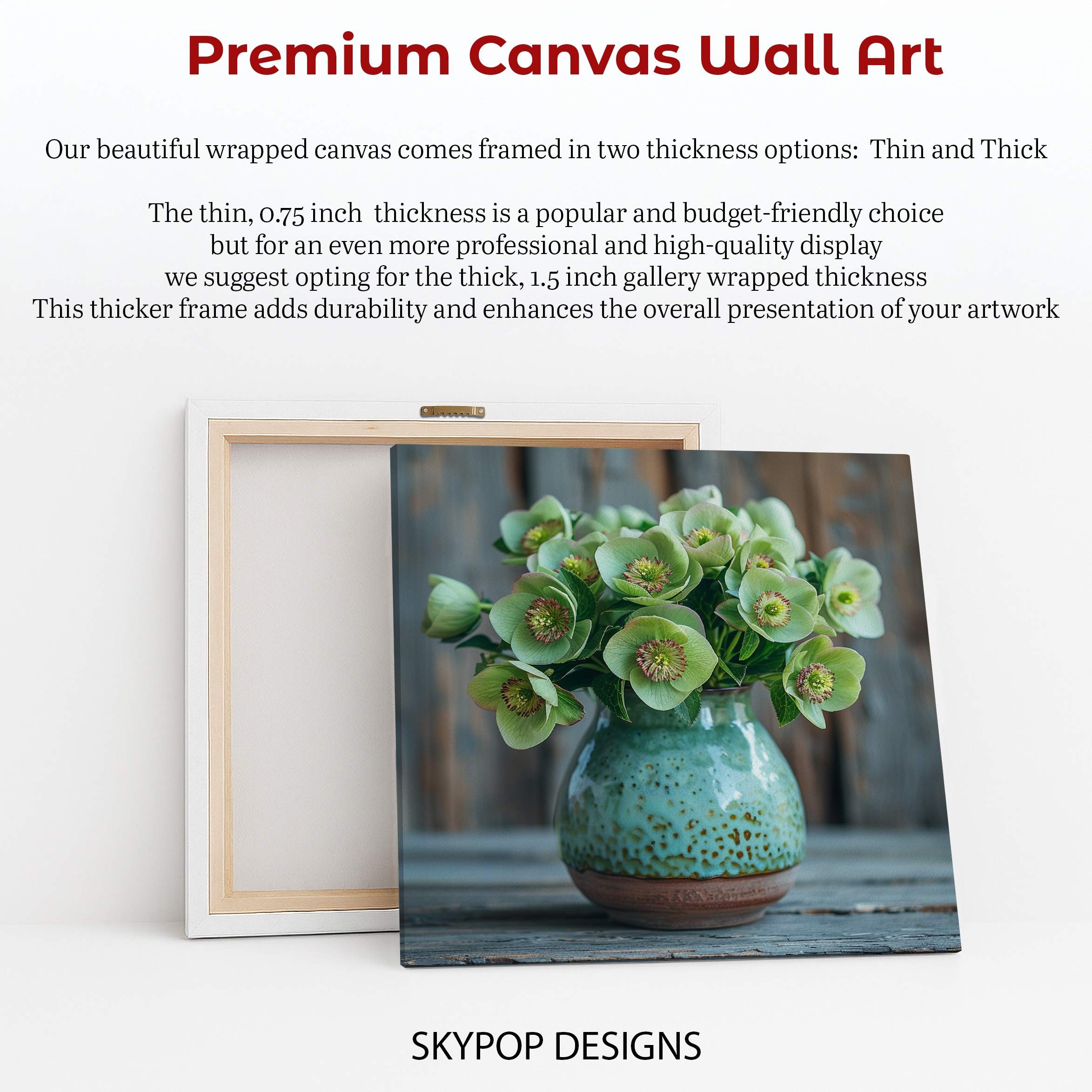 Elevate your home with this stunning hellebore canvas wall art, showcasing delicate blooms in a rustic vase. This poster or canvas wall art is perfect for bringing a touch of natural beauty into any space, from a cozy farmhouse living room to a serene bedroom. The soft green hues of the hellebore flowers and the teal tones of the ceramic vase create a calming and elegant atmosphere. Ideal for rustic and country decor styles, this floral artwork also complements traditional interiors beautifully. The hellebore, known for its exquisite detail and unique charm, makes a captivating centerpiece for your wall decor. High-quality printing ensures every petal and textural nuance of the vase is captured with clarity. This versatile floral art piece is also a wonderful addition to dining rooms or entryways, instantly enhancing your home’s welcoming ambiance. Whether you’re looking for a thoughtful housewarming gift, a birthday surprise, or a way to freshen up your seasonal decor, this hellebore canvas wall art offers enduring appeal. The earthy color palette blends harmoniously with a variety of interior color schemes, making it easy to integrate into your existing design. Transform your space with this exceptional hellebore flower art, combining natural elegance with timeless design trends. This canvas wall art is a must-have for anyone who appreciates fine floral decor and sophisticated wall art. Bring the tranquility of nature indoors and enhance your home’s aesthetic today.