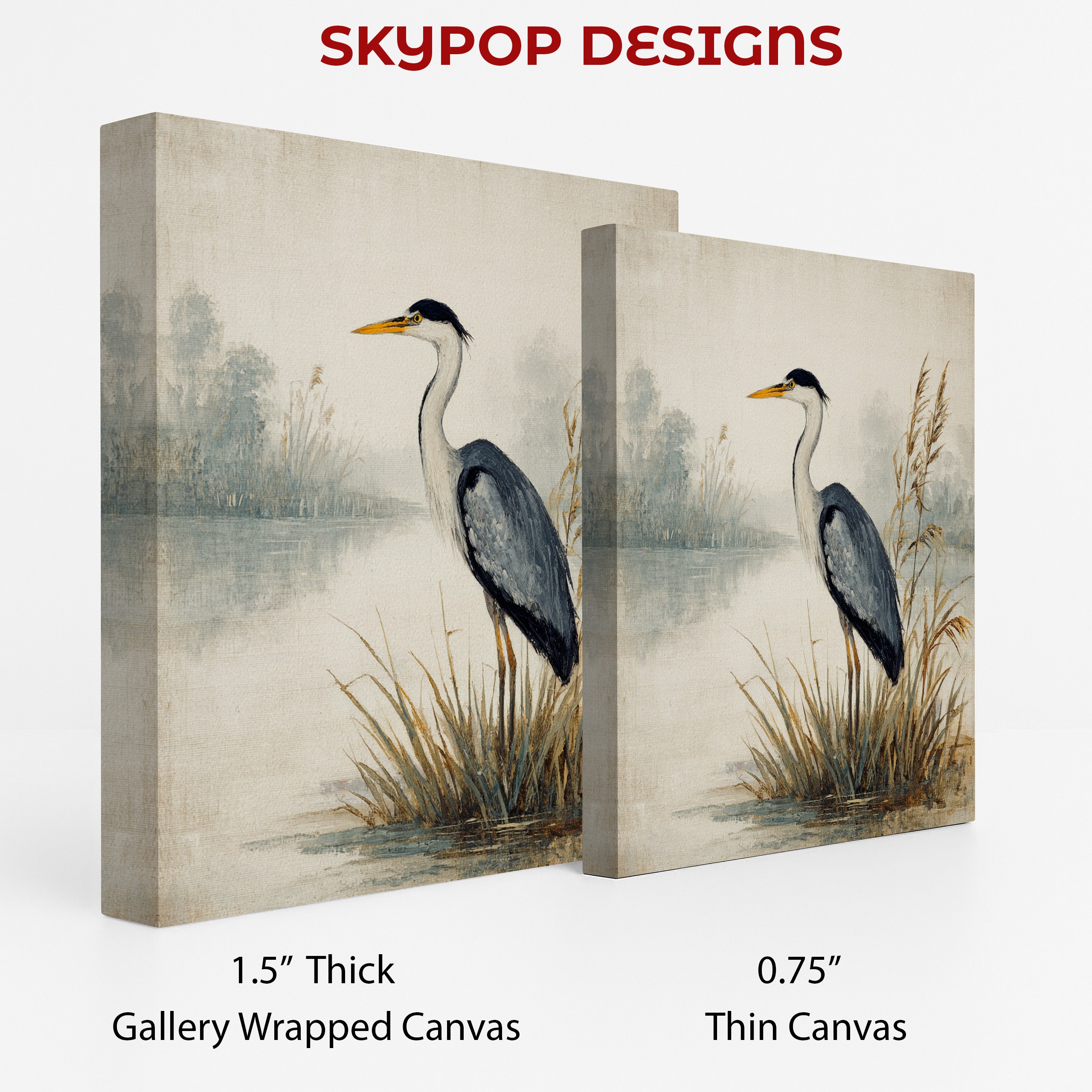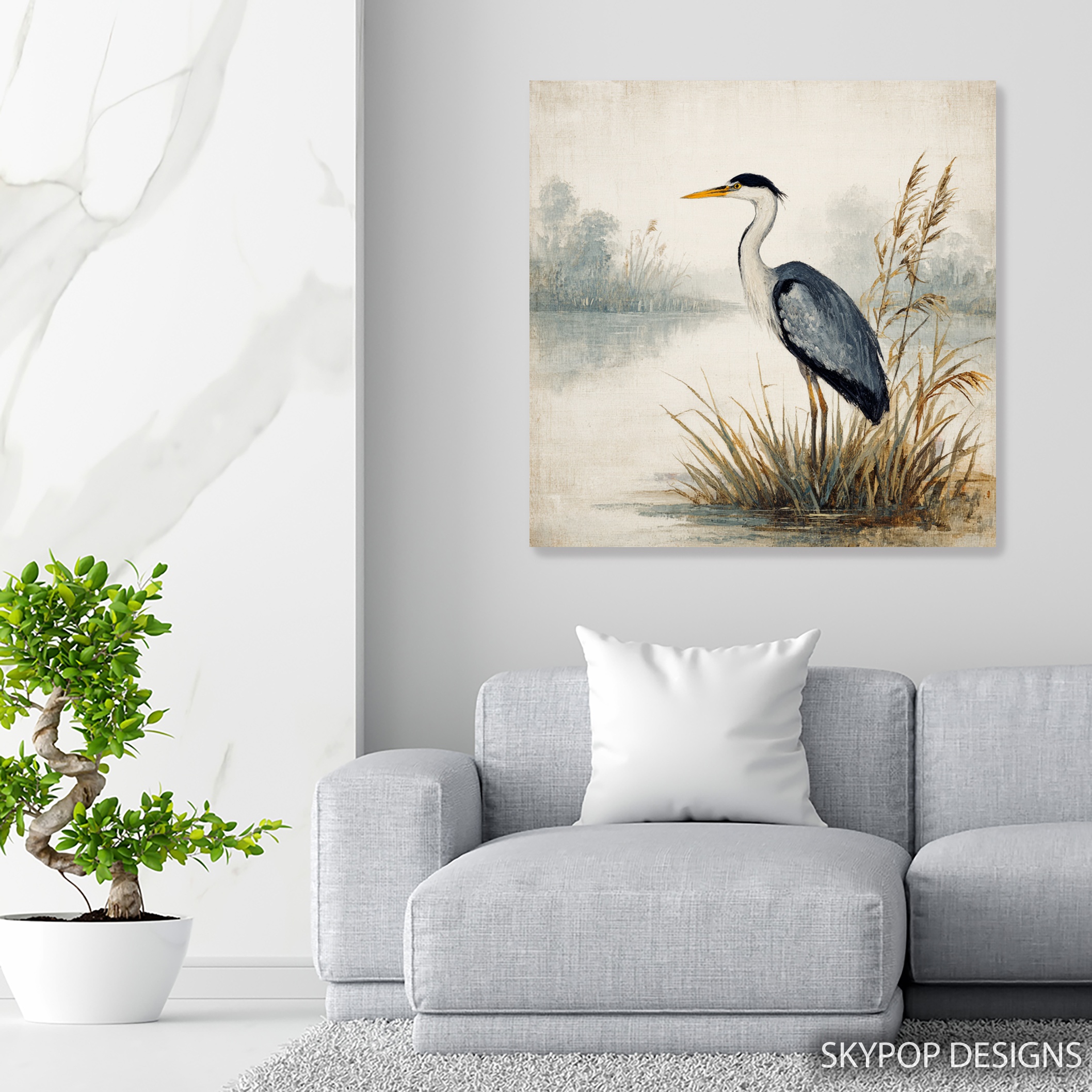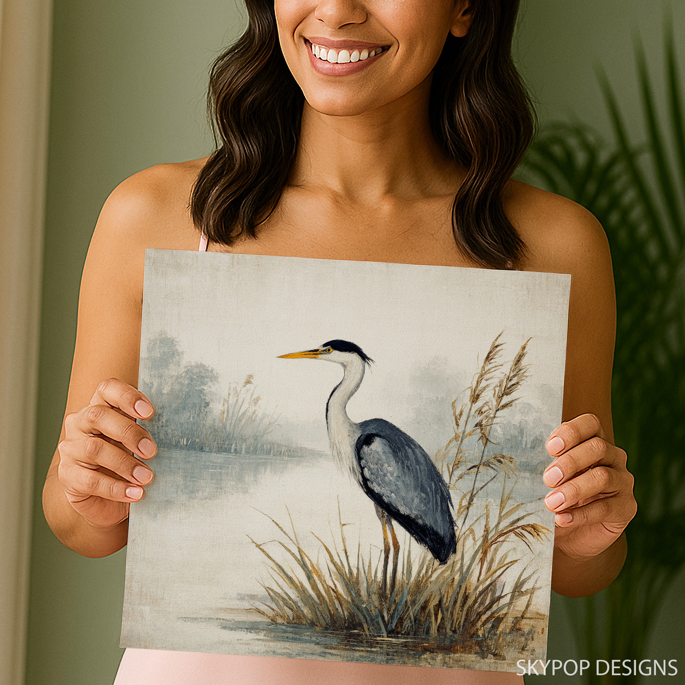 Bring the serene beauty of nature into your home with this stunning heron canvas wall art. This captivating piece showcases a majestic gray heron standing gracefully among reeds by a misty lake, perfect for creating a tranquil atmosphere in any room. The soft, muted color palette of blues, grays, and browns makes this poster ideal for coastal or rustic decor styles, effortlessly complementing modern interiors as well. Transform your living room, bedroom, or office into a peaceful retreat with this elegant bird art that celebrates the quiet moments in nature. The detailed brushwork captures the heron’s distinctive features and the delicate textures of the surrounding landscape, bringing depth and interest to your walls. This versatile canvas art adapts beautifully to various room sizes, making it a perfect focal point for a statement wall or a subtle addition to a gallery arrangement. Ideal as a thoughtful housewarming gift or a personal treat to elevate your home decor, this heron wall art invites a sense of calm and connection to the natural world. The high-quality printing ensures every nuance of the original artwork is preserved, from the misty background to the intricate feather details. Whether you’re a bird enthusiast or simply appreciate serene nature scenes, this heron canvas will be a cherished addition to your art collection. Enhance your living space with this timeless piece that brings the tranquility of lakeside life into your everyday environment.