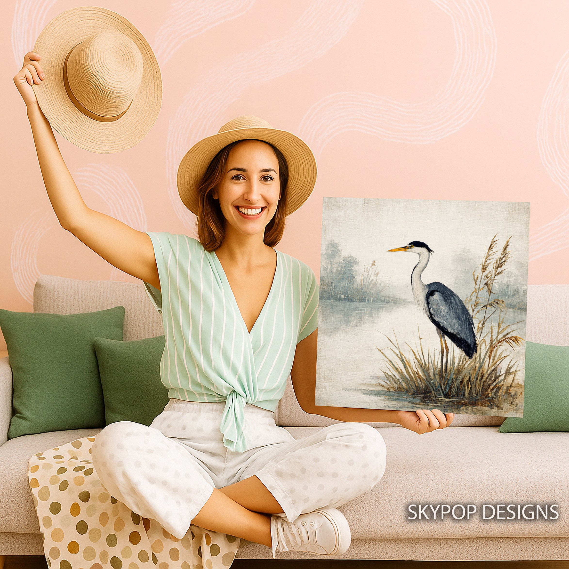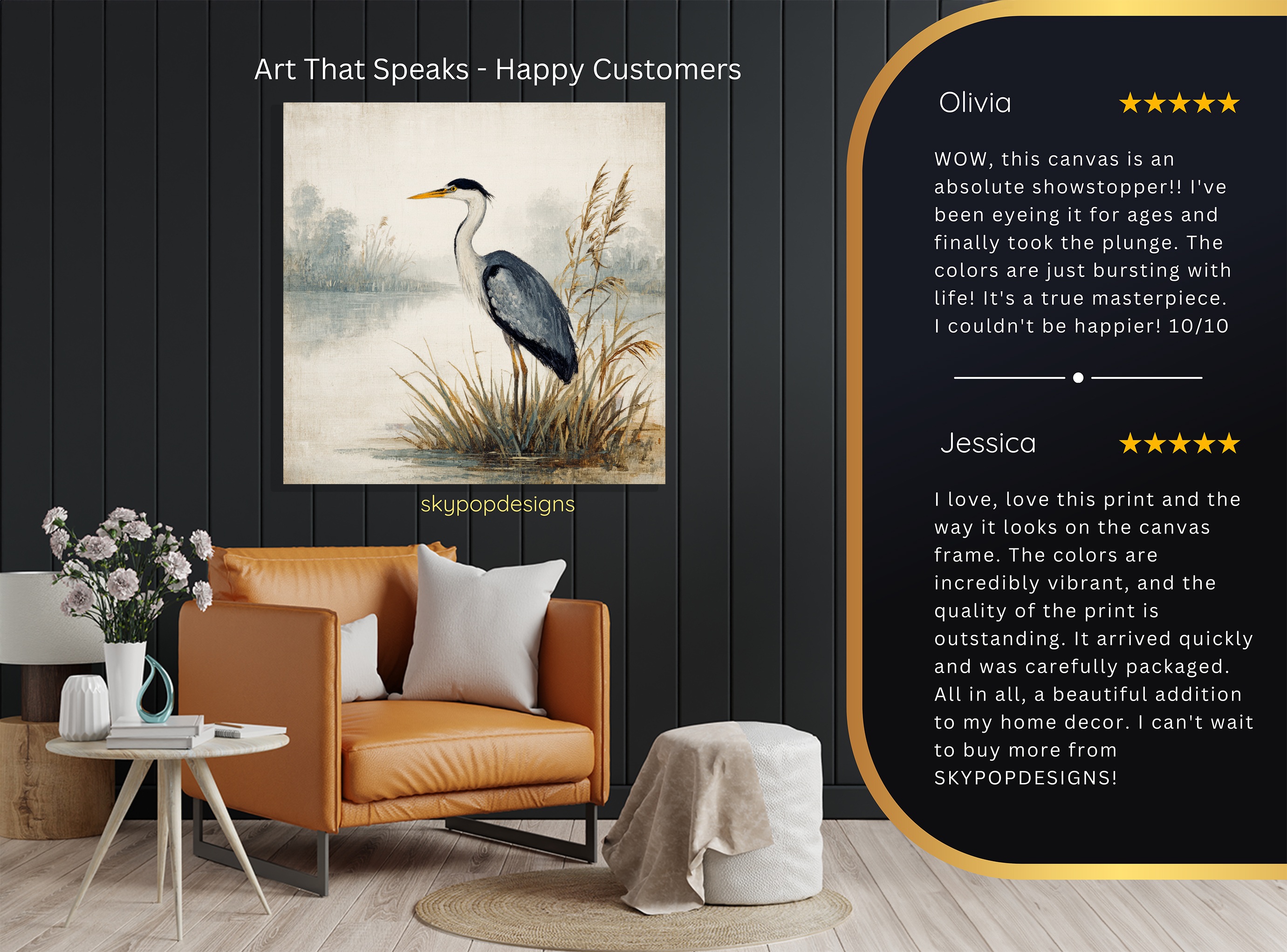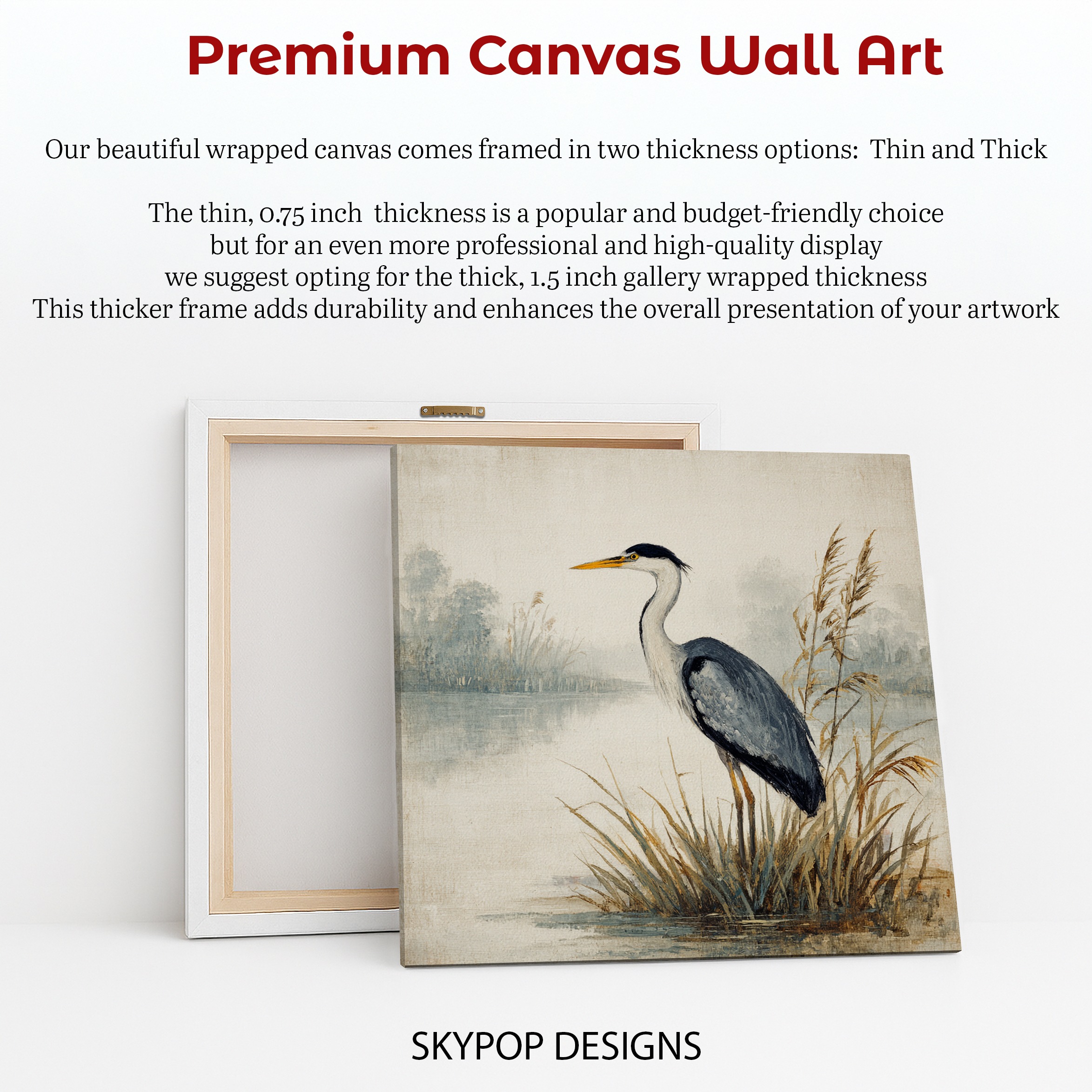 Bring the serene beauty of nature into your home with this stunning heron canvas wall art. This captivating piece showcases a majestic gray heron standing gracefully among reeds by a misty lake, perfect for creating a tranquil atmosphere in any room. The soft, muted color palette of blues, grays, and browns makes this poster ideal for coastal or rustic decor styles, effortlessly complementing modern interiors as well. Transform your living room, bedroom, or office into a peaceful retreat with this elegant bird art that celebrates the quiet moments in nature. The detailed brushwork captures the heron’s distinctive features and the delicate textures of the surrounding landscape, bringing depth and interest to your walls. This versatile canvas art adapts beautifully to various room sizes, making it a perfect focal point for a statement wall or a subtle addition to a gallery arrangement. Ideal as a thoughtful housewarming gift or a personal treat to elevate your home decor, this heron wall art invites a sense of calm and connection to the natural world. The high-quality printing ensures every nuance of the original artwork is preserved, from the misty background to the intricate feather details. Whether you’re a bird enthusiast or simply appreciate serene nature scenes, this heron canvas will be a cherished addition to your art collection. Enhance your living space with this timeless piece that brings the tranquility of lakeside life into your everyday environment.