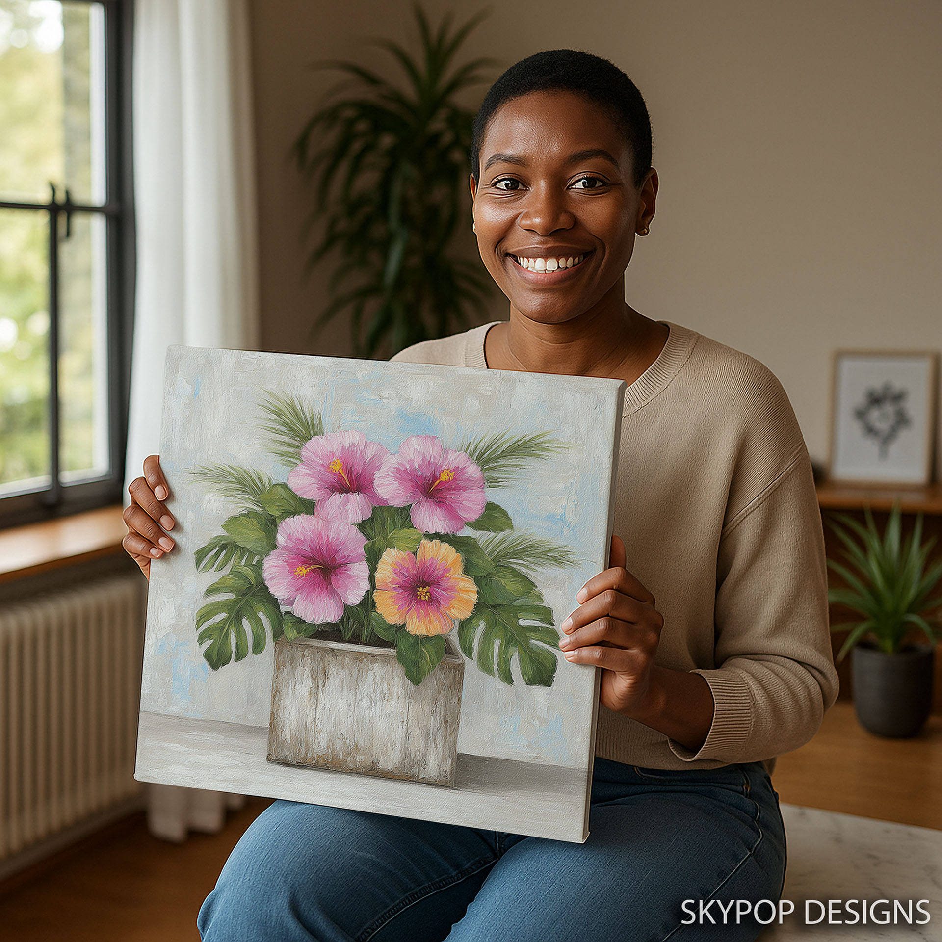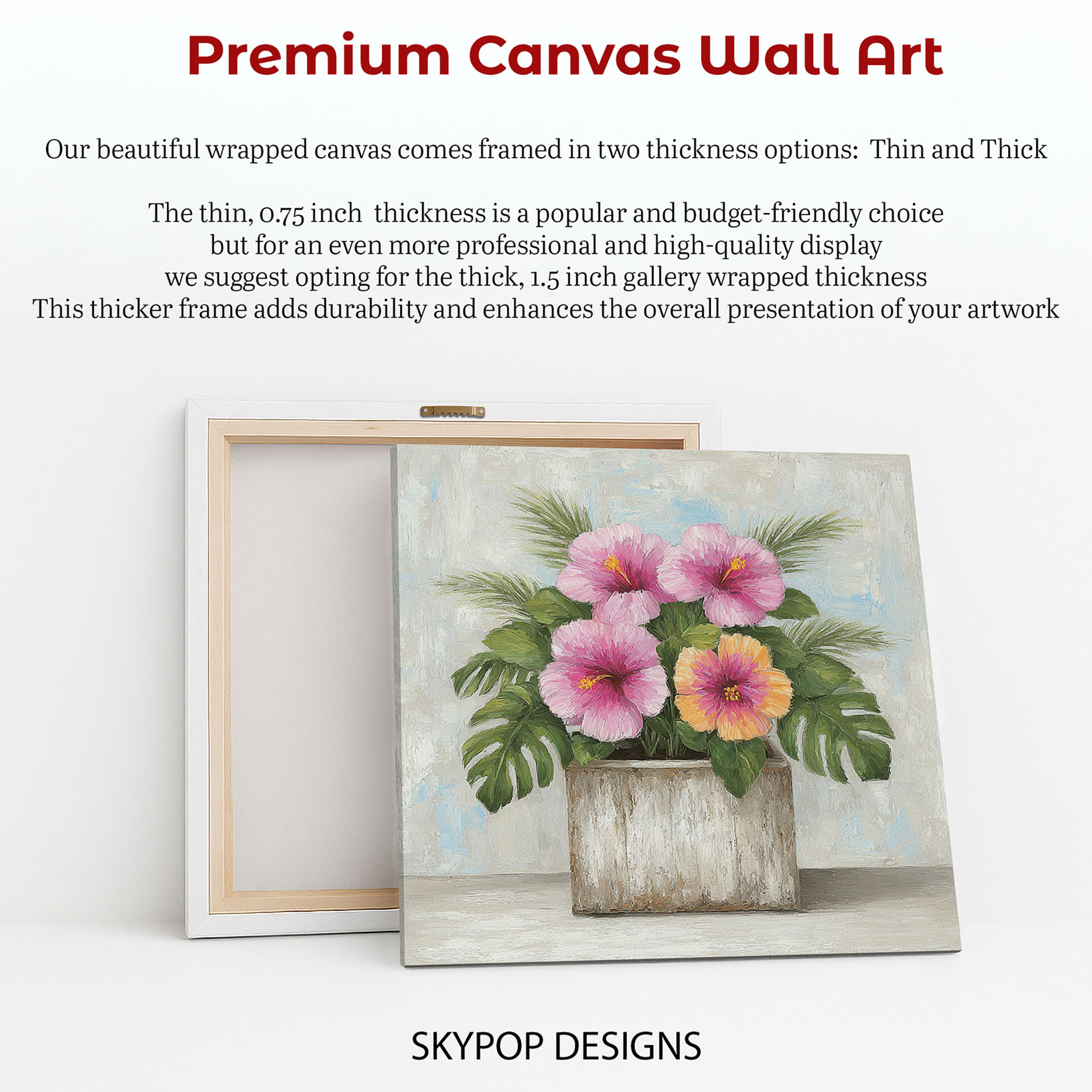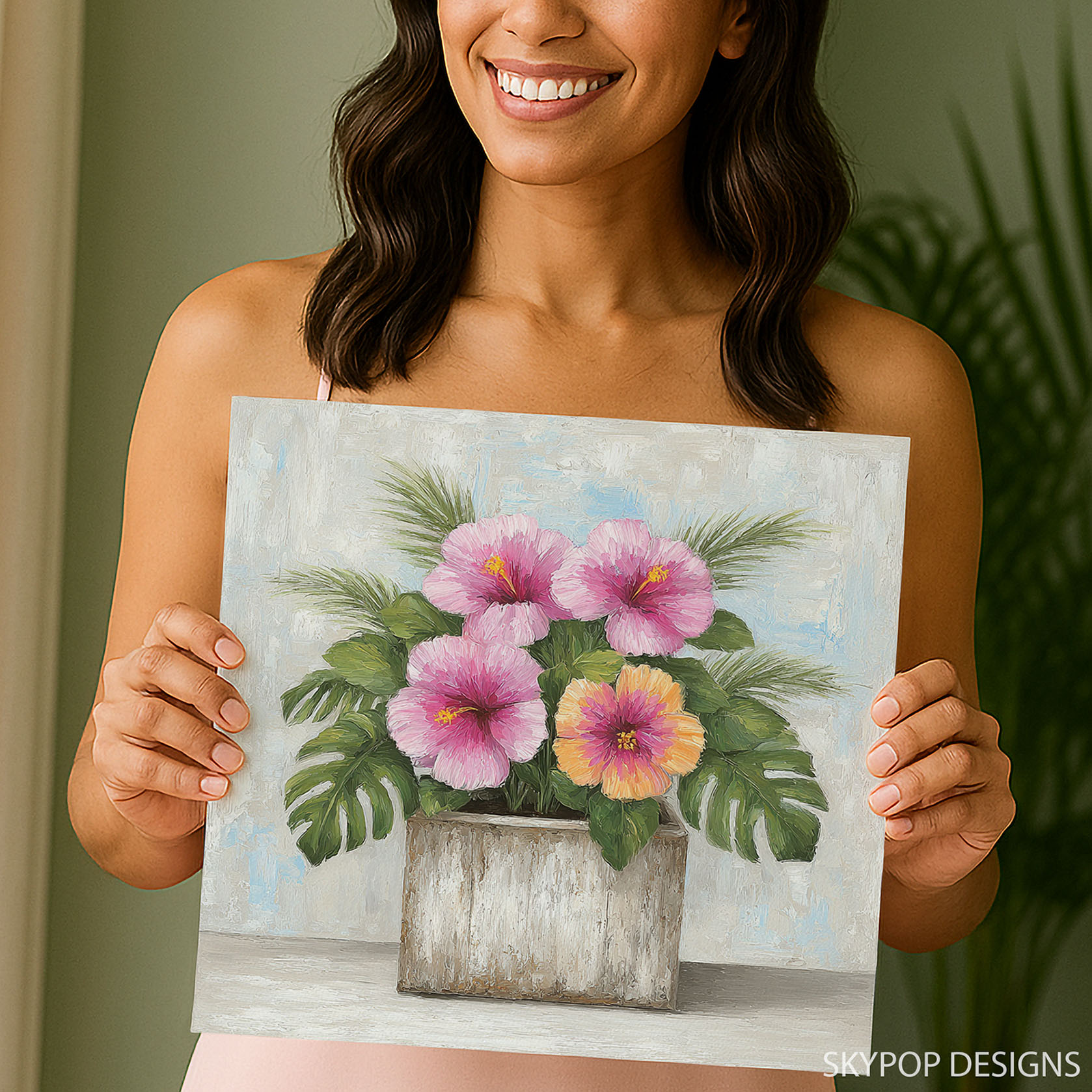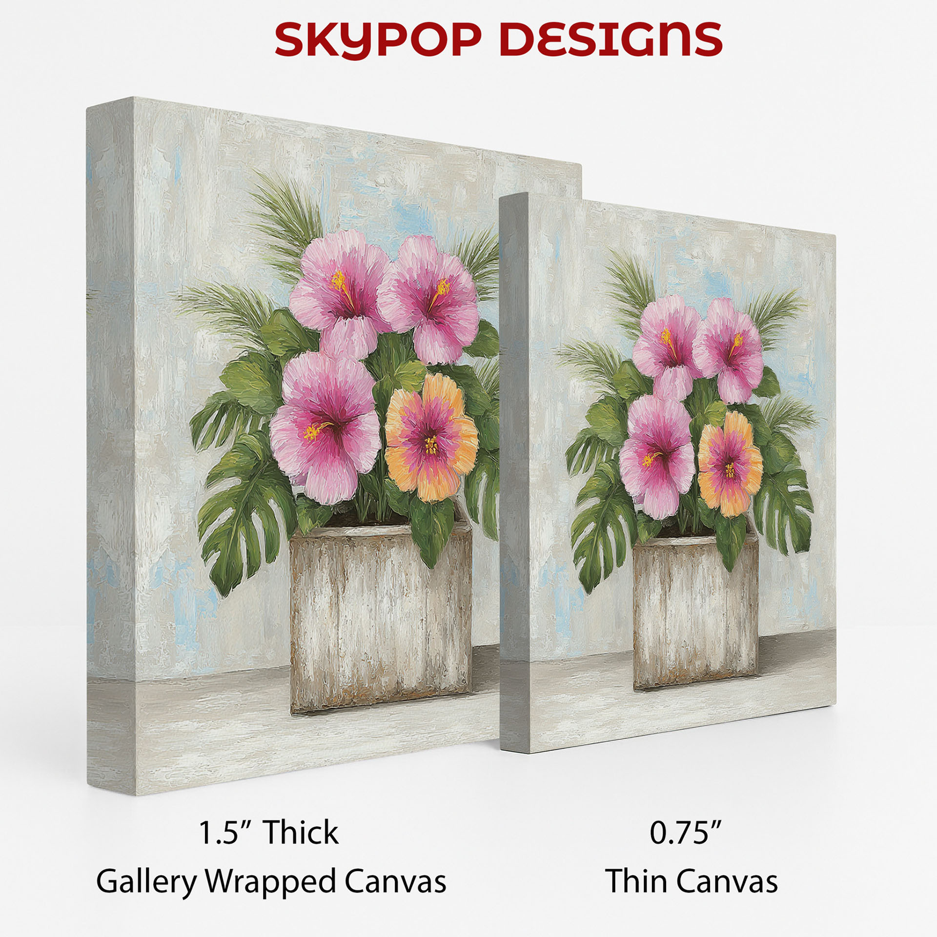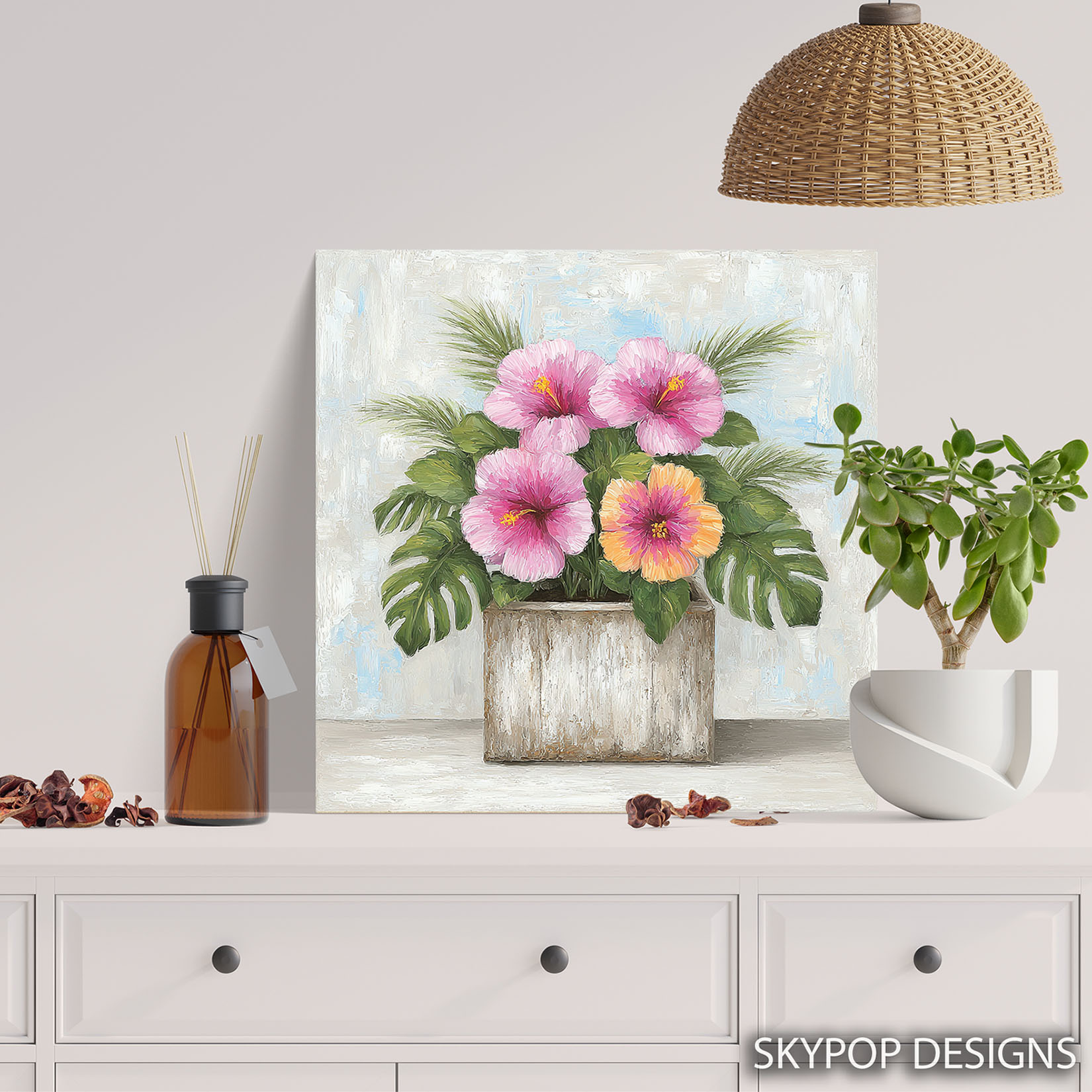 Brighten your home with this vibrant Hibiscus canvas wall art, showcasing beautiful tropical flowers in a contemporary style. This captivating poster or canvas wall art is perfect for transforming your living room into a coastal oasis or adding a touch of bohemian charm to your bedroom. The striking pink and orange hibiscus blooms, set against lush green foliage, bring a refreshing and uplifting mood to any space. This artwork is ideal for sunrooms or entryways, creating a warm and inviting atmosphere for guests. The textured brushstrokes add depth and a handmade feel, making this wall art a standout piece. Whether you’re looking for modern decor or a piece that evokes a tropical escape, this hibiscus canvas will inspire. The interplay of bright floral colors with the neutral tones of the planter and background creates a balanced and sophisticated aesthetic. High-quality printing ensures that every detail of the hibiscus flower and leaves is vividly rendered, bringing the beauty of nature indoors. This versatile floral art makes a wonderful gift for housewarmings, birthdays, or any occasion, offering a lasting splash of color and joy. Elevate your home decor with this stunning hibiscus poster, perfect for those who love floral wall art and want to create a vibrant, welcoming environment. Transform your space today with this timeless floral canvas wall art.