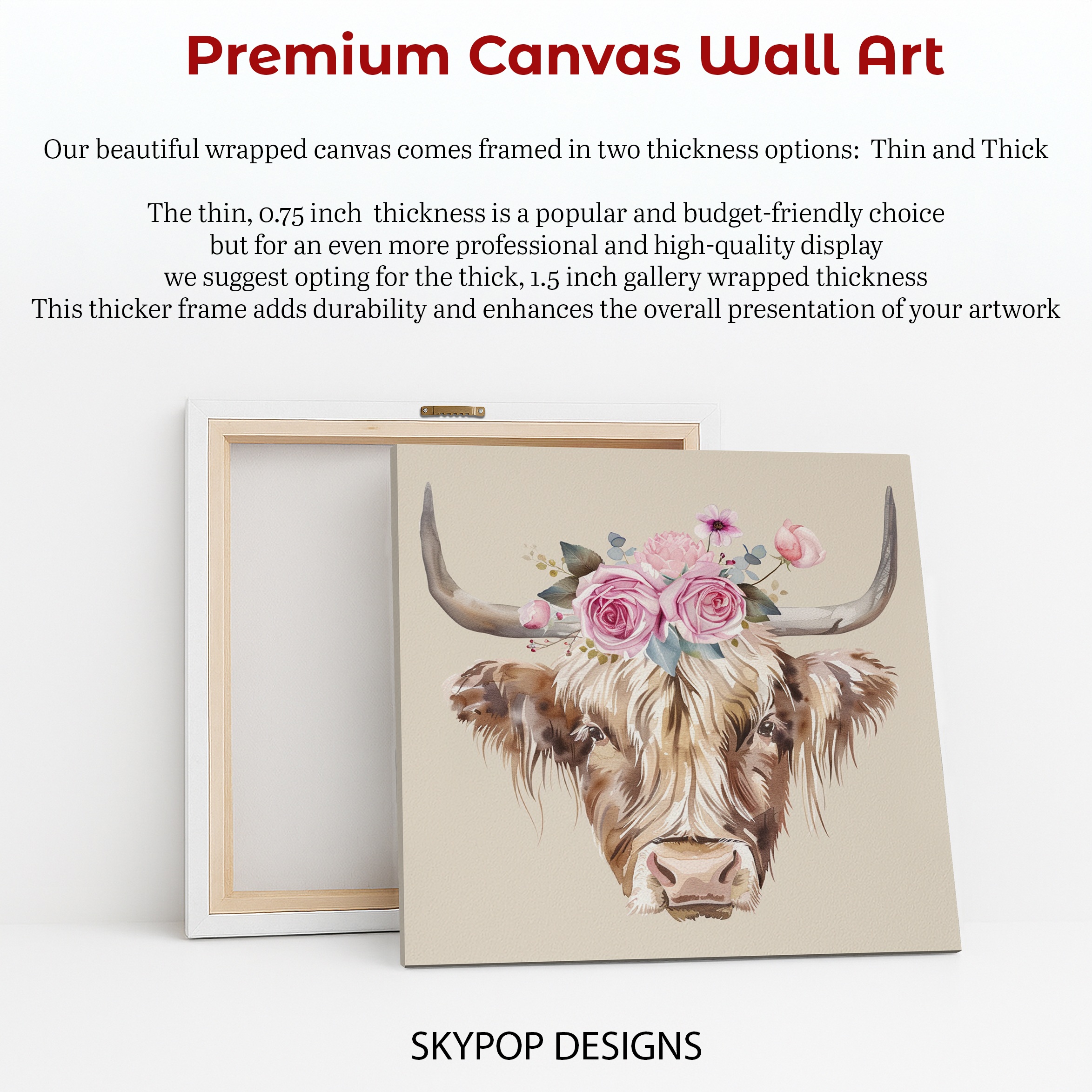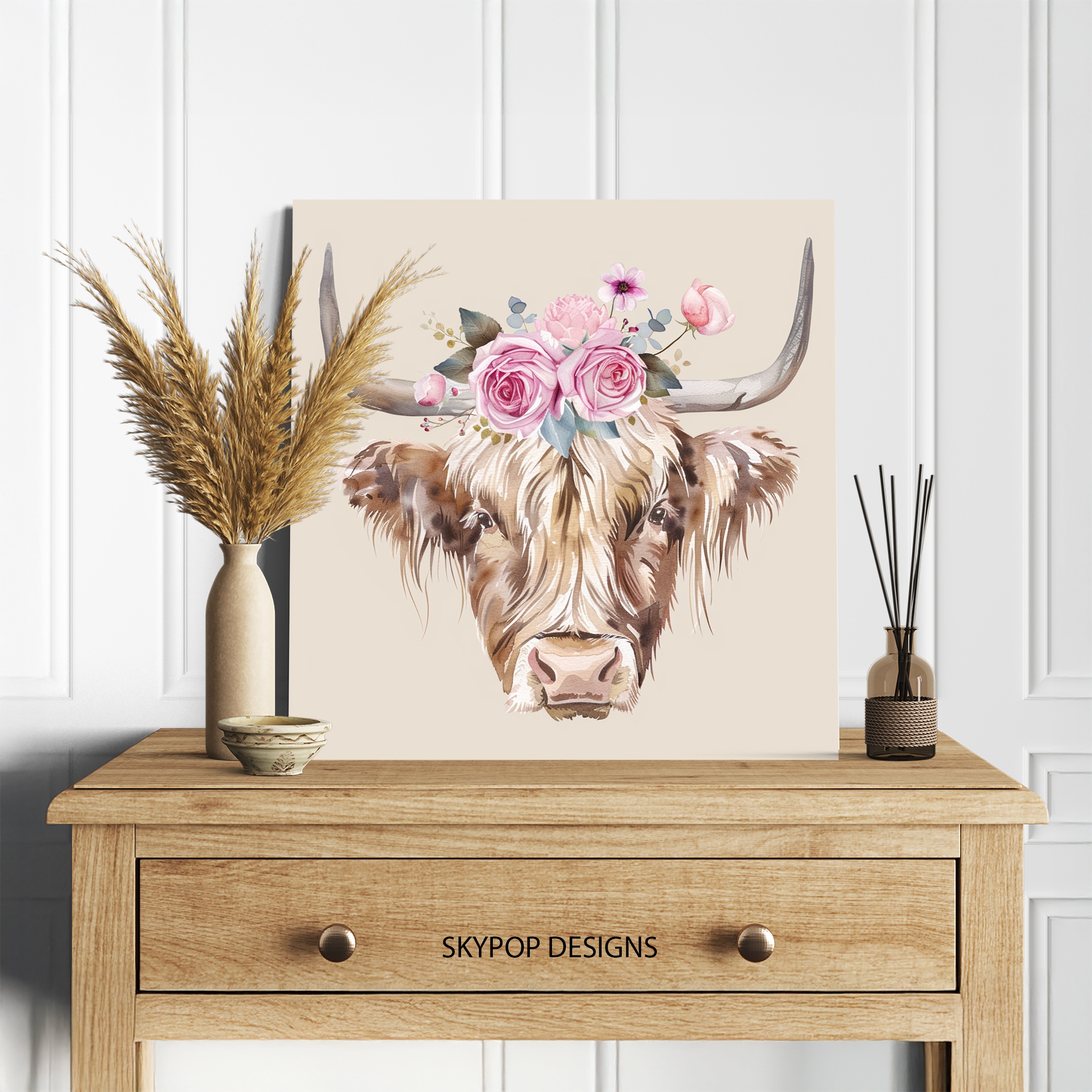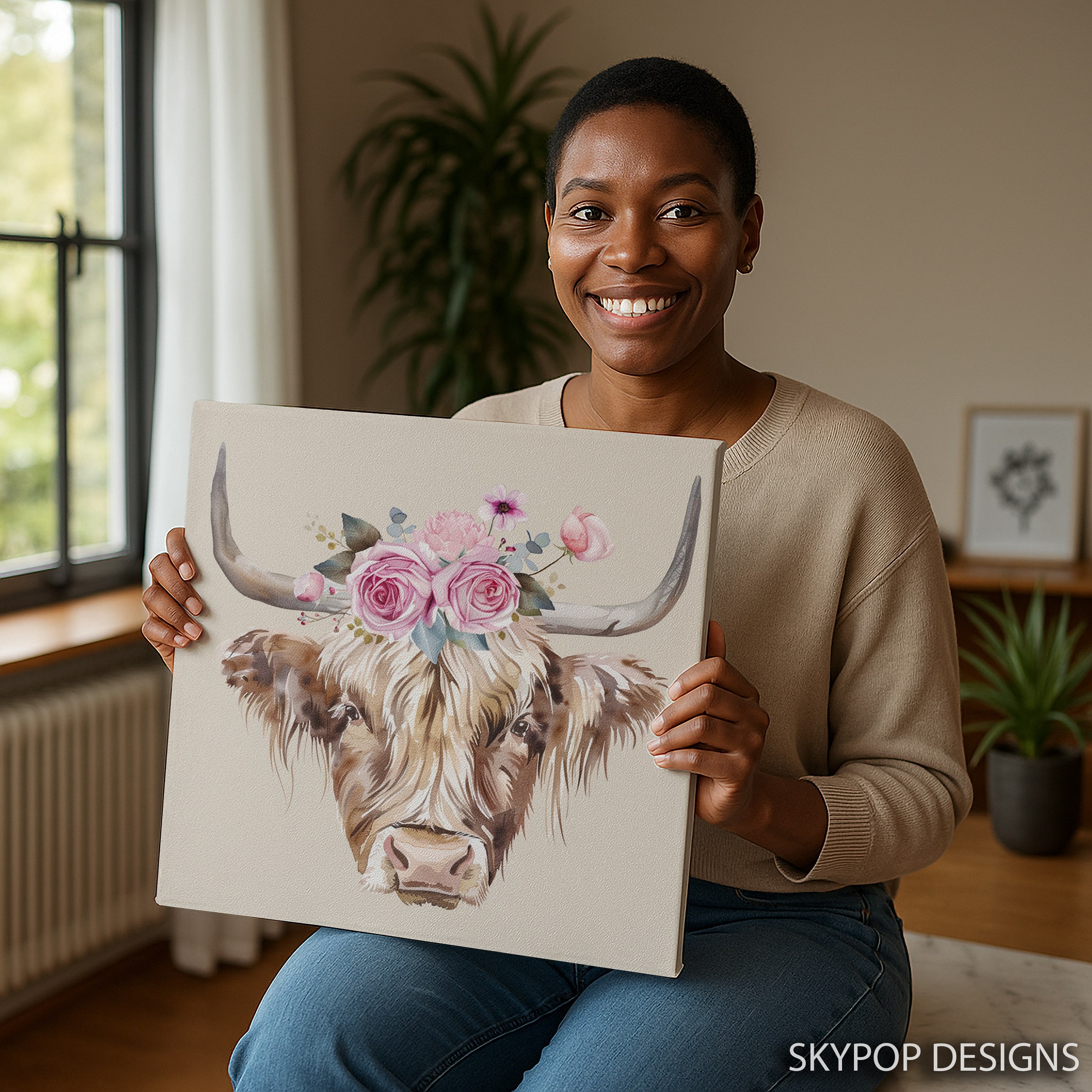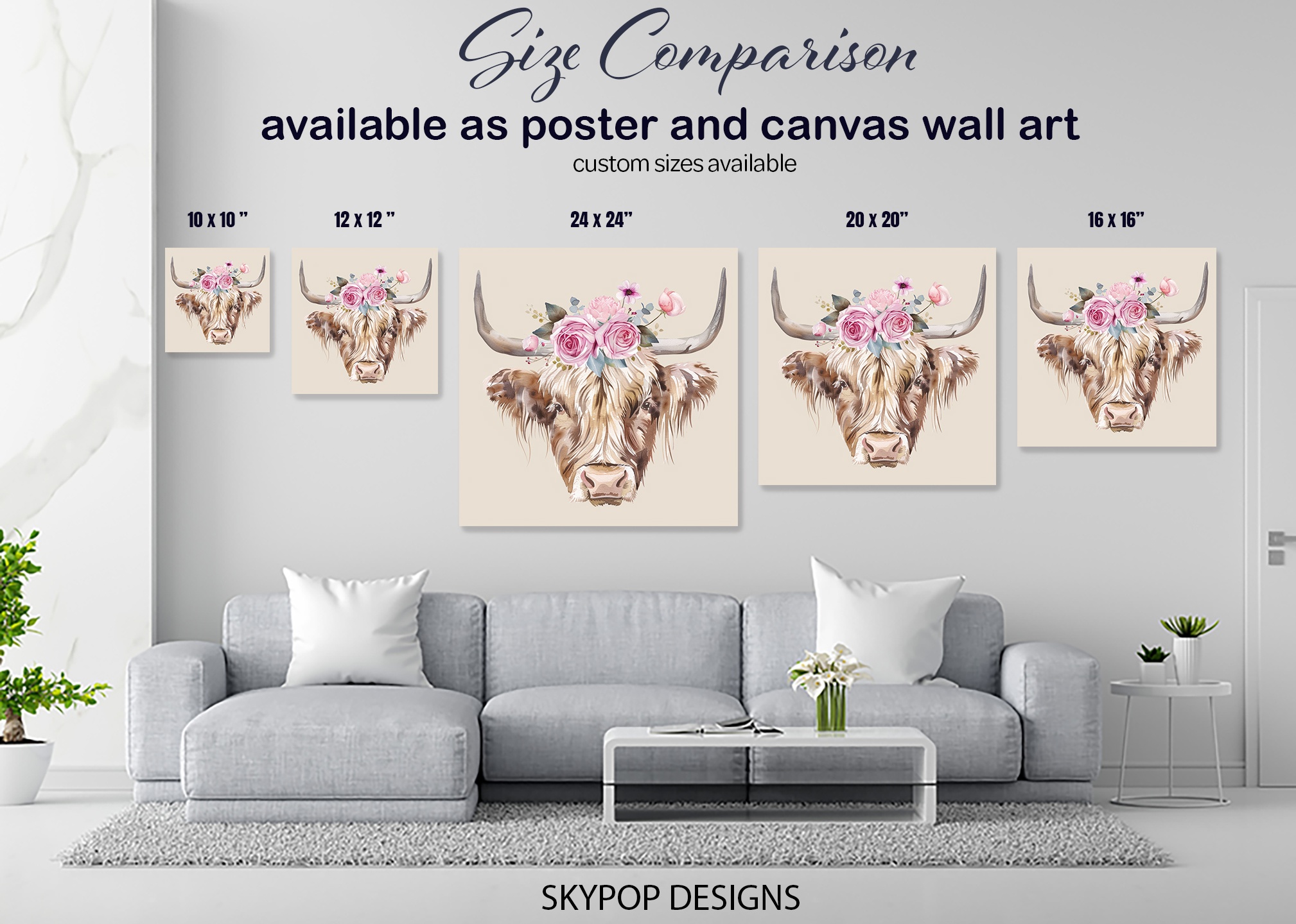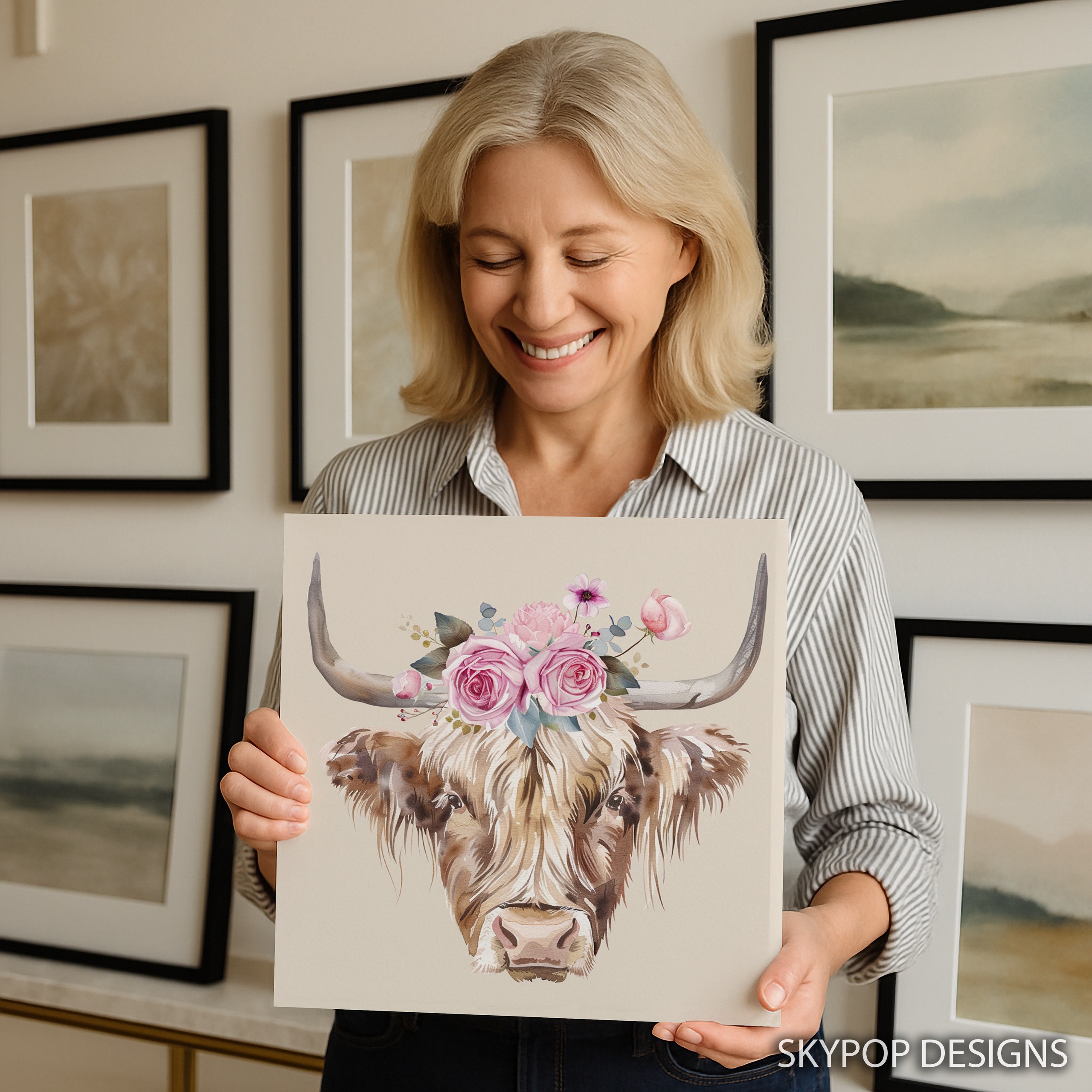 Bring a touch of whimsical charm to your space with this adorable Highland Cow canvas wall art. This eye-catching poster features a fluffy Highland Cow adorned with a beautiful pink flower crown, perfectly blending rustic farmhouse vibes with a soft, feminine touch. The stunning contrast between the cow’s shaggy brown fur and the delicate pink roses creates a captivating focal point for any room. Ideal for farmhouse-style living rooms, cozy bedrooms, or even a nature-inspired nursery, this versatile piece adds warmth and character to your walls. The gentle eyes of the Highland Cow seem to gaze directly at the viewer, creating an instant emotional connection. The muted color palette of browns, pinks, and subtle greens complements a wide range of decor styles, from bohemian to contemporary. This high-quality canvas art makes a perfect gift for animal lovers or anyone looking to add a unique conversation piece to their home. The intricate details of the flowers and fur are beautifully captured, ensuring this artwork looks stunning from any distance. Whether you’re creating a gallery wall or searching for that perfect statement piece, this Highland Cow poster brings the perfect blend of rustic charm and soft elegance. Transform your space today with this delightful and trendy animal art that celebrates the beauty of nature with a whimsical twist.
