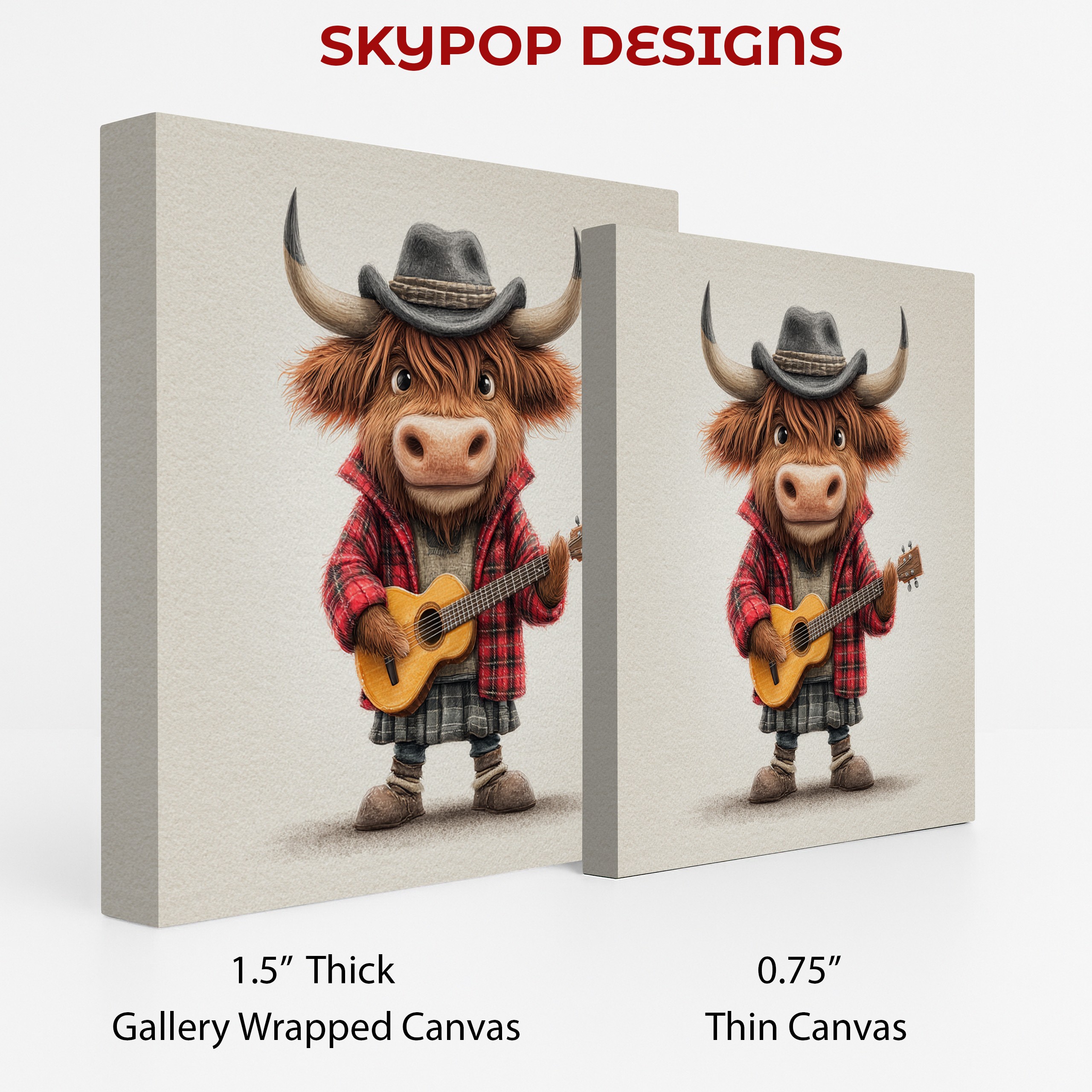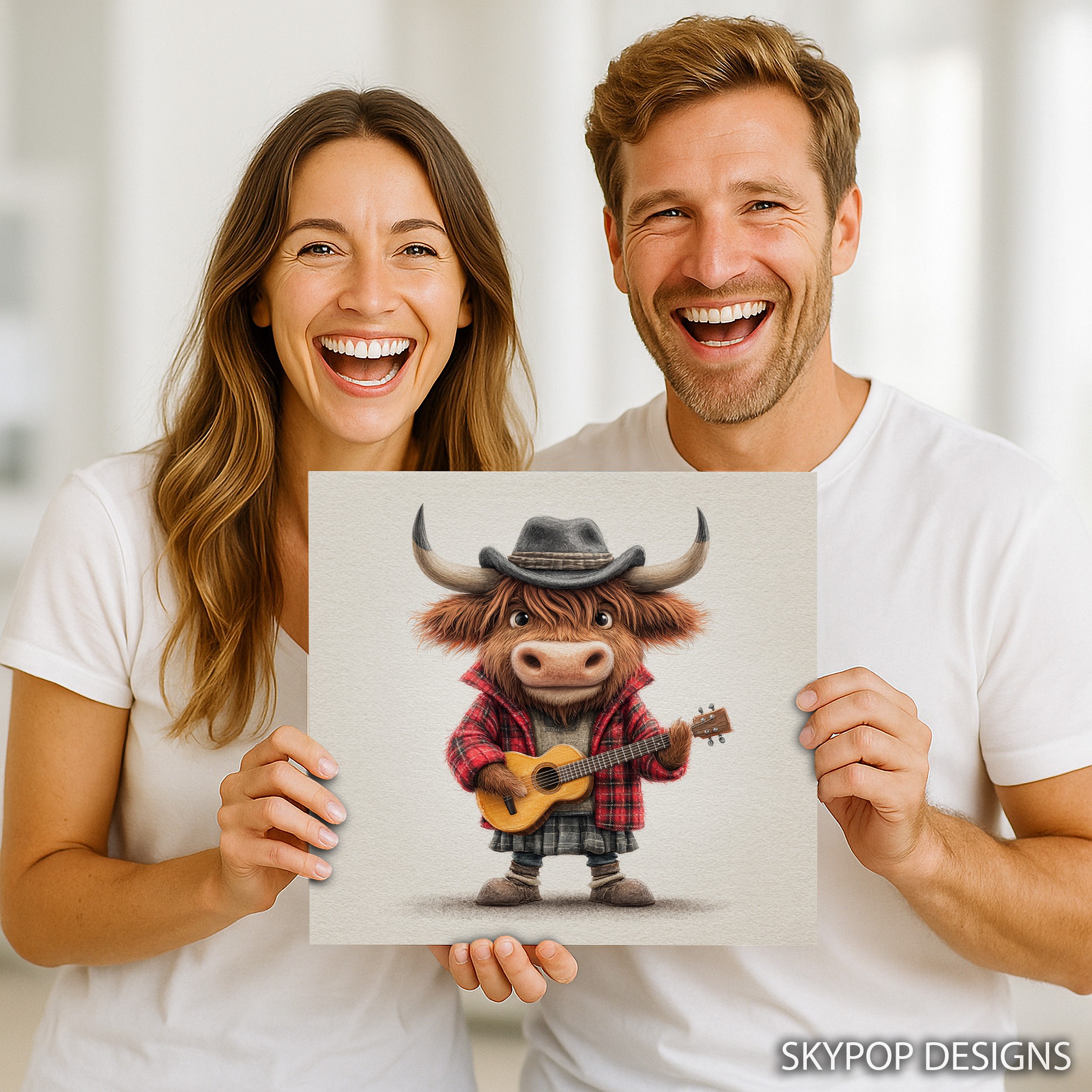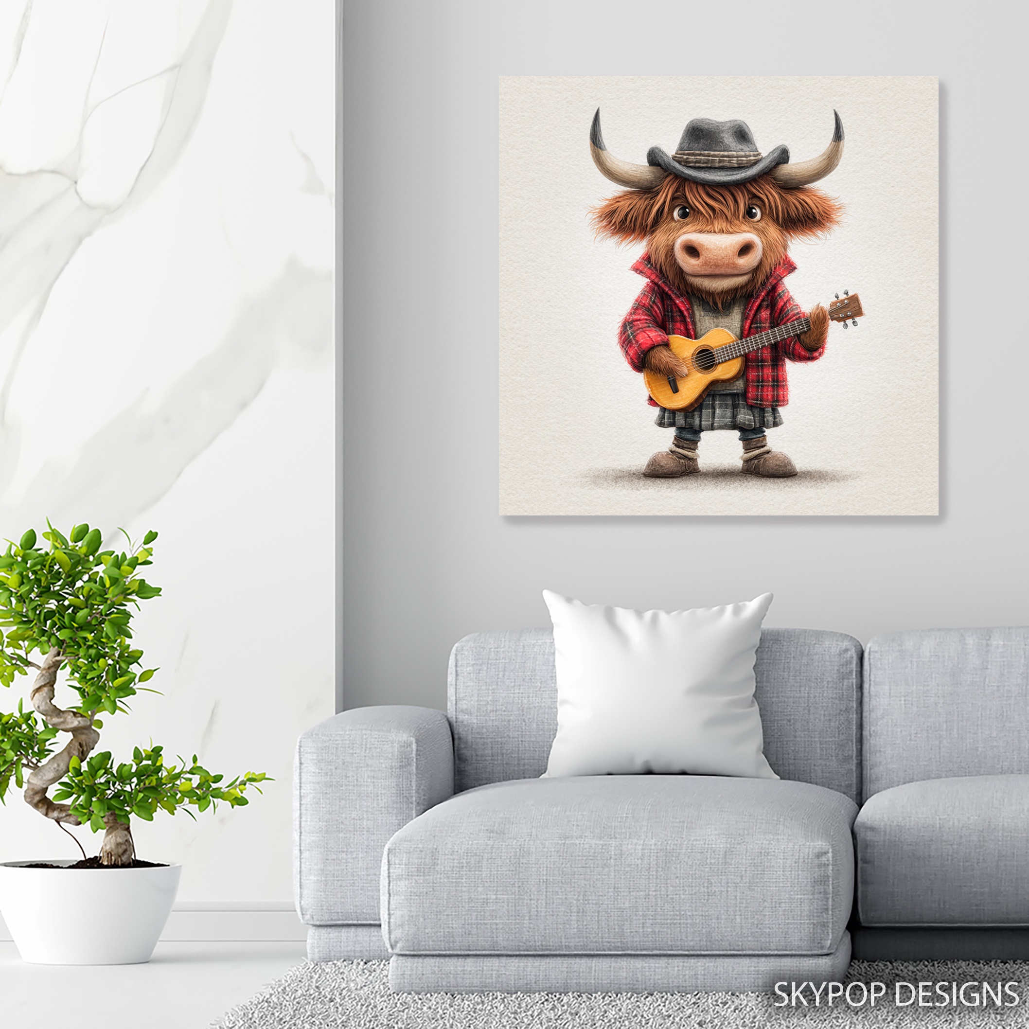 Bring a smile to your face with this charming Highland Cow canvas wall art featuring a musical bovine strumming a guitar. This whimsical poster combines rustic charm with contemporary flair, making it a perfect addition to country-inspired living rooms or playful children’s bedrooms. The adorable Highland Cow, donning a cowboy hat and red plaid shirt, exudes personality and warmth, instantly becoming a conversation starter in any space. The vibrant colors and detailed textures bring this unique character to life, creating a focal point that draws the eye and lifts the mood. Ideal for music lovers and animal enthusiasts alike, this canvas wall art celebrates the joy of creativity and the quirky side of country living. The artwork’s versatile style complements both modern and traditional decor, adding a touch of humor to home offices or game rooms. High-quality printing captures every hair of the cow’s shaggy coat and the rich wood grain of the guitar, ensuring this piece looks stunning from any angle. Whether you’re looking for a fun housewarming gift or want to inject some personality into your own space, this Highland Cow guitarist poster delivers smiles and style in equal measure. Transform your walls with this delightful blend of animal art and musical motif that’s sure to be a hit with guests of all ages. Elevate your home’s atmosphere with this unique, feel-good artwork today!