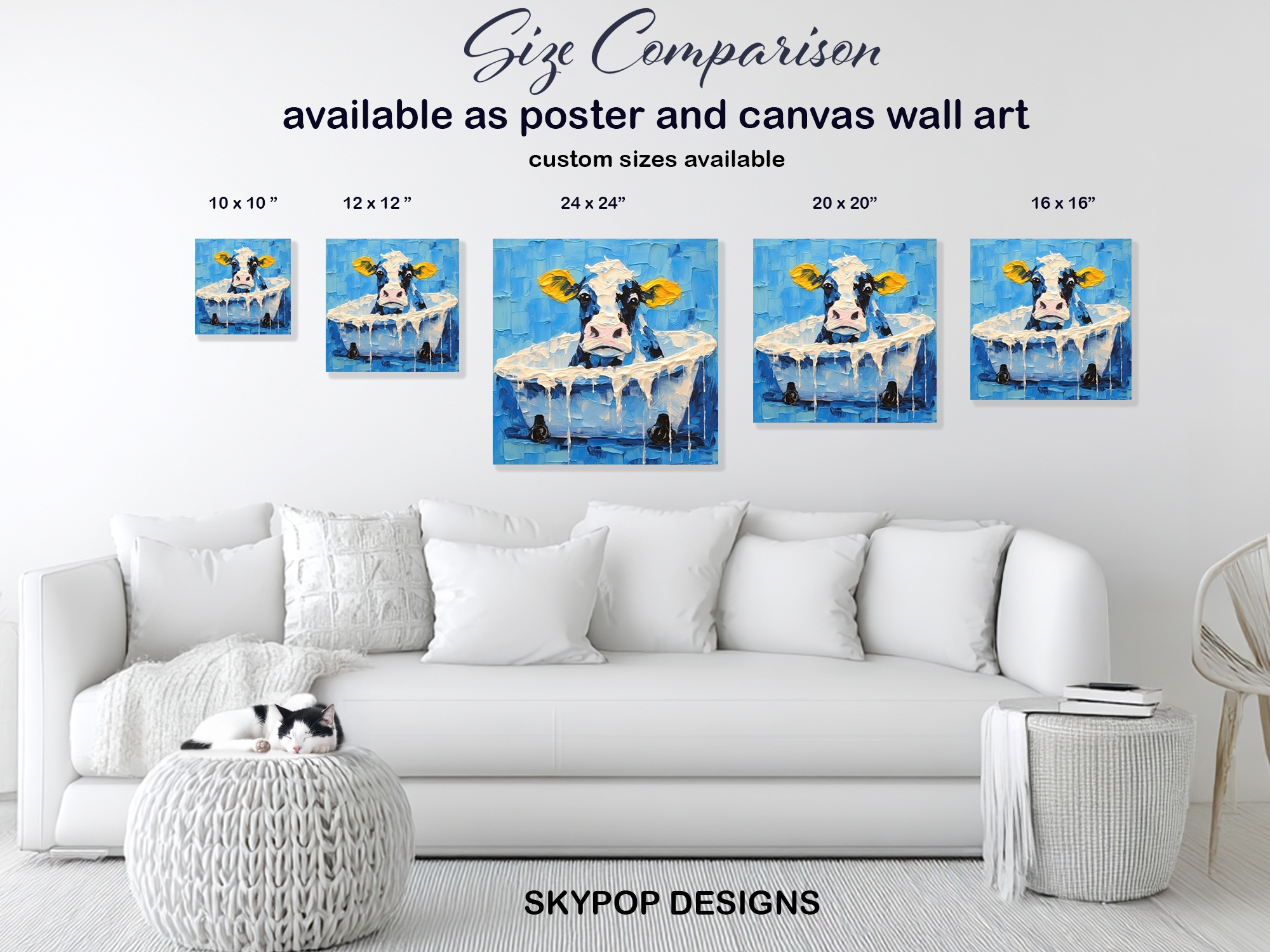 Transform your home with this charming cow canvas wall art, featuring a delightful highland cow enjoying a bubbly bath. This vibrant poster captures a whimsical moment, perfect for adding a touch of fun to any space. The bold, impasto style painting technique creates a striking visual texture that will elevate your home decor. This unique animal art is ideal for bathrooms, kitchens, or as a playful accent in a living room or children’s room. The cool blue tones combined with the creamy whites and the cow’s classic black and white markings evoke a sense of calm and lightheartedness. This captivating piece of wall art adds personality and charm, making it a wonderful conversation starter. Whether you’re a lover of farm animals or simply appreciate quirky art, this canvas print brings joy and character. It’s a perfect gift for housewarmings or birthdays, bringing a fresh feel to modern homes. Experience the delightful texture and lively colors of this exceptional highland cow artwork. Showcase your unique style and transform your walls with this eye-catching poster. Embrace the fun and freshness this piece brings to your everyday surroundings. Elevate your decor with this unique and charming cow wall art today.