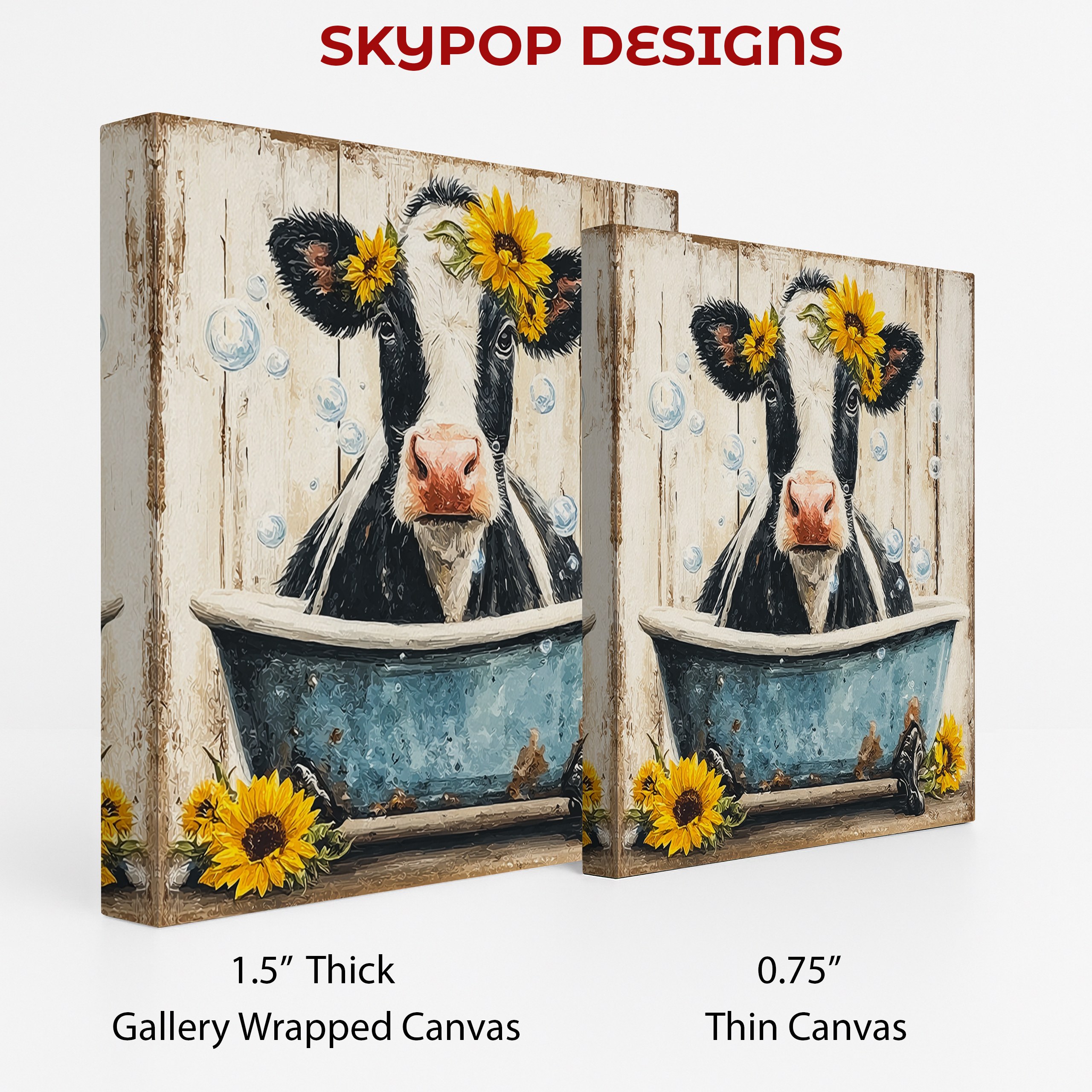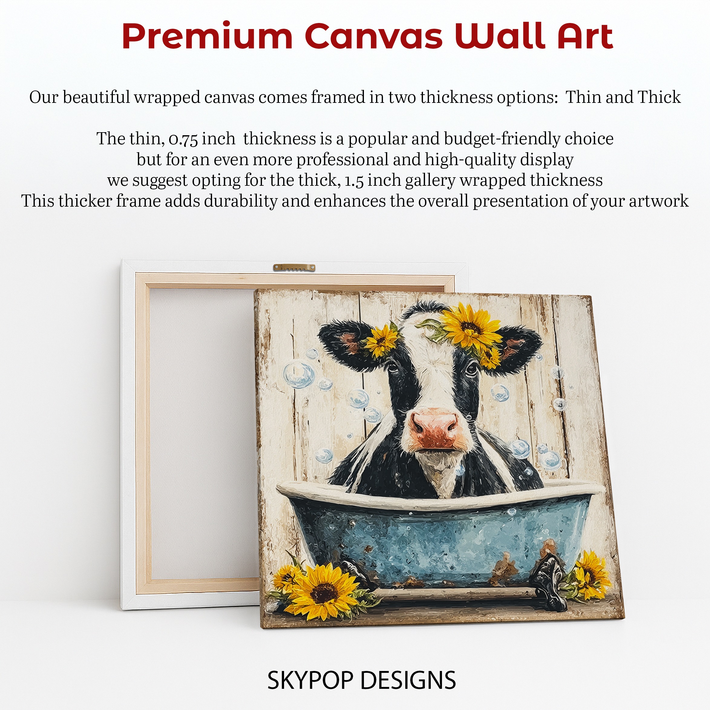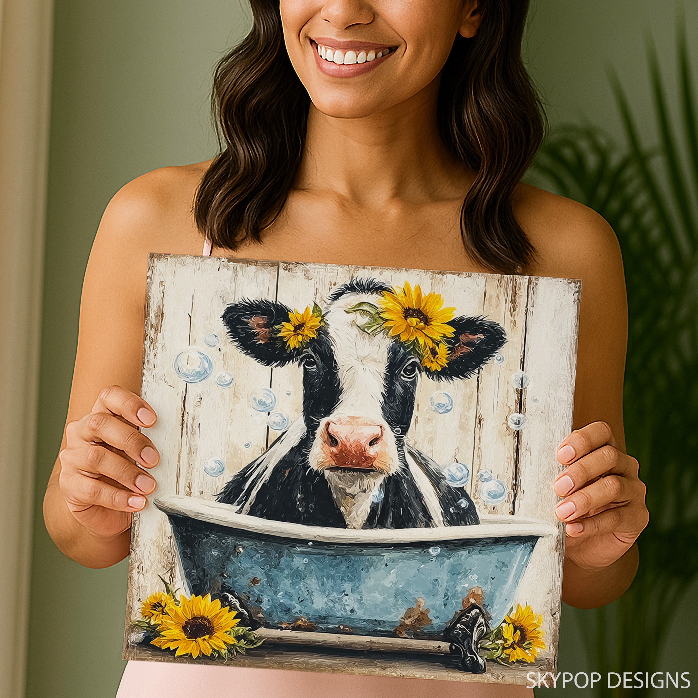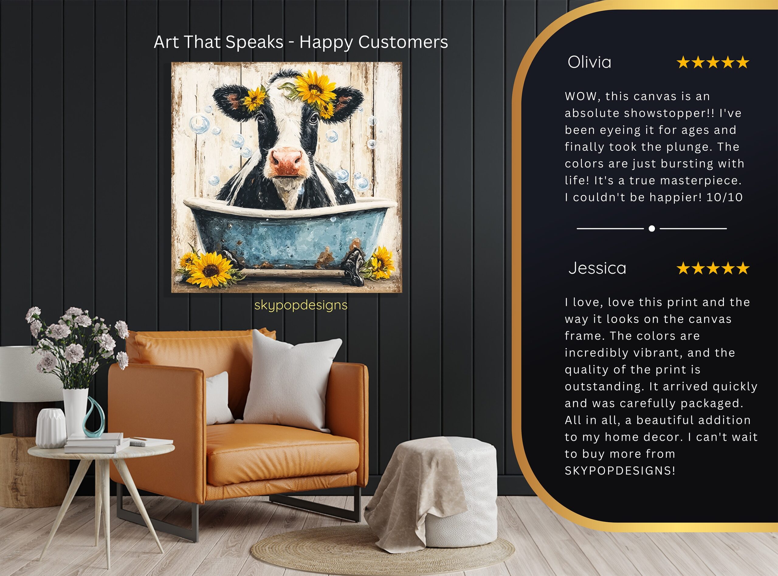 Relax and unwind with this charming cow canvas wall art, perfect for adding a touch of farmhouse whimsy to your home. This delightful poster features a sweet Highland cow enjoying a bubbly bath, adorned with cheerful sunflowers. The vibrant colors and rustic aesthetic of this canvas wall art instantly transform any space into a cozy sanctuary. It’s an ideal piece of animal art to elevate your bathroom decor, kitchen walls, or bring a smile to your living room. The combination of the endearing cow and bright sunflowers creates a joyful and uplifting atmosphere, embodying the spirit of country living. This captivating artwork, whether as a poster or a premium canvas print, introduces a heartwarming element to your interior design. It’s a perfect housewarming gift or a delightful present for anyone who appreciates farm-inspired decor and unique wall art. The high-quality printing ensures the intricate details and lively colors of this cow poster stand out. Celebrate rustic charm and add a splash of playful elegance to your home with this striking canvas wall art. This special cow artwork is sure to become a beloved addition to your collection that brings warmth and character. Elevate your home’s ambiance with this unique blend of nature art and country charm that captures everyday joy. Bring this delightful cow to your wall art collection today.