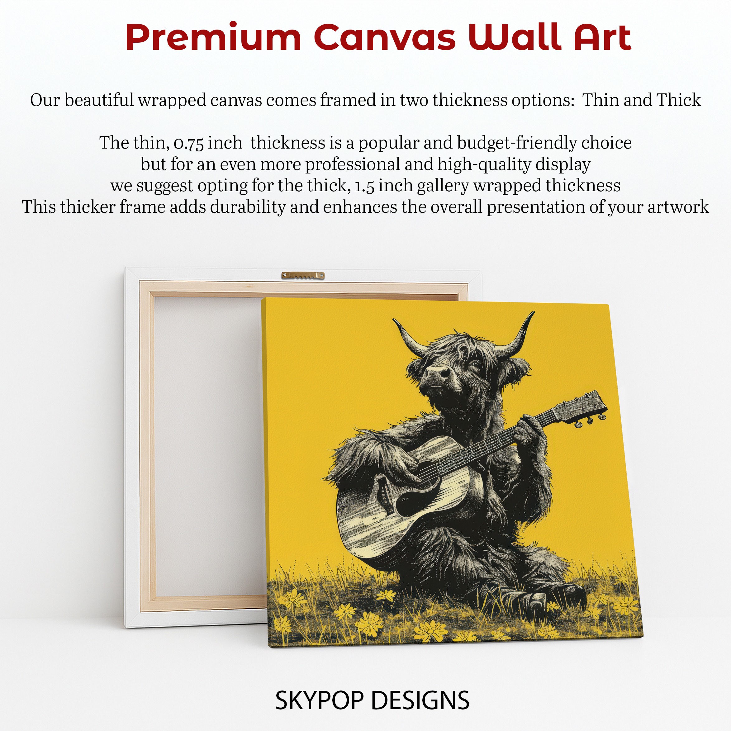 Transform your space with this unique Highland Cow canvas wall art, featuring a shaggy Highland Cow playing a guitar. This captivating poster brings a whimsical touch to any room, perfect for creating a focal point in your living room or adding personality to your bedroom. The striking black and white illustration against a vibrant yellow background makes this piece of Animal Art truly pop, ideal for rustic or farmhouse decor styles. It’s a fantastic conversation starter and a great gift for music lovers or anyone who appreciates charming animal illustrations. This Highland Cow artwork evokes a sense of joy and creativity, making it a wonderful addition to your collection of wall art. The vintage-inspired artistic style adds a timeless appeal, ensuring this print enhances your home’s aesthetic. Whether you’re looking to elevate your entryway or add character to a cozy craft room, this print delivers. High-quality printing makes this canvas wall art a lasting piece of decor. Add a touch of playful charm and nature-inspired art to your home. Get this stunning Highland Cow art to brighten your walls today.
