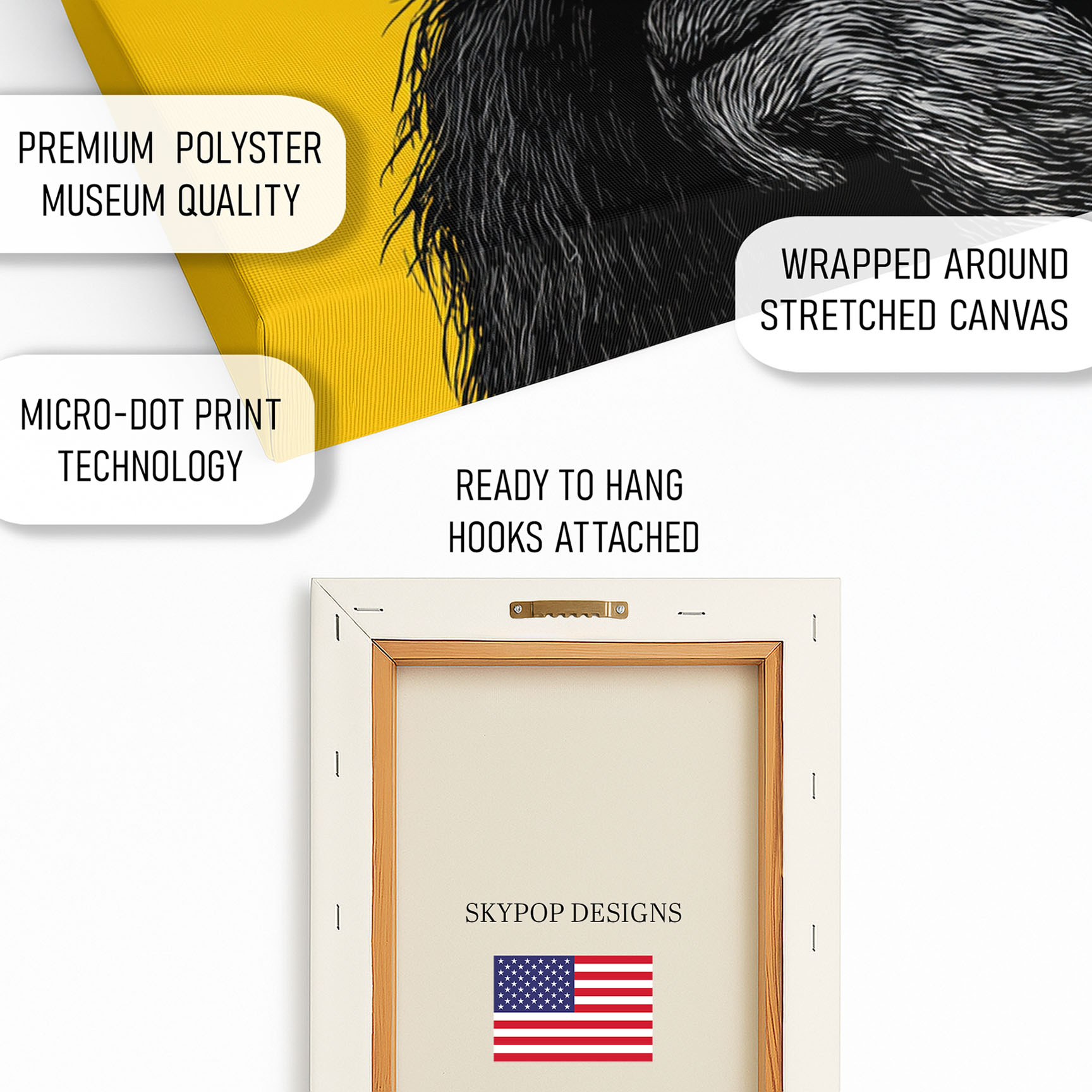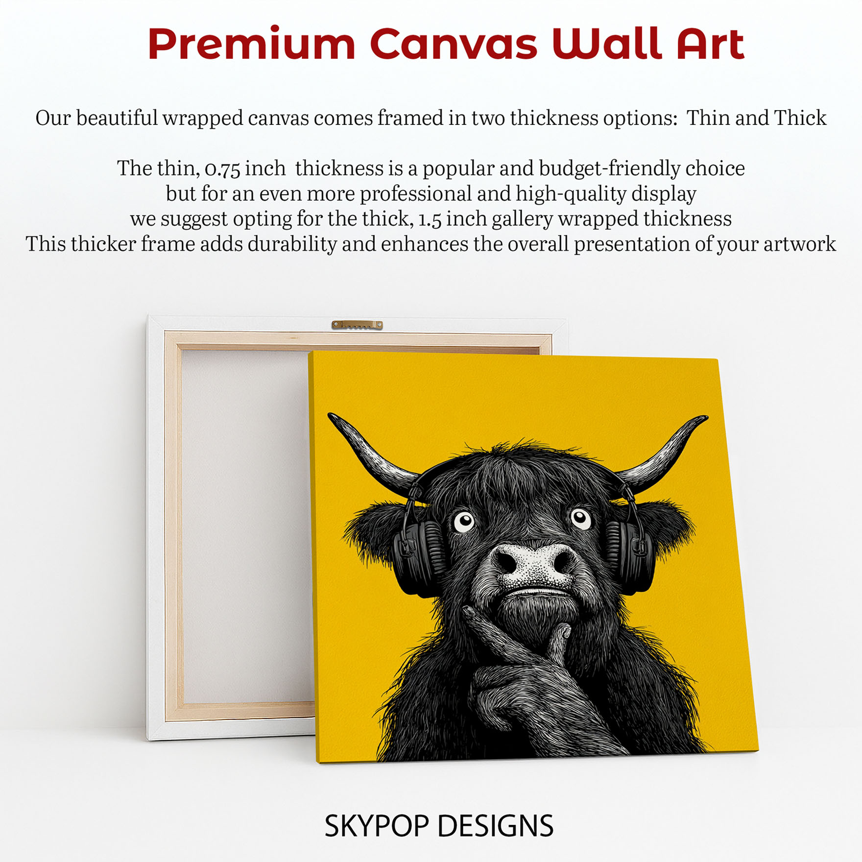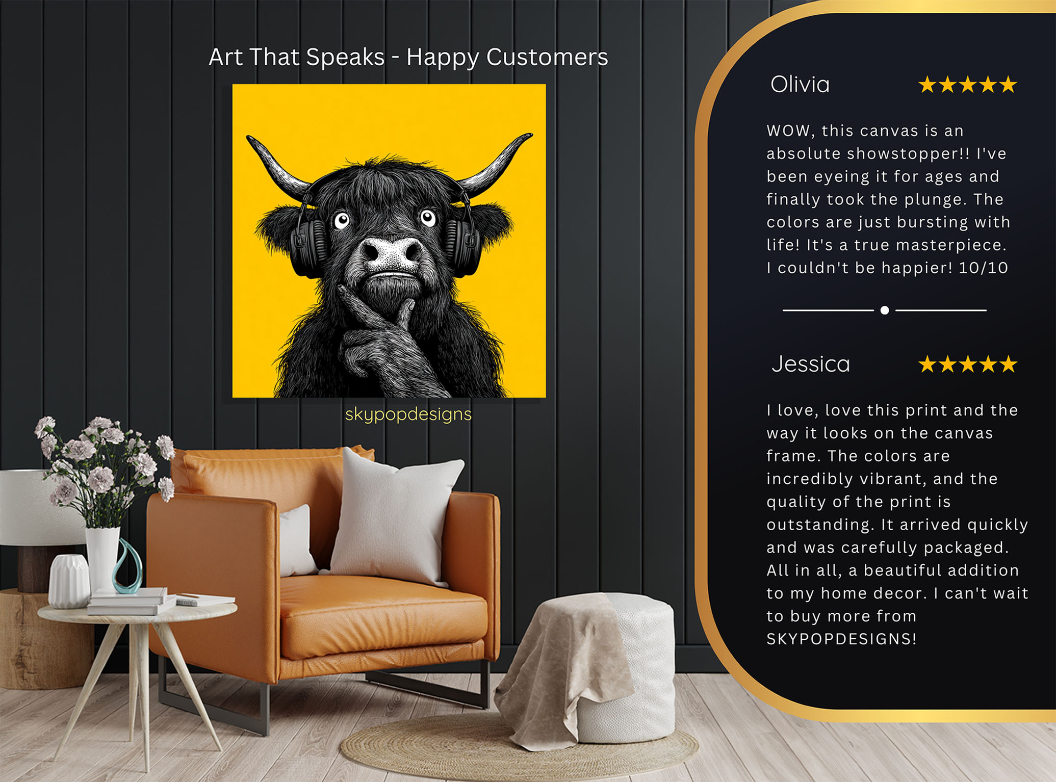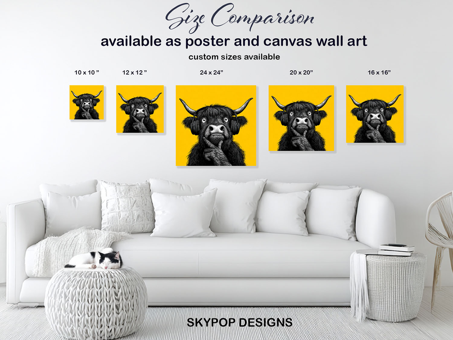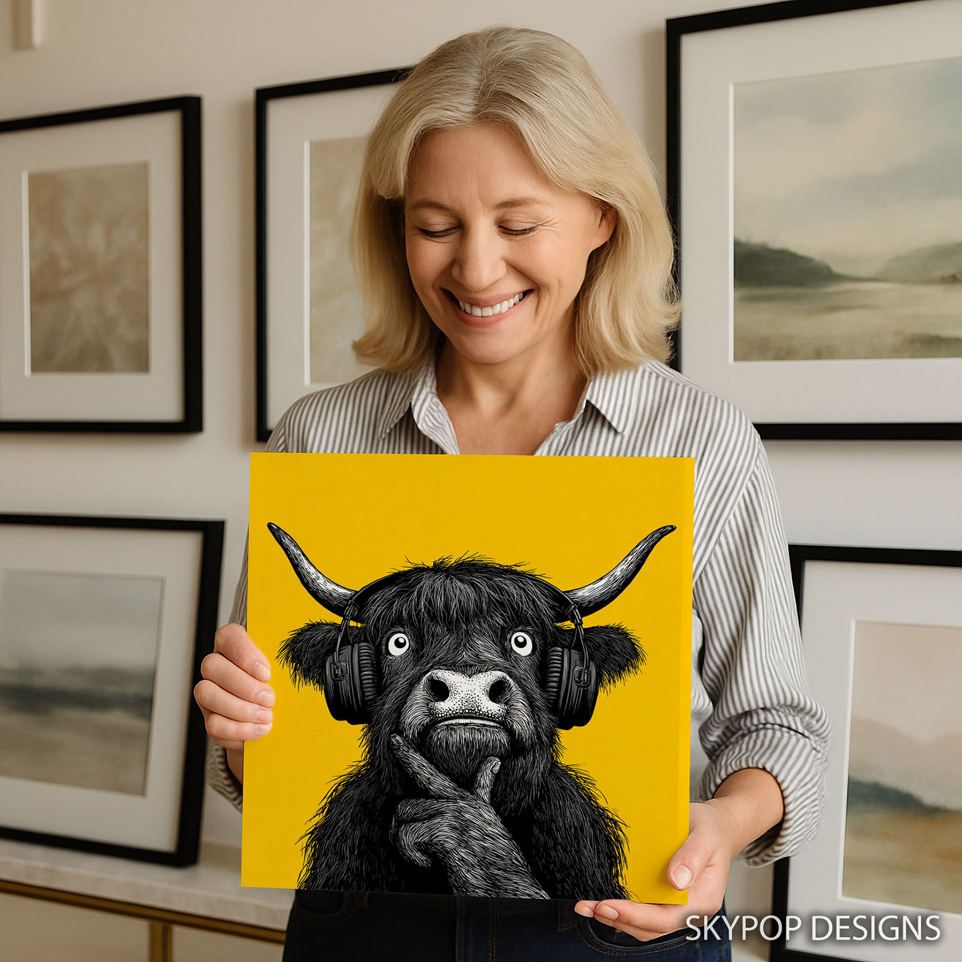 Highland Cow DJ Art, Canvas or Poster, Graphic Pop Art, Modern Bohemian Decor, Living Room Game Room Office Kitchen Wall Art, Yellow Black and White
