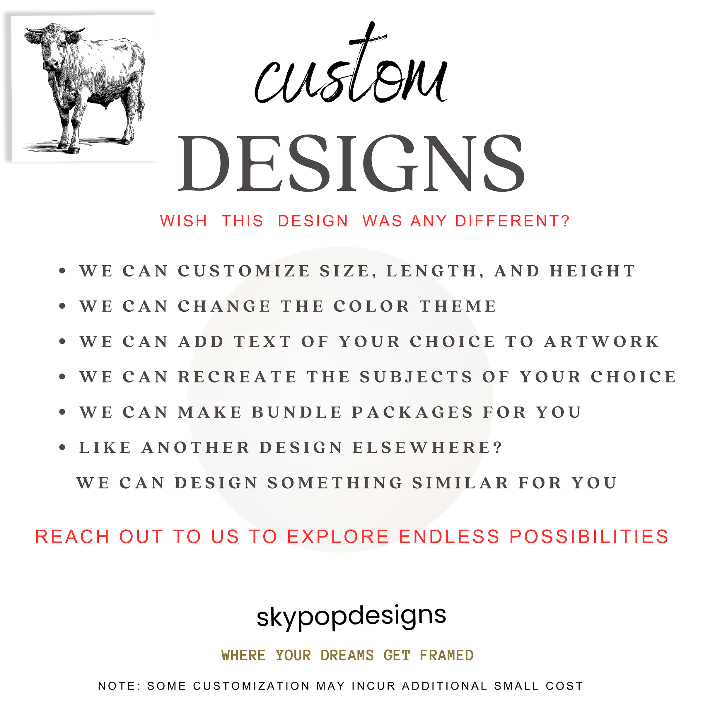 Looking for a custom design, or do you love a particular design but need it in a different size or orientation? Perhaps you’ve found a design elsewhere and wish for us to create something similar for you? Drop us a message! We’re dedicated to meeting your needs and will work closely with you to ensure your vision comes to life.