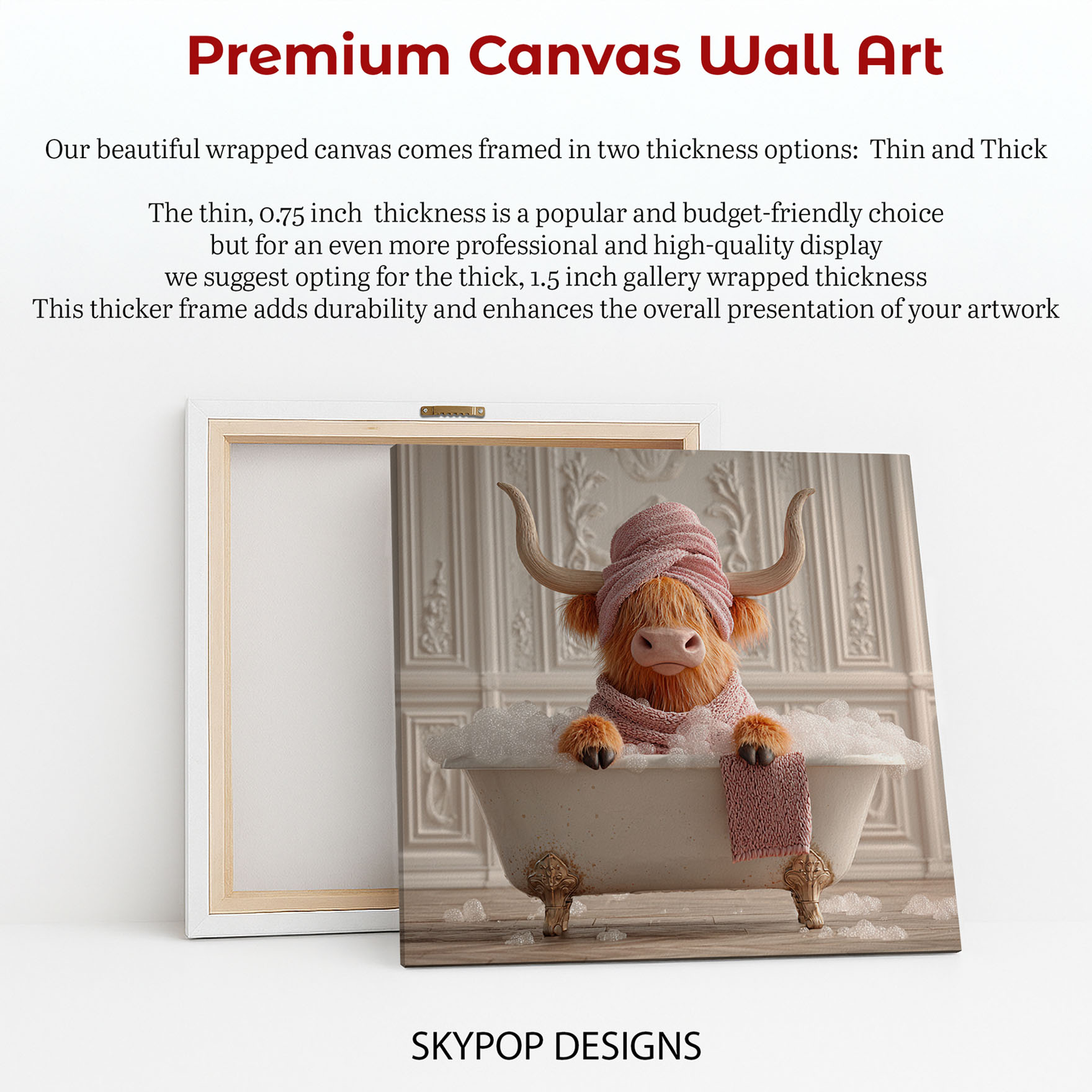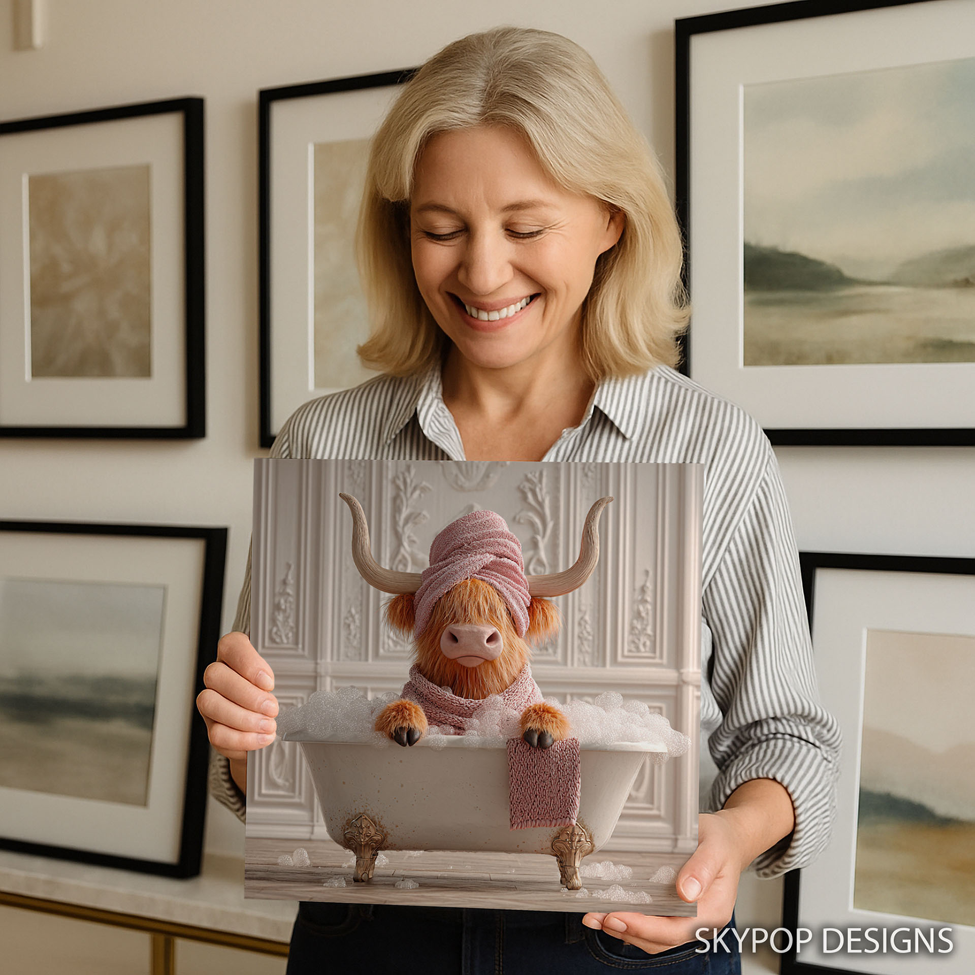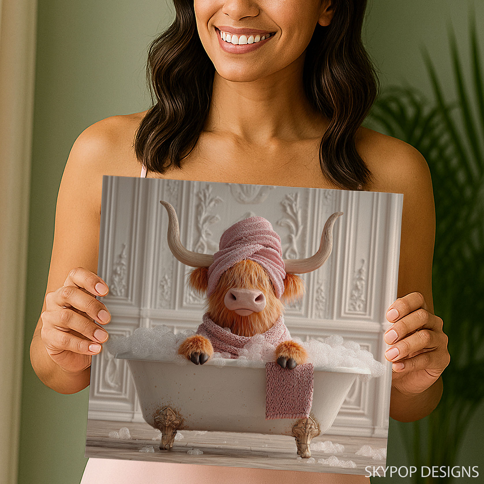 Transform your sanctuary with charming Highland Cow canvas wall art that exudes whimsy and comfort. This delightful poster or canvas wall art brings a unique touch of personality to any space, perfect for creating a relaxing bathroom ambiance or a cozy bedroom retreat. The soft pink hues and warm brown tones of the Highland Cow, wrapped in a fluffy towel, evoke a sense of tranquility and self-care. This artwork is ideal for farmhouse and shabby chic decor styles, adding a heartwarming element to your home. Its playful yet sophisticated design makes it a wonderful conversation piece for living rooms or children’s rooms, bringing smiles and joy to all who see it. The detailed rendering of the fur and bubbles makes this canvas wall art a captivating visual experience. This Highland Cow artwork is not just decor; it’s a statement of comfort and self-indulgence, embodying the simple pleasures of a spa day. Available in various sizes, this print or canvas wall art seamlessly integrates into any room size, from small powder rooms to spacious master suites. It makes a fantastic gift for housewarmings, birthdays, or holidays, especially for animal lovers and those who appreciate unique wall decor. Elevate your home with this heartwarming and charming Highland Cow wall art, a perfect blend of nature’s charm and cozy relaxation. Bring this delightful scene to life on your walls today and embrace the cozy vibes.