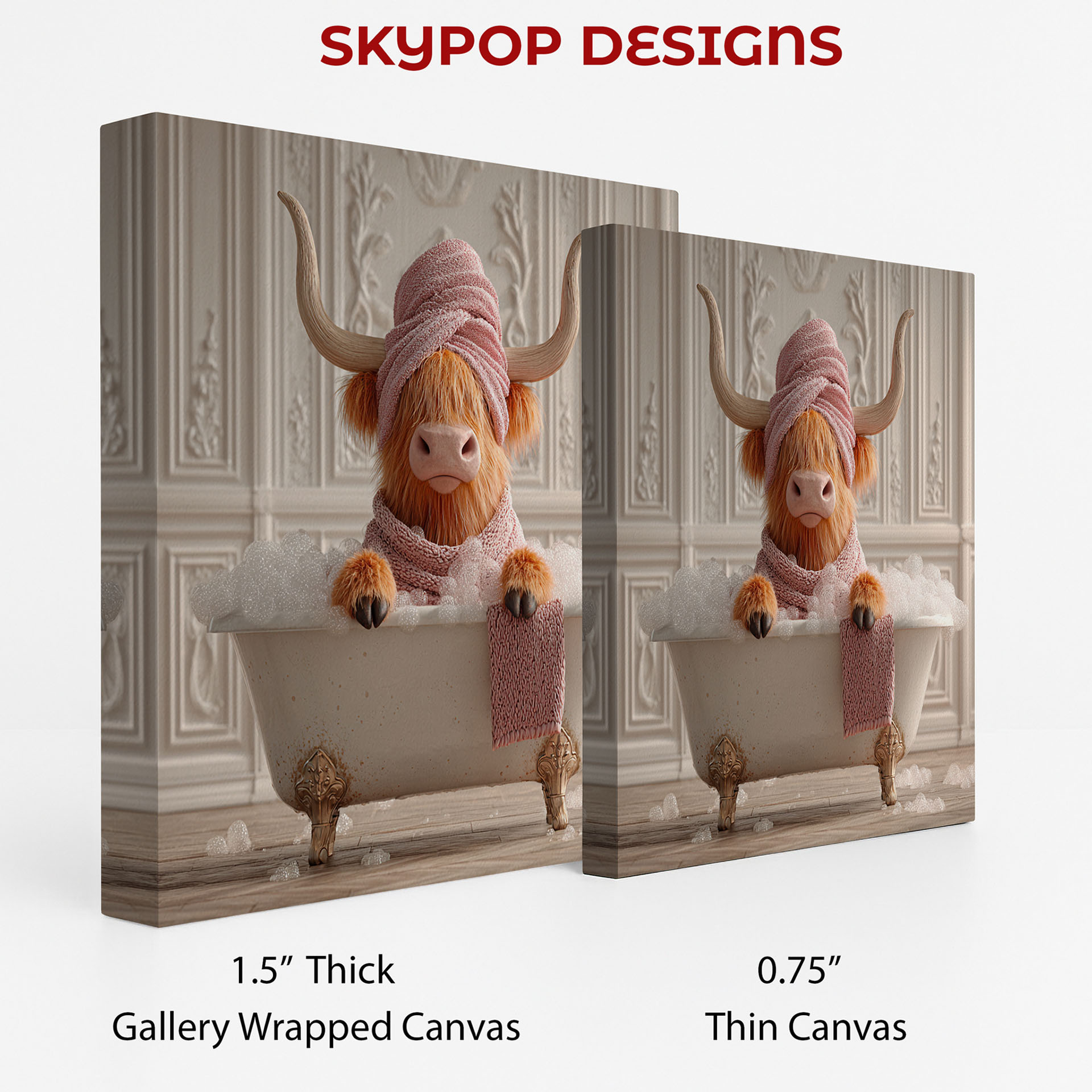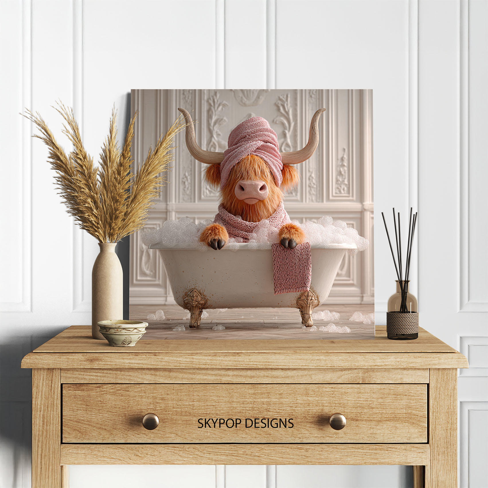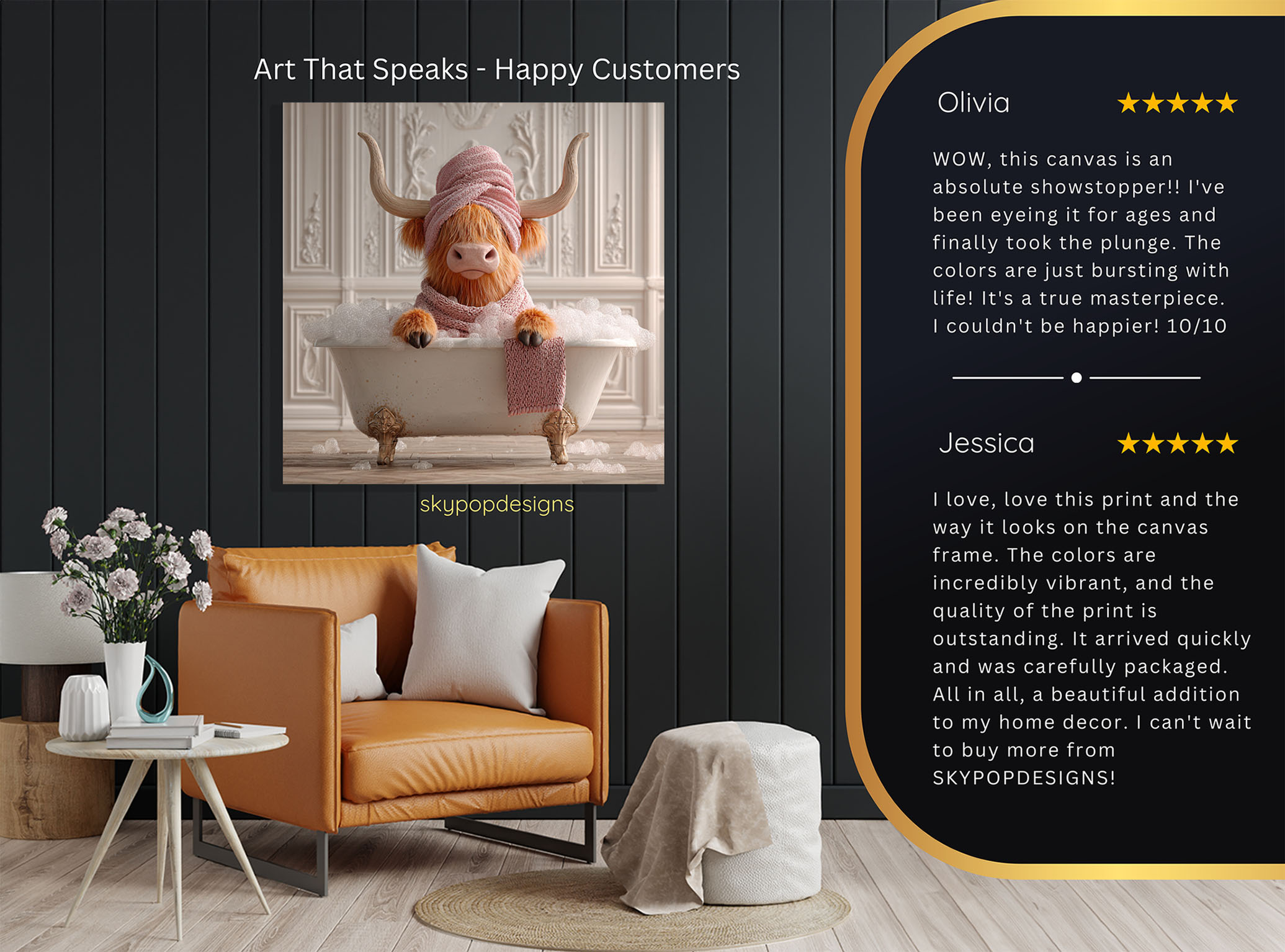 Transform your sanctuary with charming Highland Cow canvas wall art that exudes whimsy and comfort. This delightful poster or canvas wall art brings a unique touch of personality to any space, perfect for creating a relaxing bathroom ambiance or a cozy bedroom retreat. The soft pink hues and warm brown tones of the Highland Cow, wrapped in a fluffy towel, evoke a sense of tranquility and self-care. This artwork is ideal for farmhouse and shabby chic decor styles, adding a heartwarming element to your home. Its playful yet sophisticated design makes it a wonderful conversation piece for living rooms or children’s rooms, bringing smiles and joy to all who see it. The detailed rendering of the fur and bubbles makes this canvas wall art a captivating visual experience. This Highland Cow artwork is not just decor; it’s a statement of comfort and self-indulgence, embodying the simple pleasures of a spa day. Available in various sizes, this print or canvas wall art seamlessly integrates into any room size, from small powder rooms to spacious master suites. It makes a fantastic gift for housewarmings, birthdays, or holidays, especially for animal lovers and those who appreciate unique wall decor. Elevate your home with this heartwarming and charming Highland Cow wall art, a perfect blend of nature’s charm and cozy relaxation. Bring this delightful scene to life on your walls today and embrace the cozy vibes.