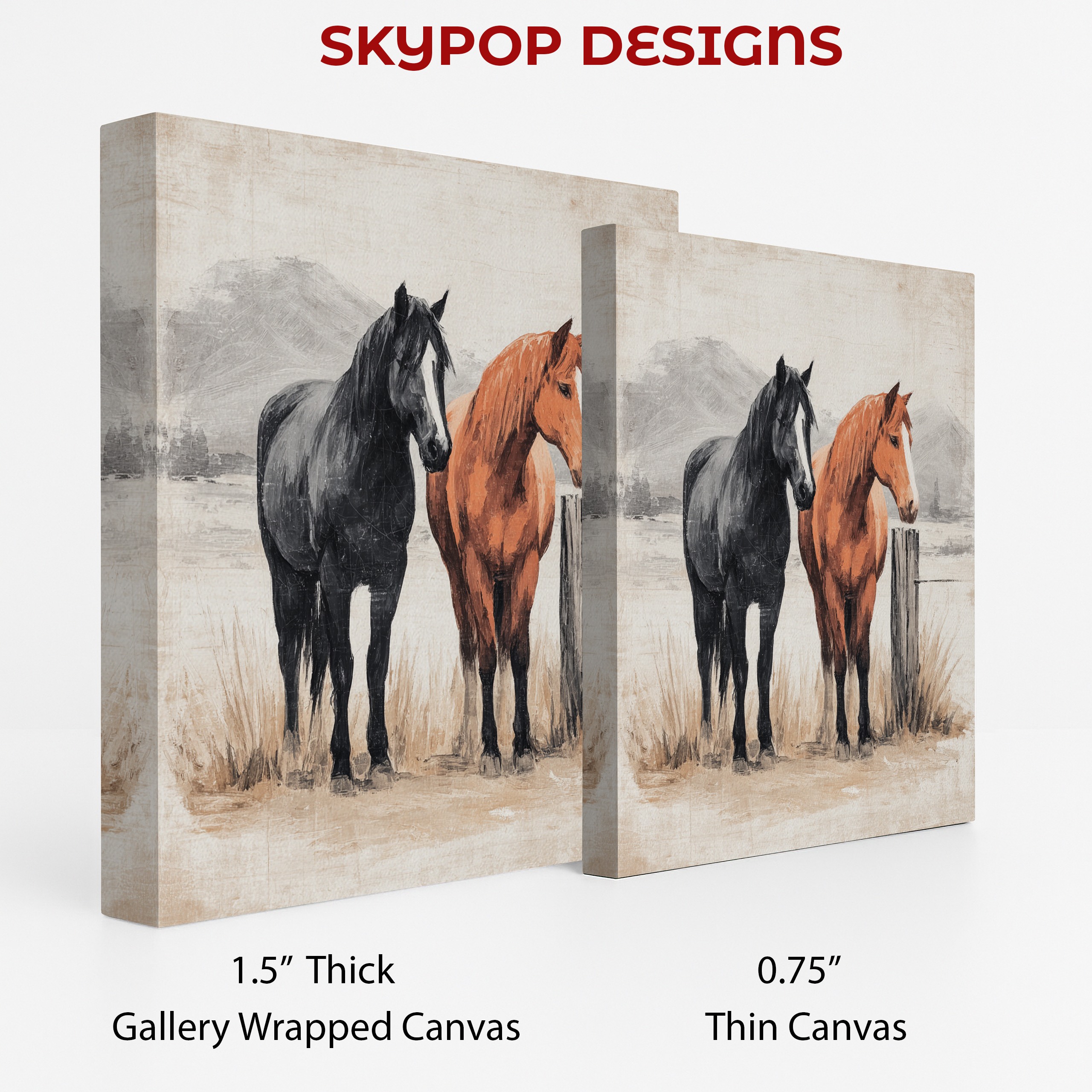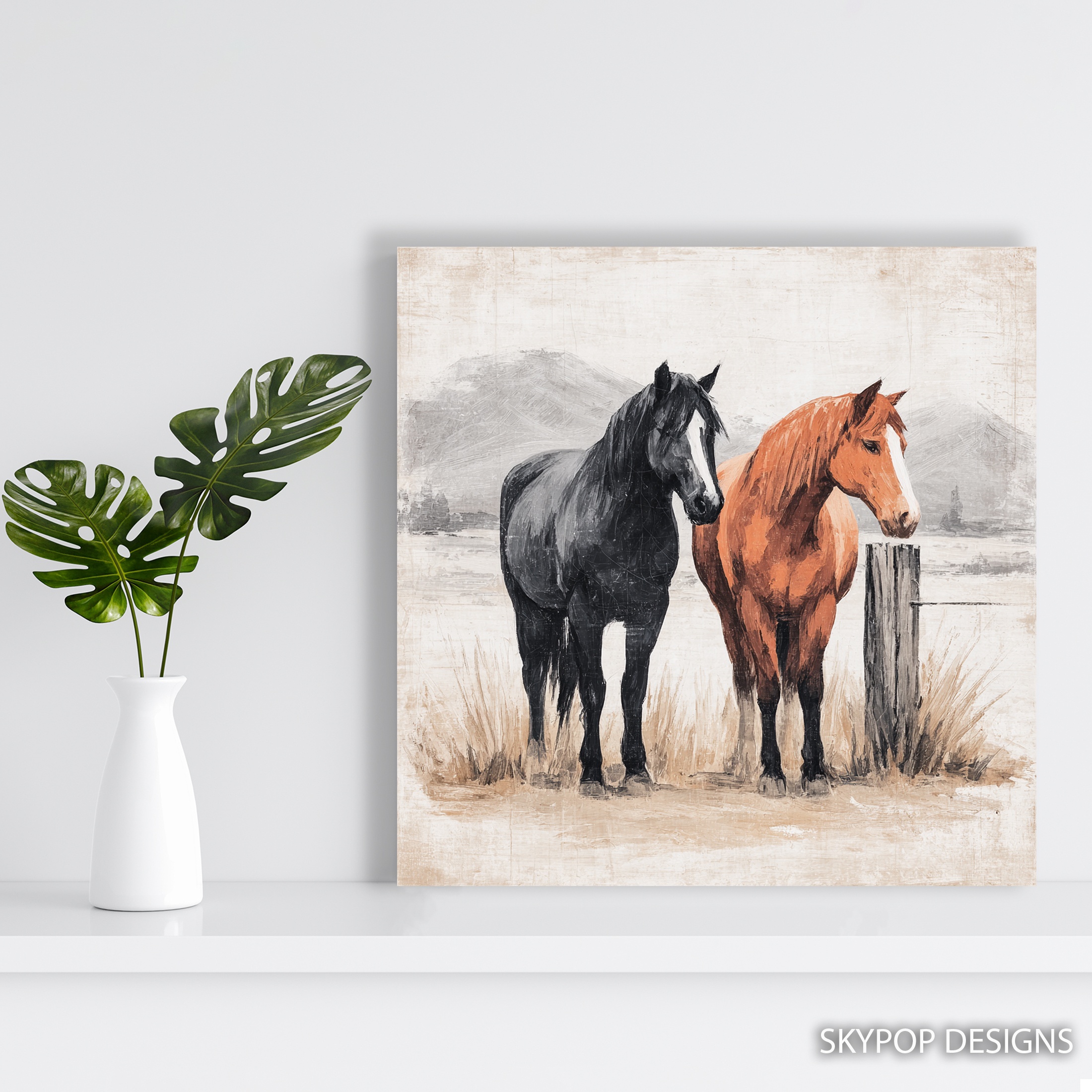 Bring the spirit of the wild into your home with this stunning two horses canvas wall art. This captivating piece showcases a black horse and a brown horse standing side by side, their powerful forms silhouetted against a misty landscape. Perfect for horse lovers and nature enthusiasts alike, this poster or canvas print adds a touch of rustic charm to any room. The contrasting colors of the horses create a striking visual impact, making it an ideal focal point for your living room or bedroom decor. The subtle gray tones in the background evoke a sense of mystery and depth, enhancing the overall atmosphere of the artwork. This versatile piece complements both farmhouse and modern interiors, adding warmth and character to your space. Whether displayed in a cozy office or a spacious entryway, this horse wall art brings a sense of freedom and natural beauty indoors. The high-quality printing captures every detail, from the horses’ muscular bodies to their flowing manes, ensuring a lifelike representation that will impress guests. As a thoughtful gift for equestrian enthusiasts or a statement piece for your own home, this canvas art celebrates the majestic beauty of horses in their natural environment. Transform your living space with this elegant and timeless horse artwork today.