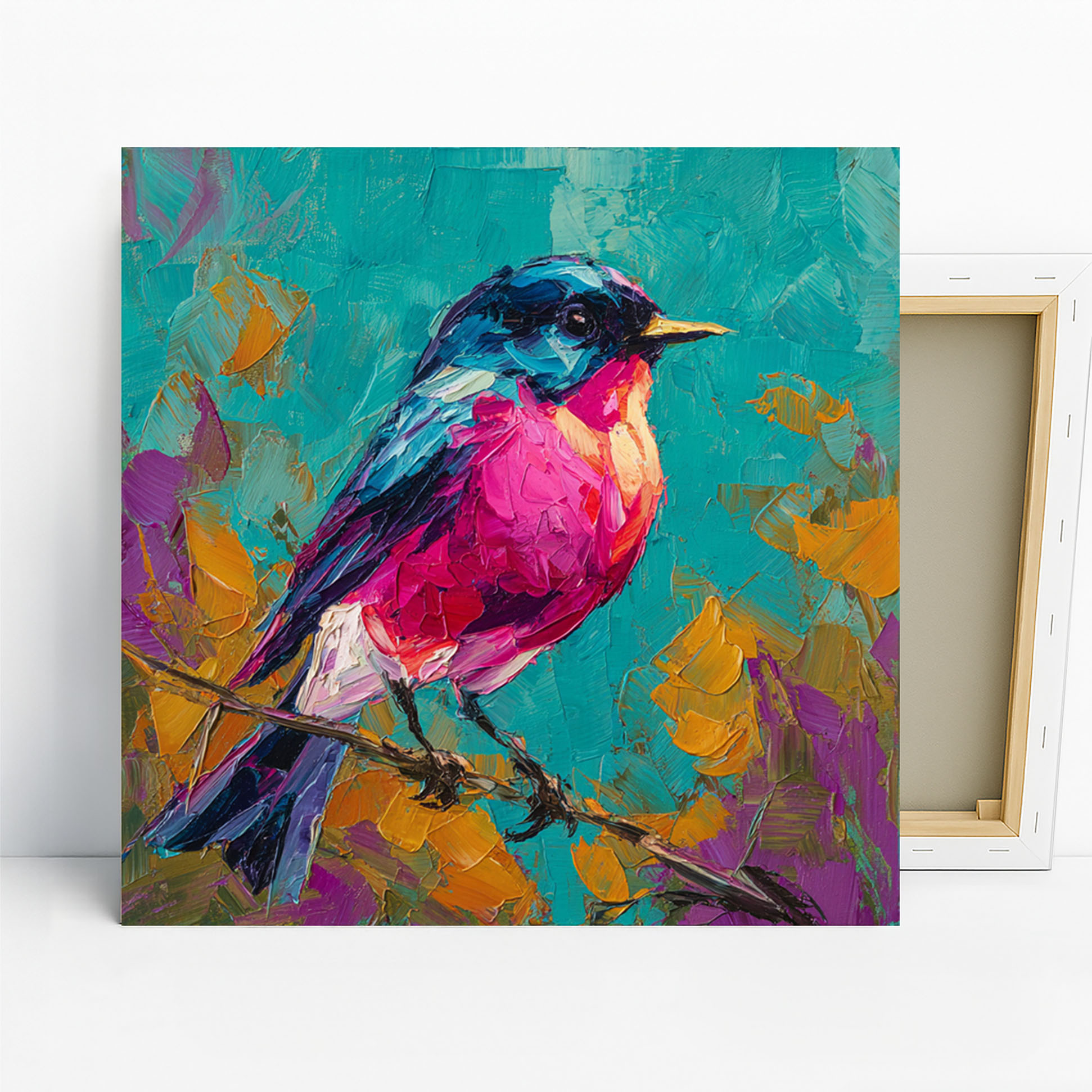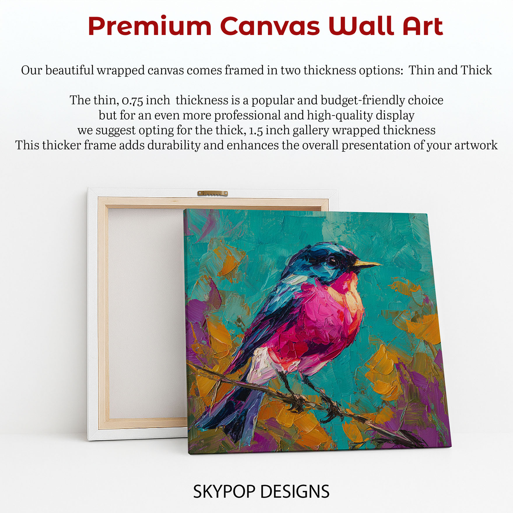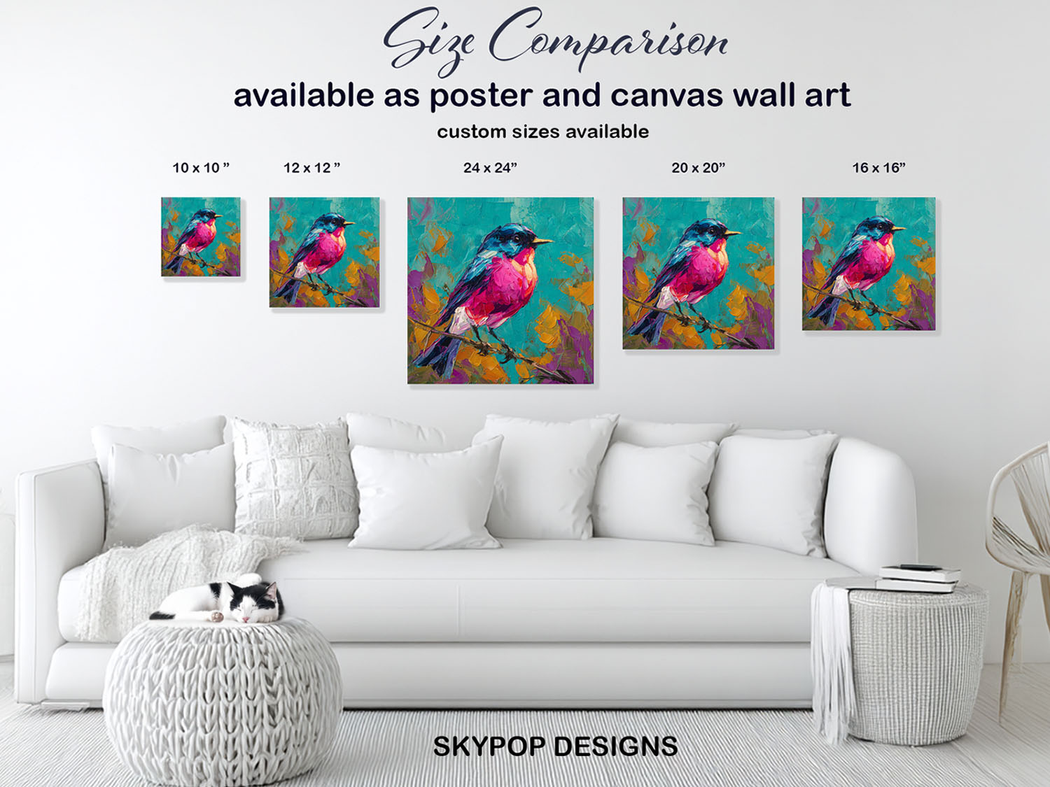 Bring the beauty of nature into your home with this vibrant hummingbird canvas wall art, a stunning piece that adds a pop of color and life to any space. This poster or canvas wall art features a colorful bird perched on a branch, rendered in a contemporary style with thick, textured brushstrokes that give it a striking, almost three-dimensional feel. The teal background and multicolor accents of pink, purple, and orange create a captivating visual display that will transform your living room wall decor. Ideal for bohemian and contemporary interiors, this animal art piece is perfect for adding personality to your bedroom or a cheerful touch to your dining room. The vibrant colors evoke a sense of joy and energy, uplifting the mood of any room it inhabits. This canvas wall art is a beautiful representation of nature’s artistry, serving as a constant source of inspiration. Its high-quality printing ensures the intricate details of the hummingbird’s plumage and the abstract foliage are captured with exceptional clarity. This versatile piece also makes a fantastic gift for nature lovers, bird enthusiasts, or for housewarmings and birthdays. Elevate your home with this stunning hummingbird poster that combines striking colors and artistic flair, making it a standout addition to your wall art collection. Add this captivating canvas art to your entryway to greet guests with a burst of natural beauty and artistic expression today.