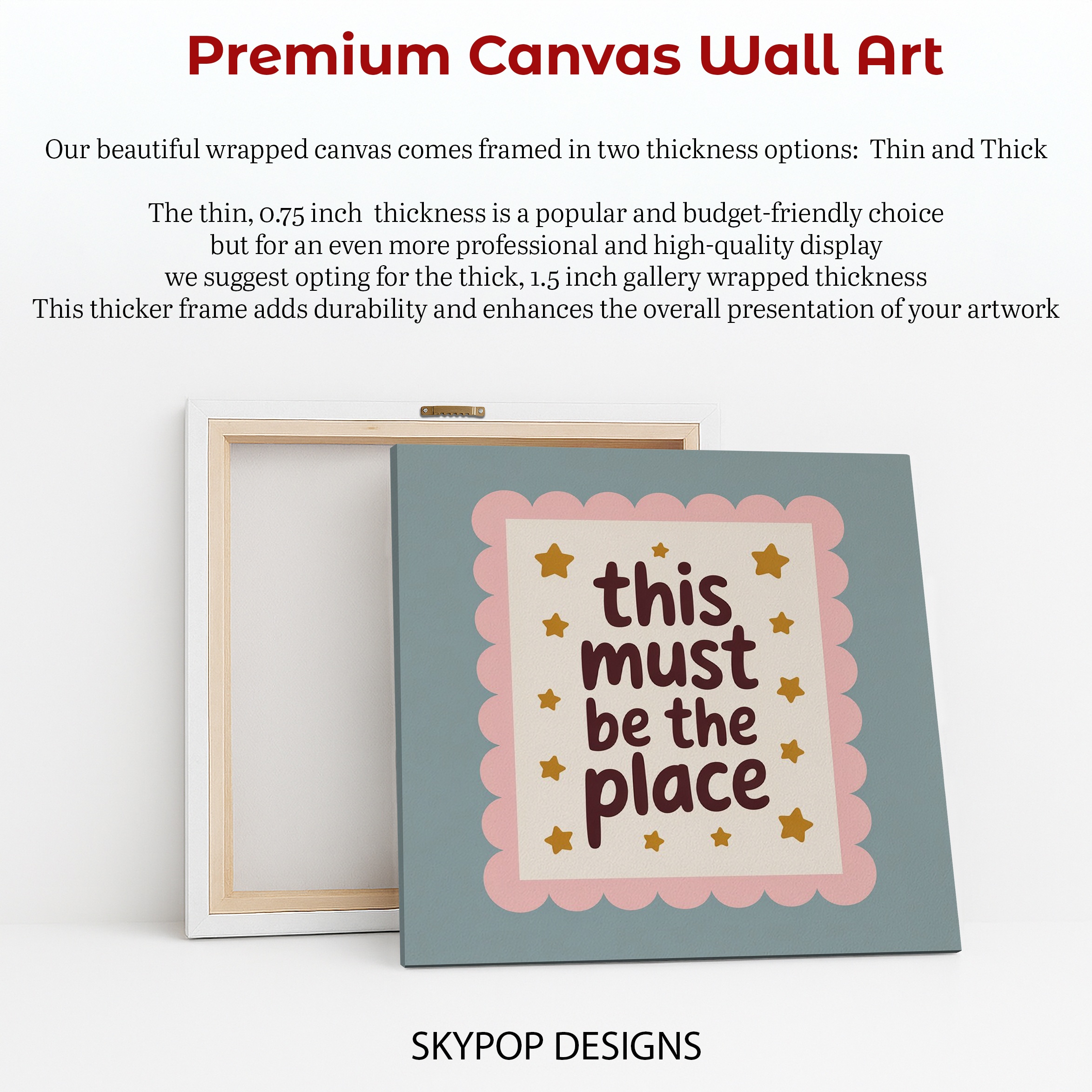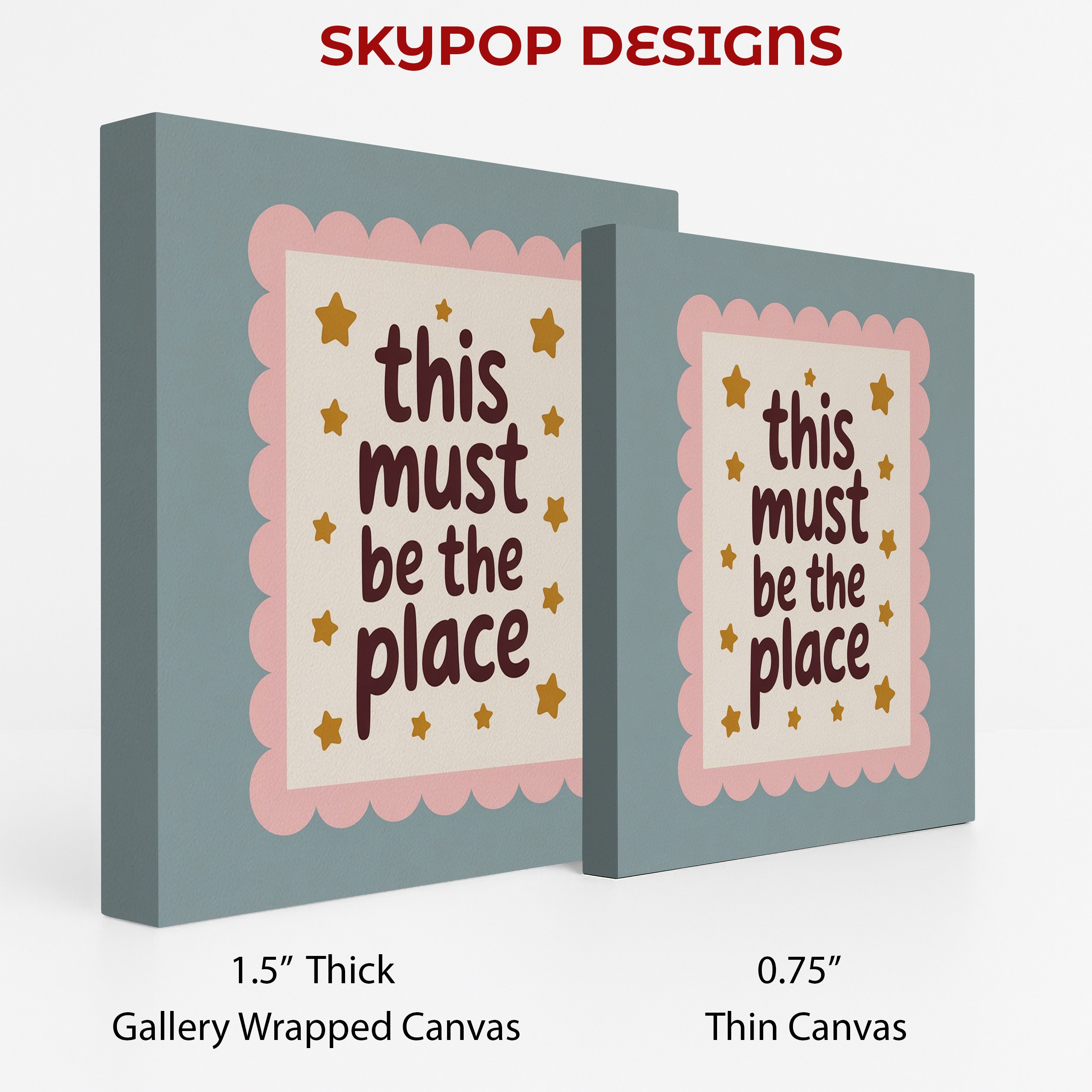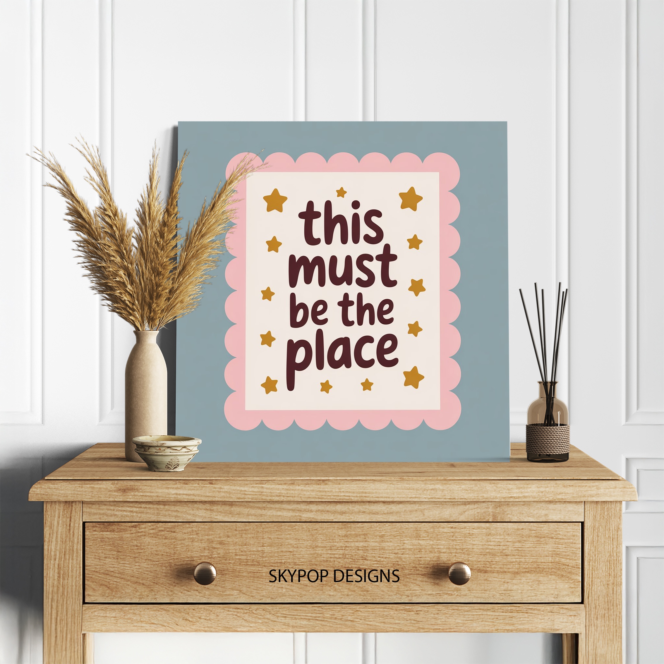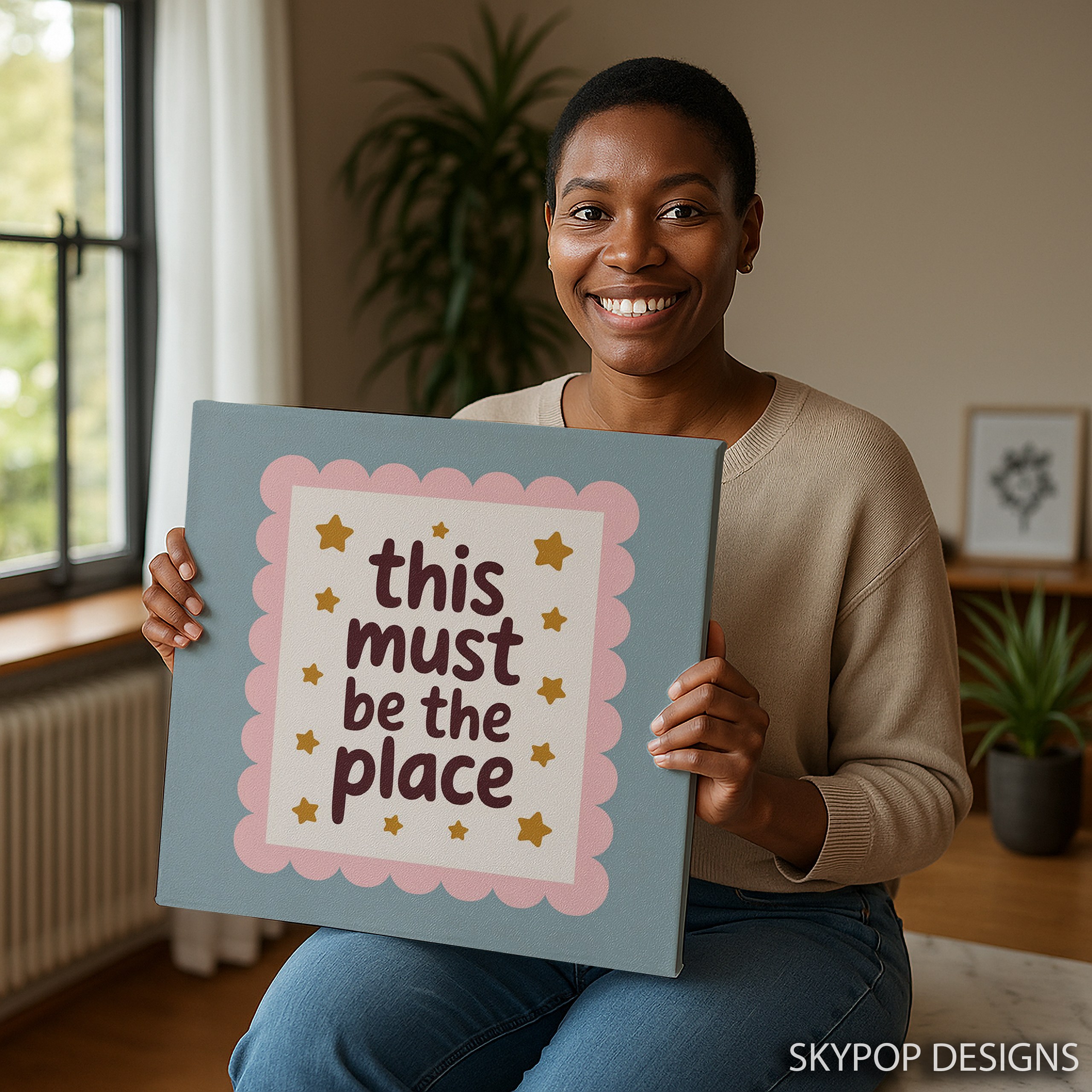 Transform your space with this charming and uplifting canvas wall art featuring the heartwarming phrase “this must be the place” surrounded by twinkling gold stars. This whimsical poster perfectly captures a sense of belonging and contentment, making it an ideal addition to any room seeking a touch of warmth and positivity. The soft pink scalloped border adds a delightful retro flair, perfect for bohemian or shabby chic decor styles. Elevate your bedroom, nursery, living room, or home office with this versatile piece that effortlessly blends retro charm with modern sensibilities. The soothing color palette of pink, brown, and gold creates a calming atmosphere, while the playful typography inspires a sense of home and comfort. This canvas art serves as a daily reminder to appreciate the present moment and find joy in your surroundings. Ideal as a housewarming gift or to refresh your own space, this artwork adapts beautifully to various interior styles. The high-quality printing ensures every detail shines, from the delicate star accents to the scalloped border. Whether displayed above a cozy reading nook or as a focal point in your living area, this piece sparks conversations and spreads positivity. Enhance your home’s atmosphere with this unique blend of retro-inspired design and contemporary sentiment that celebrates the magic of feeling at home. Make this inspiring canvas art the highlight of your wall decor collection today.