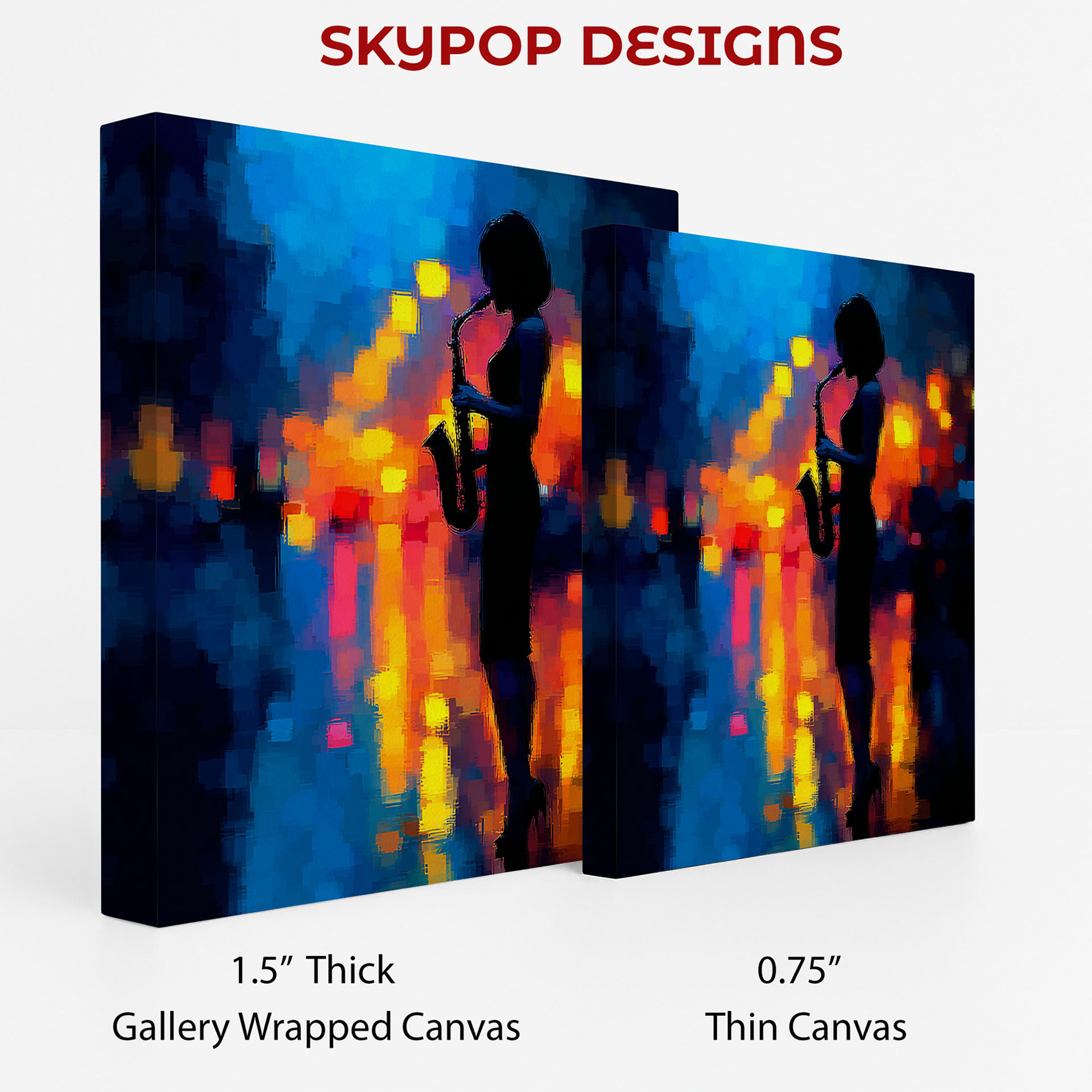 Capture the soulful rhythm of the night with this captivating jazz canvas wall art, featuring a silhouetted saxophonist against a vibrant urban backdrop.