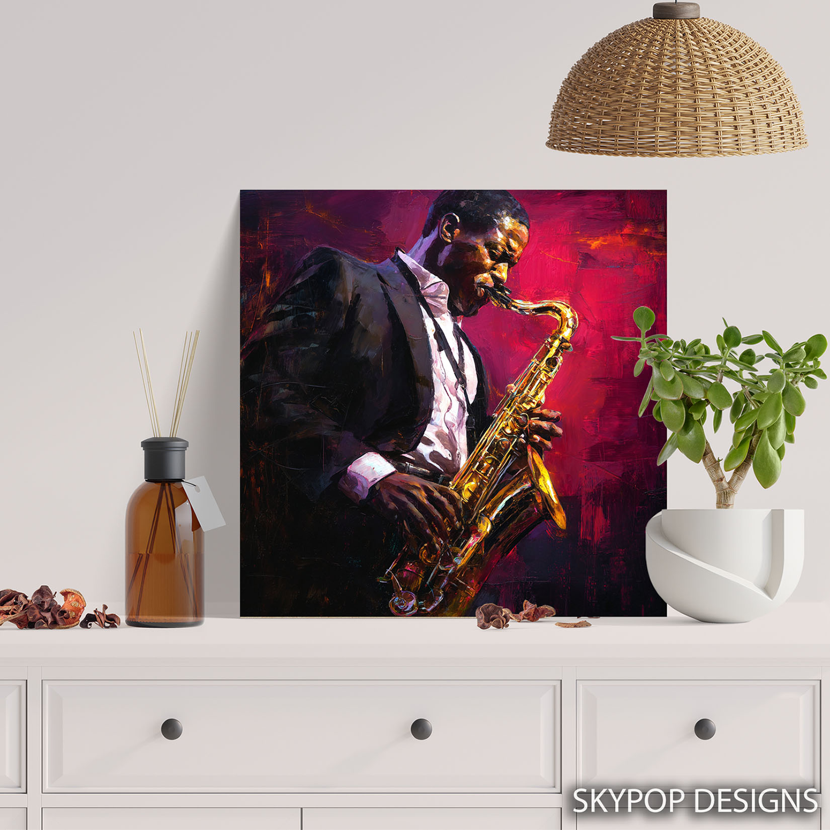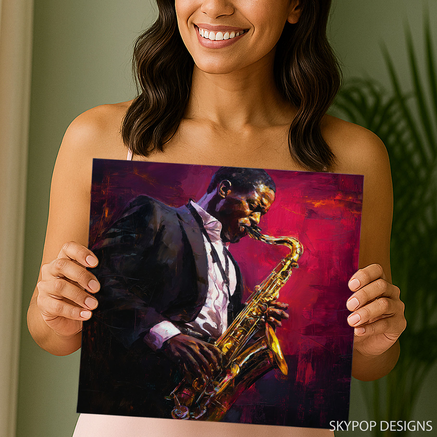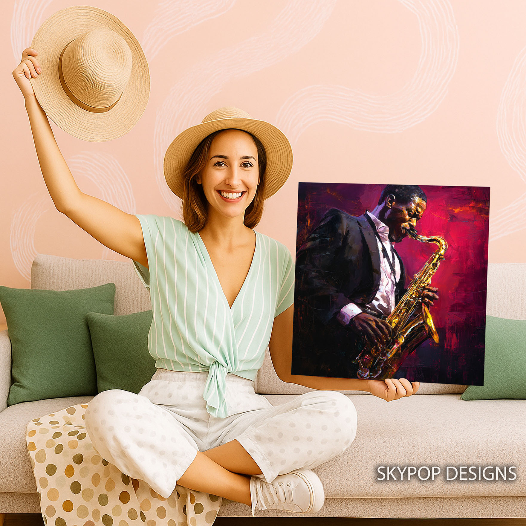 Transform your space with this captivating jazz saxophone player canvas wall art, showcasing a rich and vibrant portrayal of musical passion. This stunning poster or canvas wall art is perfect for music lovers and adds a sophisticated touch to any contemporary living room or stylish office space. The striking contrast between the deep black suit, crisp white shirt, and the gleaming gold saxophone against the textured red background creates an electrifying visual energy. Inspired by classic music art, this piece aims to evoke the emotion and soul of live jazz performances, making it ideal for enhancing modern decor. The dynamic brushstrokes and bold color palette of this musical artwork celebrate the artistry of a saxophone player in a powerful and expressive way. It will elevate the ambiance in a music room or game room, becoming a sophisticated focal point and conversation starter. This versatile wall art is also a fantastic gift for birthdays, holidays, or housewarmings for anyone who appreciates jazz or fine art. The high-quality print captures the intricate details and emotional depth of the original artwork, ensuring a premium canvas wall art experience. Embrace the sophistication and rhythm of jazz music with this eye-catching piece that inspires creativity and adds a touch of glam decor to your home. Elevate your walls today with this stunning jazz-themed canvas art.