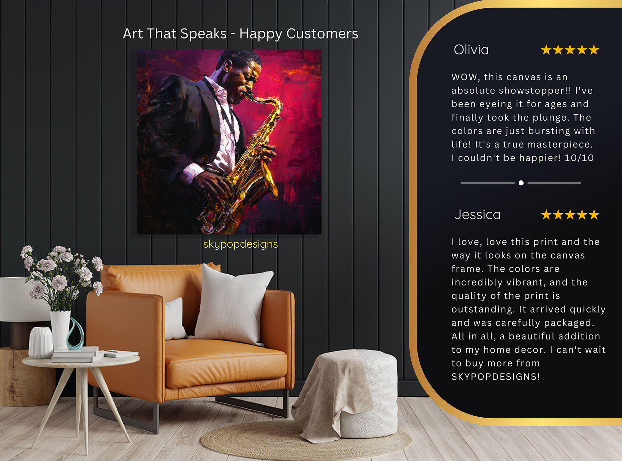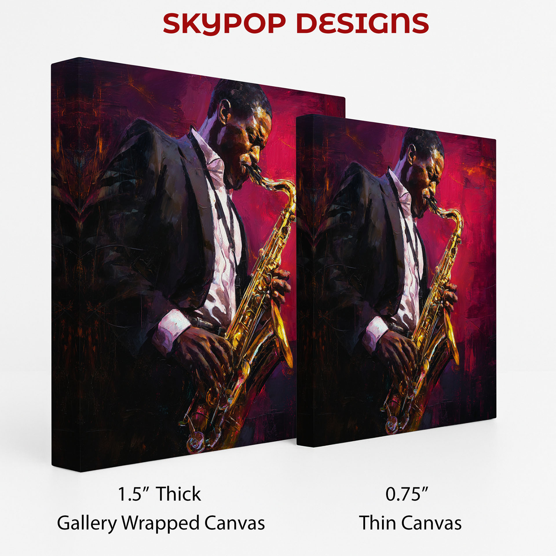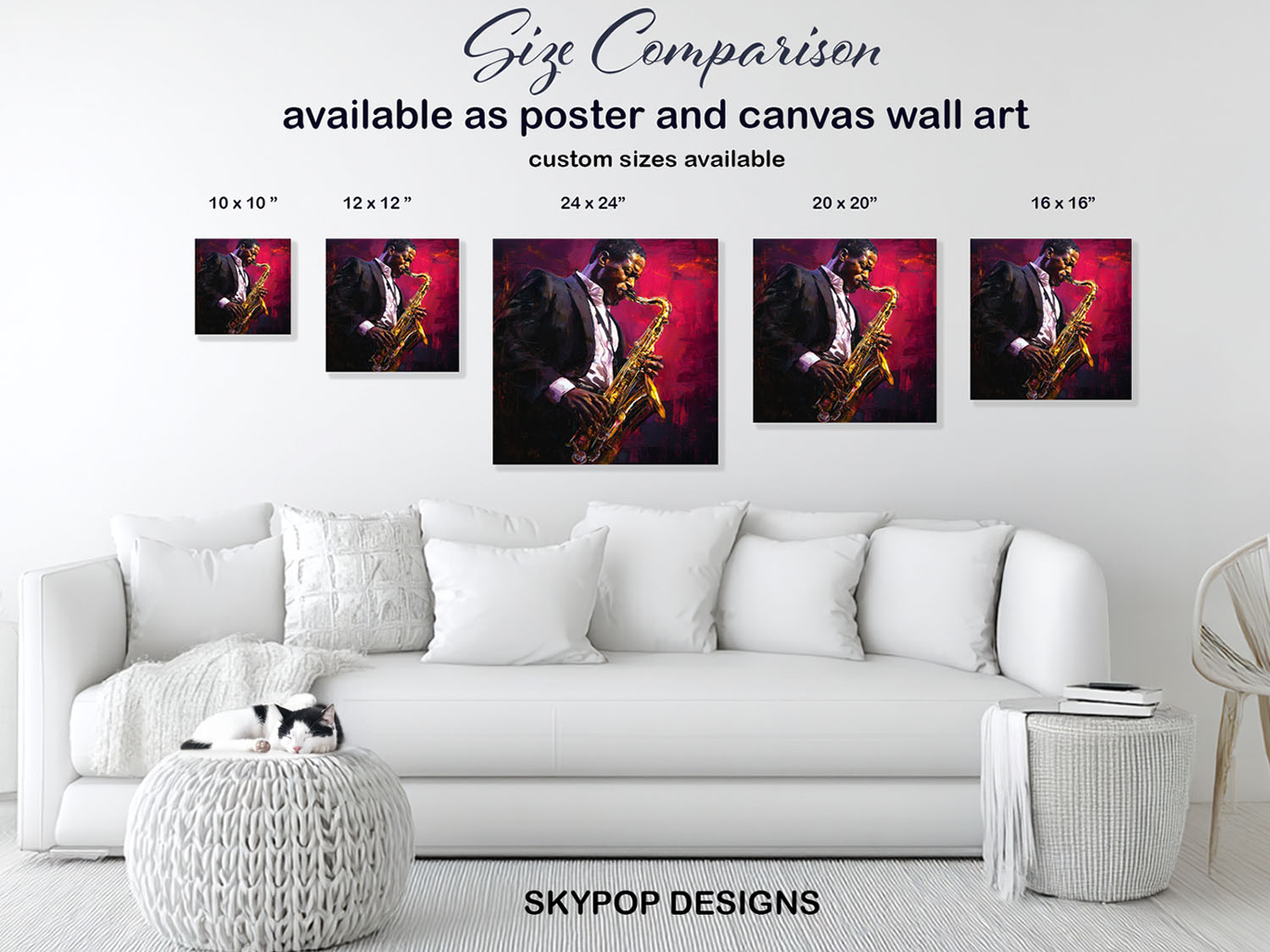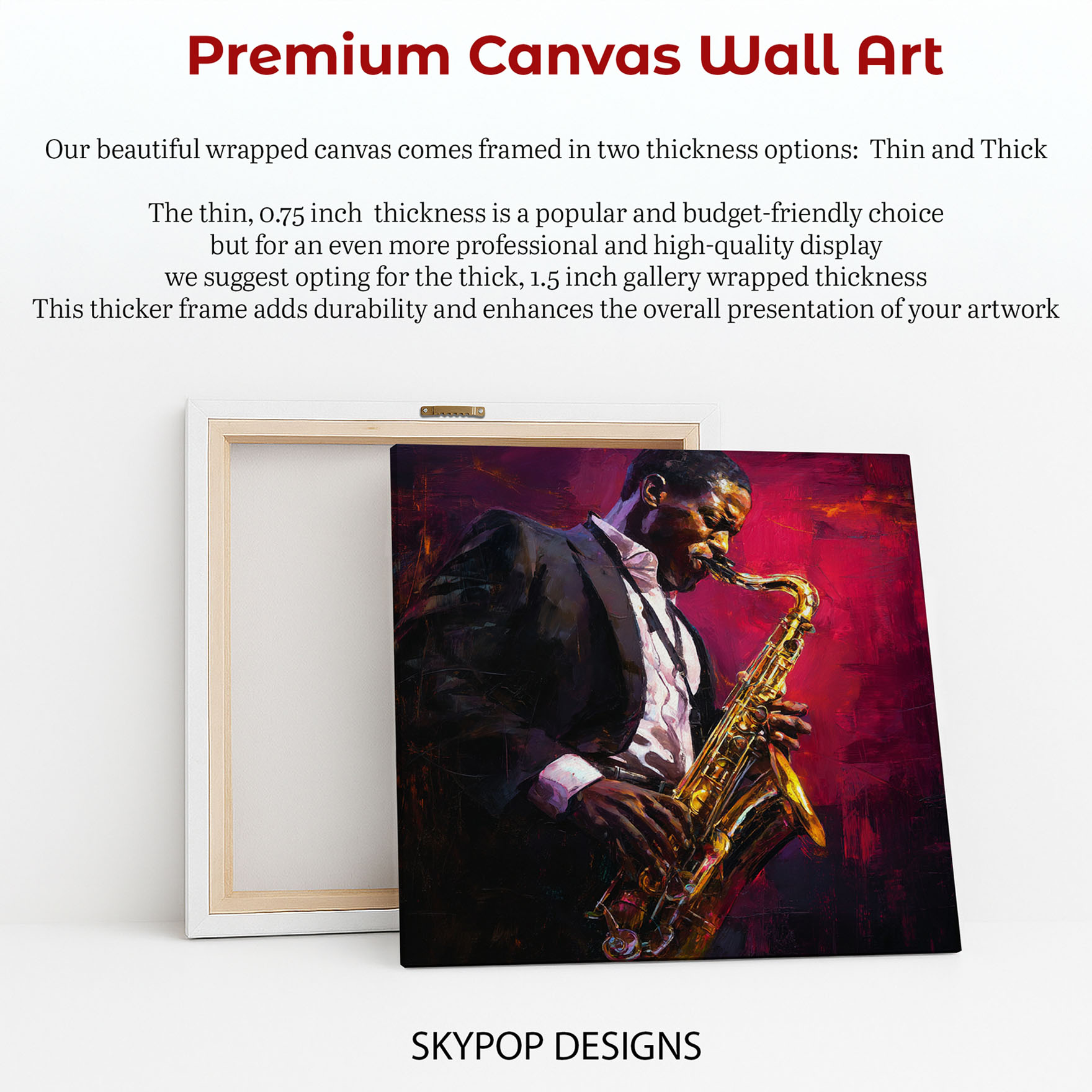 Transform your space with this captivating jazz saxophone player canvas wall art, showcasing a rich and vibrant portrayal of musical passion. This stunning poster or canvas wall art is perfect for music lovers and adds a sophisticated touch to any contemporary living room or stylish office space. The striking contrast between the deep black suit, crisp white shirt, and the gleaming gold saxophone against the textured red background creates an electrifying visual energy. Inspired by classic music art, this piece aims to evoke the emotion and soul of live jazz performances, making it ideal for enhancing modern decor. The dynamic brushstrokes and bold color palette of this musical artwork celebrate the artistry of a saxophone player in a powerful and expressive way. It will elevate the ambiance in a music room or game room, becoming a sophisticated focal point and conversation starter. This versatile wall art is also a fantastic gift for birthdays, holidays, or housewarmings for anyone who appreciates jazz or fine art. The high-quality print captures the intricate details and emotional depth of the original artwork, ensuring a premium canvas wall art experience. Embrace the sophistication and rhythm of jazz music with this eye-catching piece that inspires creativity and adds a touch of glam decor to your home. Elevate your walls today with this stunning jazz-themed canvas art.