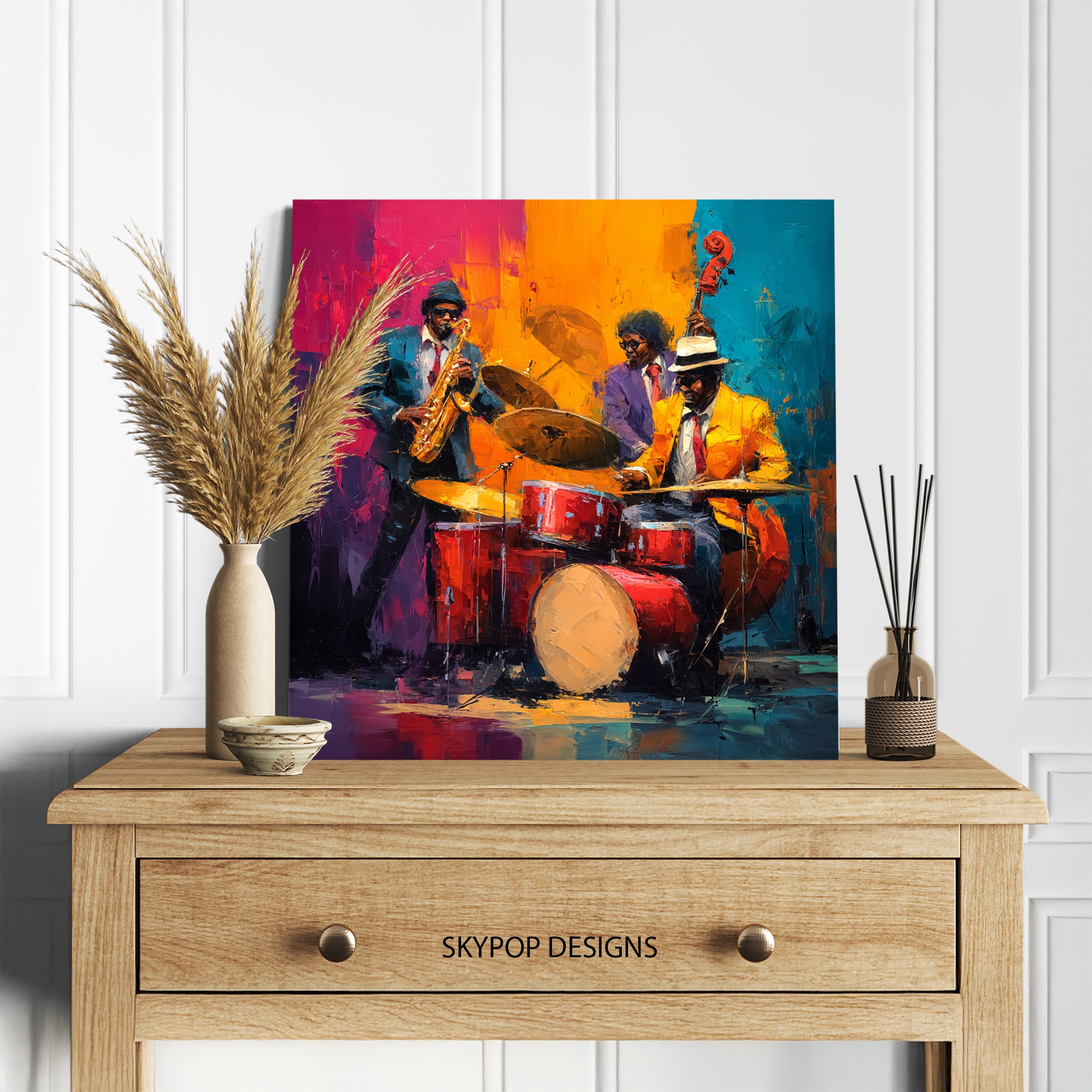 Keywords: Jazzy Night Grooves Canvas Art, Music Wall Art, Jazz Art Print, Saxophone Art, Drum Art, Bass Art, Live Jazz Performance, Contemporary Wall Art, Modern Decor, Glam Decor, Multicolor Canvas, Yellow Art, Red Art, Blue Art, Living Room Art, Dining Room Art, Office Wall Art, Music Room Decor, Figurative Art, Expressive Art, Textured Canvas, Statement Wall Art, Home Decor Gift, Music Lover Gift, Birthday Gift, Holiday Gift, Housewarming Gift, Wall Decor Poster, Fine Art Print, Jazz Ensemble Art