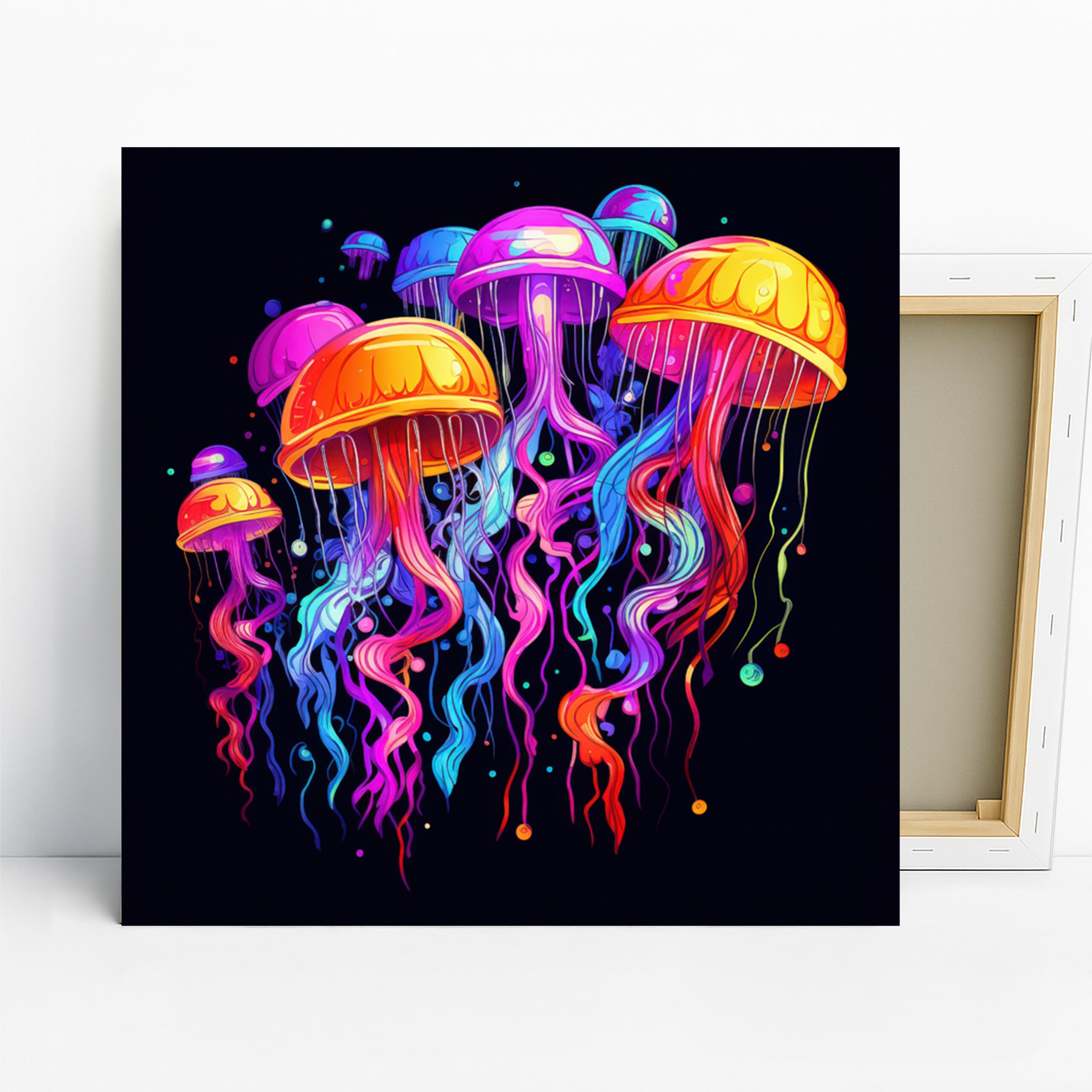 Keywords: Jellyfish Art, Canvas Wall Art, Neon Art, Multicolor Art, Blue Purple Orange Art, Contemporary Art, Nature Art, Pop Art, Modern Decor, Bohemian Decor, Entryway Decor, Living Room Art, Bedroom Art, Sunroom Decor, Underwater Scene, Ocean Depths, Marine Life Art, Vibrant Wall Art, Colorful Poster, Home Decor, Statement Piece, Unique Artwork, Gift for Her, Housewarming Gift, Birthday Gift, Artistic Print, Wall Decor, Modern Art, Psychedelic Art, Jellyfish Dance Art