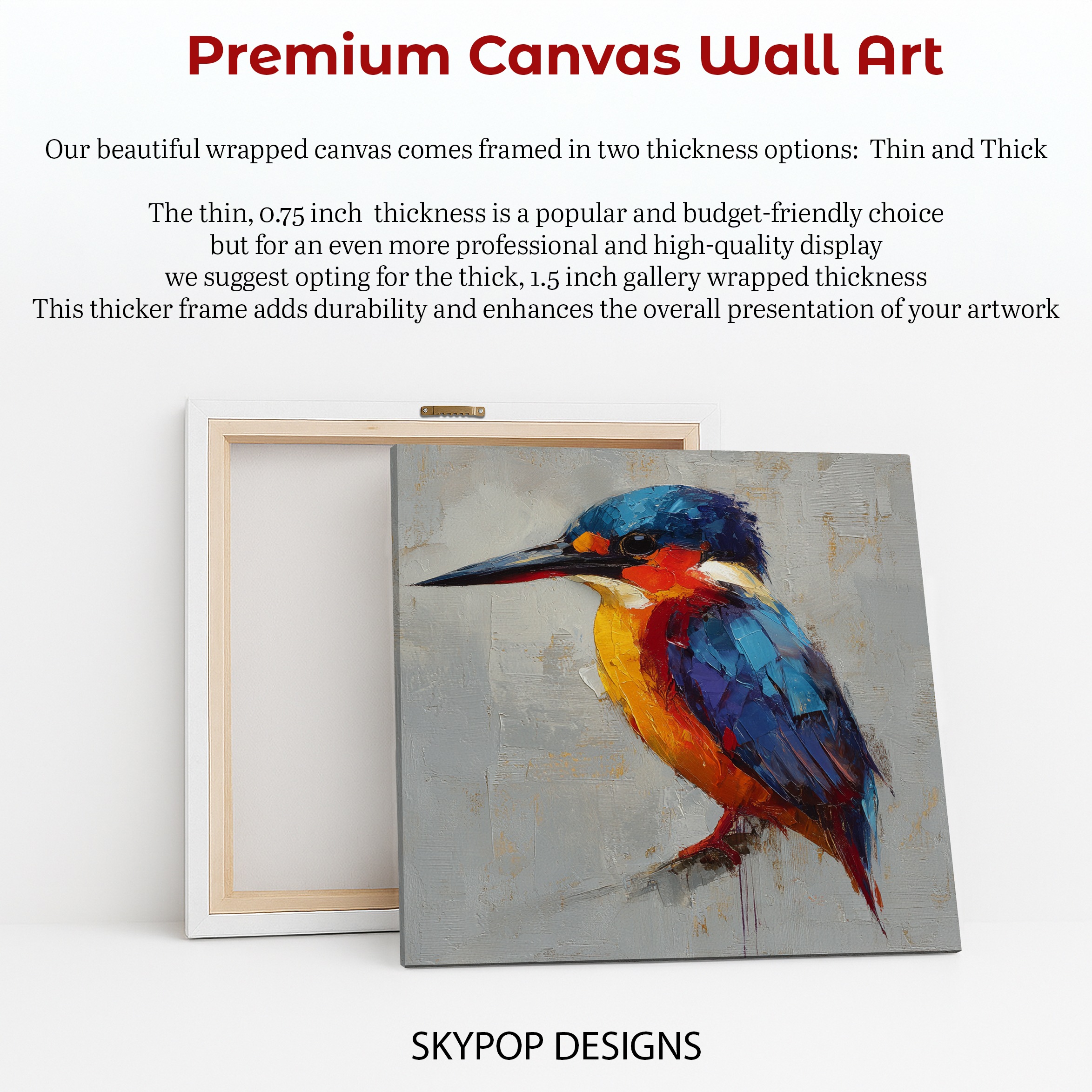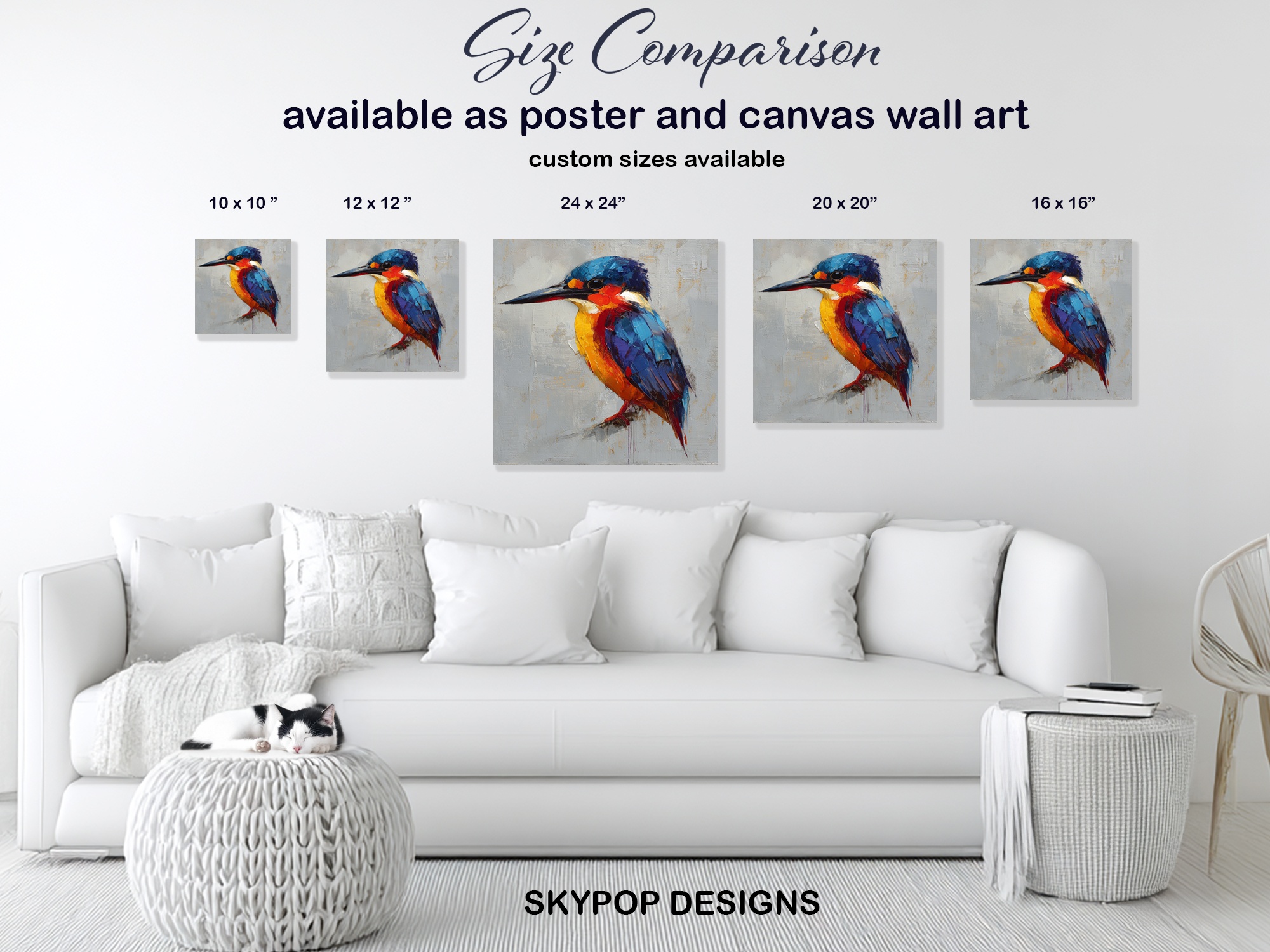 Bring the beauty of nature indoors with this striking kingfisher canvas wall art. The vibrant colors and bold brushstrokes create a captivating focal point that instantly elevates any room. This modern bird poster showcases the kingfisher’s brilliant blue plumage contrasted against a warm orange and yellow breast, perfect for adding a pop of color to neutral spaces. Ideal for contemporary living rooms or bohemian bedrooms, this eye-catching piece combines the allure of animal art with abstract expressionism. The textured paint application gives depth and movement to the composition, ensuring this canvas wall art remains engaging from every angle. Great as a thoughtful housewarming gift or to refresh your seasonal decor, this versatile artwork adapts to various interior styles. High-quality printing captures every delicate detail, from the bird’s piercing eye to its sharp beak. Whether displayed in a cozy bedroom, modern office, or bright dining area, this piece sparks conversations and brings the outdoors in. The kingfisher’s vibrant presence symbolizes quick thinking and prosperity, making it a perfect addition to a home office or creative space. Transform your walls with this unique blend of nature-inspired art and contemporary style that celebrates the beauty of wildlife. Elevate your home’s atmosphere with this stunning kingfisher wall art today.