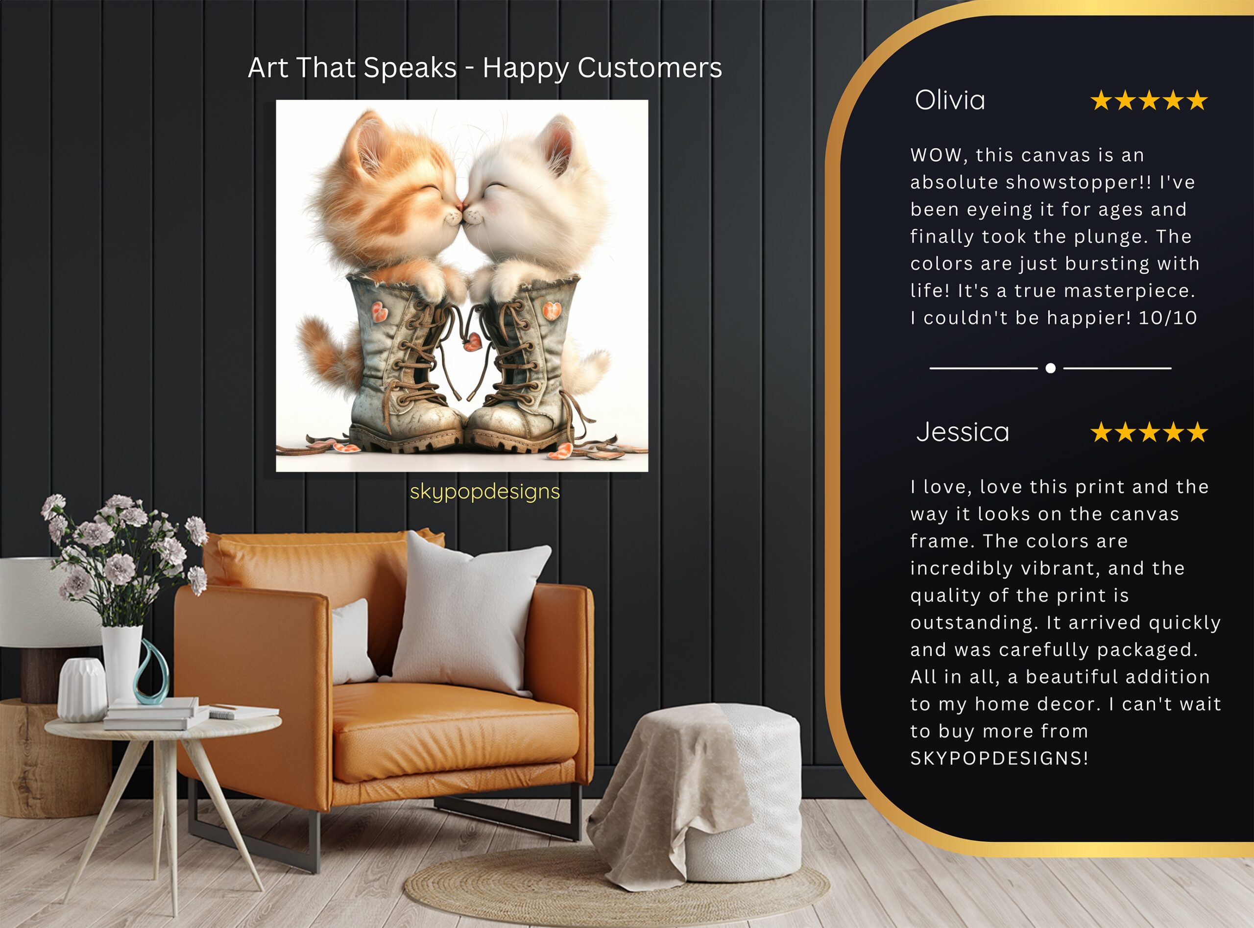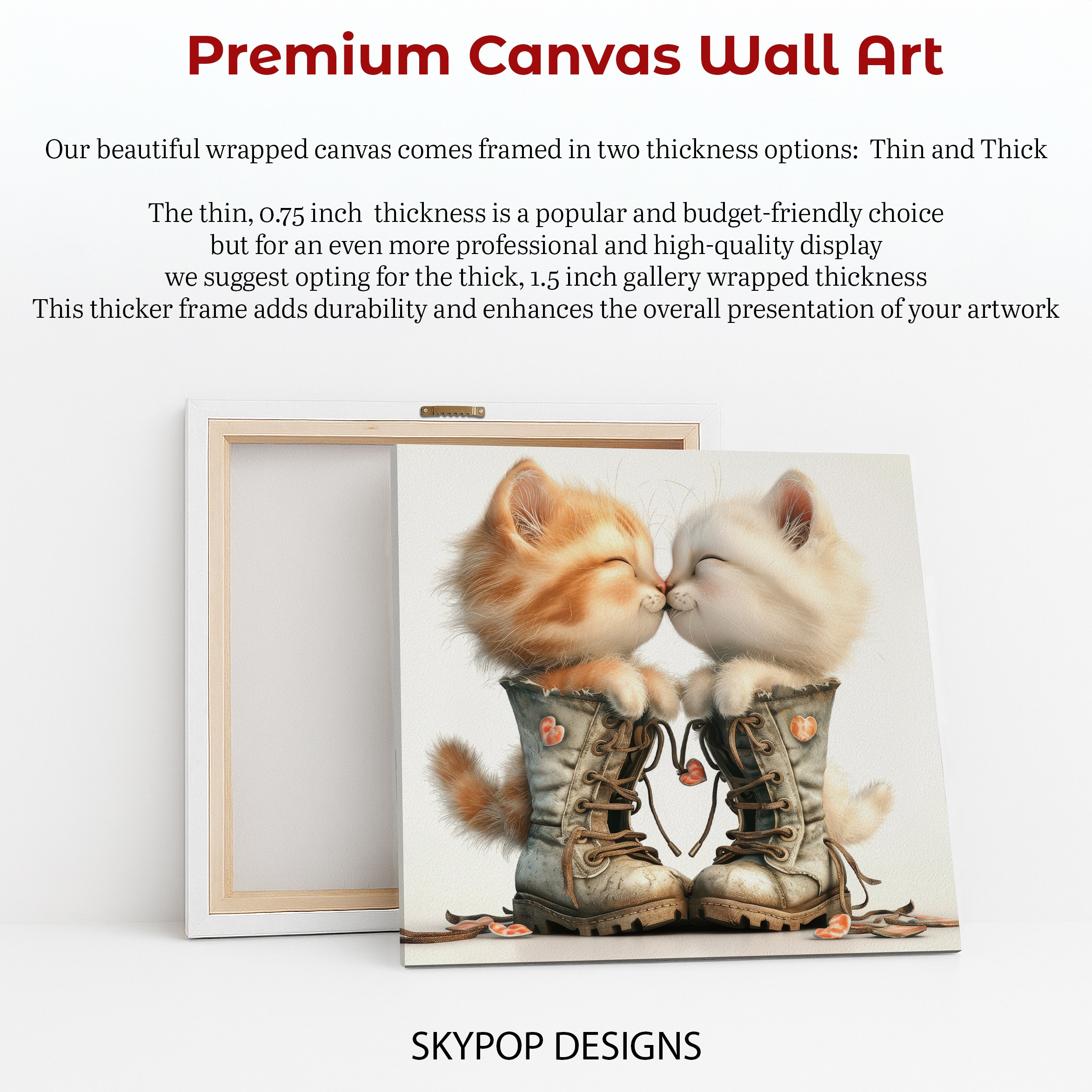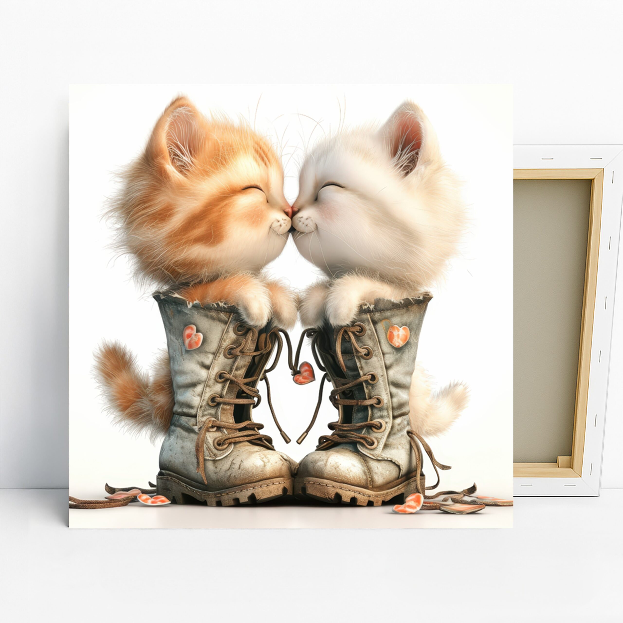 Capture the most heartwarming moments with this adorable kitten canvas wall art, featuring two sweet kittens sharing a tender kiss inside cozy boots. This captivating poster art transforms any room into a sanctuary of warmth and affection. The charming depiction of these fluffy companions, nestled in rustic boots adorned with sweet heart details, evokes a sense of pure joy and companionship. Perfect for adding a touch of whimsical magic to your contemporary living room or a cozy farmhouse bedroom, this versatile wall art enhances any decor style. The soft, loving colors and the endearing subject matter make this a truly unique piece that will inspire smiles and foster a feeling of love and comfort. Ideal as a delightful housewarming gift or a special present for any cat lover, this canvas wall art is sure to be cherished. It’s not just wall decor; it’s a celebration of simple pleasures and undeniable cuteness, making it a perfect addition to a child’s room or a serene nursery. Enhance your home with this stunning piece of animal art that radiates positivity and sweet sentimentality. Elevate your living space with this charming kitten artwork today, bringing a touch of playful charm and heartfelt connection to your walls. This high-quality canvas print ensures the intricate details of the kittens’ fur and the rustic texture of the boots are beautifully rendered for lasting enjoyment.