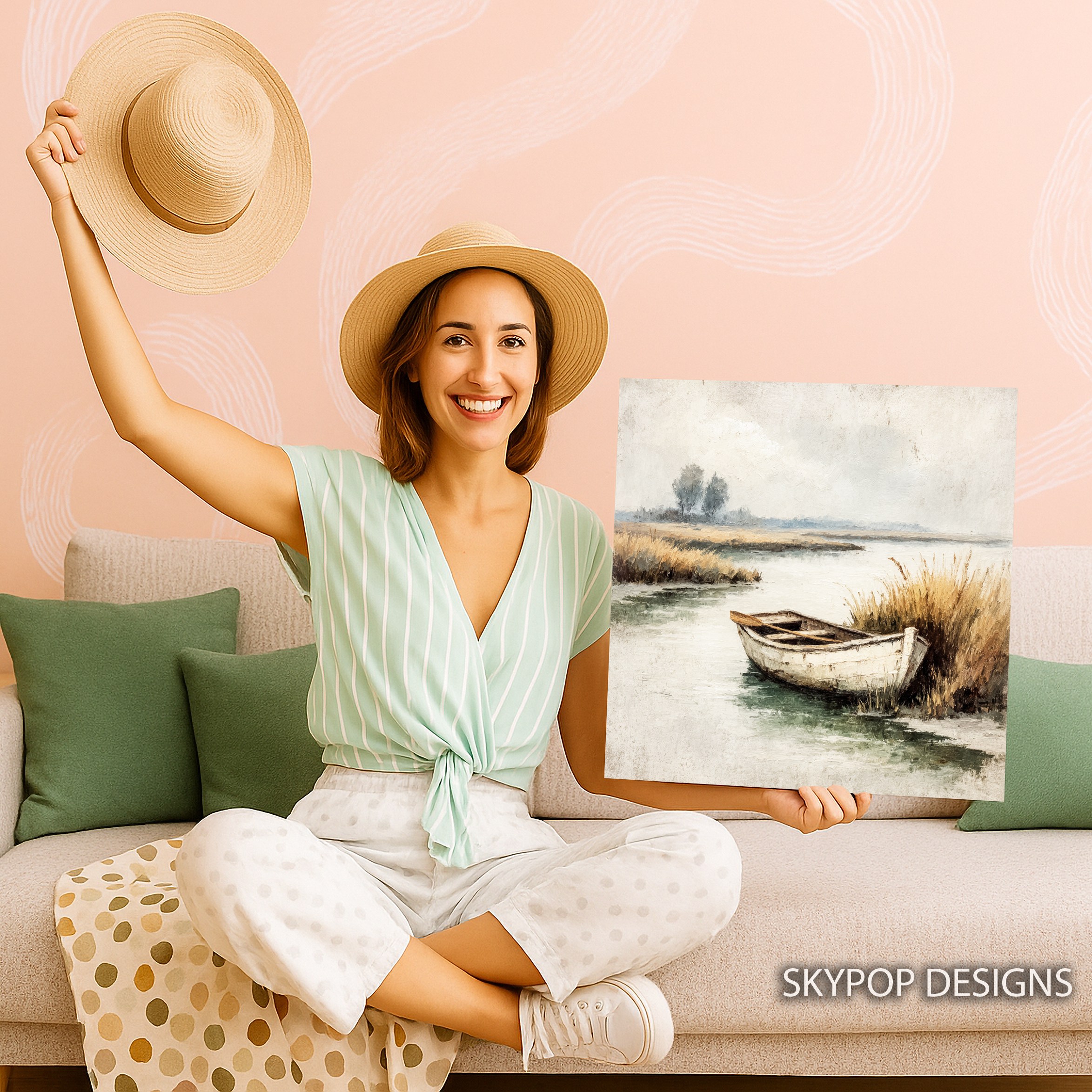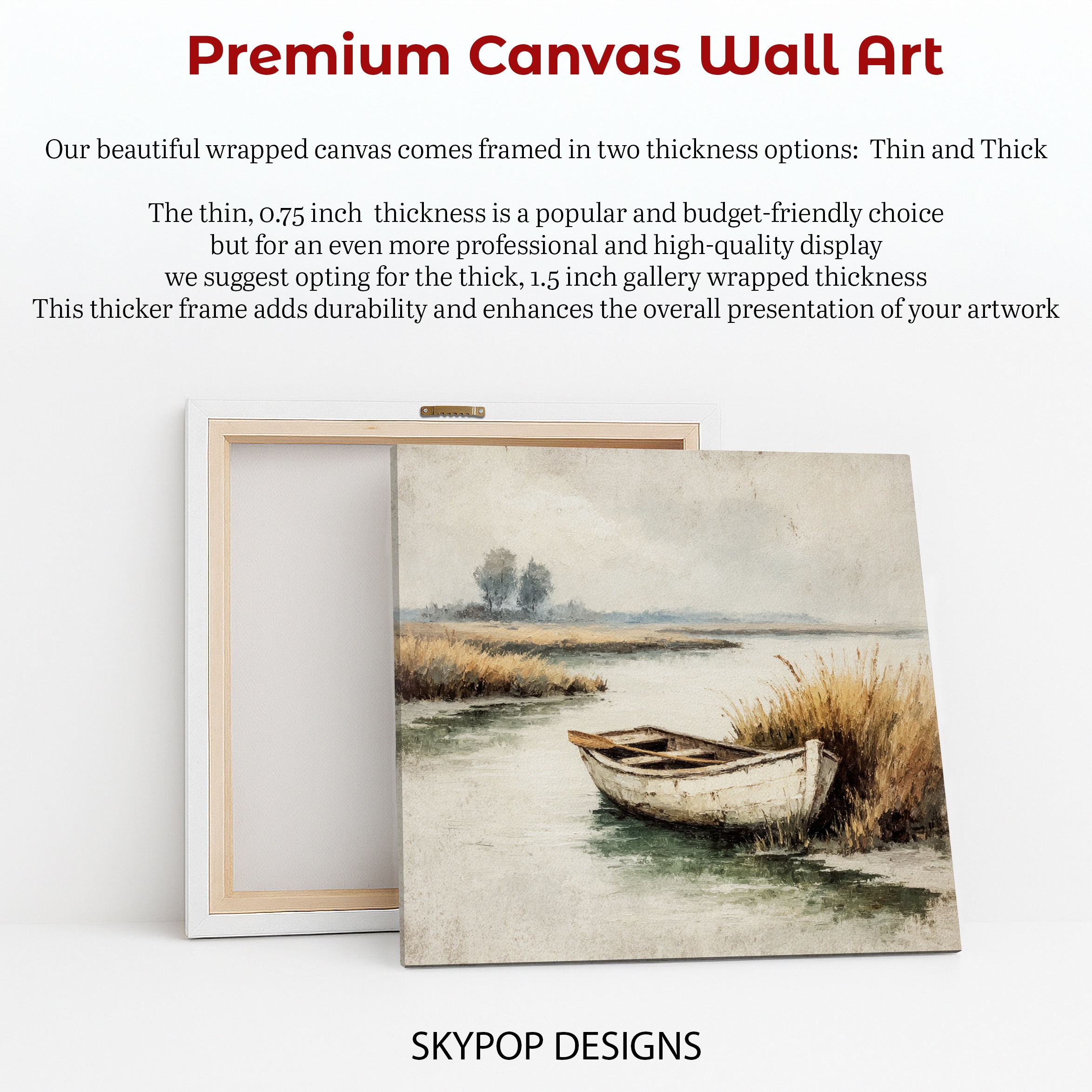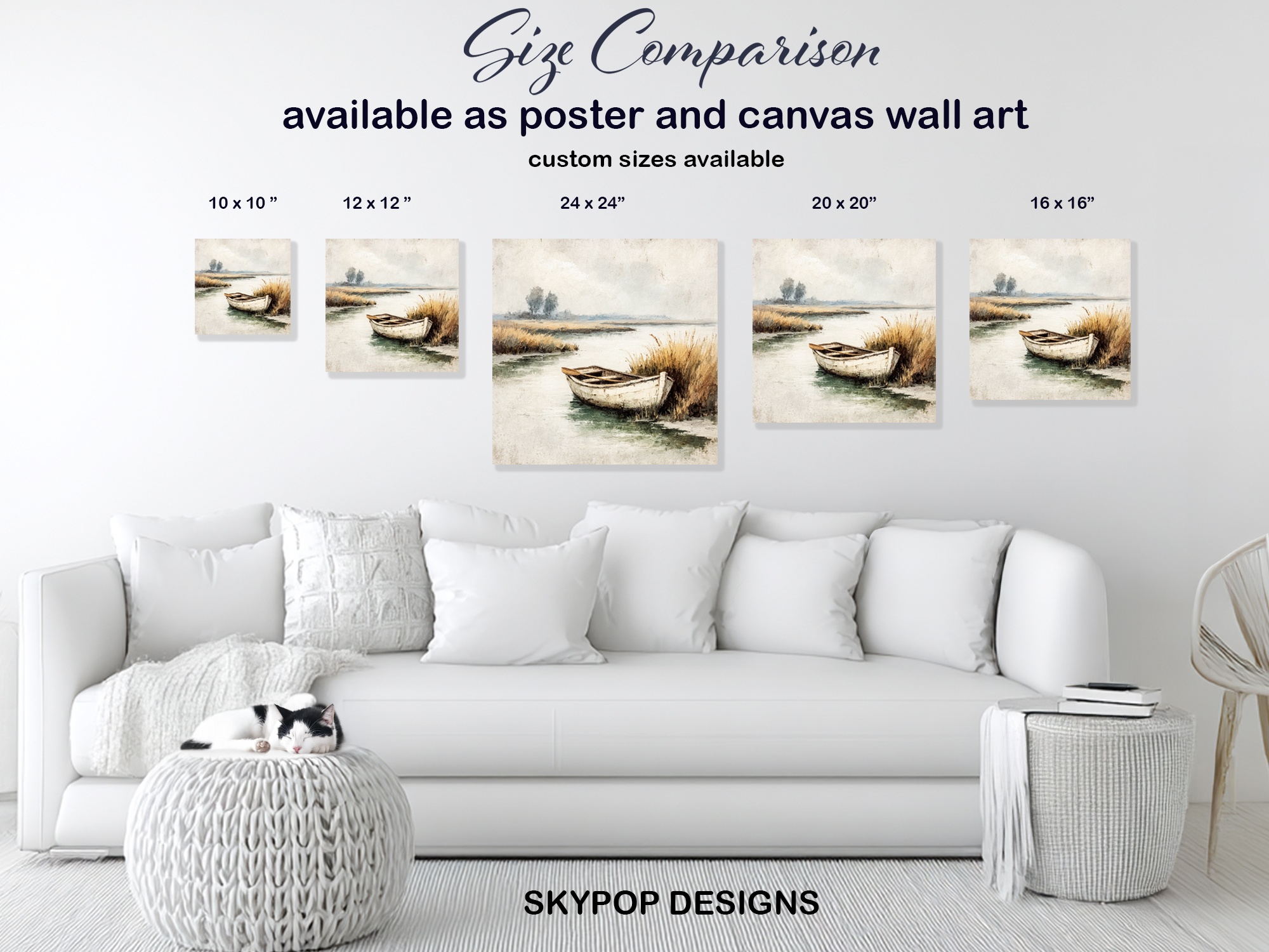 Transform your space with this serene lakeside boat canvas wall art, capturing the essence of tranquil waterside living. This stunning poster or canvas print showcases a weathered white rowboat nestled among golden reeds, perfectly reflecting coastal charm and rustic appeal. The soft, muted color palette of blues, browns, and greens creates a calming atmosphere, ideal for enhancing bedrooms, bathrooms, or living rooms with a touch of nature-inspired elegance. The impressionistic brushstrokes bring depth and texture to the scene, making it a captivating focal point in any room. This versatile wall art complements both traditional and coastal decor styles, adding a timeless quality to your home. Perfect as a housewarming gift or to refresh your own space, this artwork evokes feelings of peace and nostalgia. The high-quality printing captures every detail, from the delicate reflections in the water to the misty trees in the background. Whether displayed in a cozy entryway or as part of a gallery wall, this lakeside scene invites viewers to pause and reflect. Elevate your home’s ambiance with this beautiful blend of classic art and nature-inspired imagery. Bring the calming presence of waterside serenity into your daily life with this exquisite canvas wall art today.